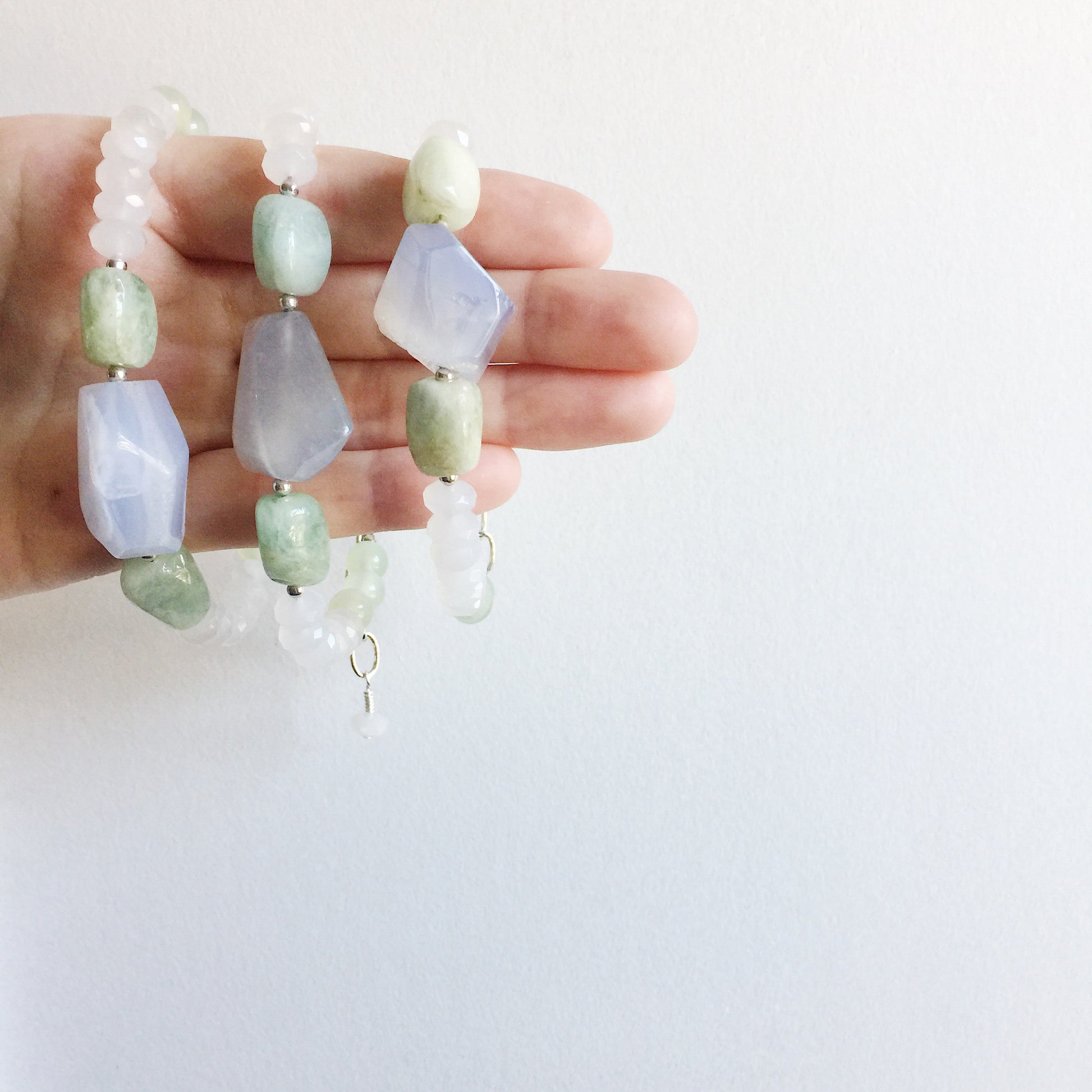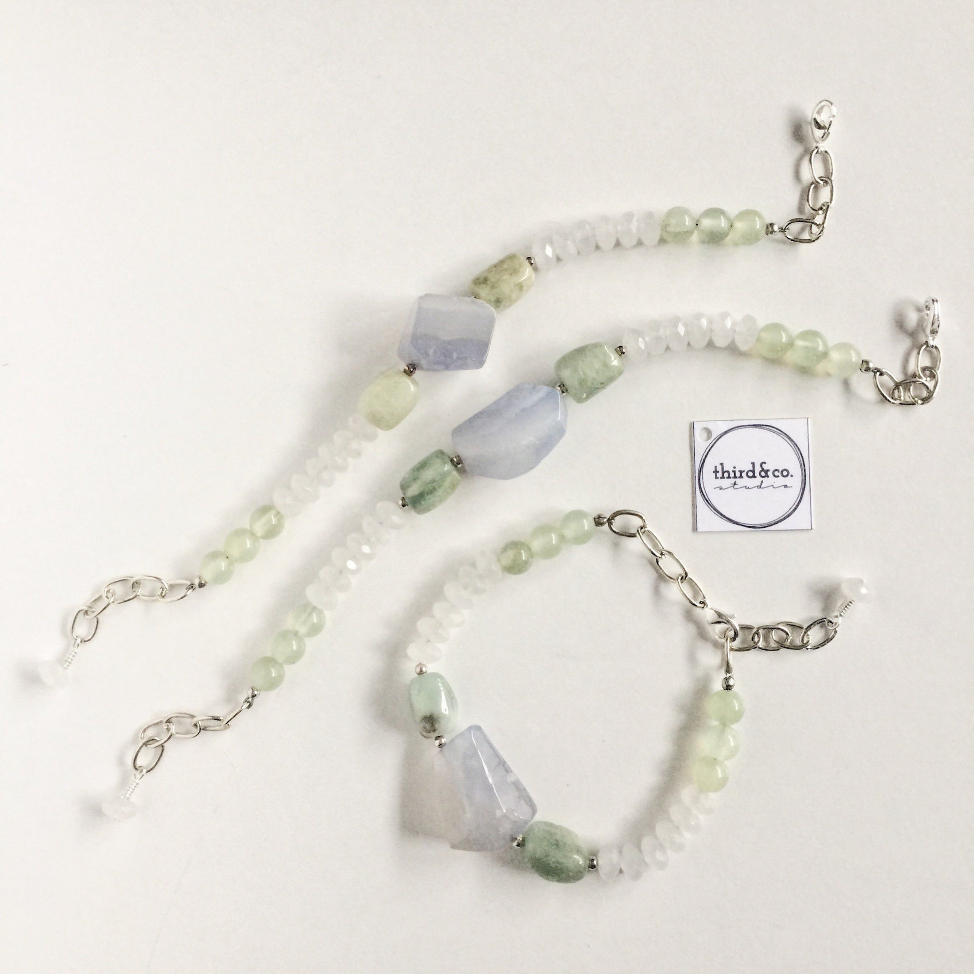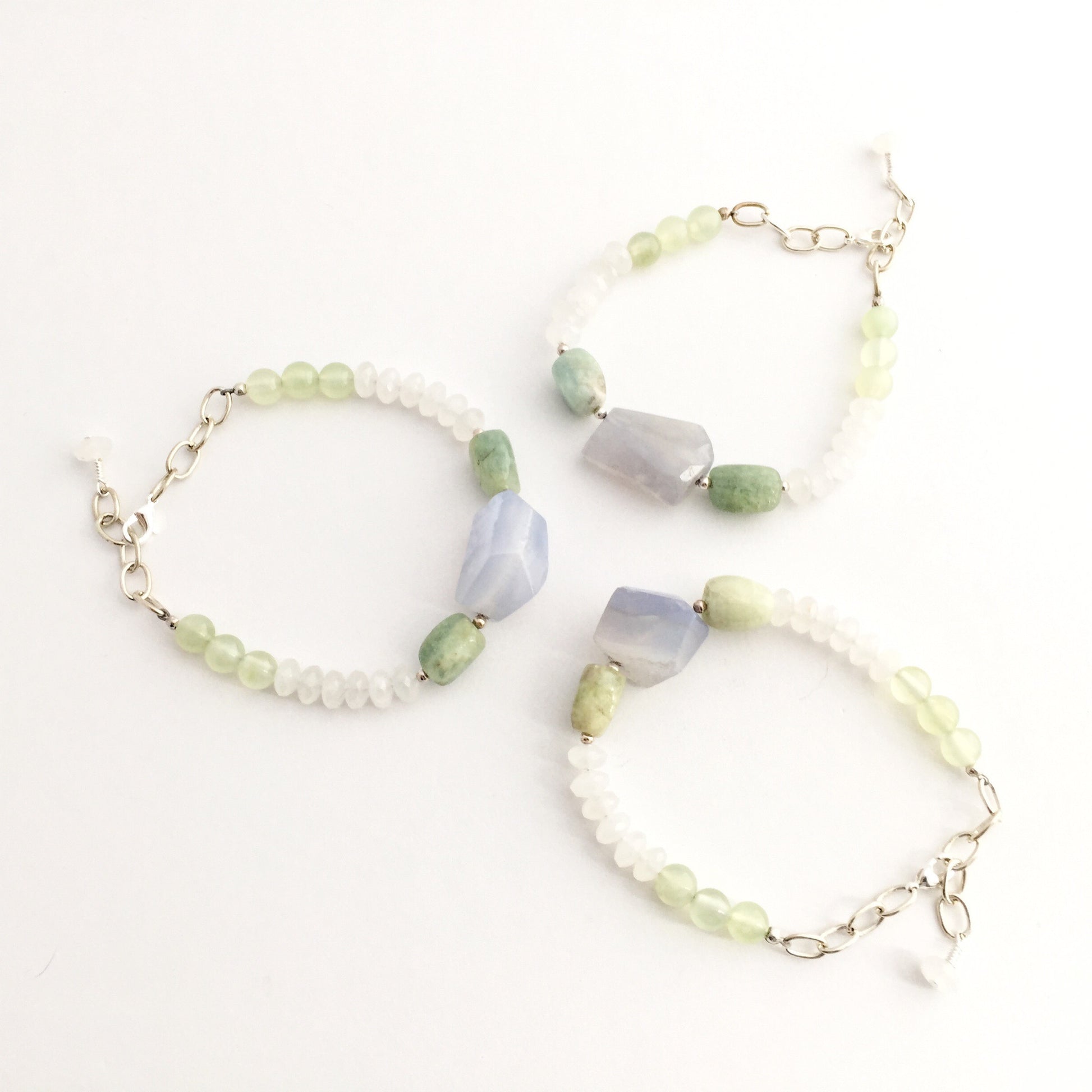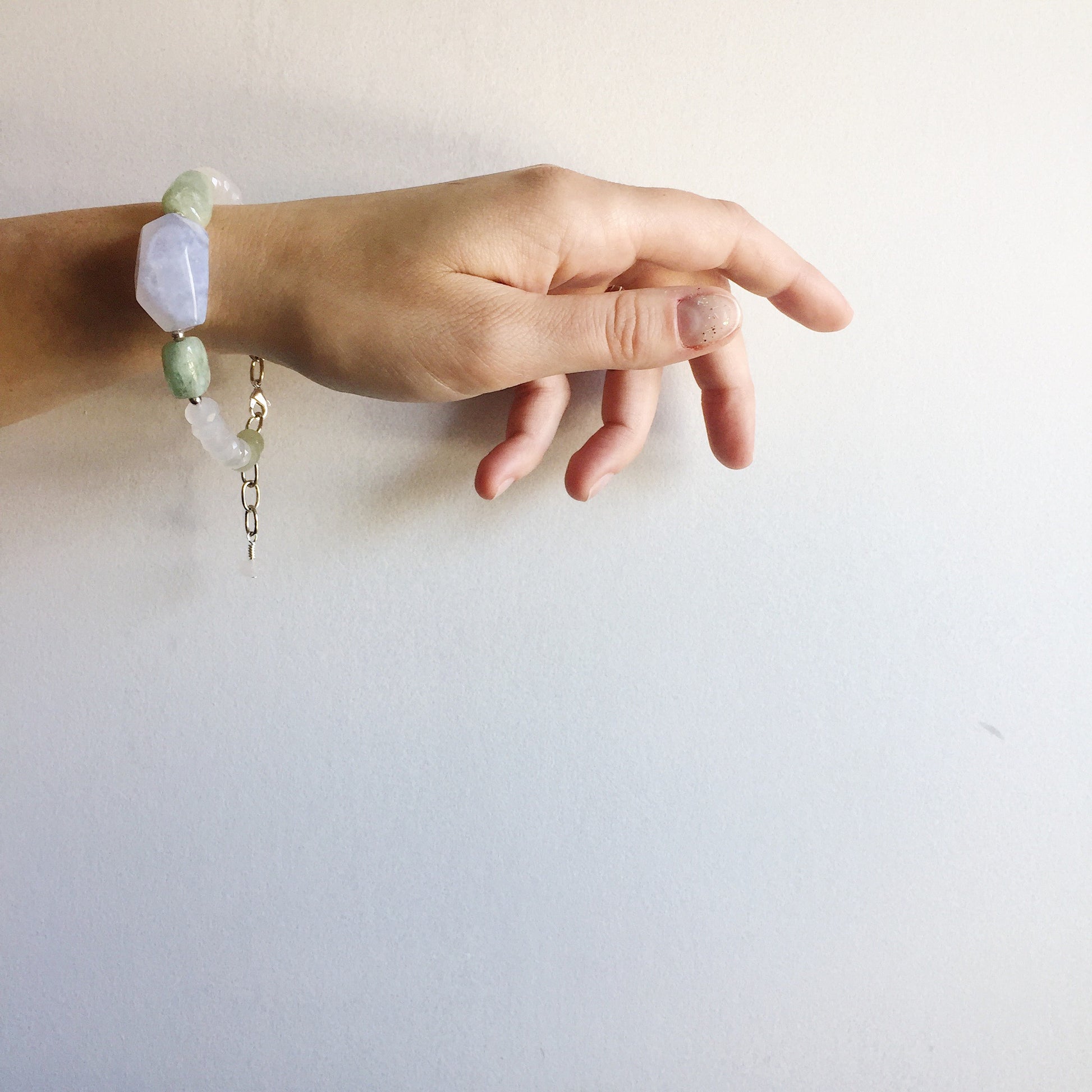 Two Aquamarine nuggets combined with one large Chalcedony nugget and Quartz make up the Afterglow Bracelet with vintage silver-toned chain for a versatile bracelet with adjustable length. Typically aquamarine is thought to be blue in color exclusively, but these particular nuggets veer more green in color overall. The nuggets of Chalcedony also vary in color, predominantly being a blue/purple with swirls of off-white/tan interspersed throughout. The Afterglow Bracelet looks great on its own or worn layered with a few of your other favorite bracelets!