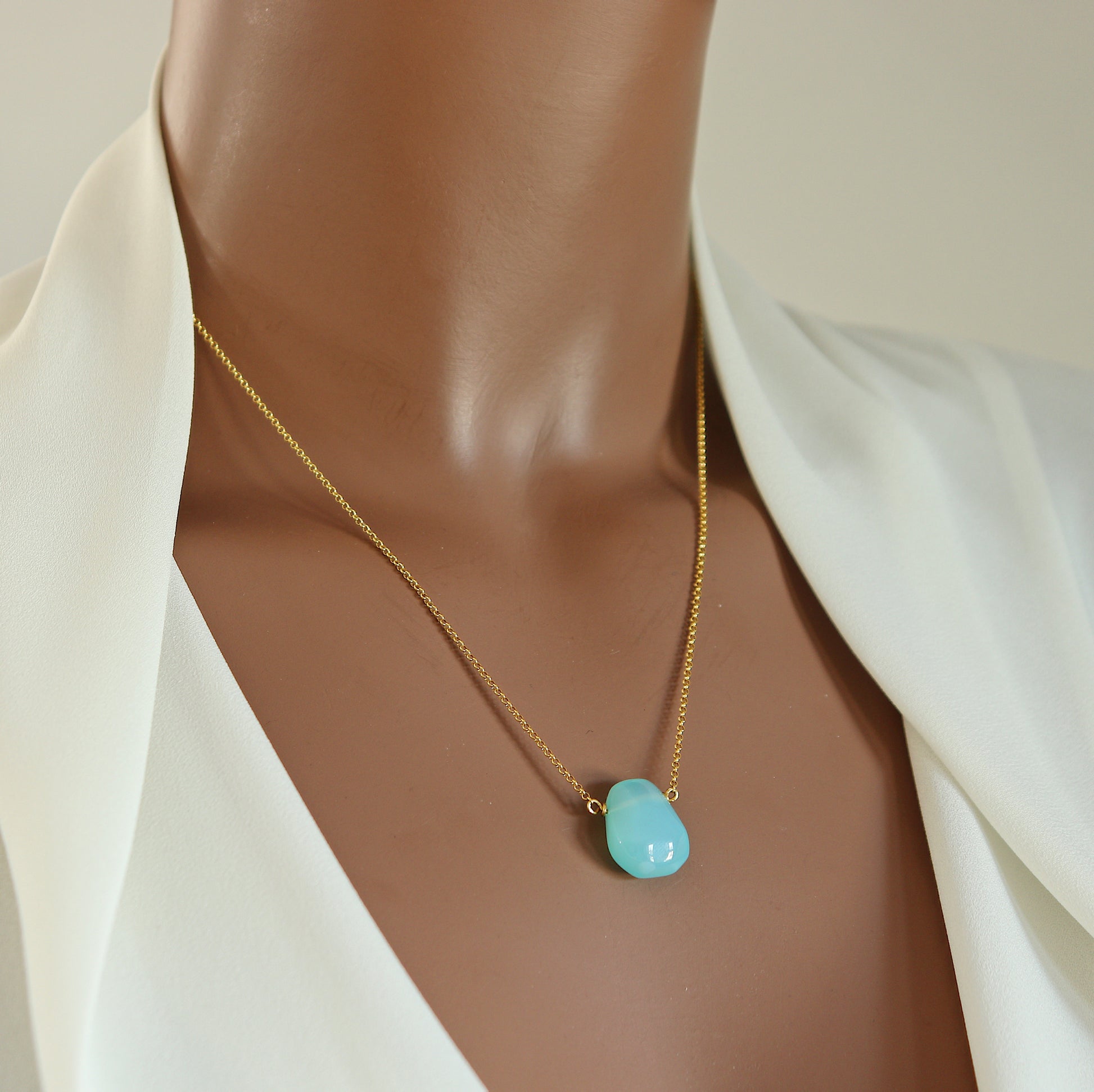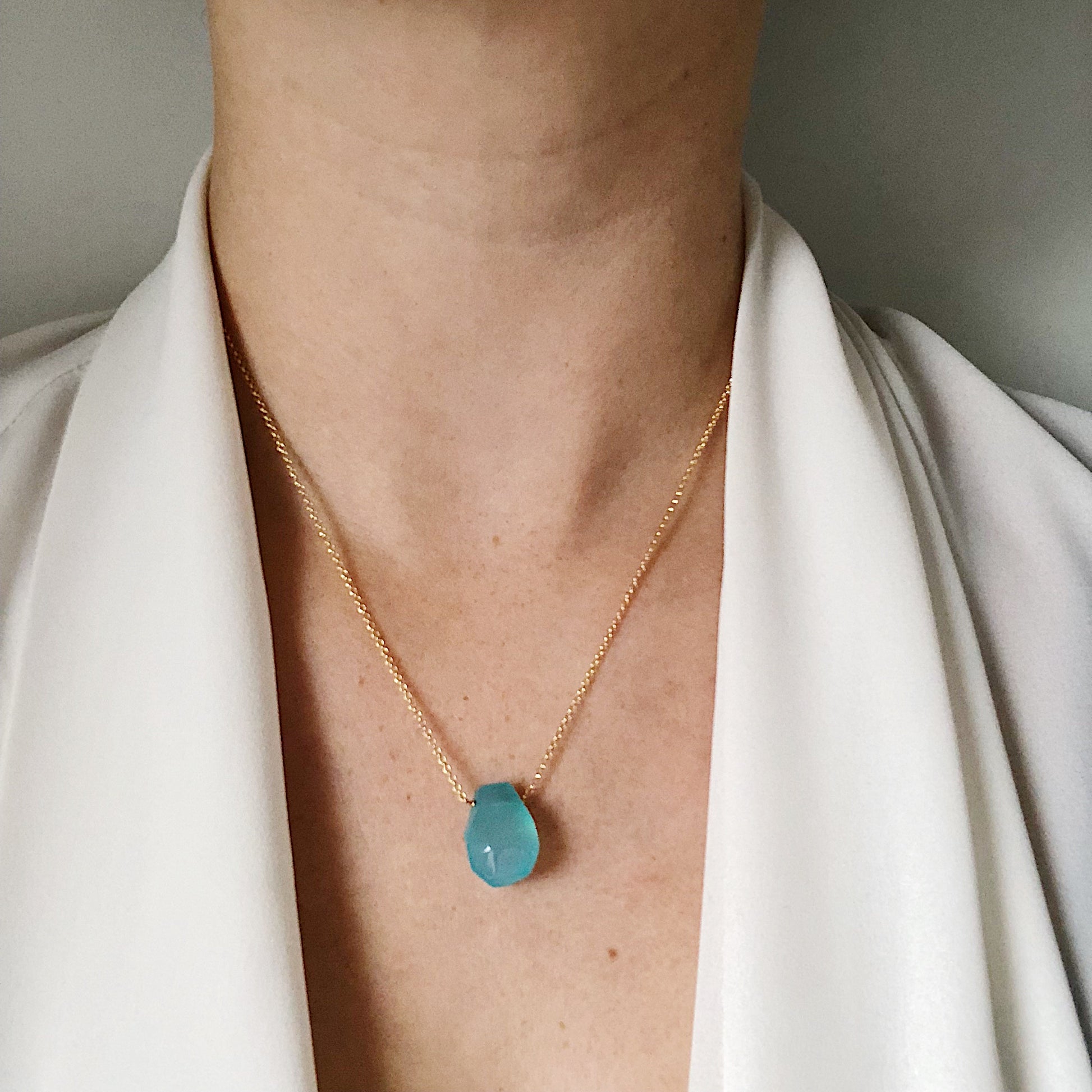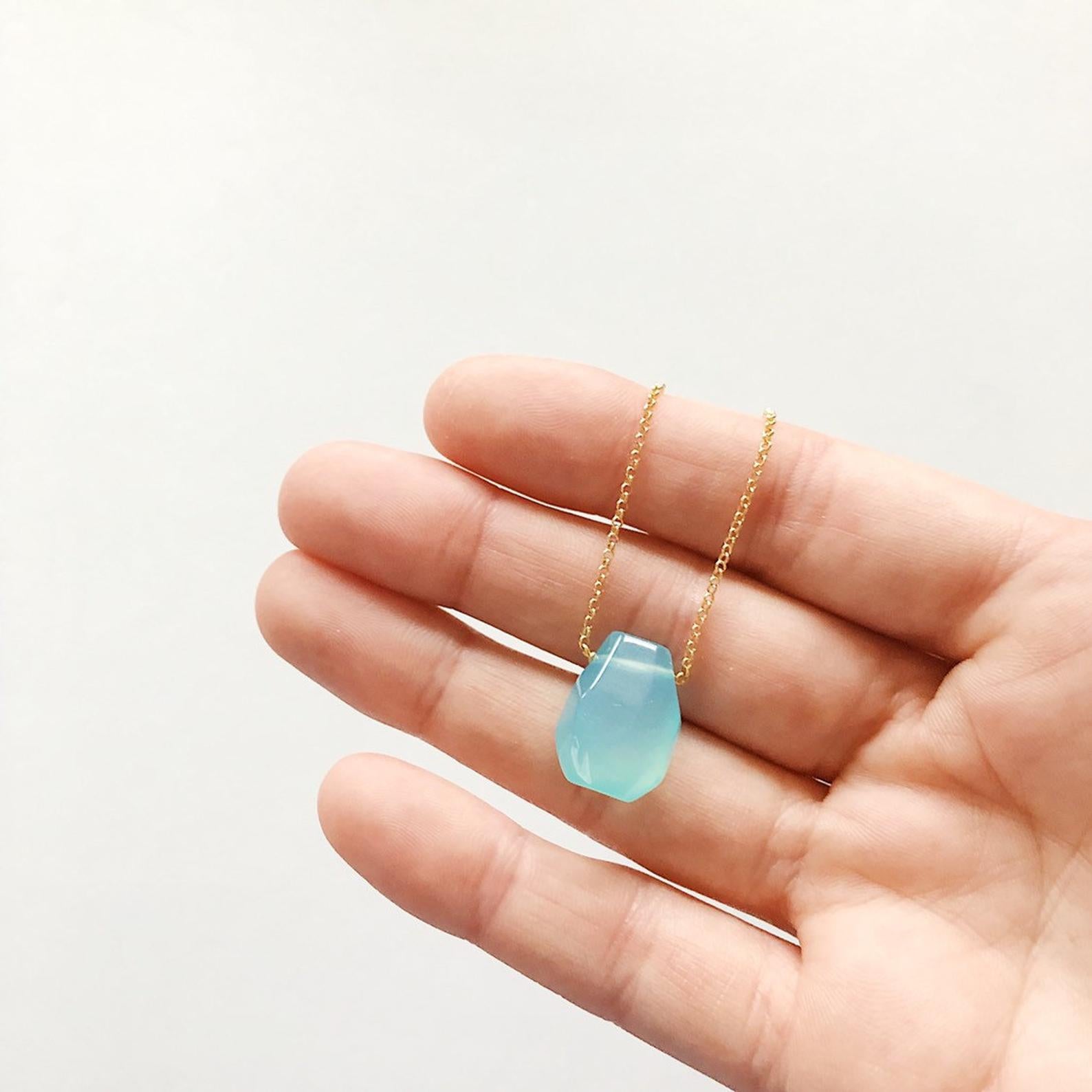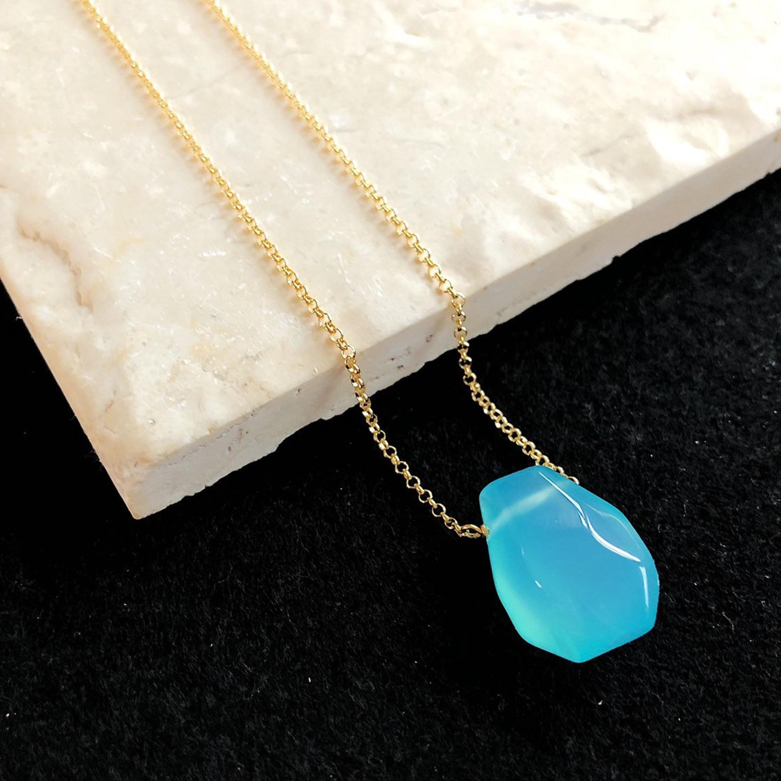 This simple irregular-shaped teardrop Necklace with bright blue Chalcedony teardrop is easy to throw on and go! Its minimalist style will have you reaching for it again and again.