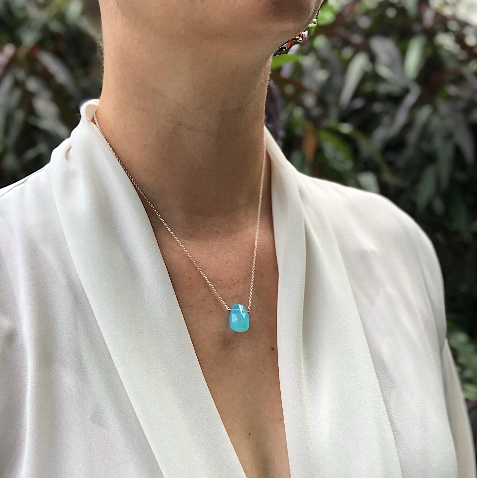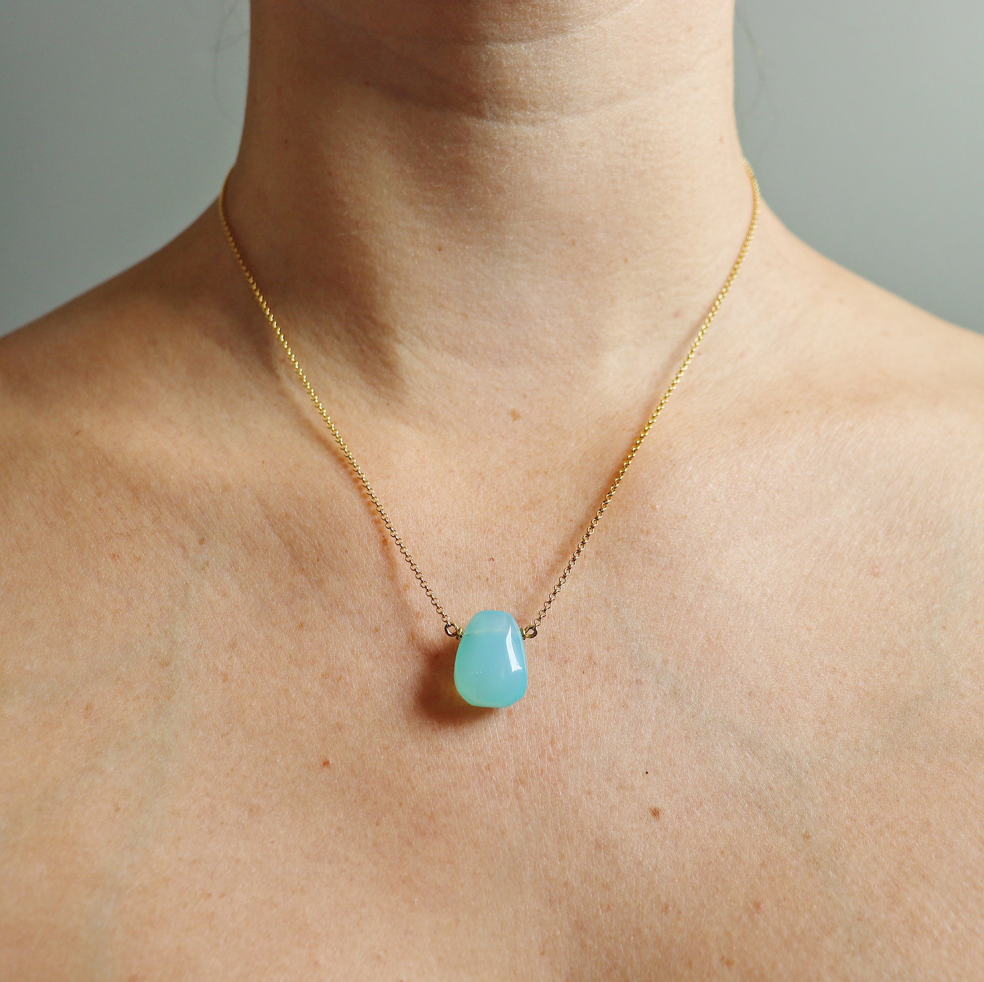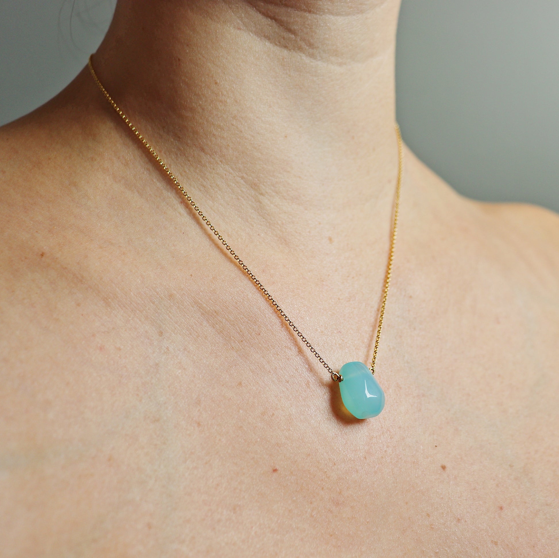 This simple irregular-shaped teardrop Necklace with bright blue Chalcedony teardrop is easy to throw on and go! Its minimalist style will have you reaching for it again and again.