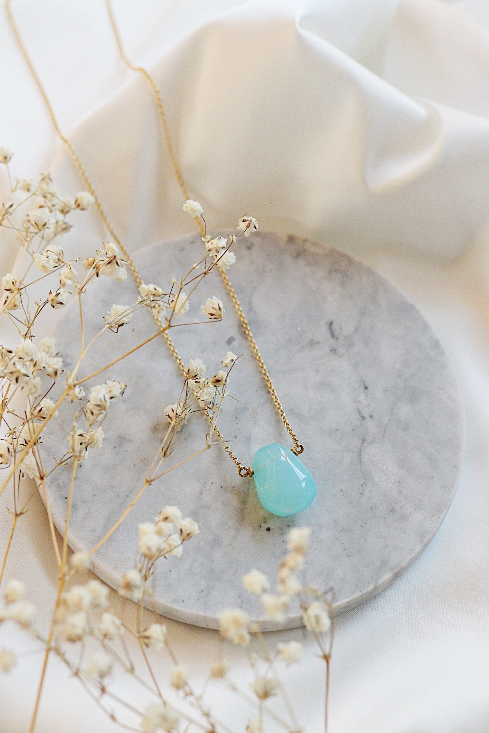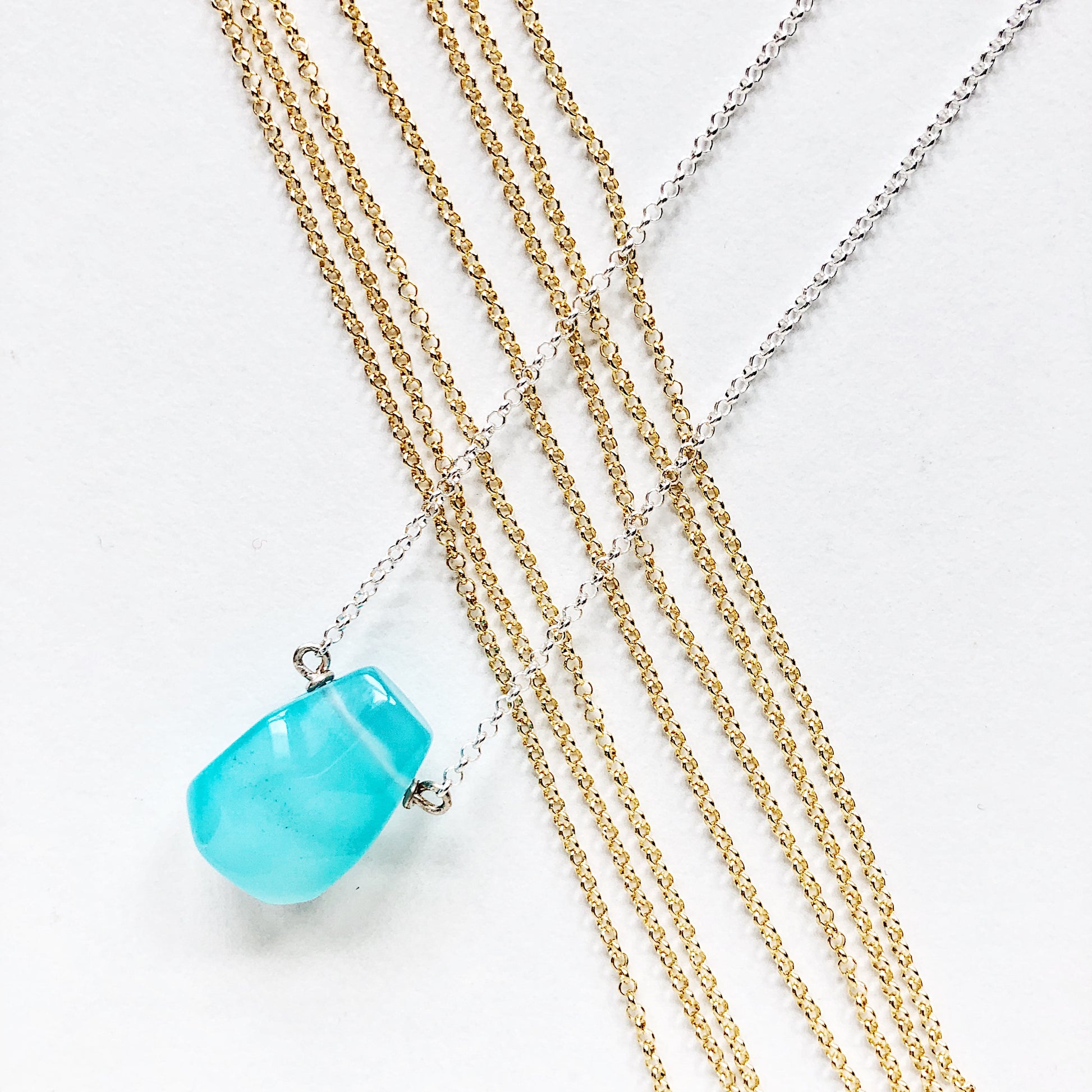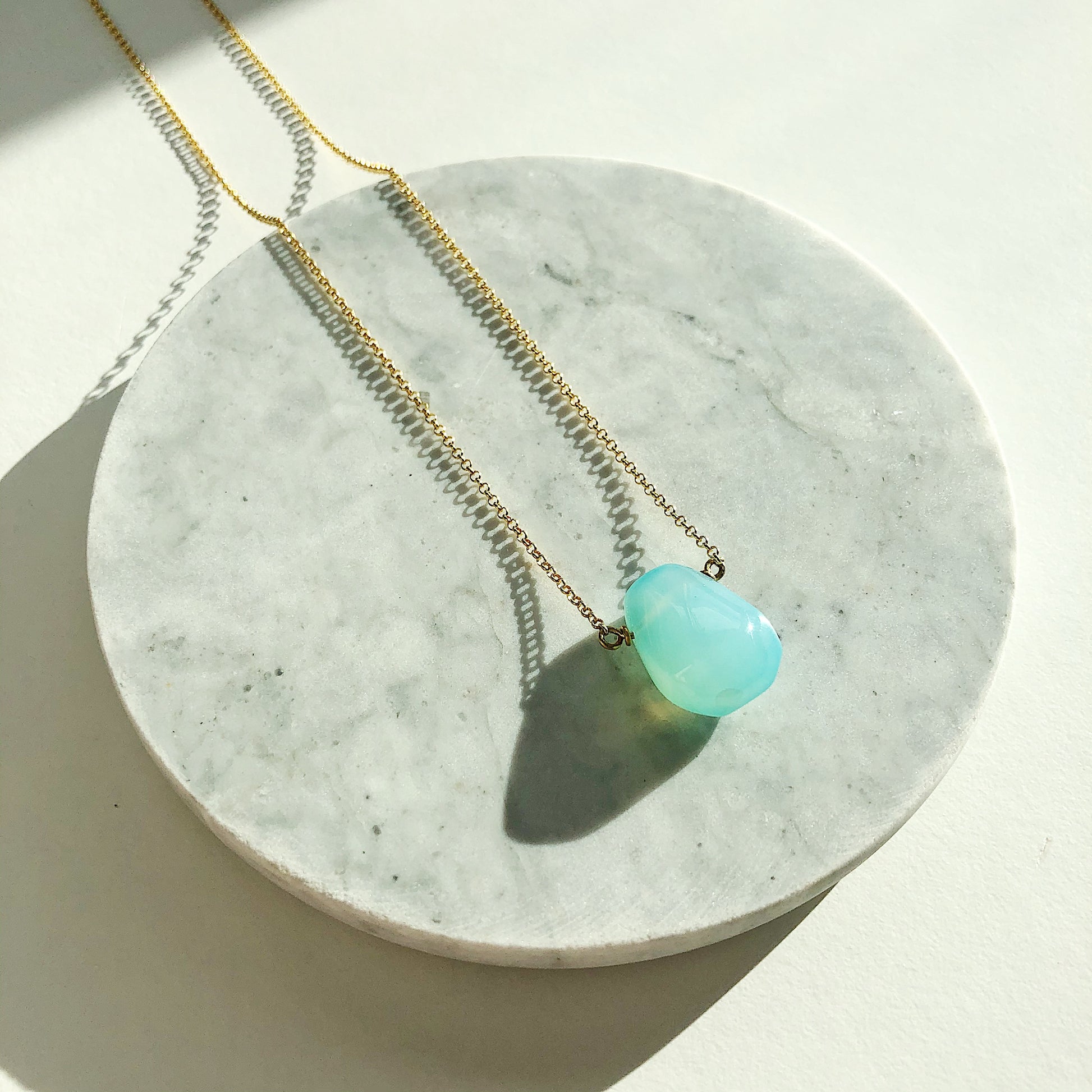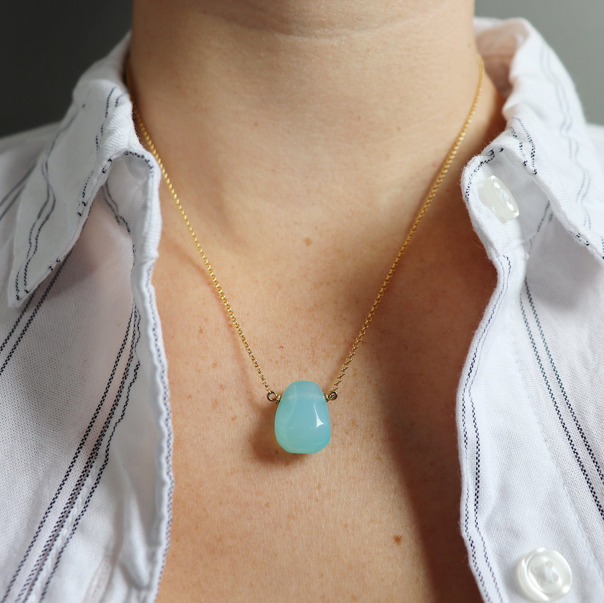 This simple irregular-shaped teardrop Necklace with bright blue Chalcedony teardrop is easy to throw on and go! Its minimalist style will have you reaching for it again and again.