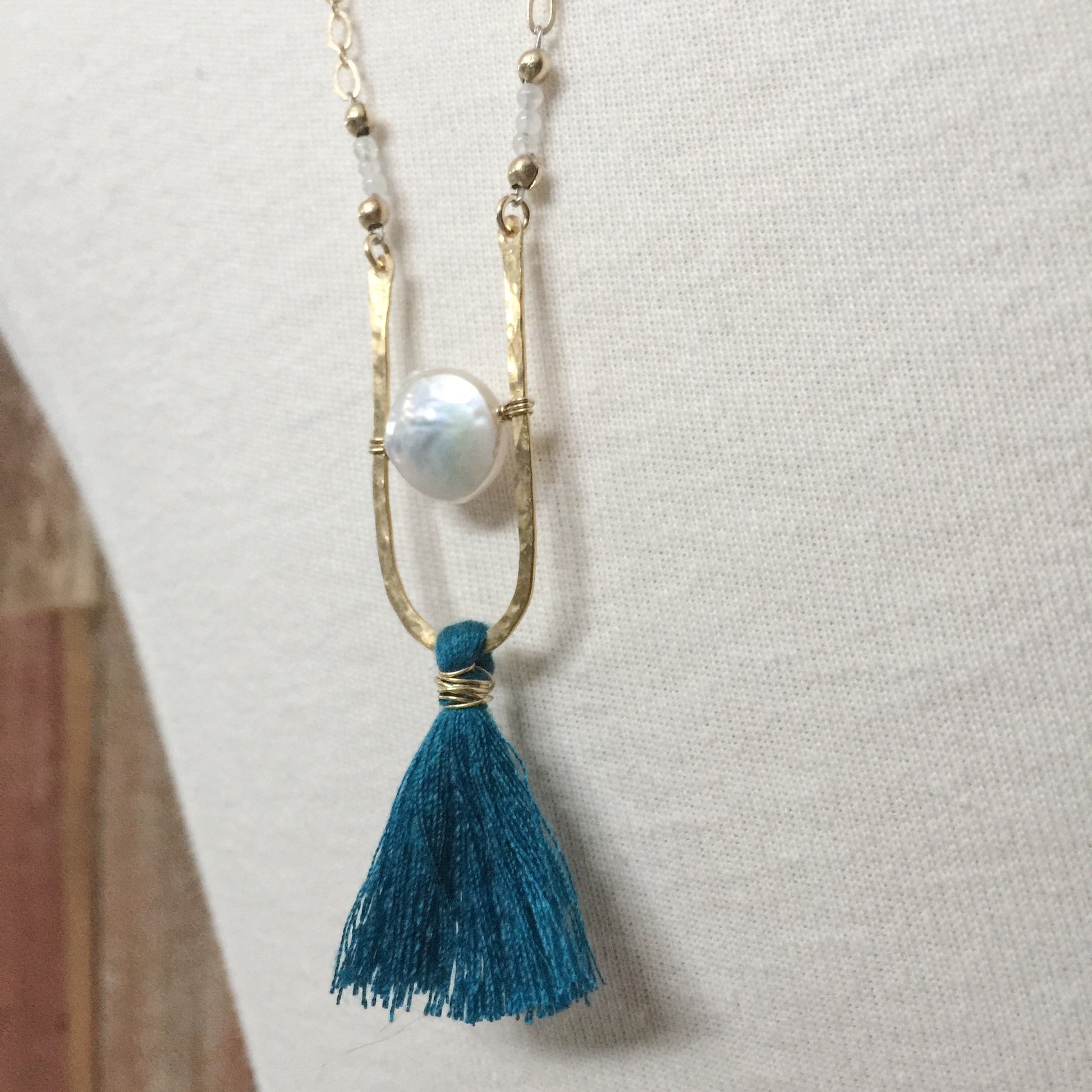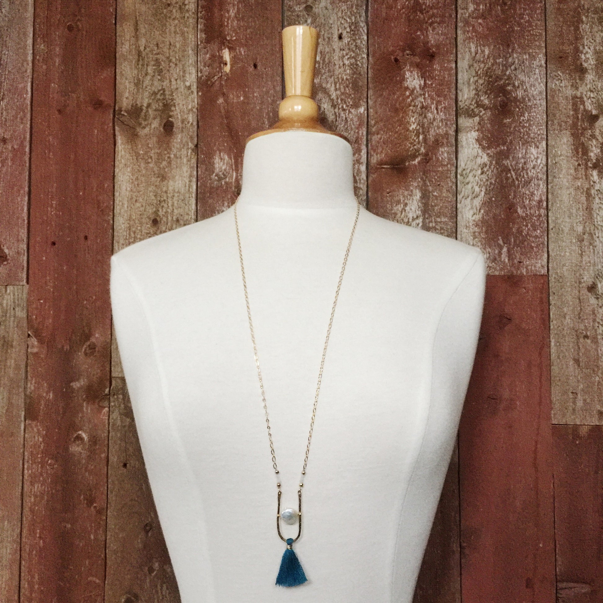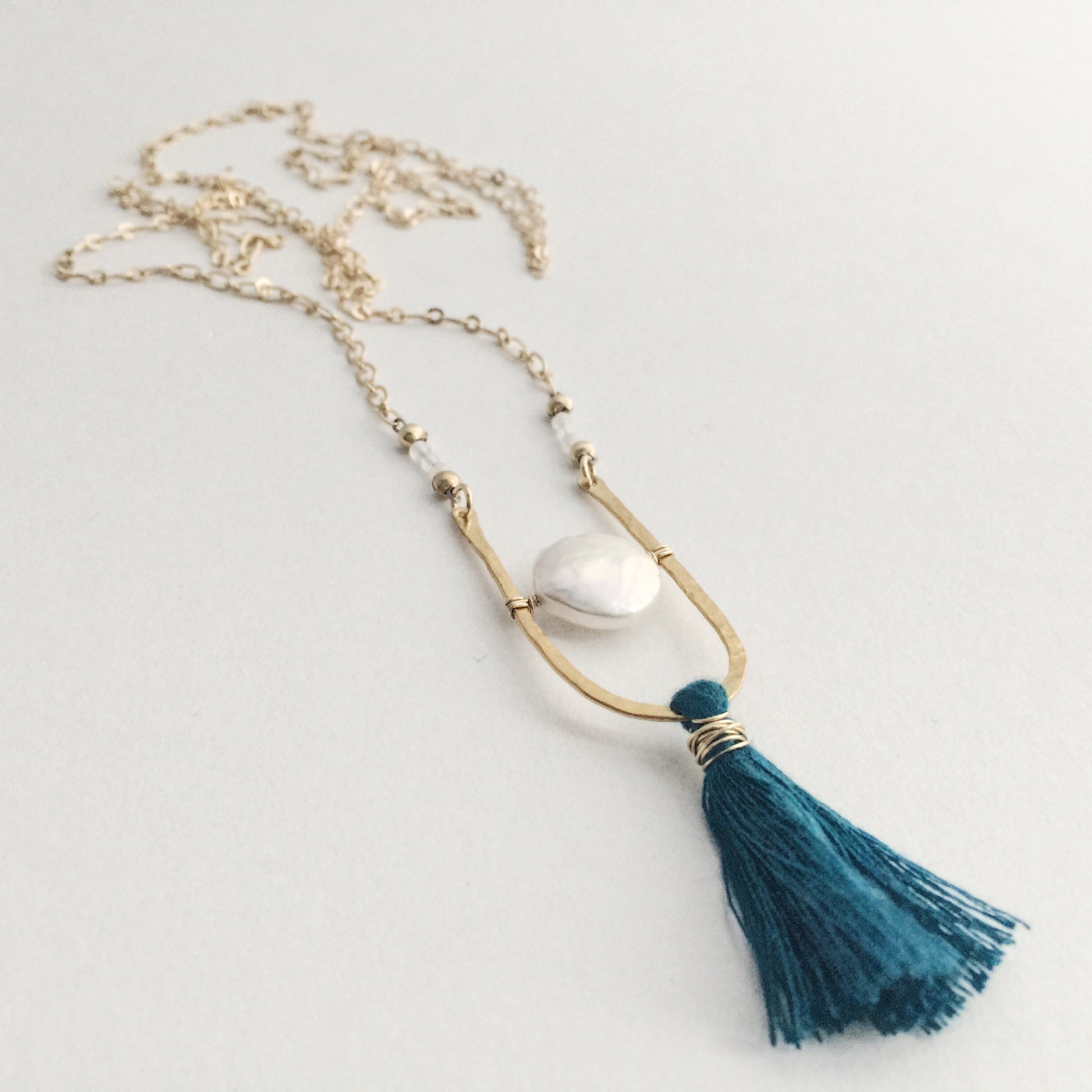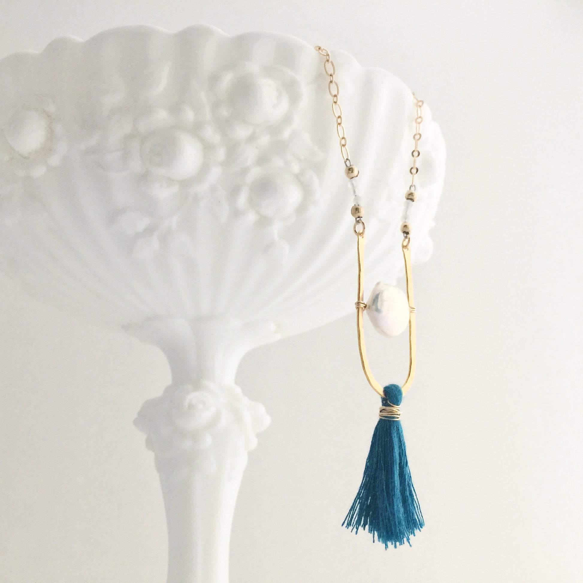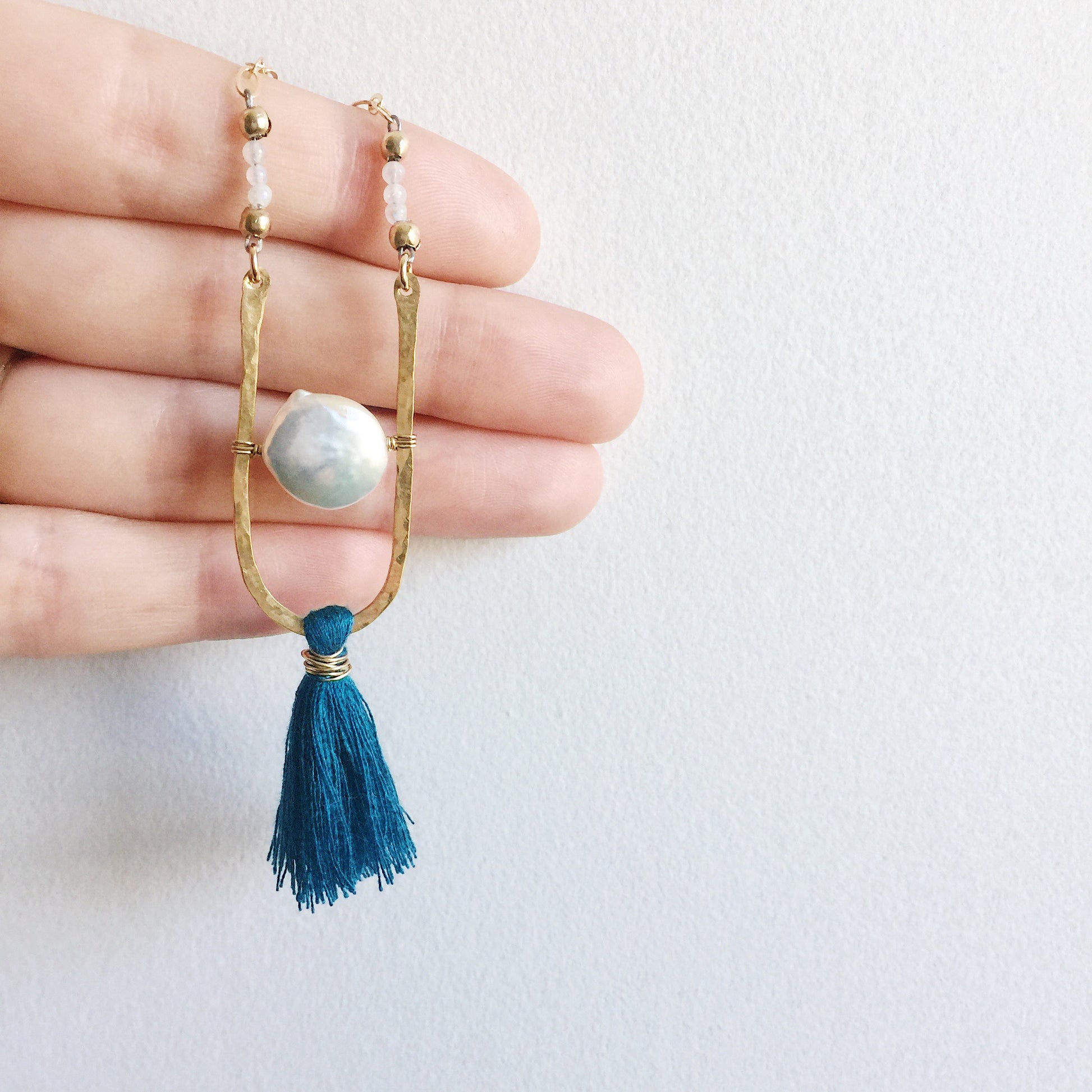 Fresh water pearl meets a hand-hammered frame in brass or nickel paired with a cotton tassel in the Chroma Necklace. Take your pick in tassel color and either gold or silver chain! With bright colors in a minimalist design, this will be your go-to necklace for everyday wear. Because each frame is cut and manipulated by hand, please allow for slight size differences in each piece- they are all handmade and unique!