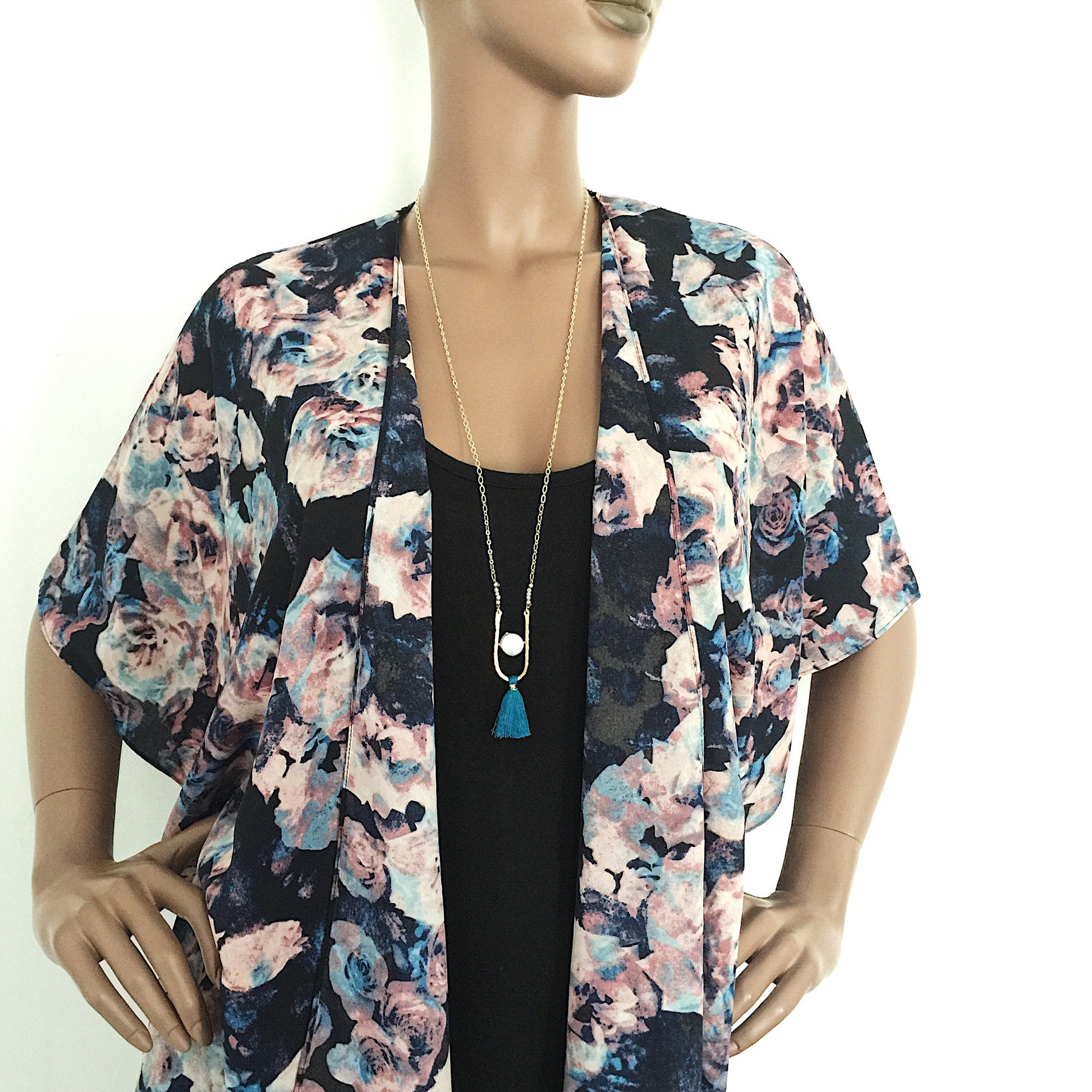 The Chroma Necklace is an overall length of 34.25 inch (86.995 cm) length, with a 1.25 inch (3.175 cm) tassel. Bear in mind that the stones used are all genuine semiprecious gemstones, and they will be heavier in weight than a necklace made of plastic or resin. That being said, this particular necklaces clocks in at a lightweight 0.2 ounces (5.669 grams).