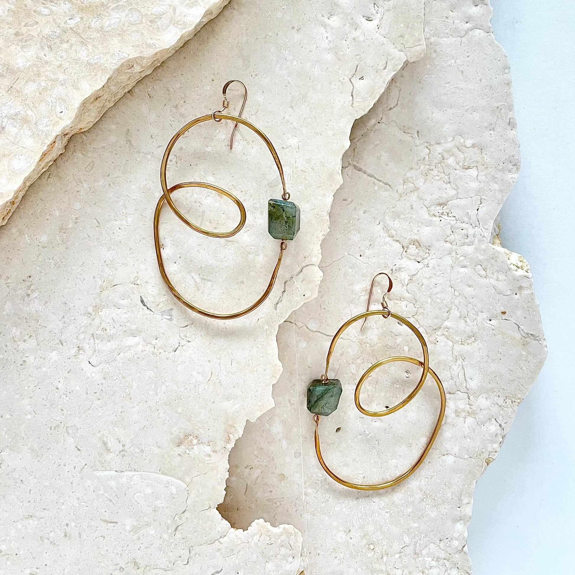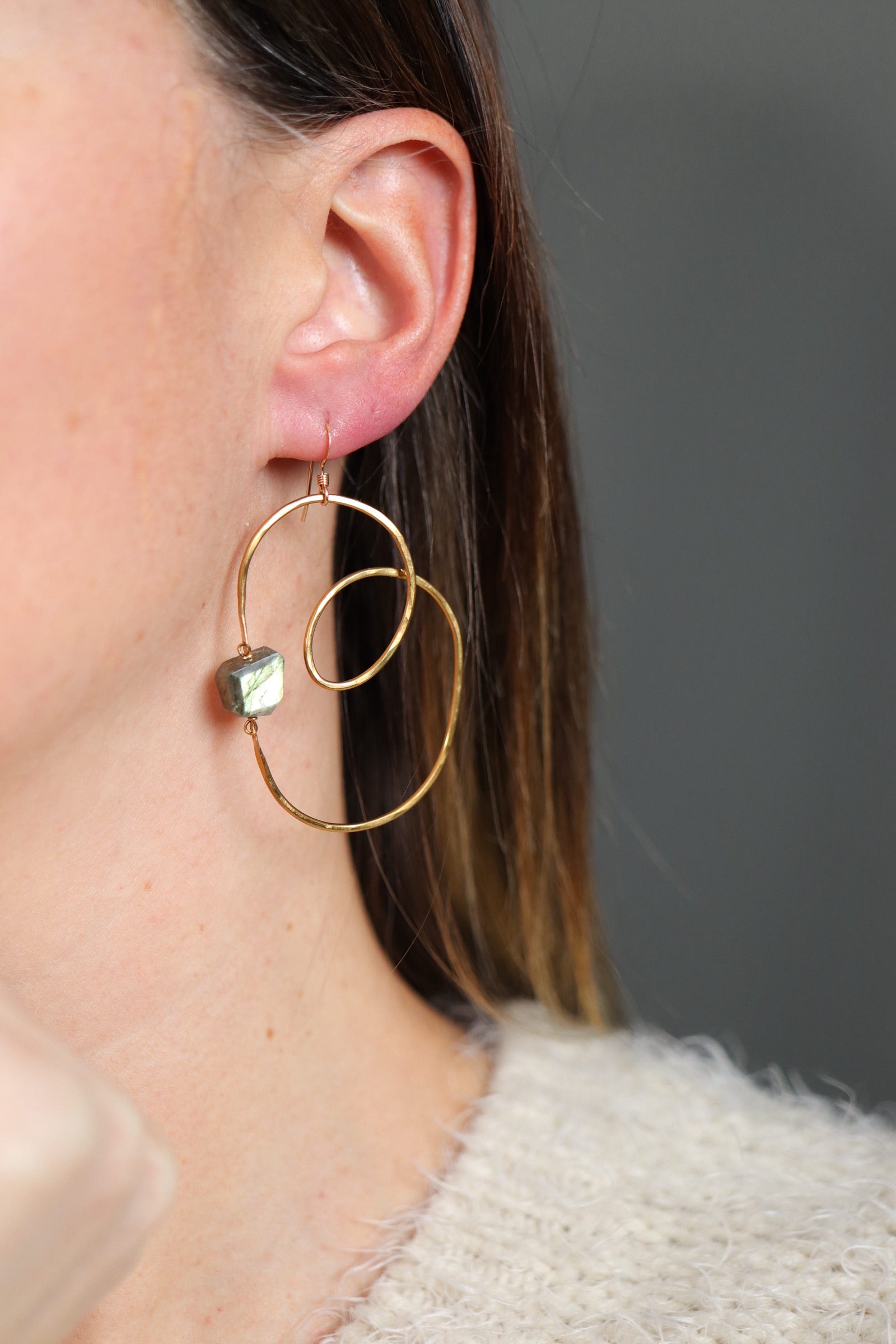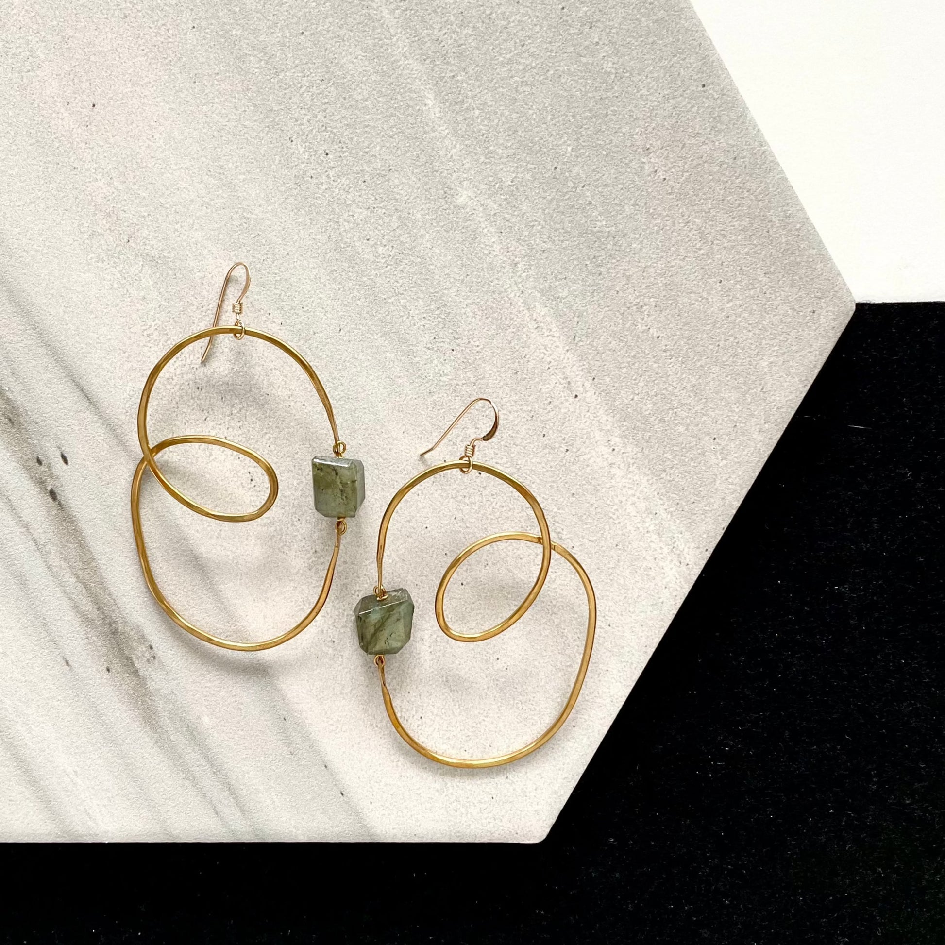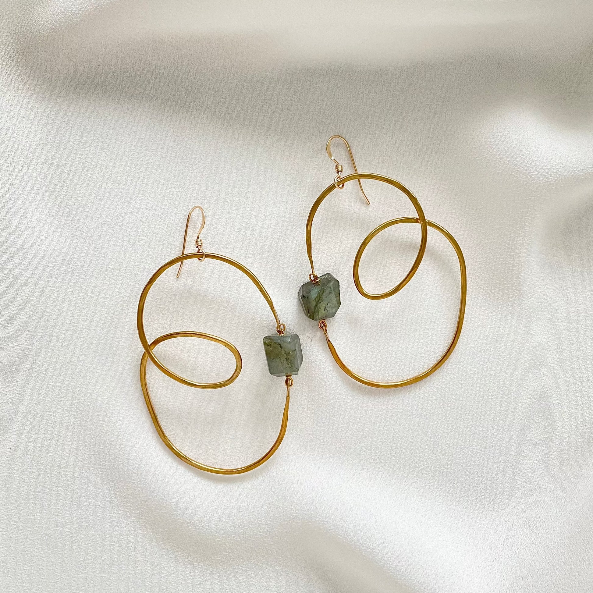 A freeform shaped set of earrings. Faceted Labradorite with hammered Brass frames; organic shapes, lightweight and fun to wear with lots of movement. Only one set available. Overall length at 2.5 inches.