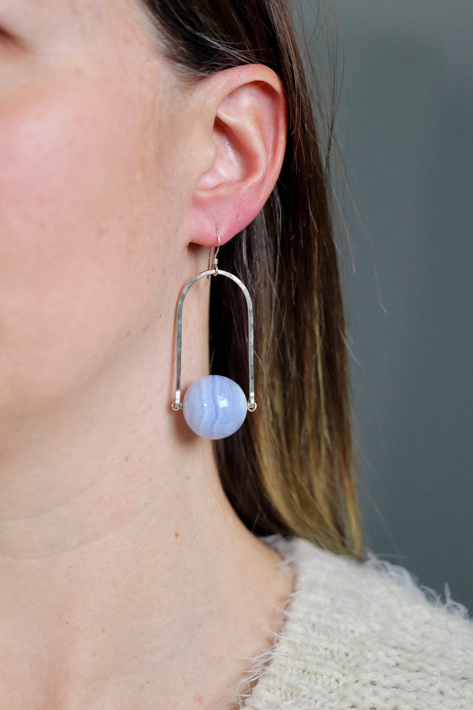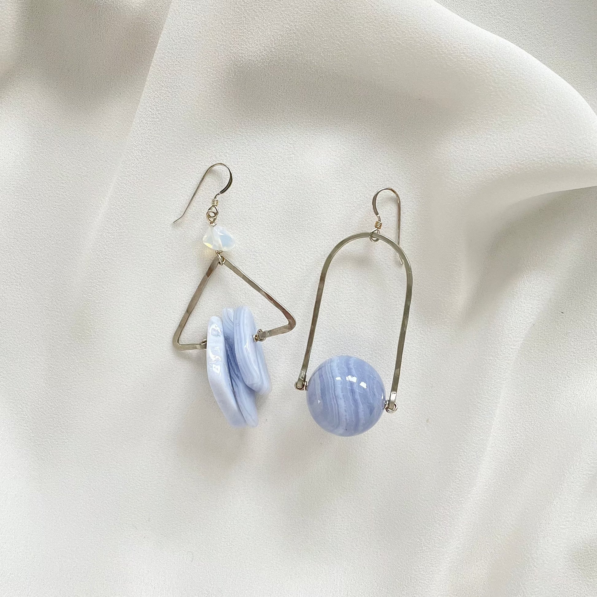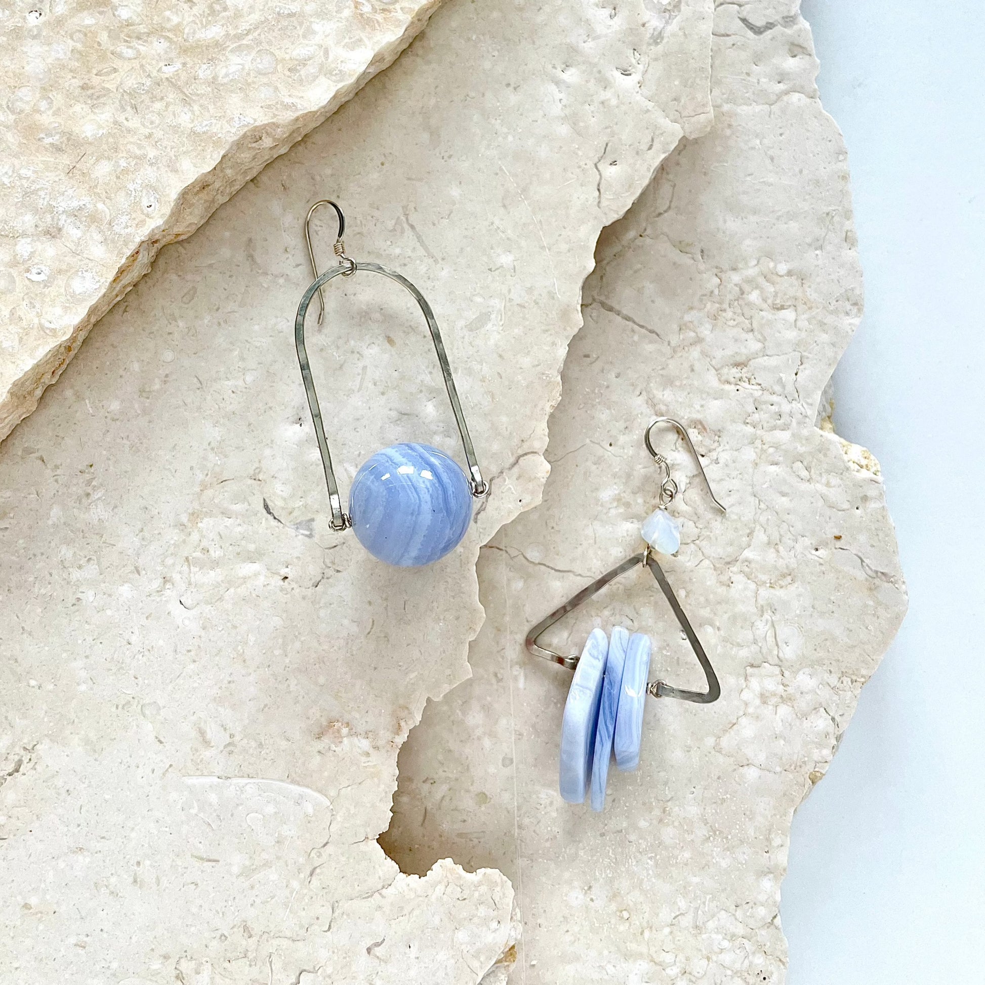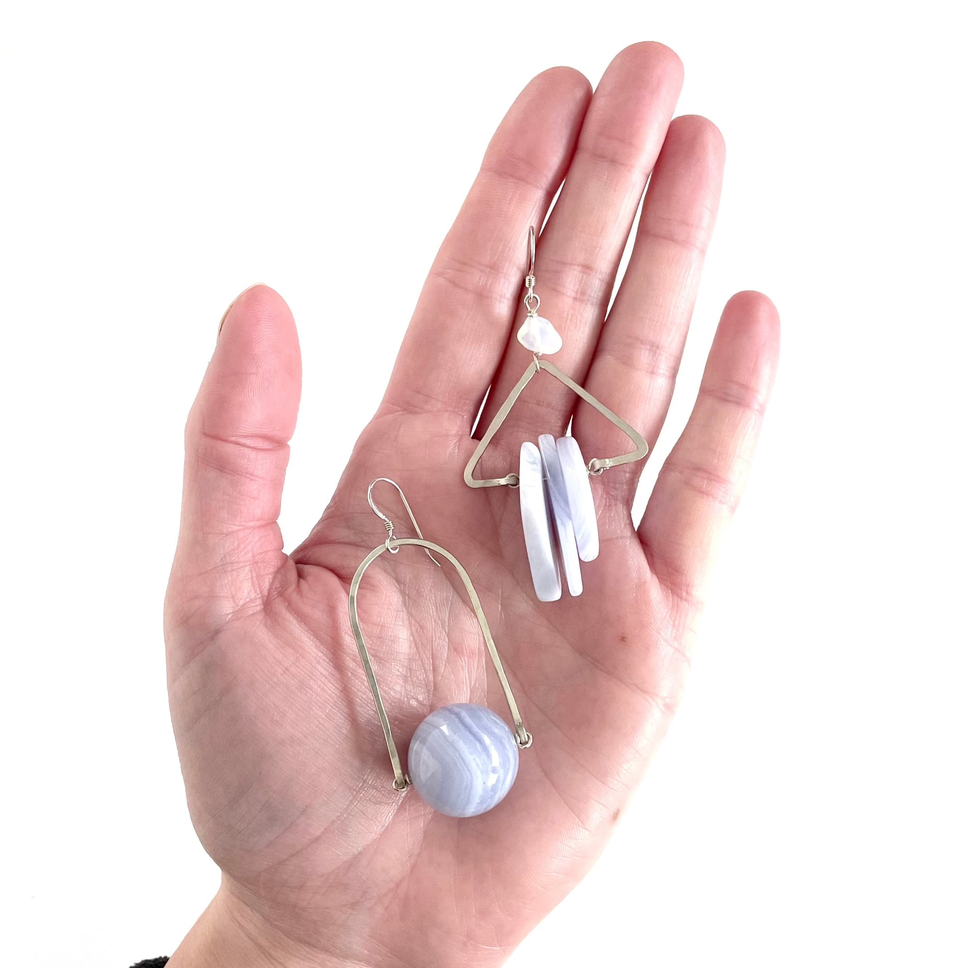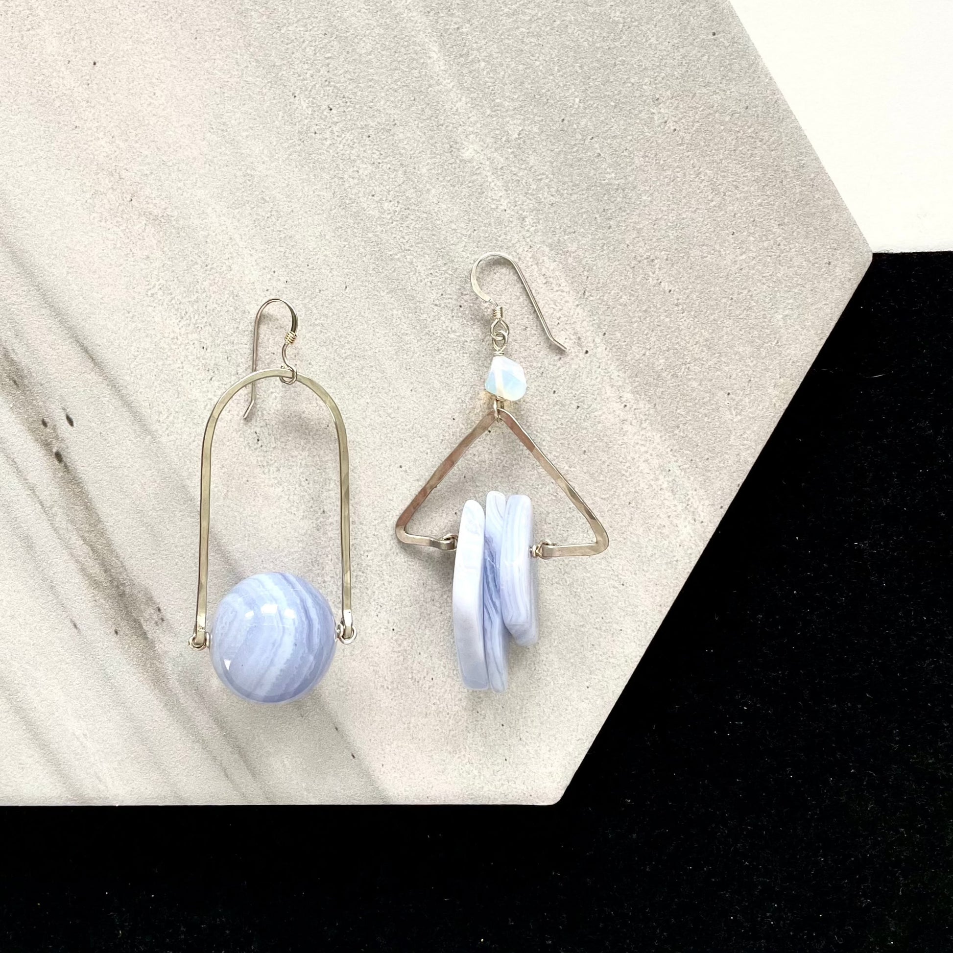 An eclectic, mismatched set of earrings. Blue Lace Agate, Quartz, Chalcedony with hammered German Silver Nickel frame; geometric shapes, cool-toned colors and fun to wear with lots of movement. Only one set available. Longest length at 2.75 inches.