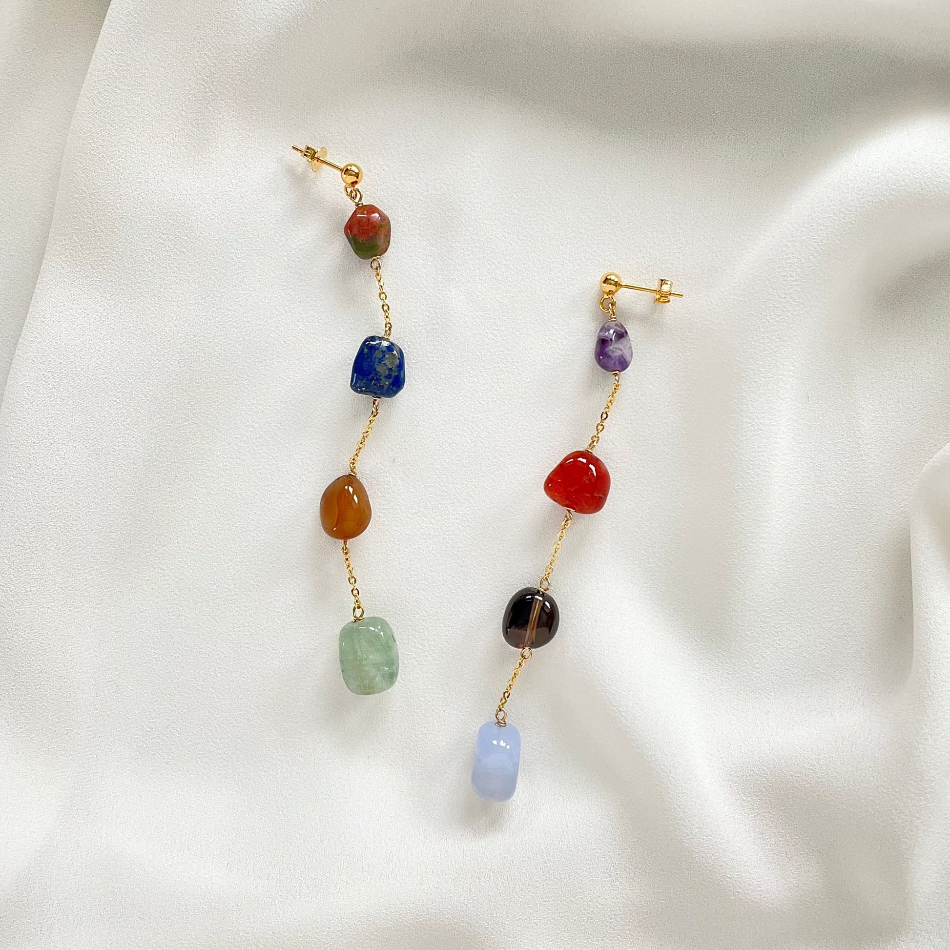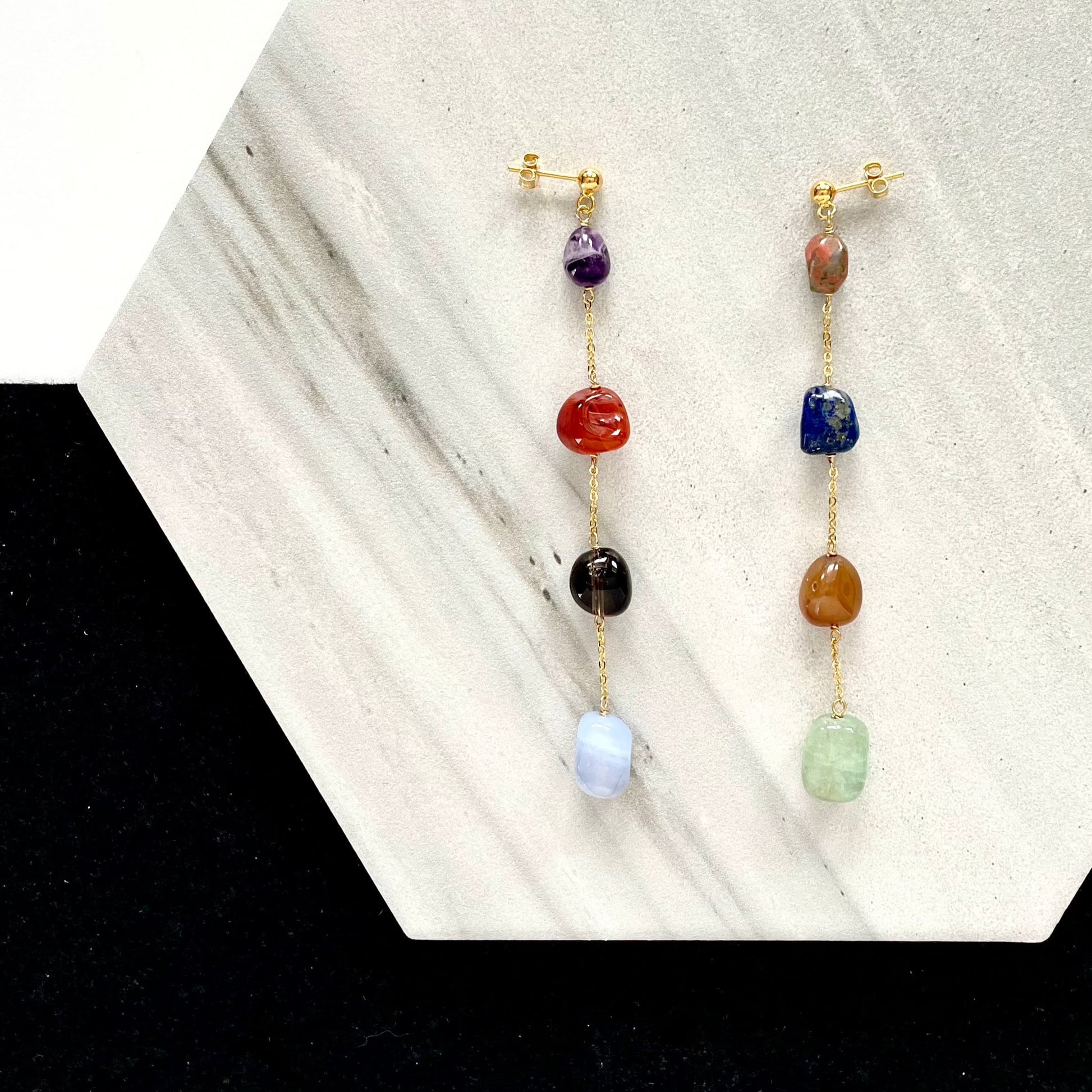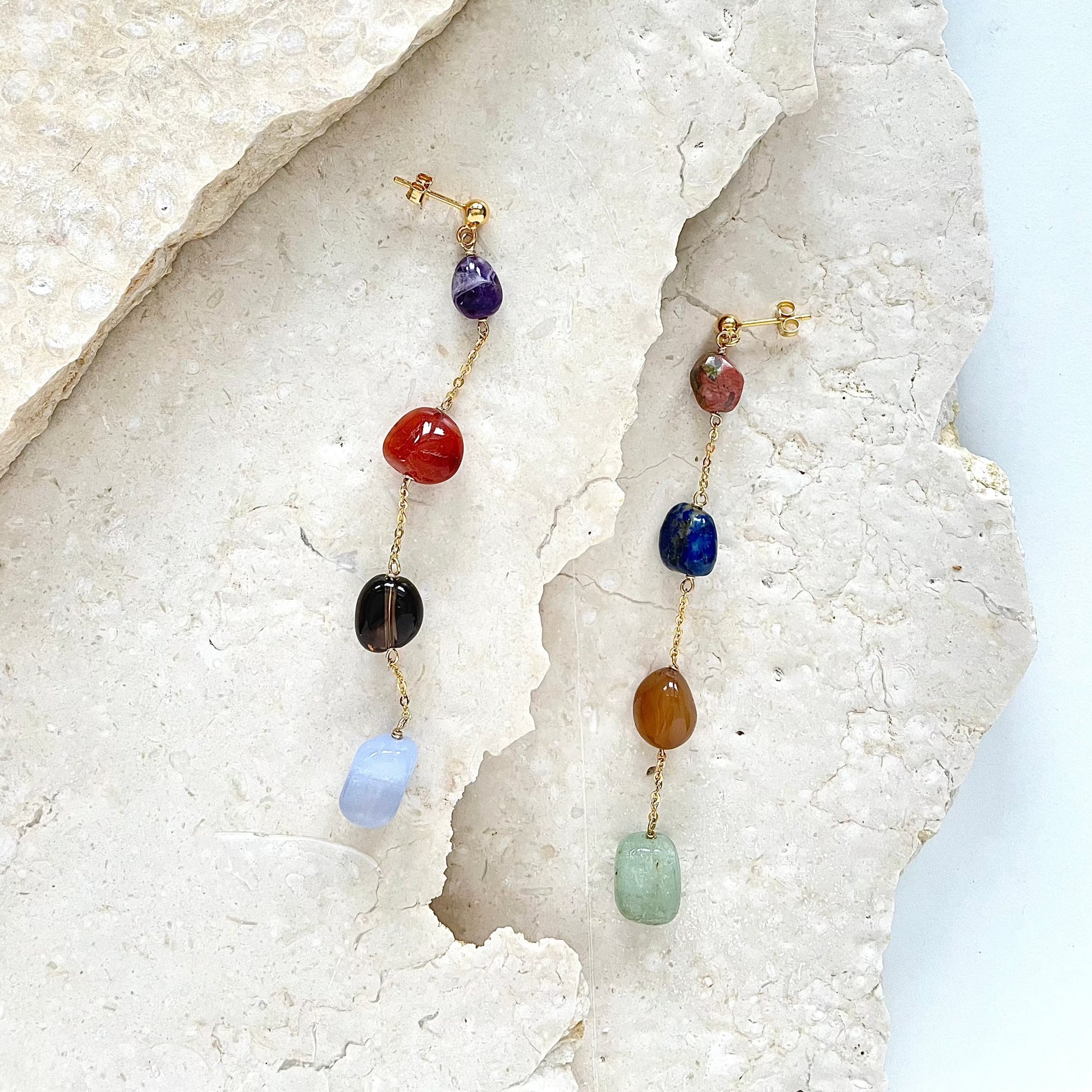 A classic stacked-stone set of earrings. Irregular semiprecious stone nuggets suspended with gold plated chain; eye-catching, multi color and fun to wear with lots of movement. Only one set available. Overall length of 4 inches.