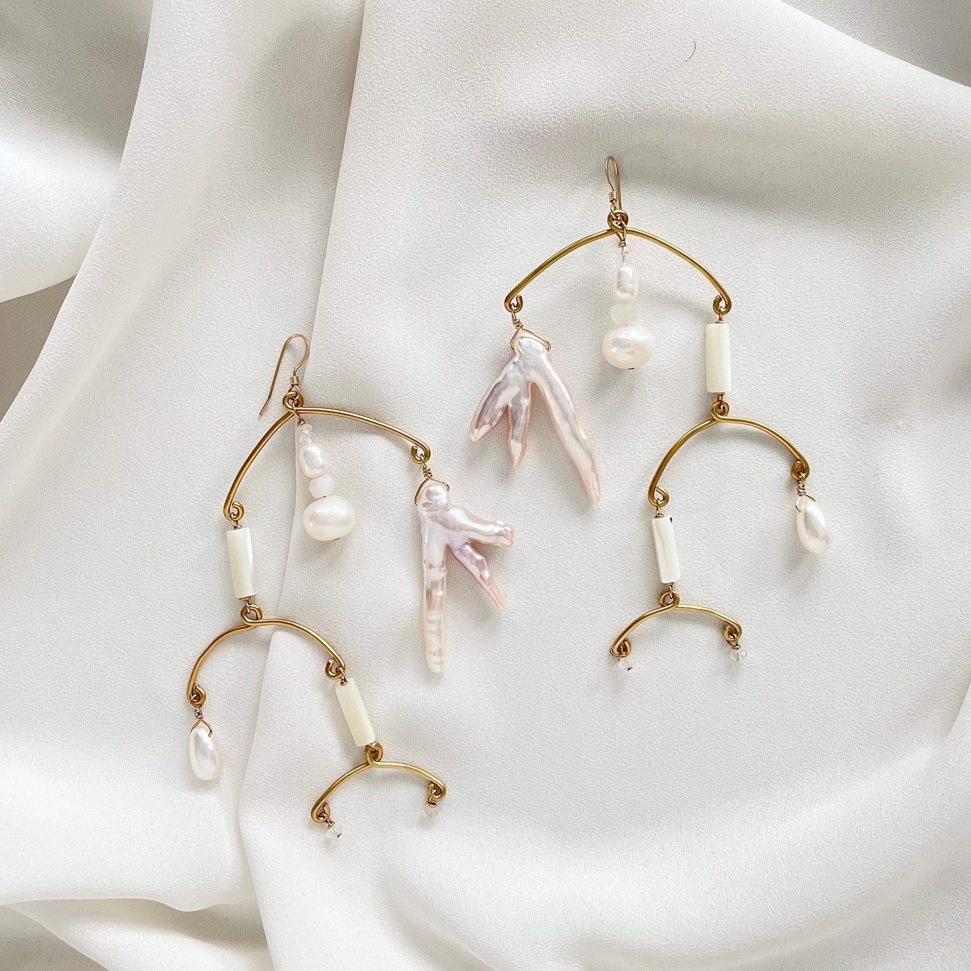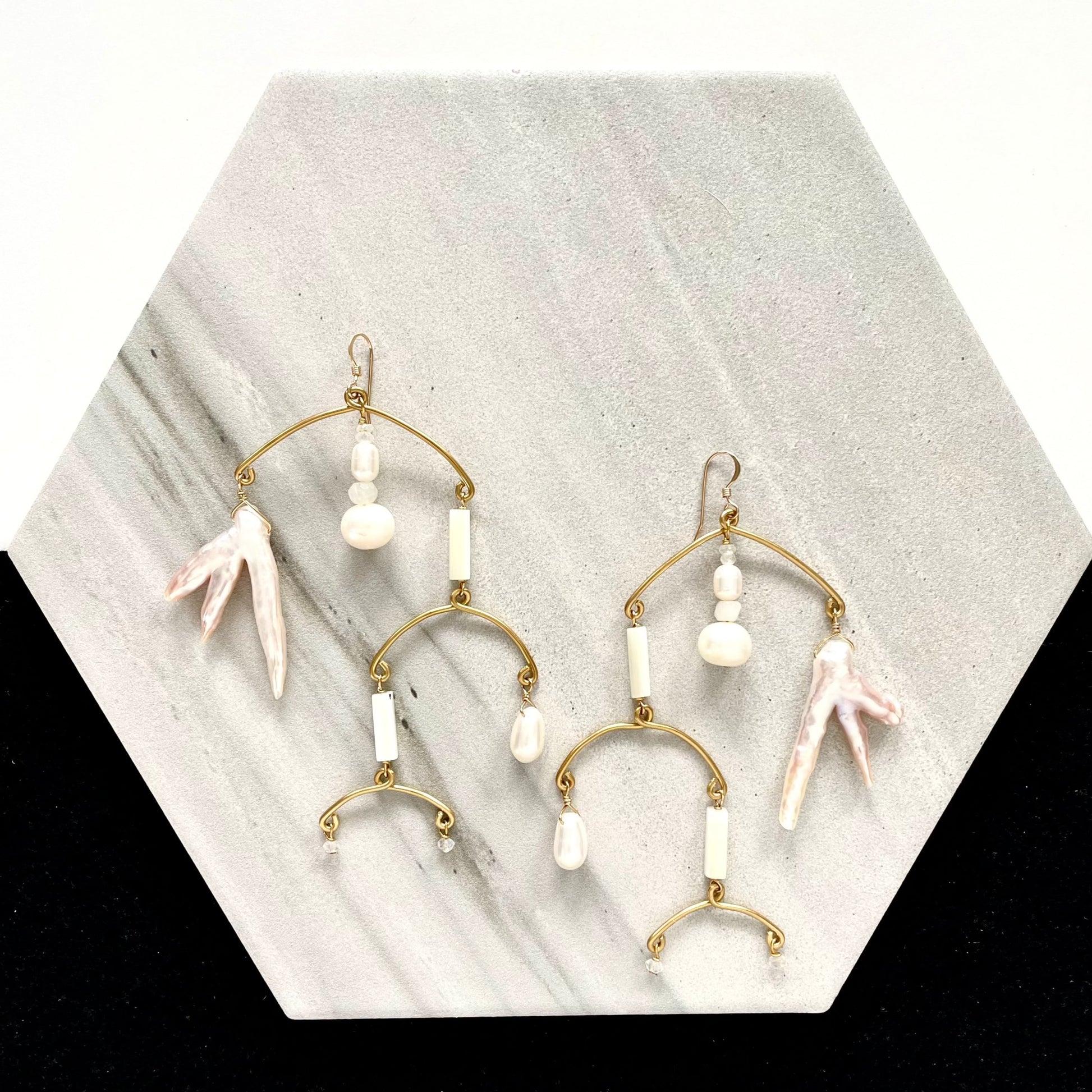 OOAK - Mother of Pearl, Fresh Water Pearl, Moonstone, Brass and 14K Gold Fill Mobile Earrings