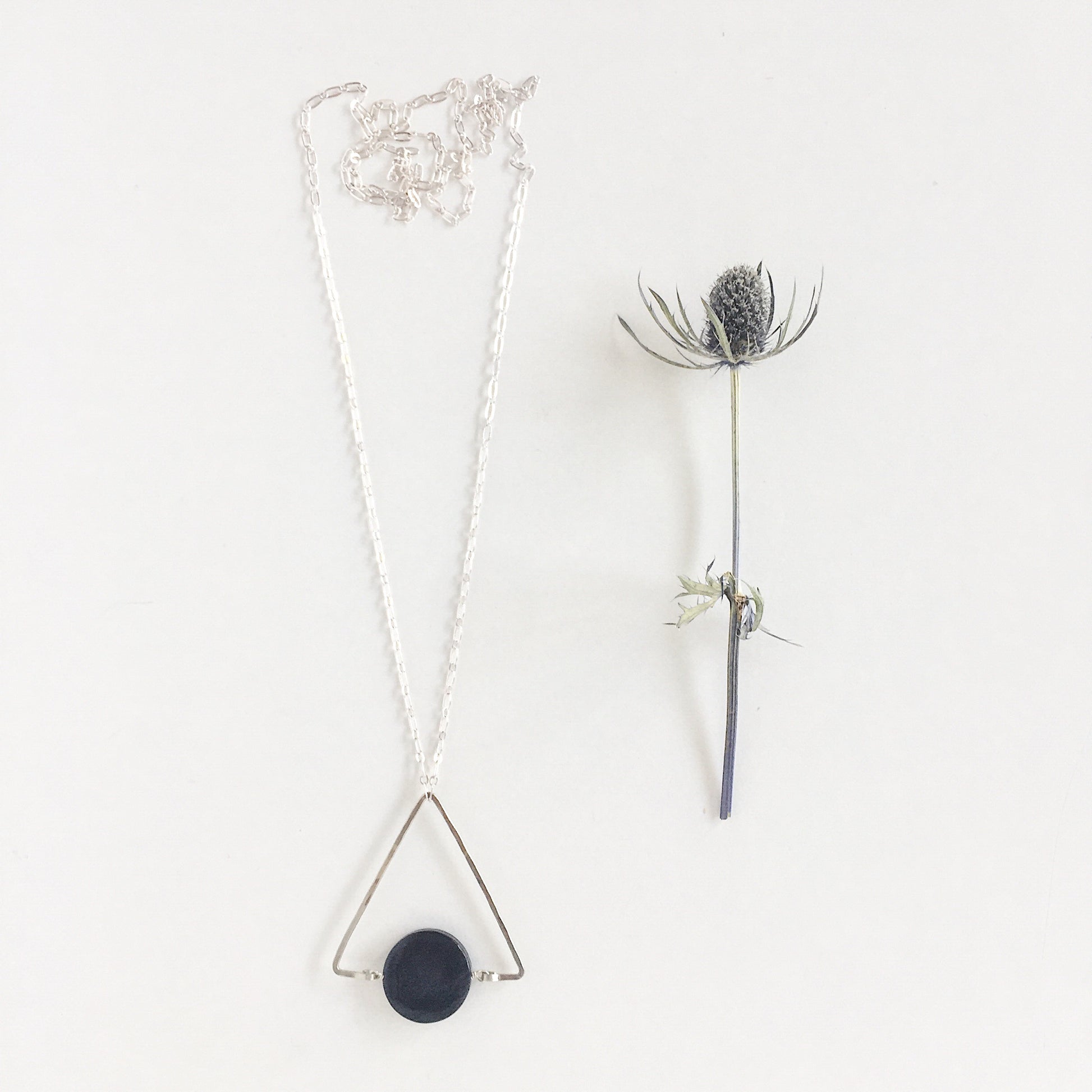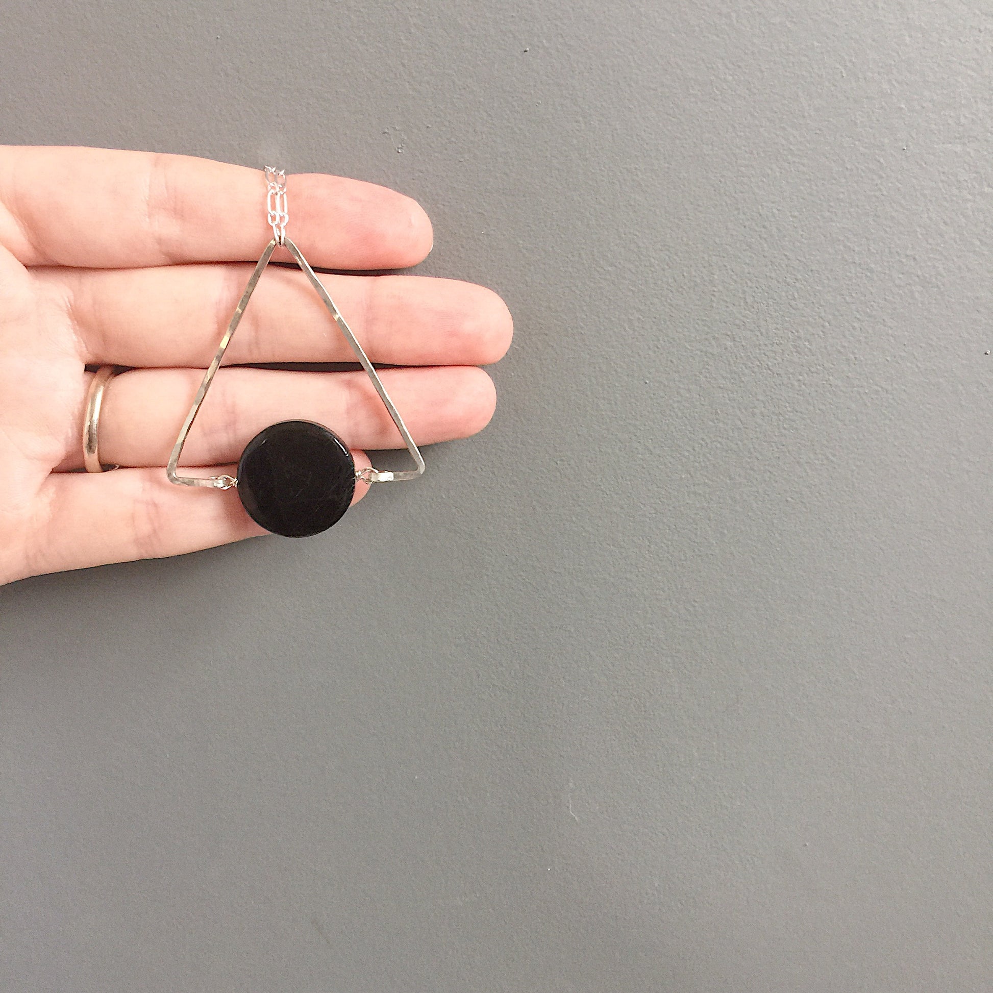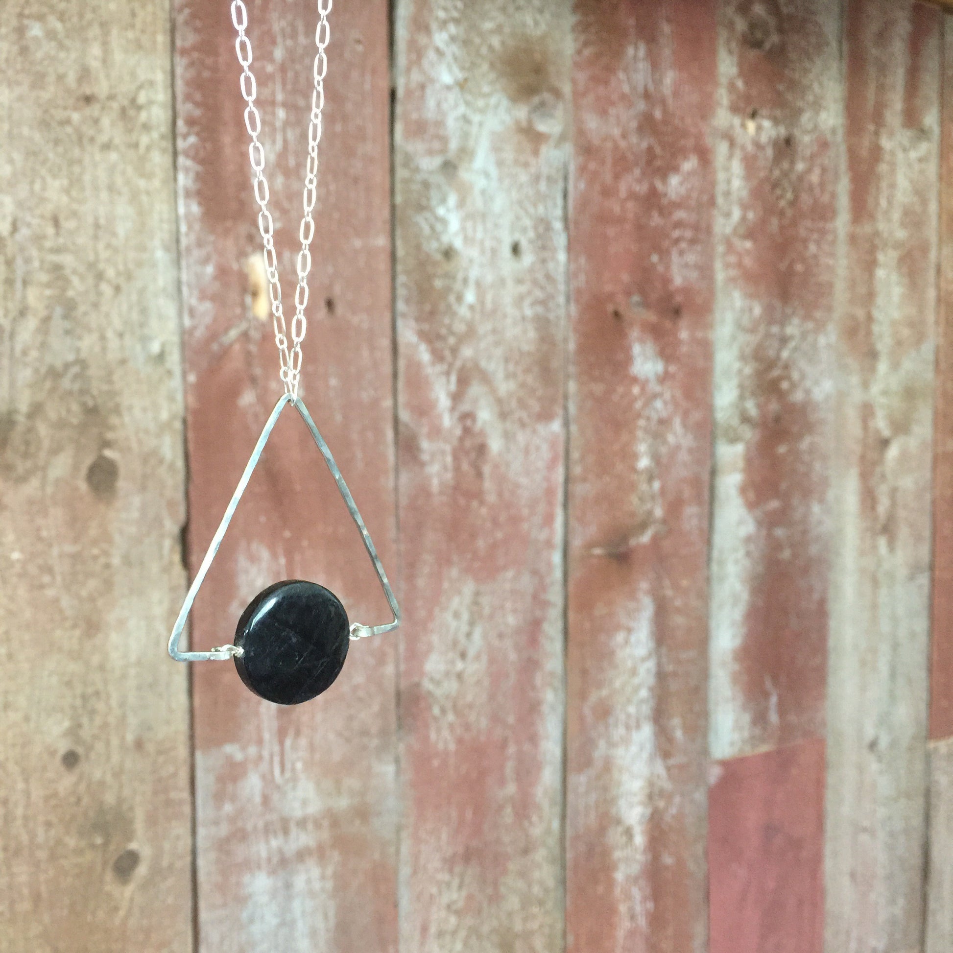 The Cygnus Necklace: a single Hypersthene flat round met with a hand hewn Triangular bead frame in nickel and silver plated chain create this minimalist and versatile necklace.