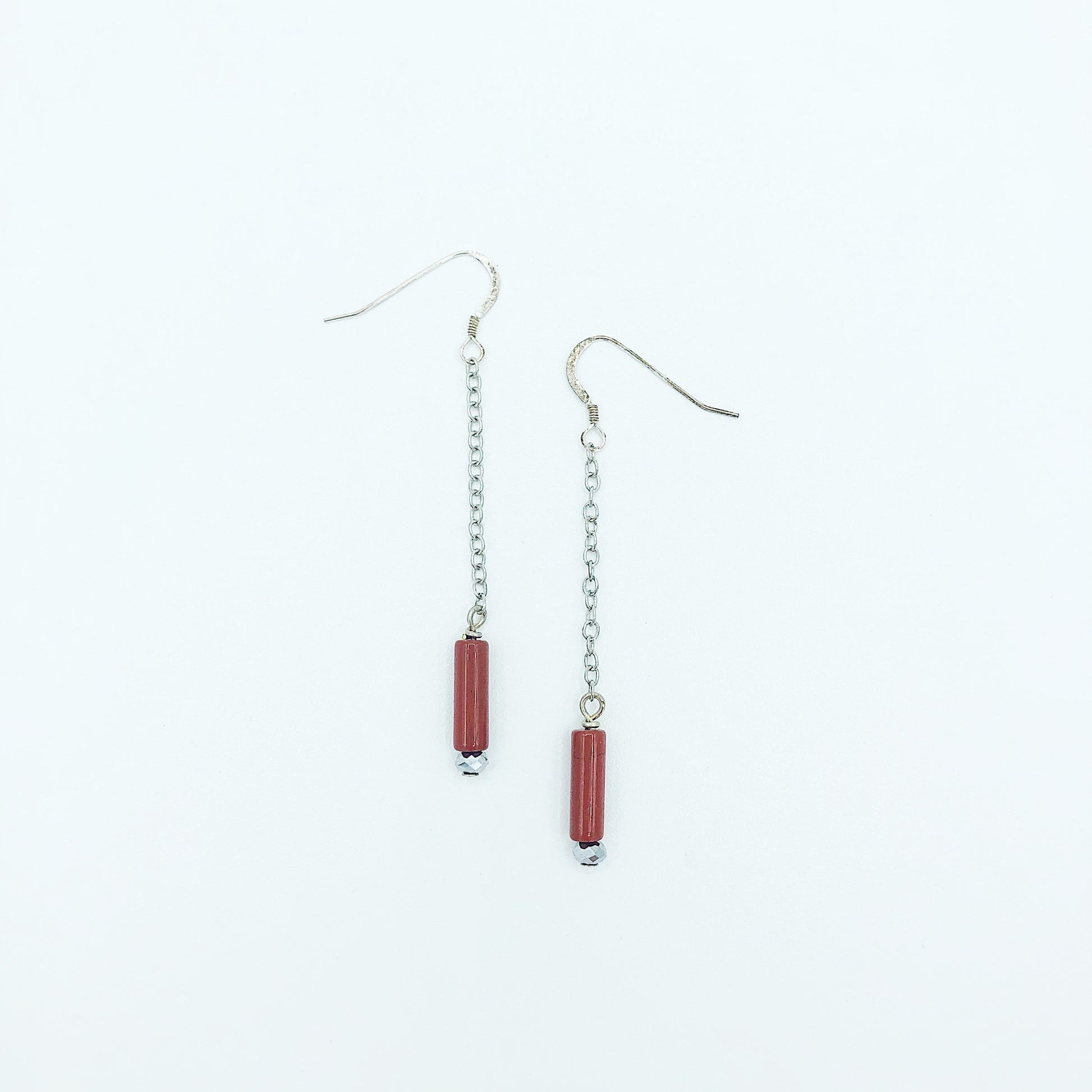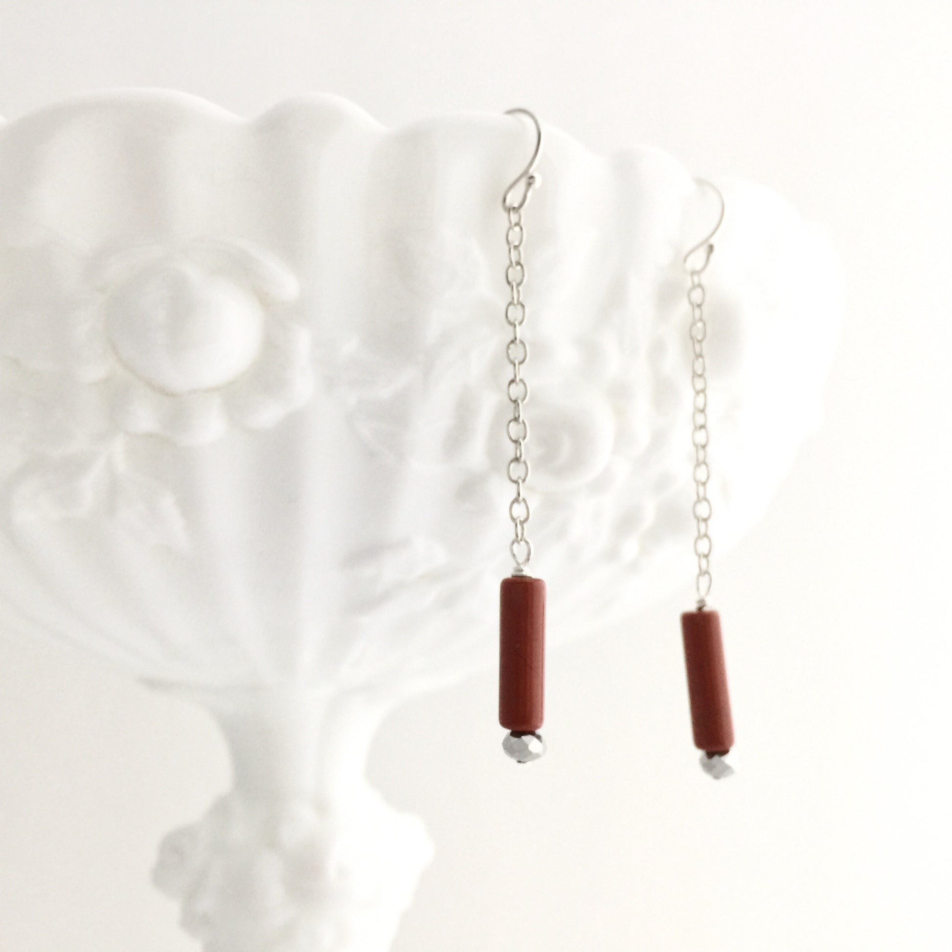 Brick-red Jasper with accents of tiny gunmetal-toned faceted crystal and silver-plated iron chain come together in the minimalist Drift Earrings. This set of earrings is lightweight, full of movement, and the tiny facets in the crystal catch the light ever so slightly. The Drift Earrings look great their own or paired with a tiny set of studs if you have multiple piercings! The ear wires themselves are silver-filled.
