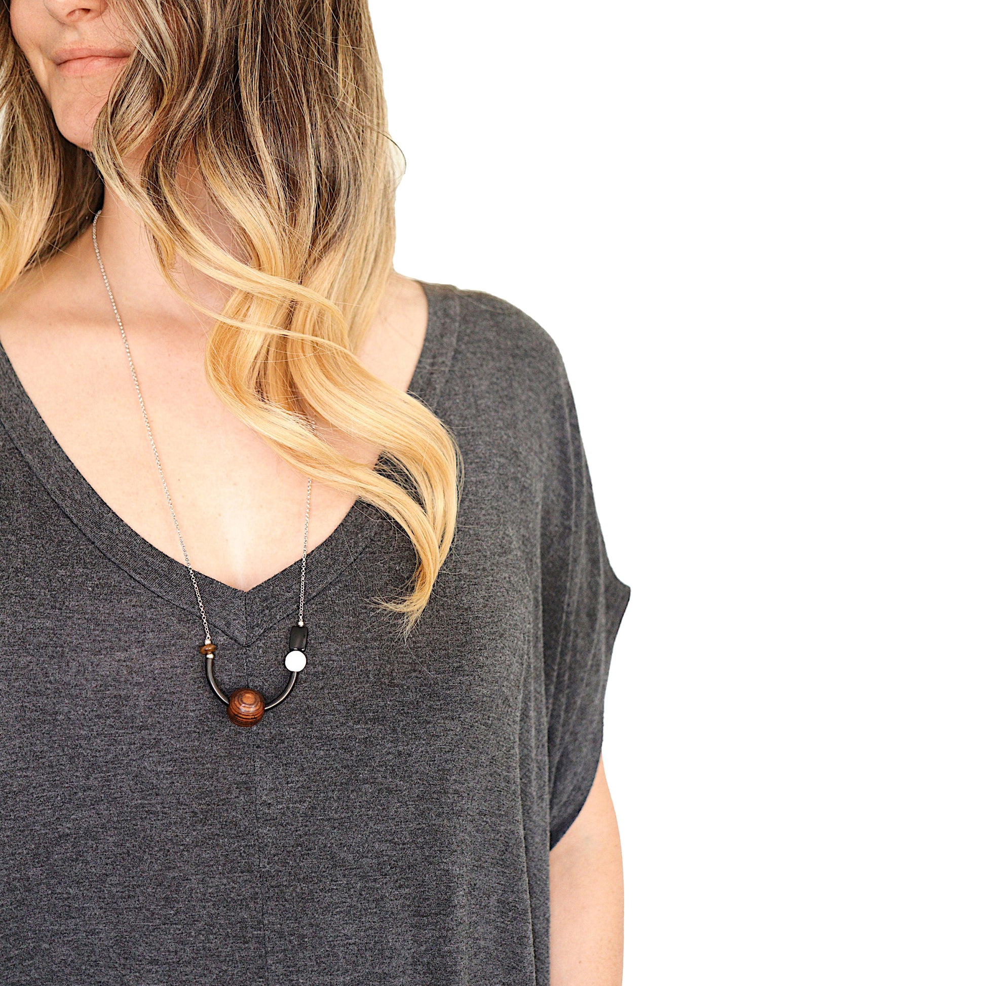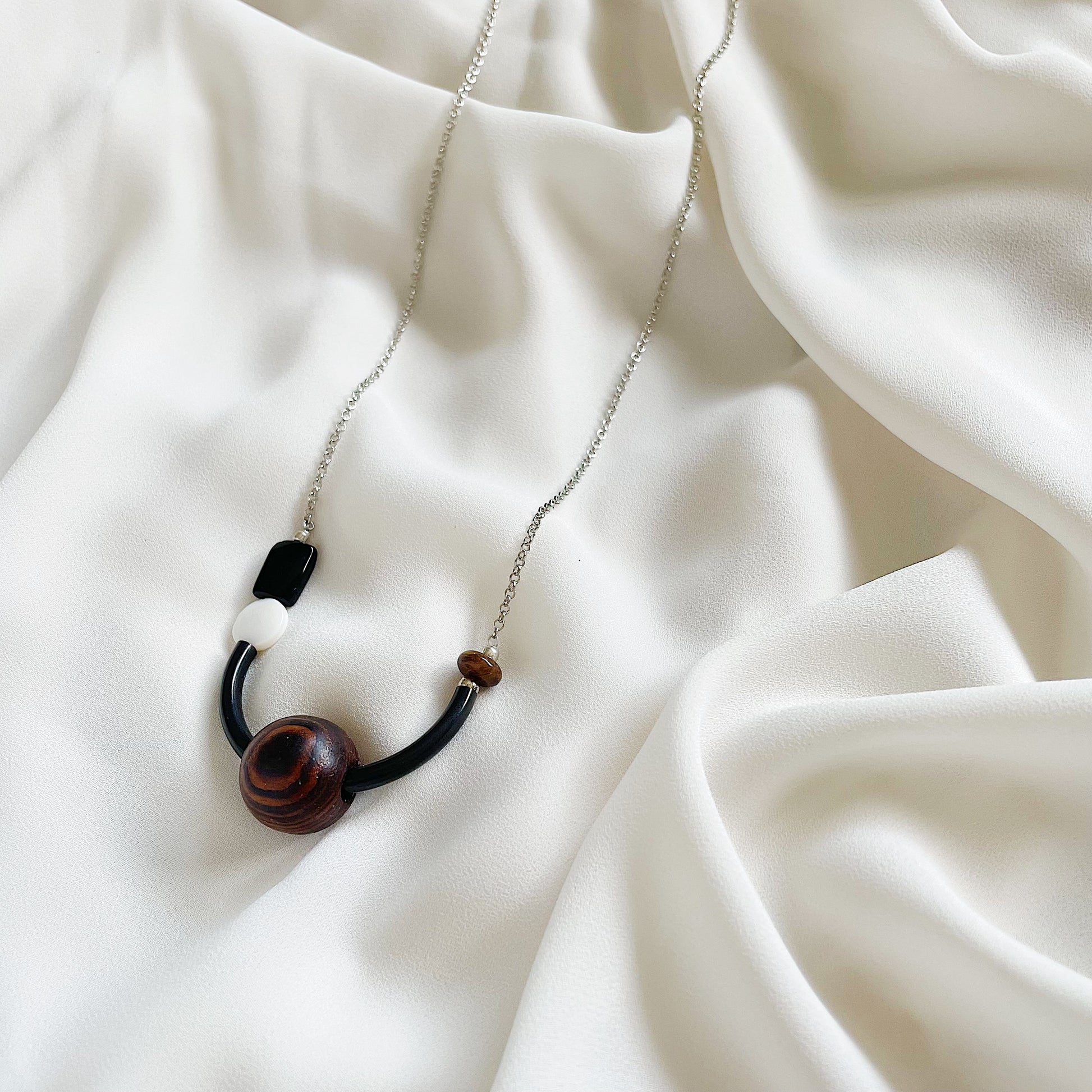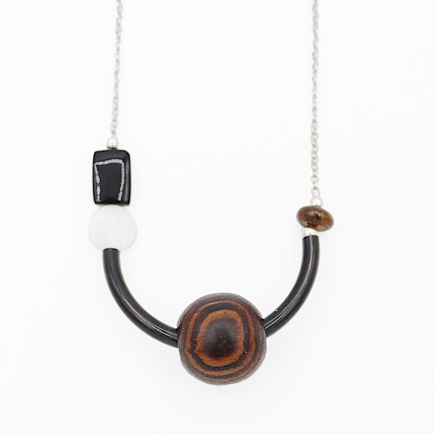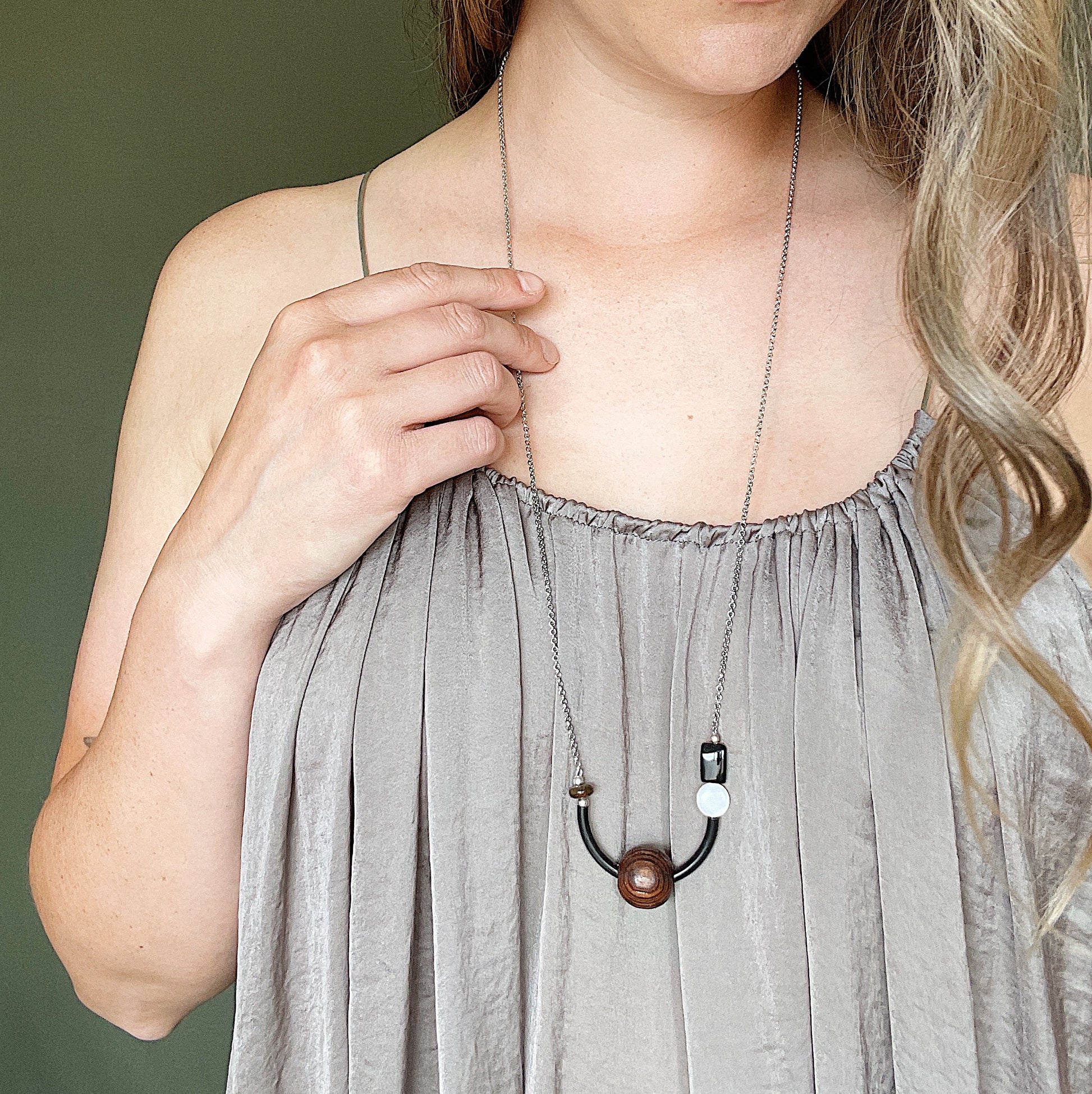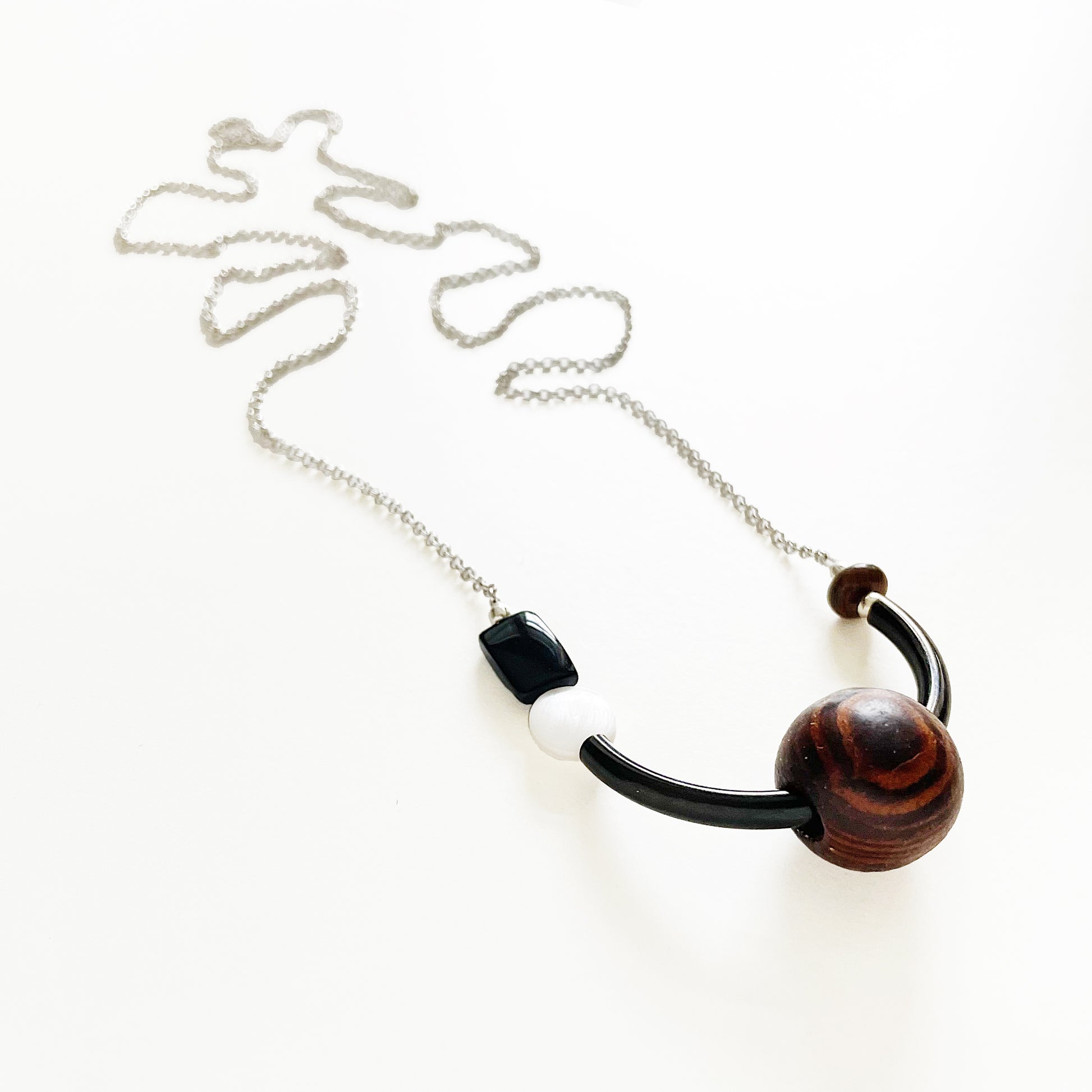 The Eyer Necklace: white mother of pearl with black onyx, black curved tube bead and wooden accent bead met with silver-toned nickel-free chain, create this lightweight, asymmetric, neutral and geometric piece.