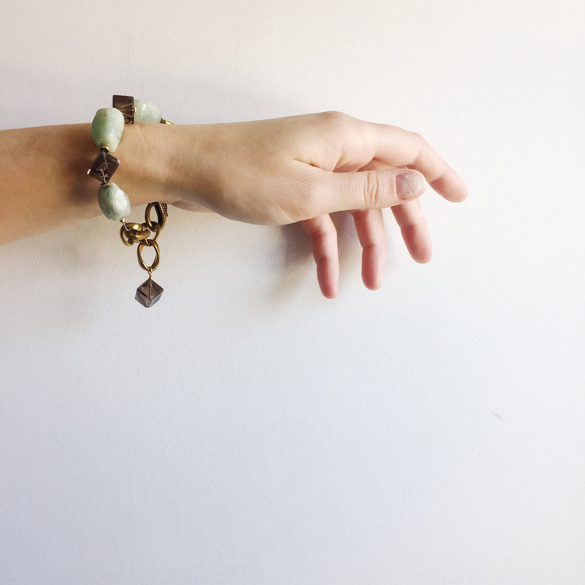 Three Aquamarine nuggets combined with small smokey Quartz squares come together with vintage brass chain for a versatile bracelet with adjustable length. Typically aquamarine is thought to be blue in color exclusively, but these particular nuggets veer more green overall in color, with swirls of brown/gray/black interspersed throughout. The Flux Bracelet looks great on its own or worn layered with a few of your other favorite bracelets!