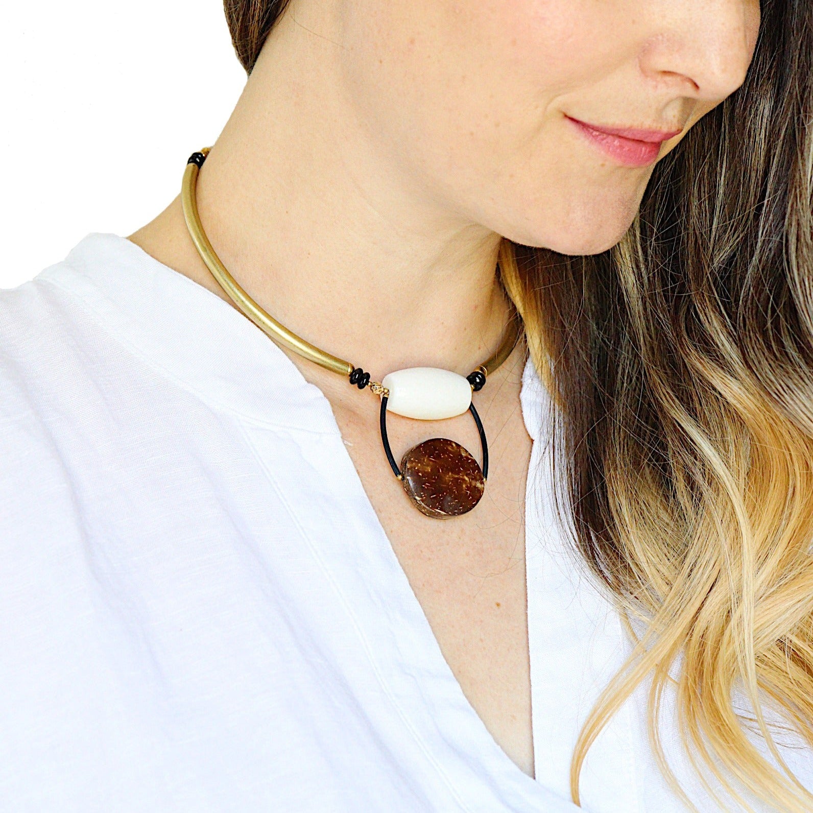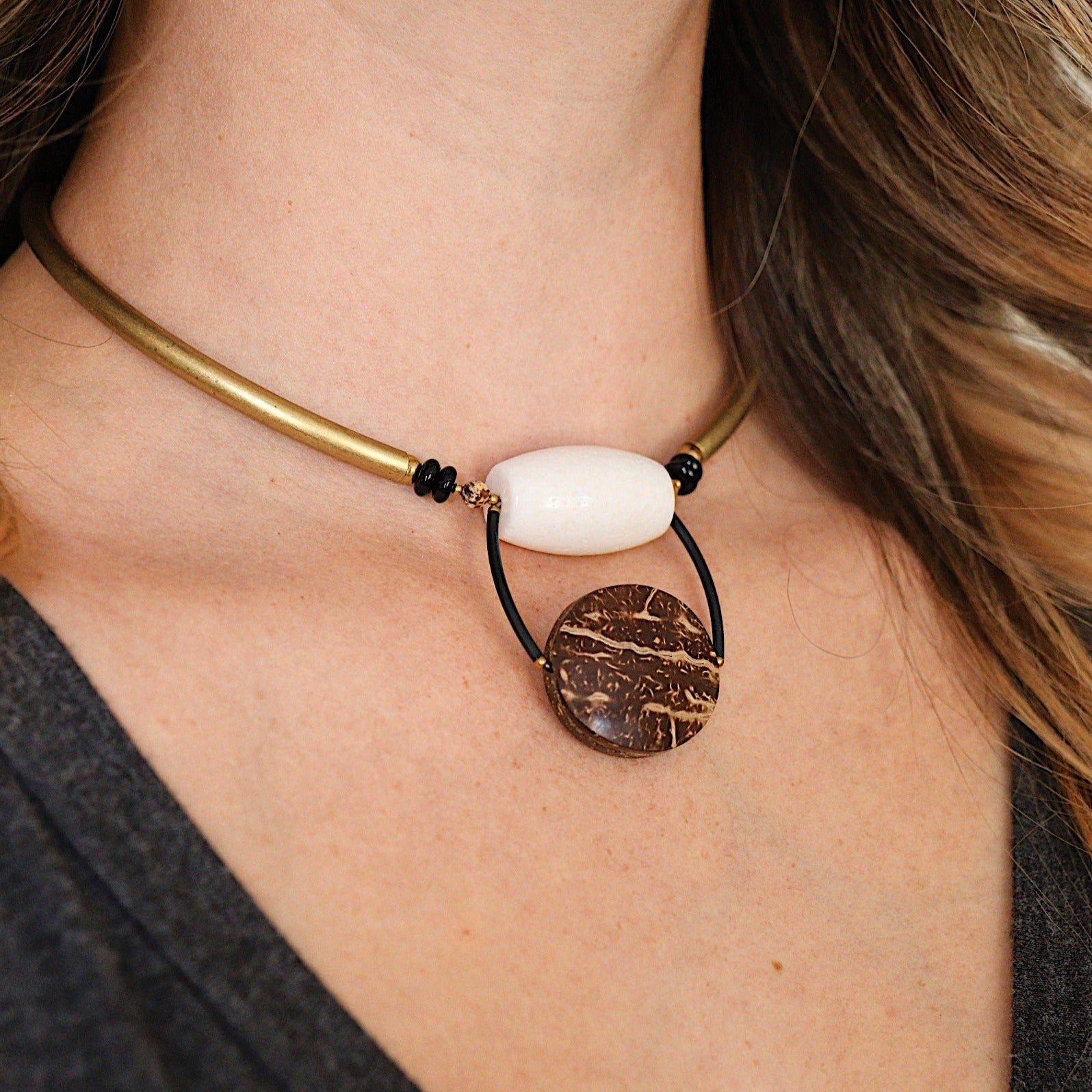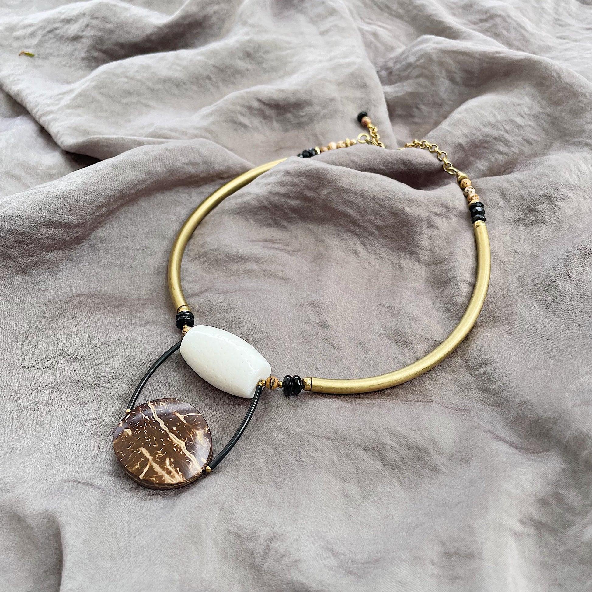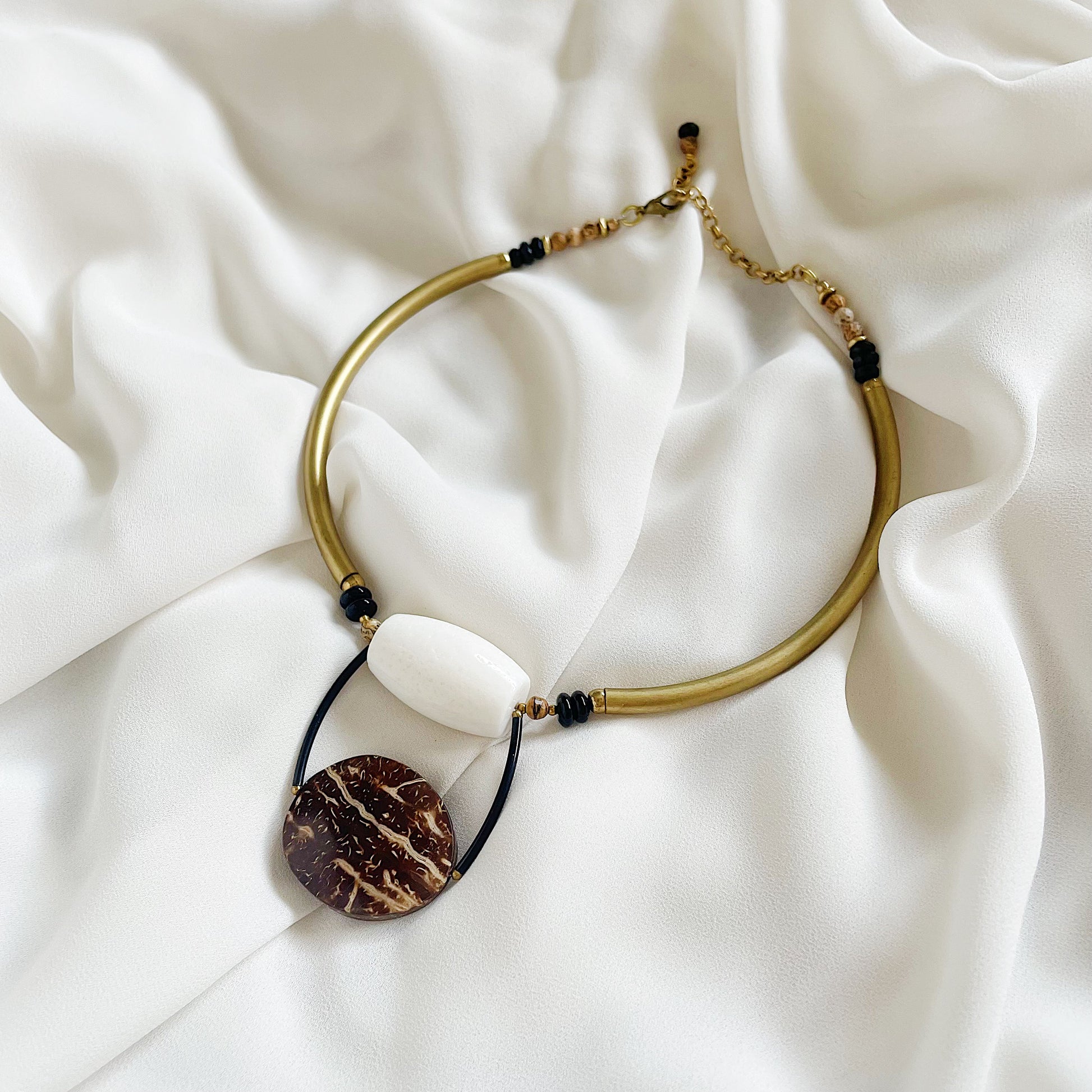 The Hara Necklace: a white coral barrel met with an oval cut coconut shell, faceted picture Jasper, Onyx, vintage chain, brass and matte black tube beads create this neutral toned adjustable-length statement necklace.