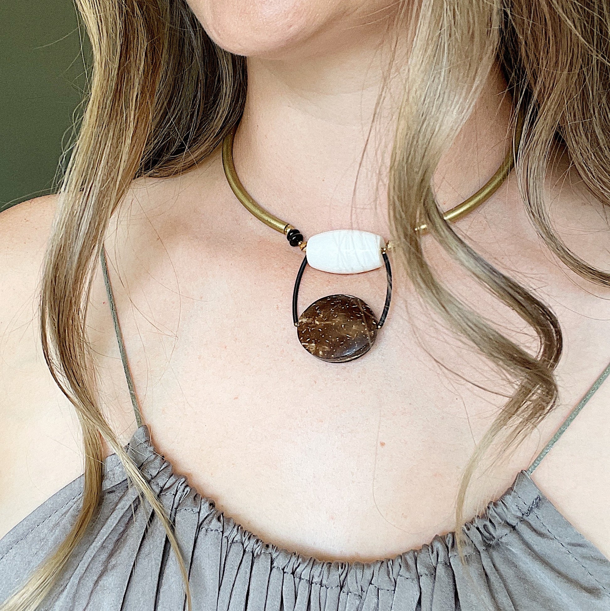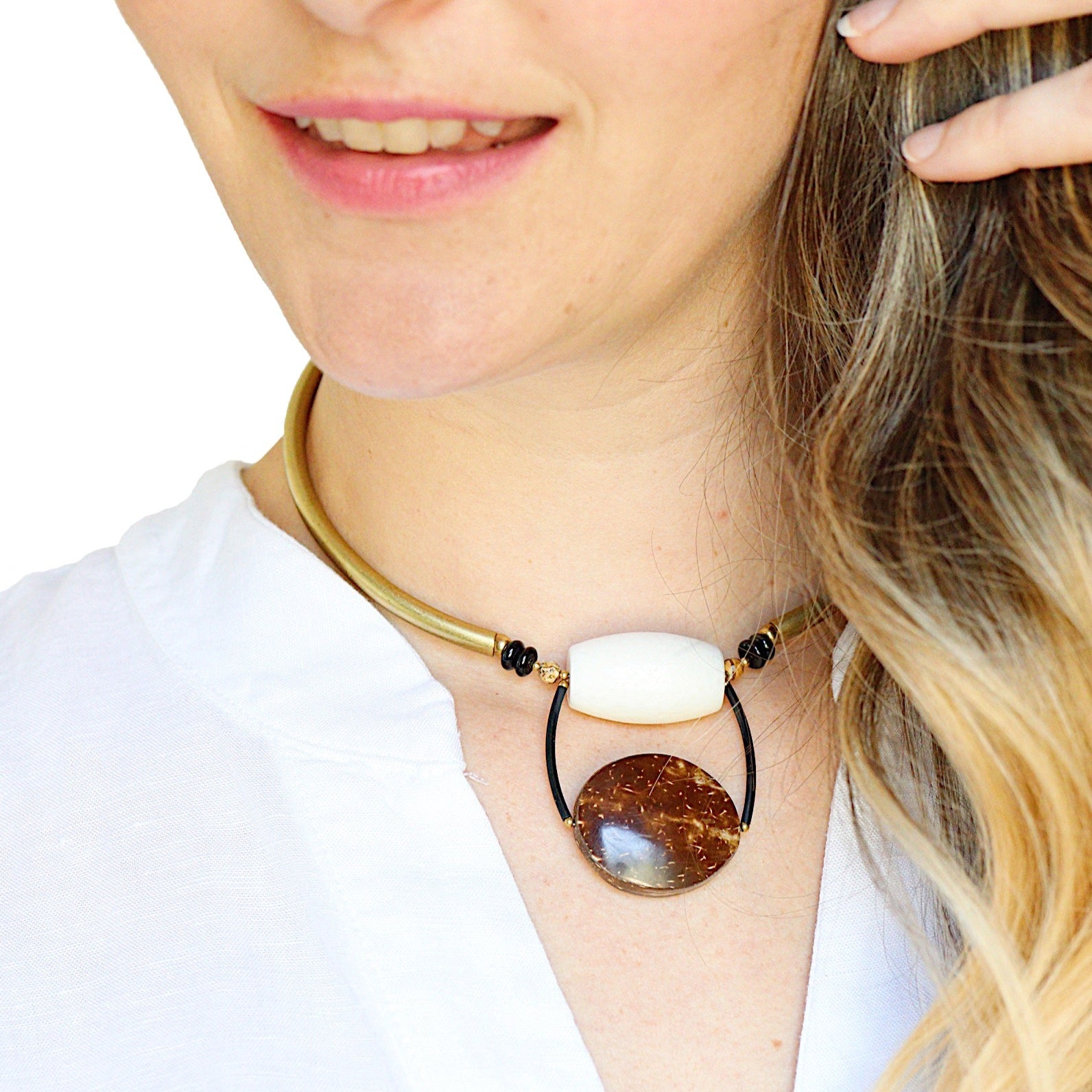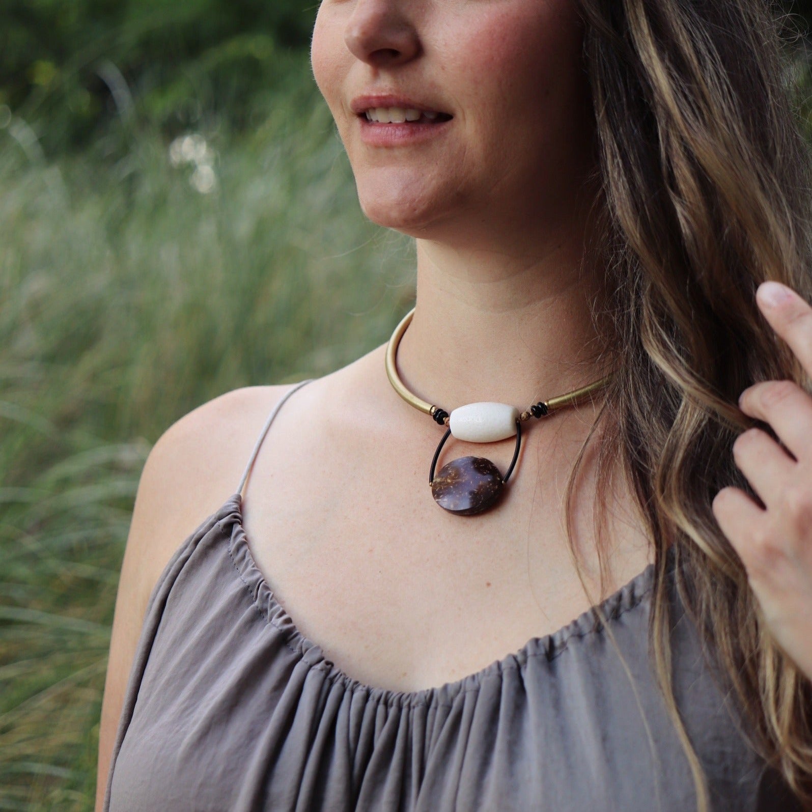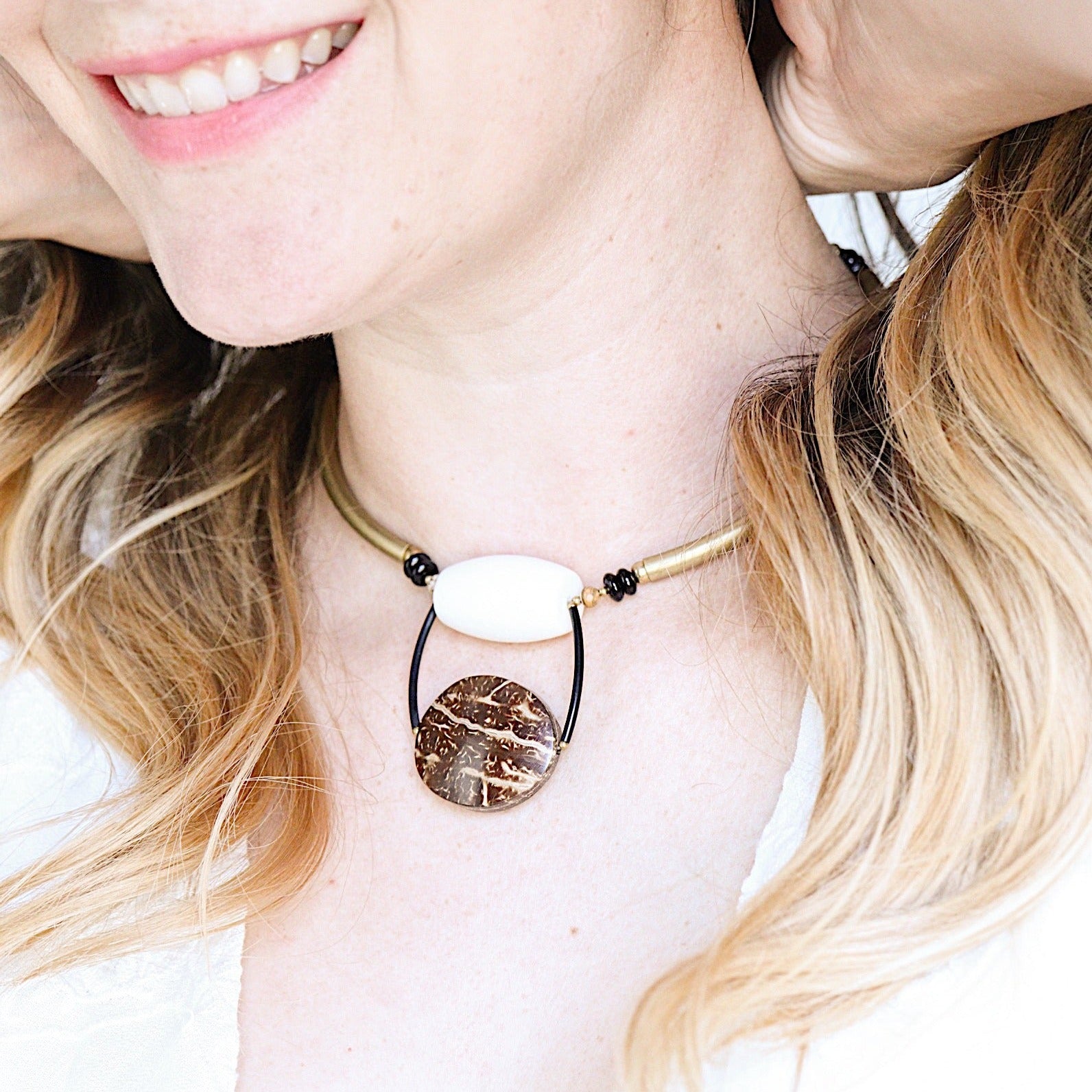 The Hara Necklace: a white coral barrel met with an oval cut coconut shell, faceted picture Jasper, Onyx, vintage chain, brass and matte black tube beads create this neutral toned adjustable-length statement necklace.