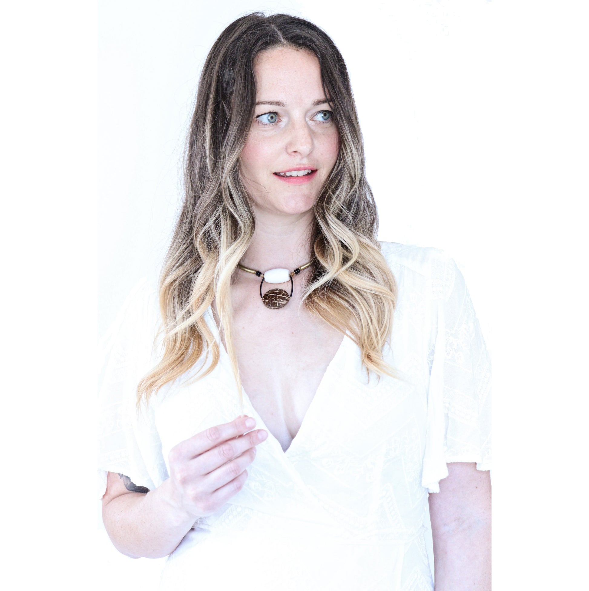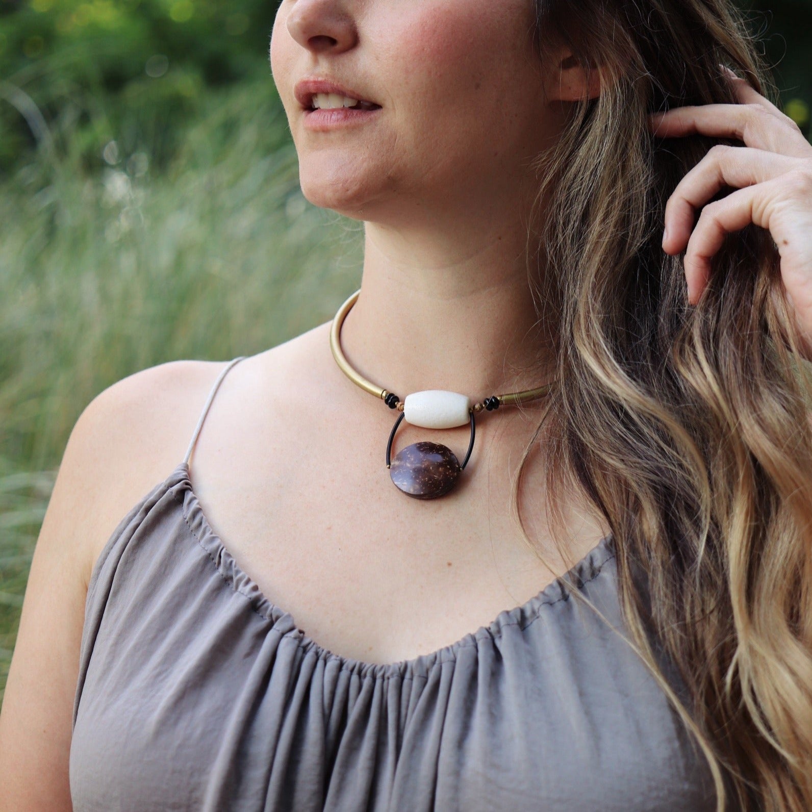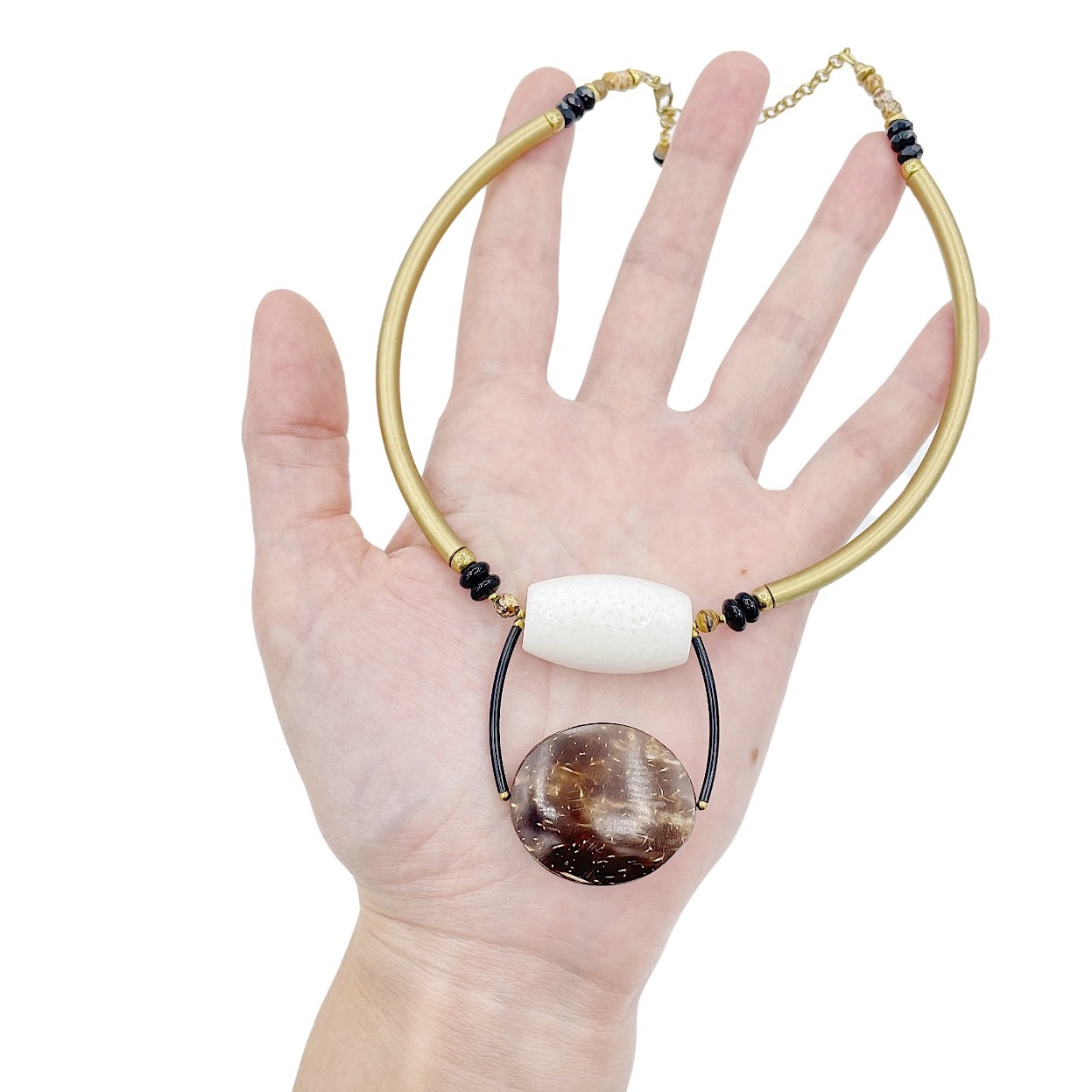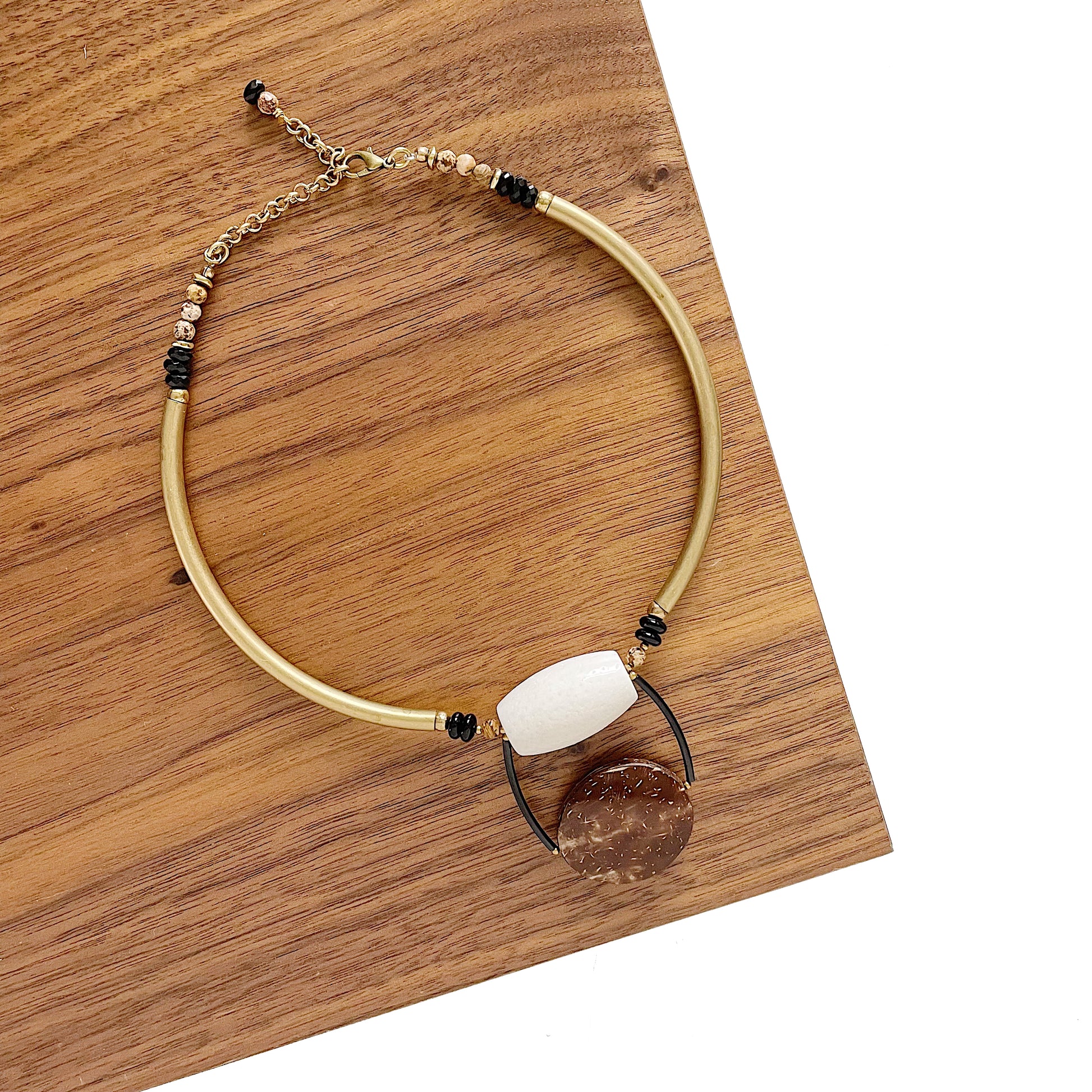 The Hara Necklace: a white coral barrel met with an oval cut coconut shell, faceted picture Jasper, Onyx, vintage chain, brass and matte black tube beads create this neutral toned adjustable-length statement necklace.