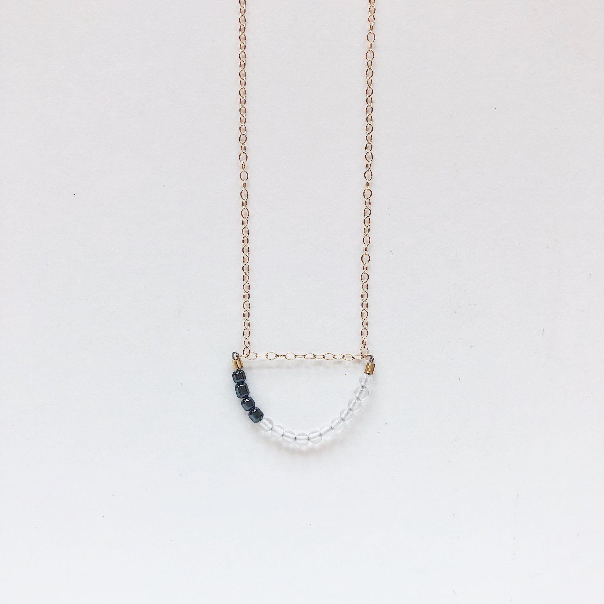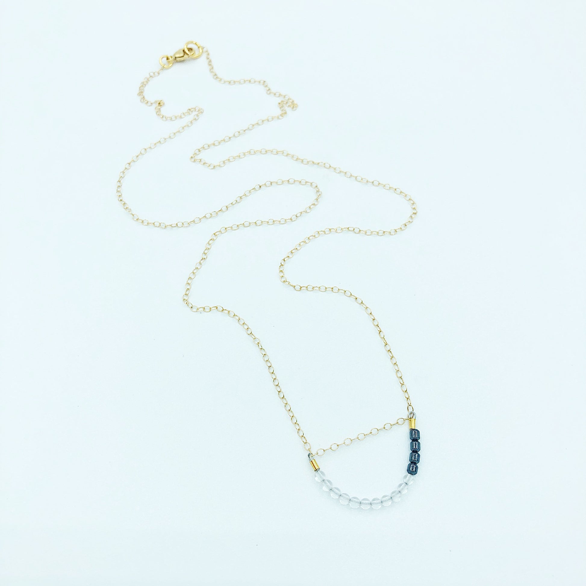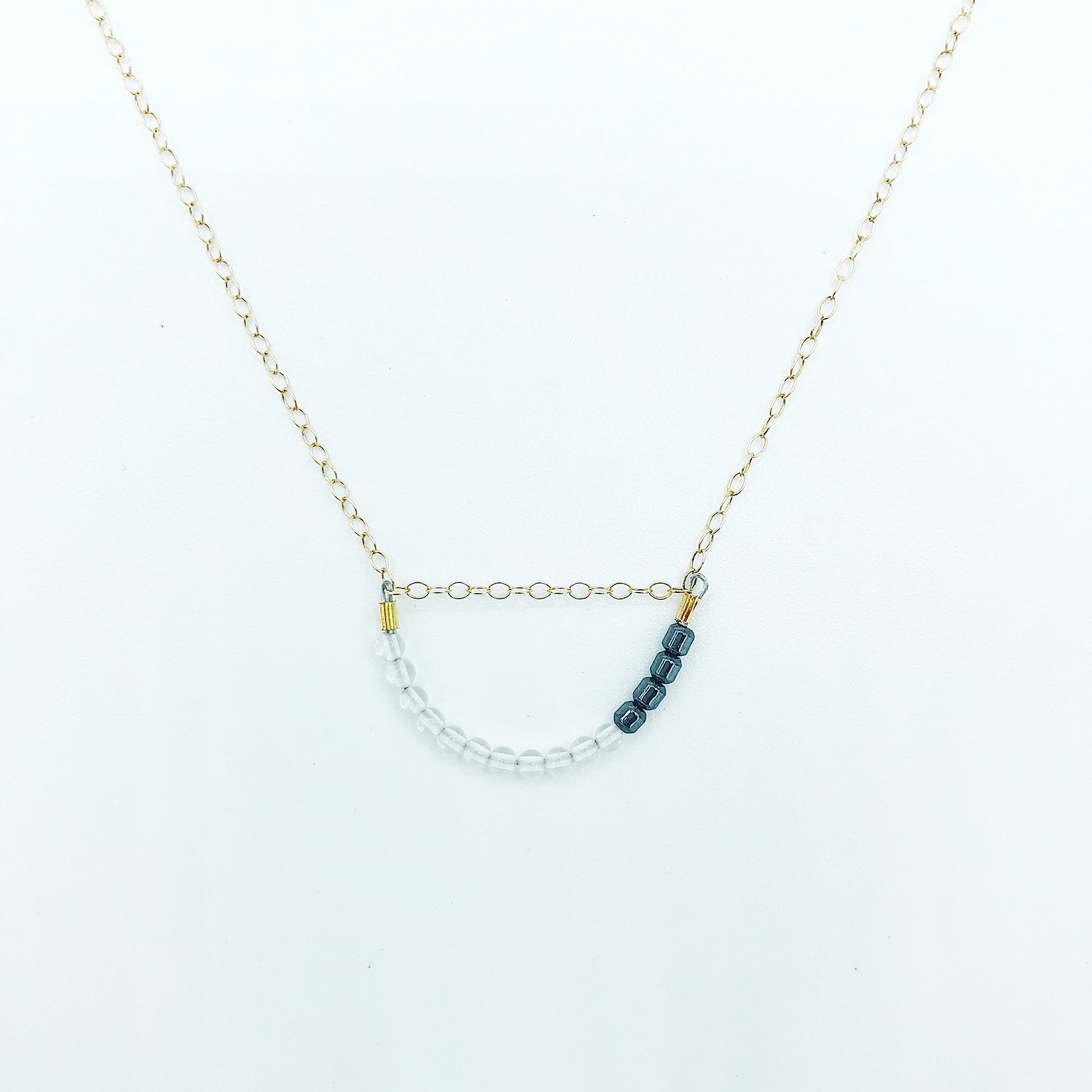 The Hematite and Quartz Minimalist Necklace: a delicate arch with Hematite and Quartz met with 14K Gold Fill chain creates this lightweight and versatile piece, which can easily transition from holiday to everyday wear with its neutral colors.