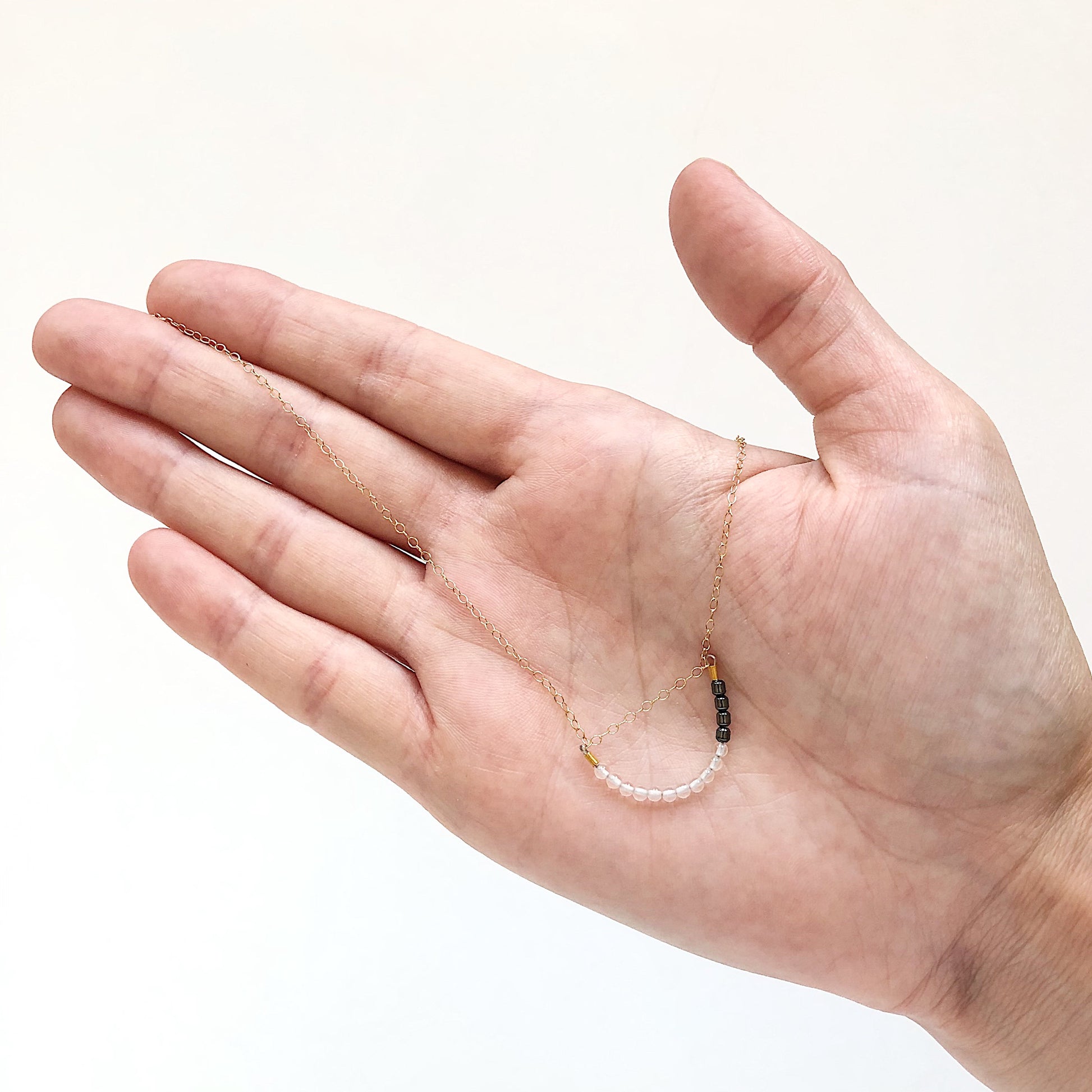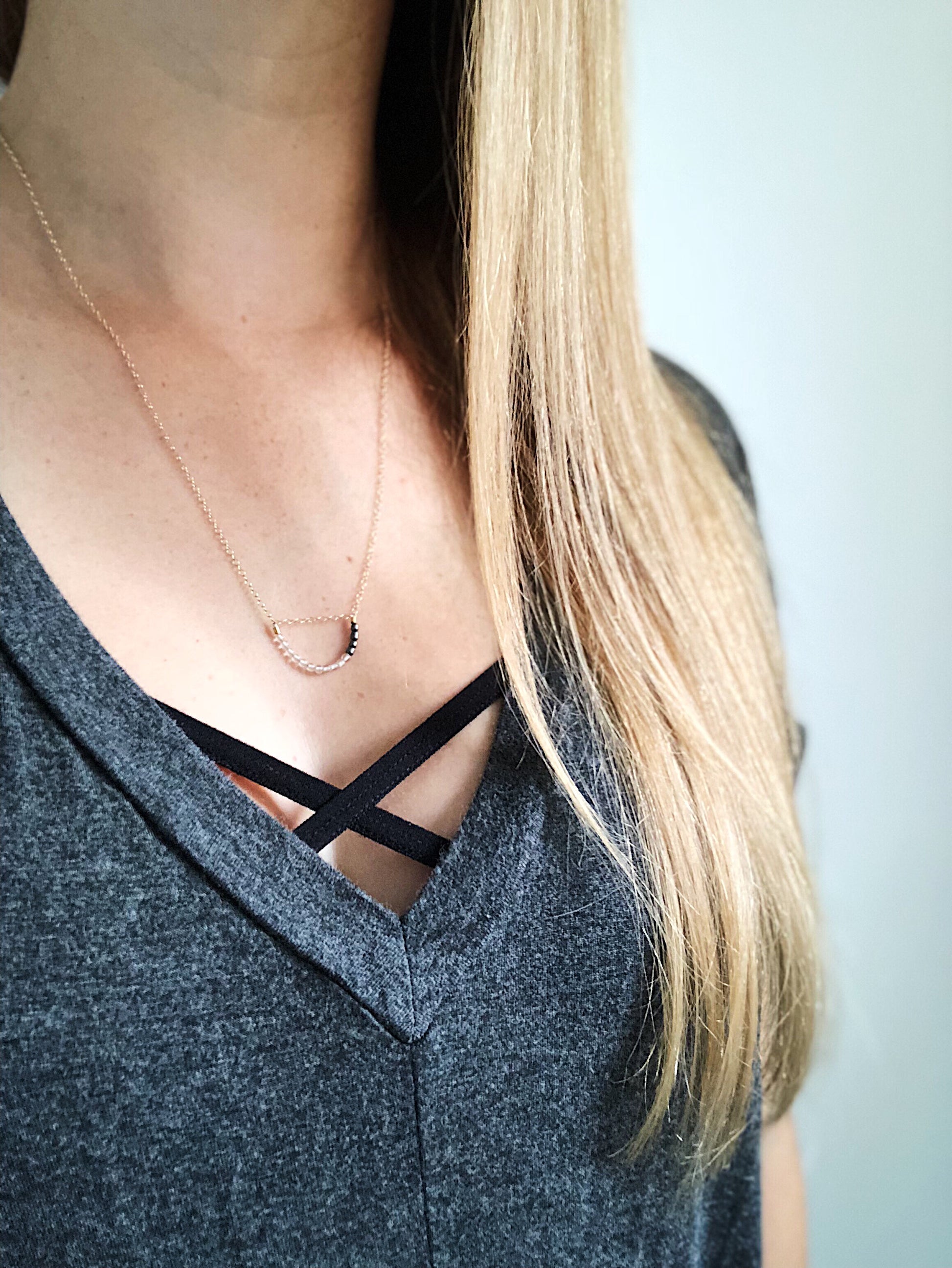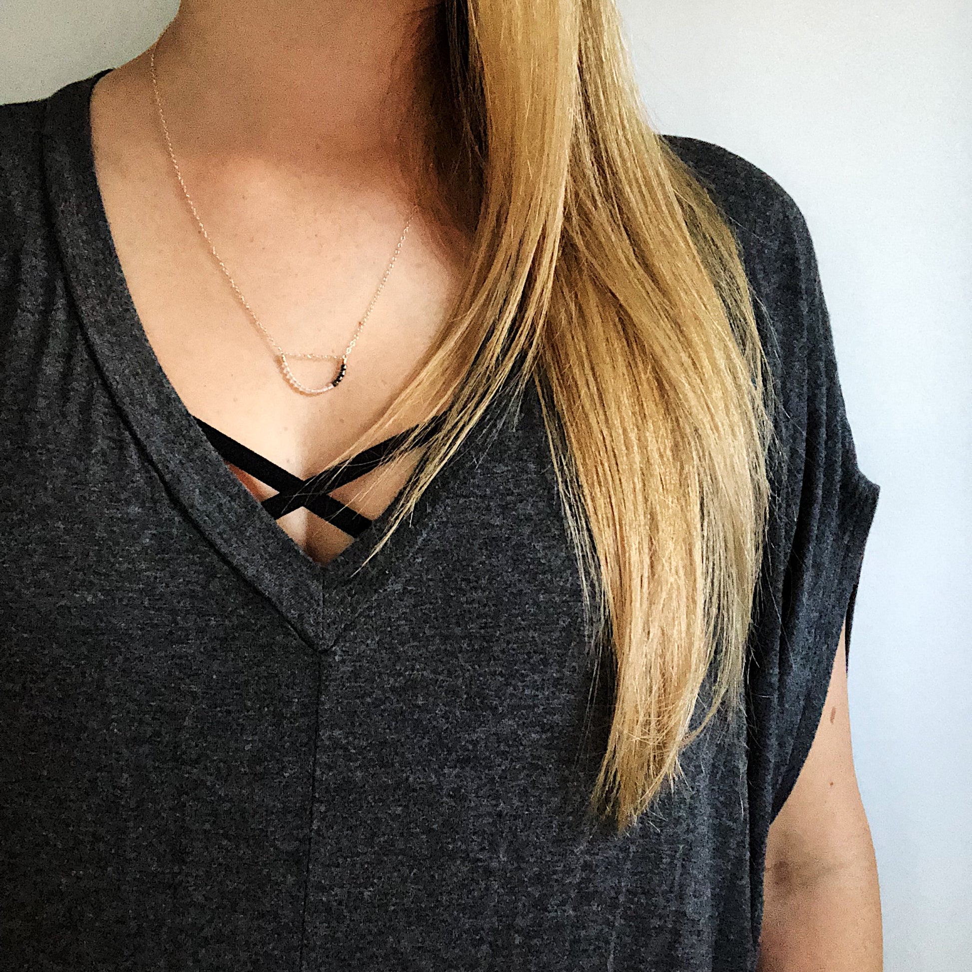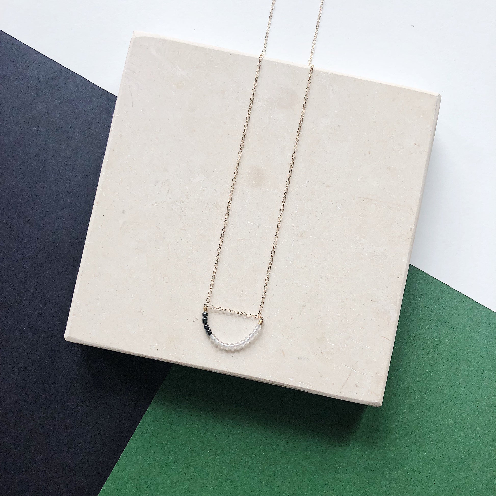 The Hematite and Quartz Minimalist Necklace: a delicate arch with Hematite and Quartz met with 14K Gold Fill chain creates this lightweight and versatile piece, which can easily transition from holiday to everyday wear with its neutral colors.