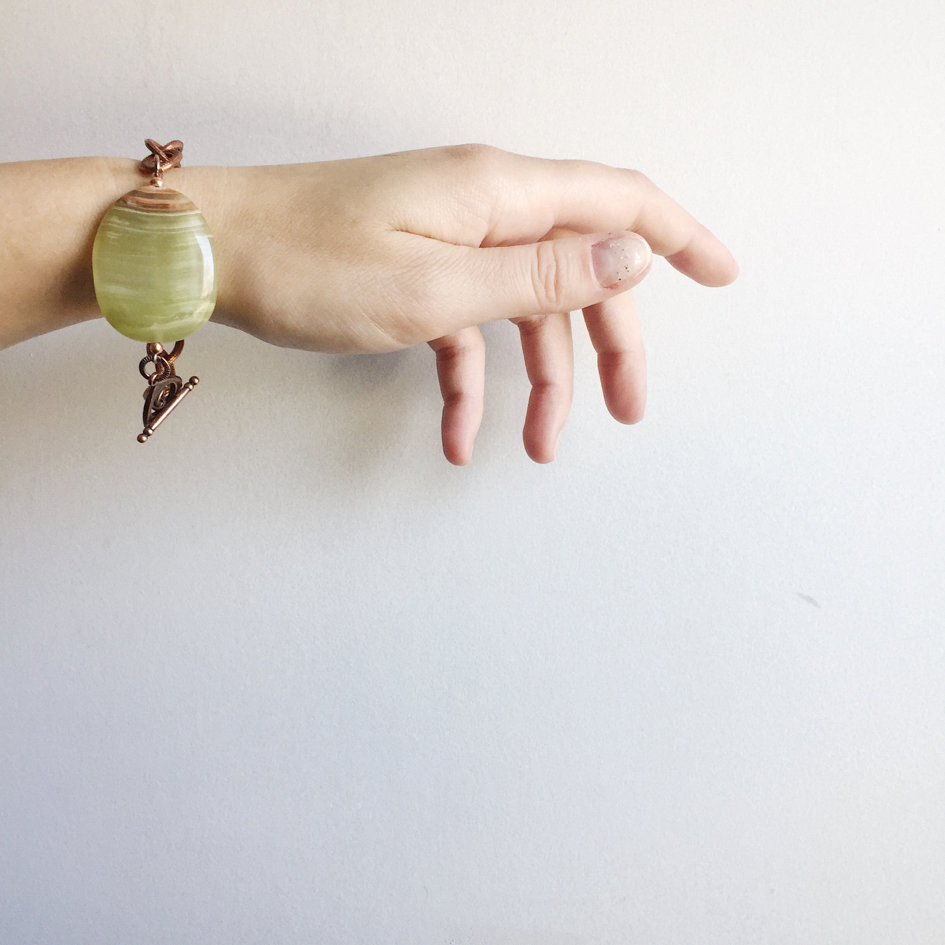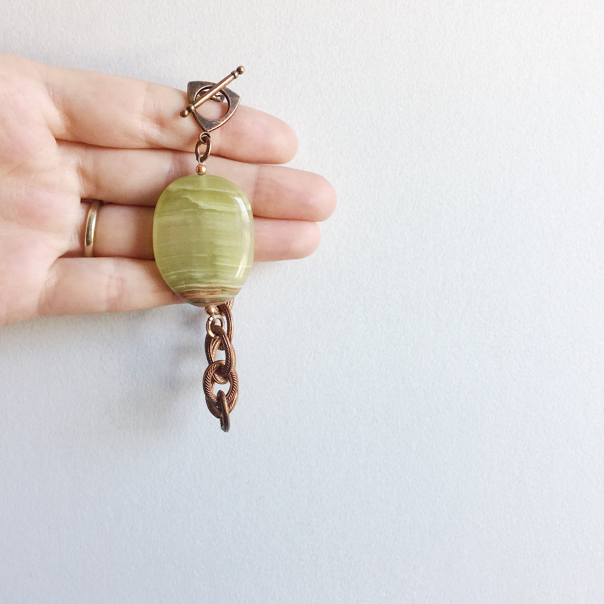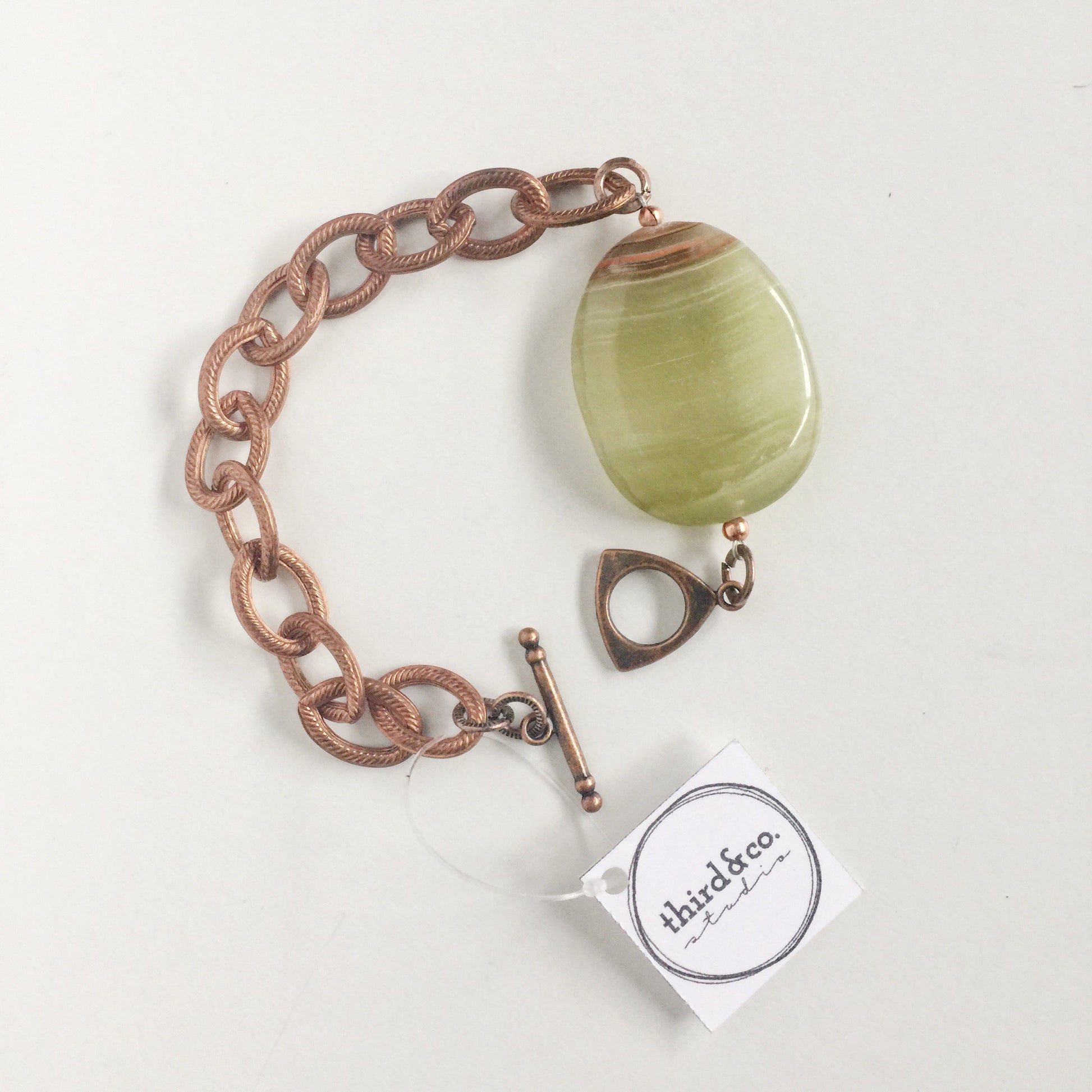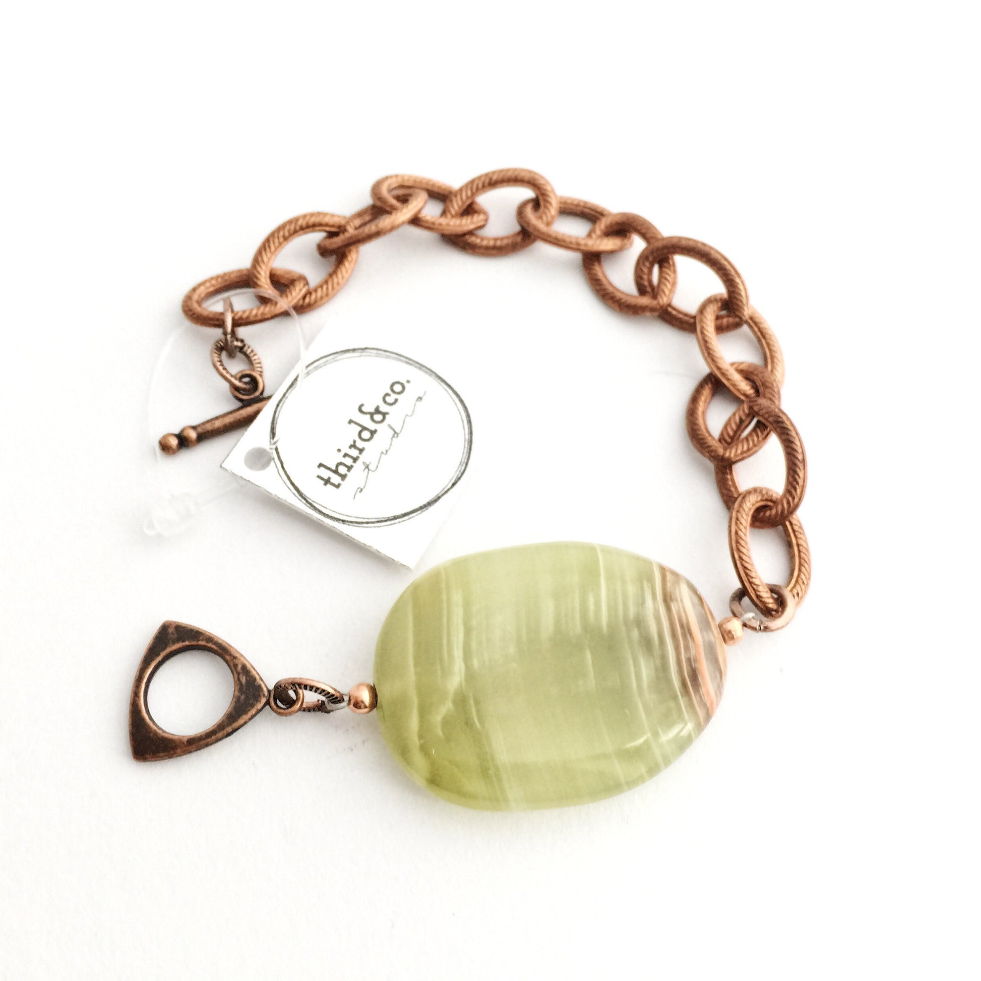 Textured copper chain meets a single large Agate oval with green being the predominant color, swirled with off-white, tan, brown and copper tones to make a simple yet bold design. The Isotope Bracelet looks great on its own or worn layered with a few of your other favorite bracelets!