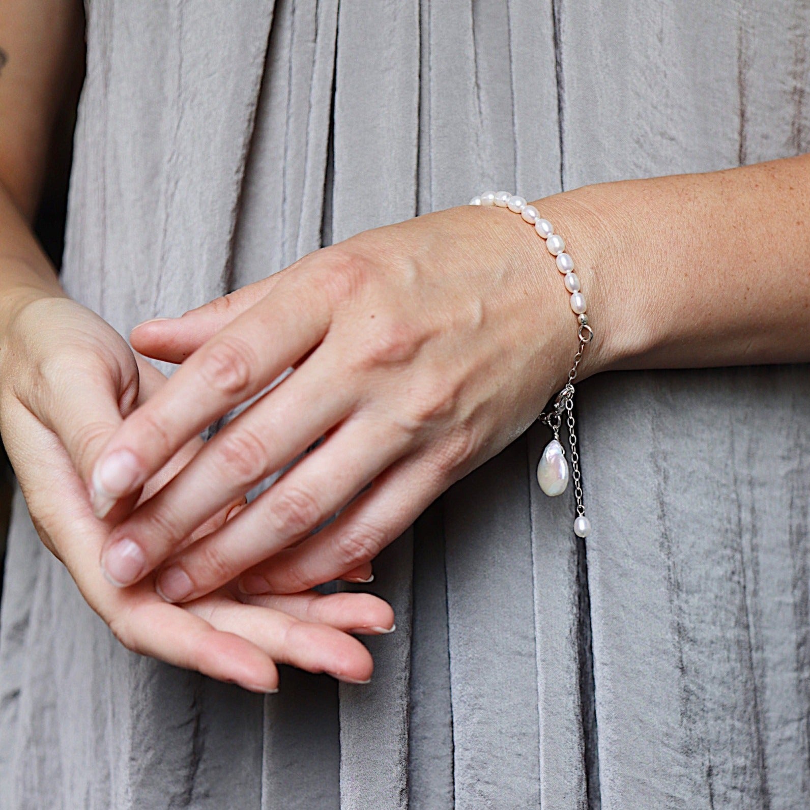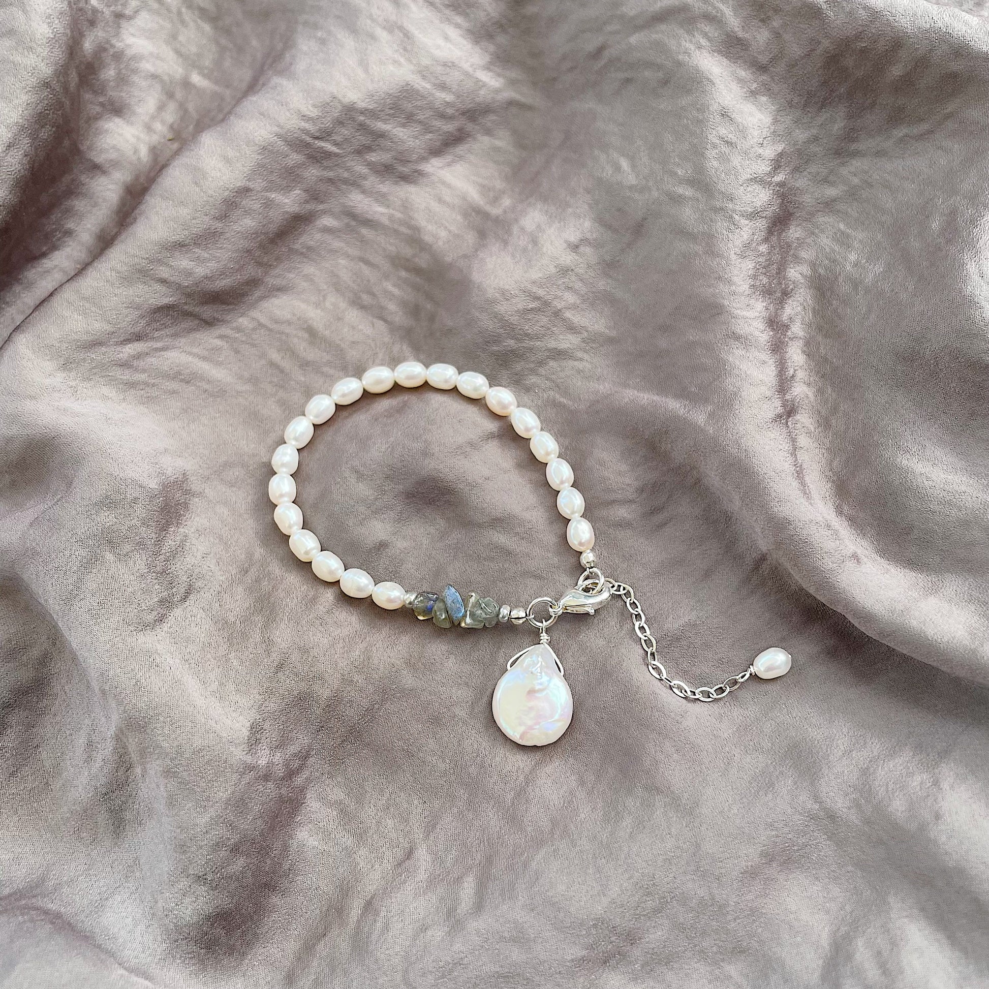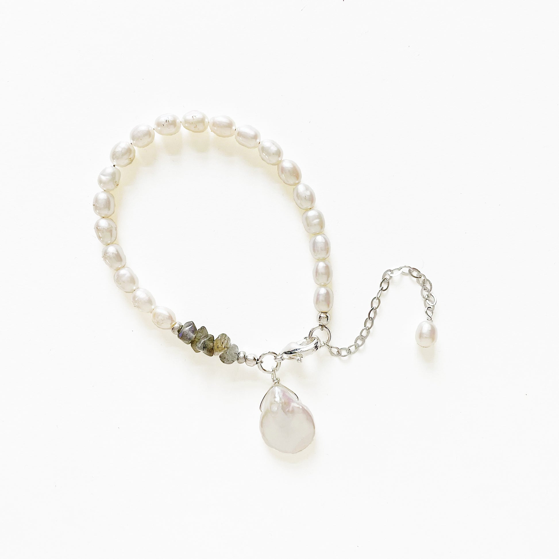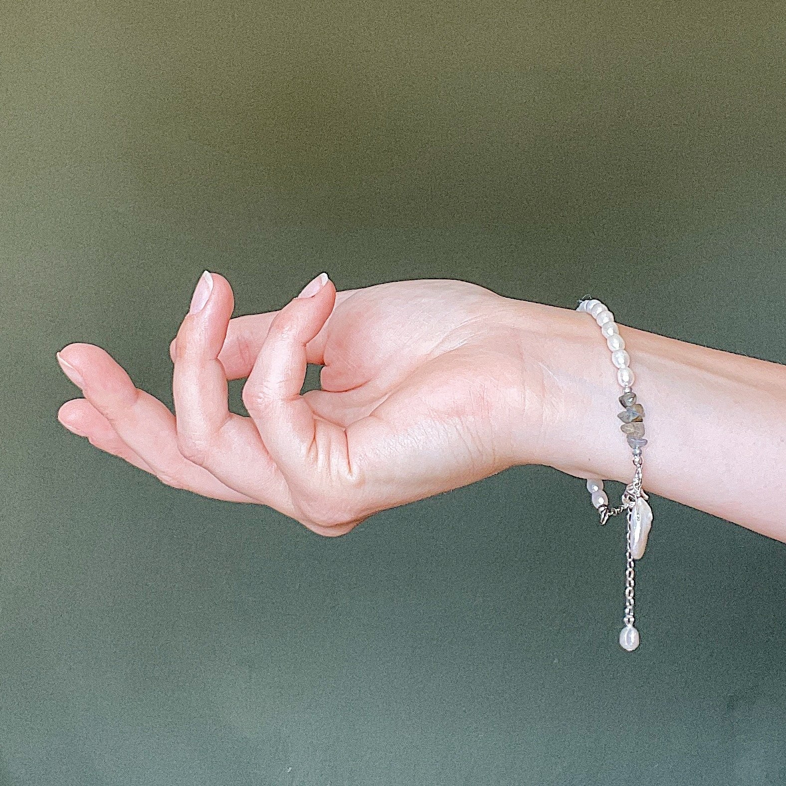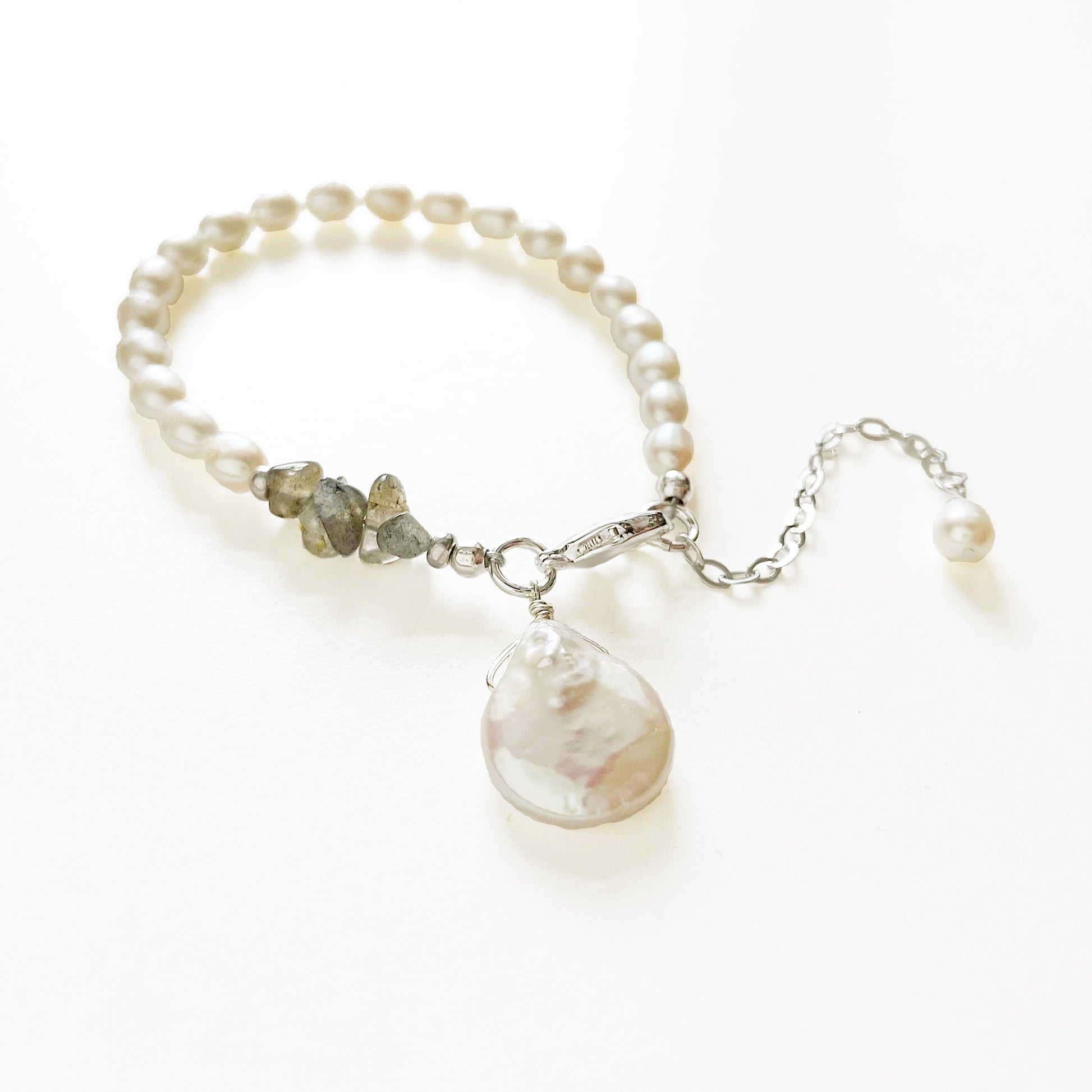 The Leda Bracelet: white fresh water pearl with labradorite, and sterling silver chain chain, create this timeless, neutral and adjustable length piece.