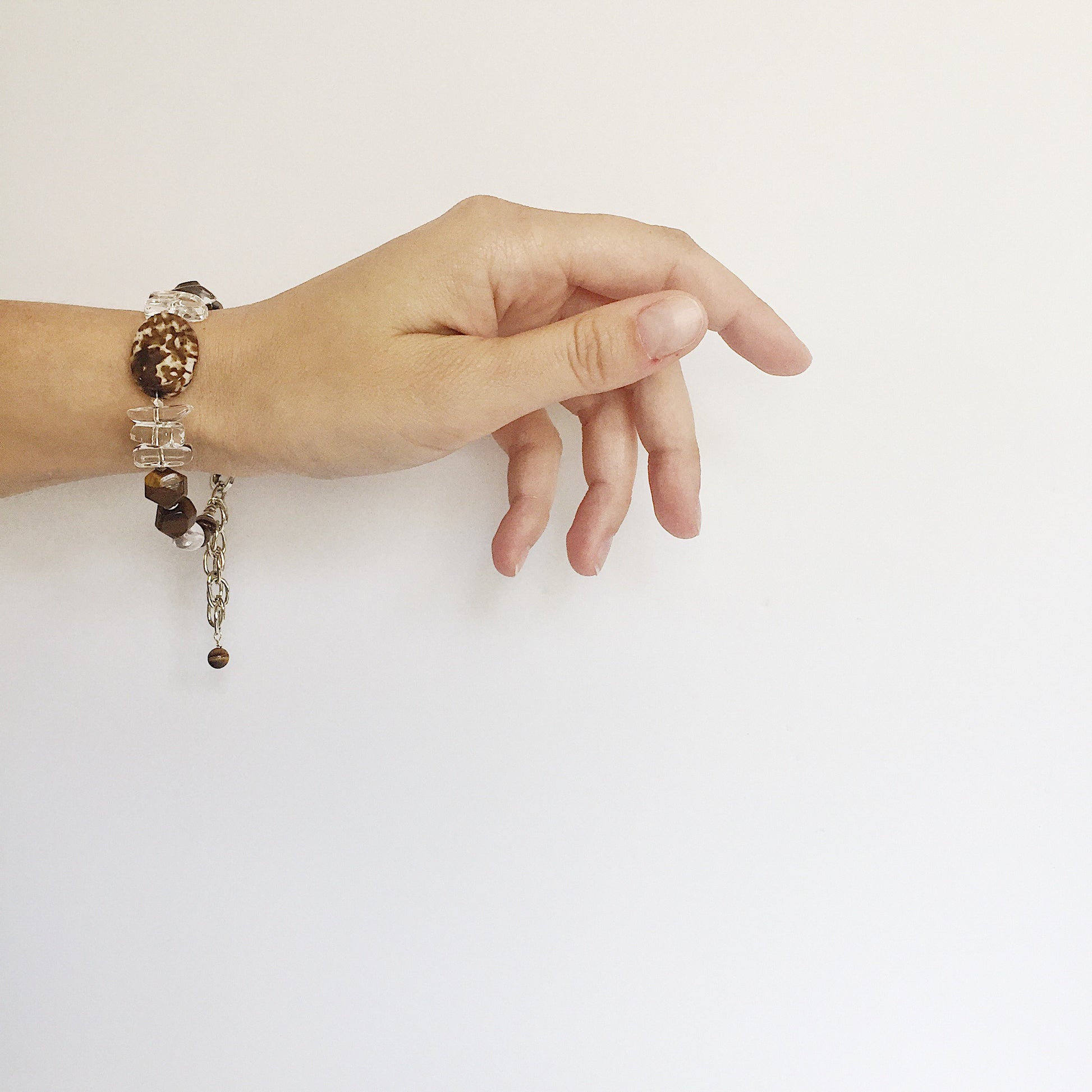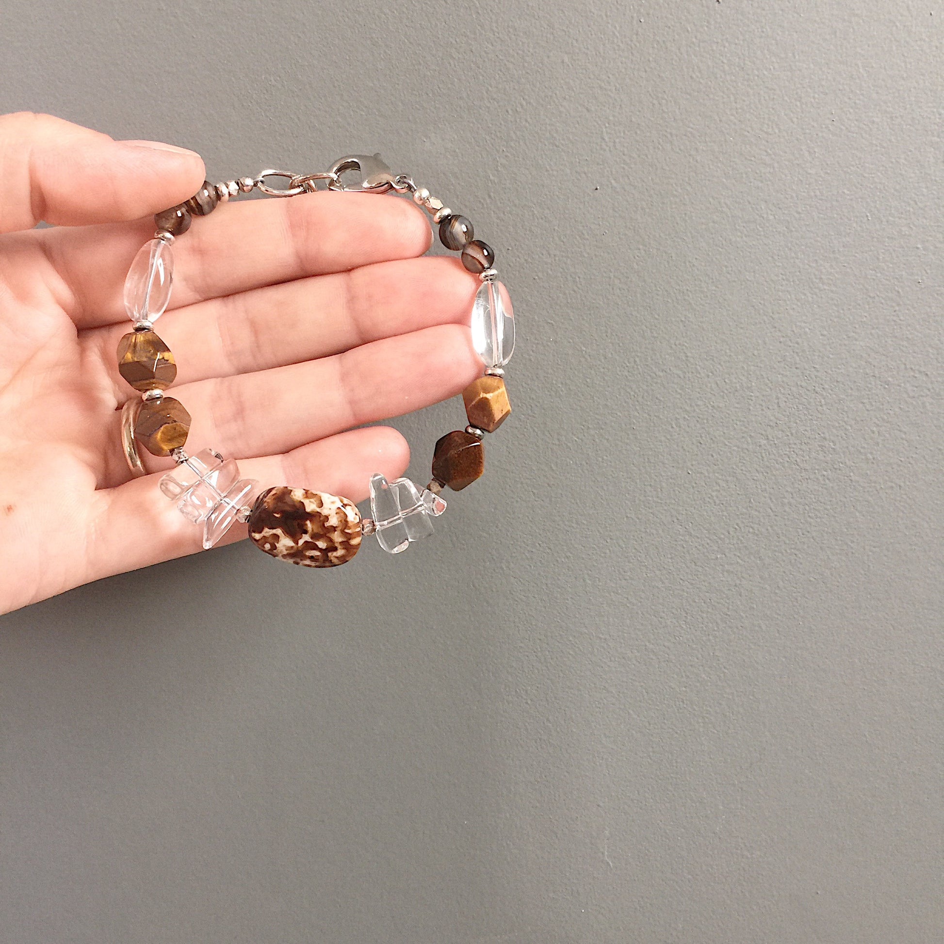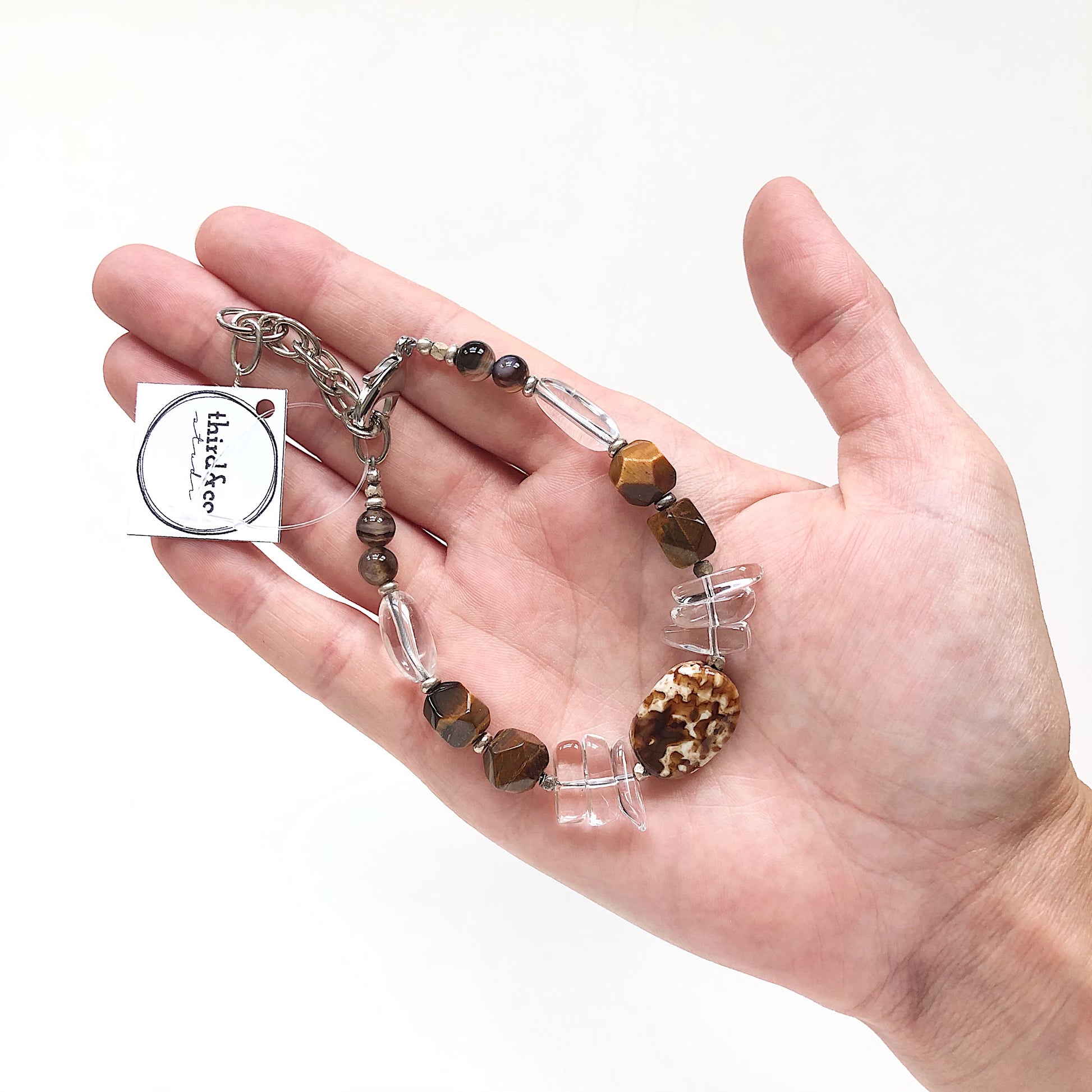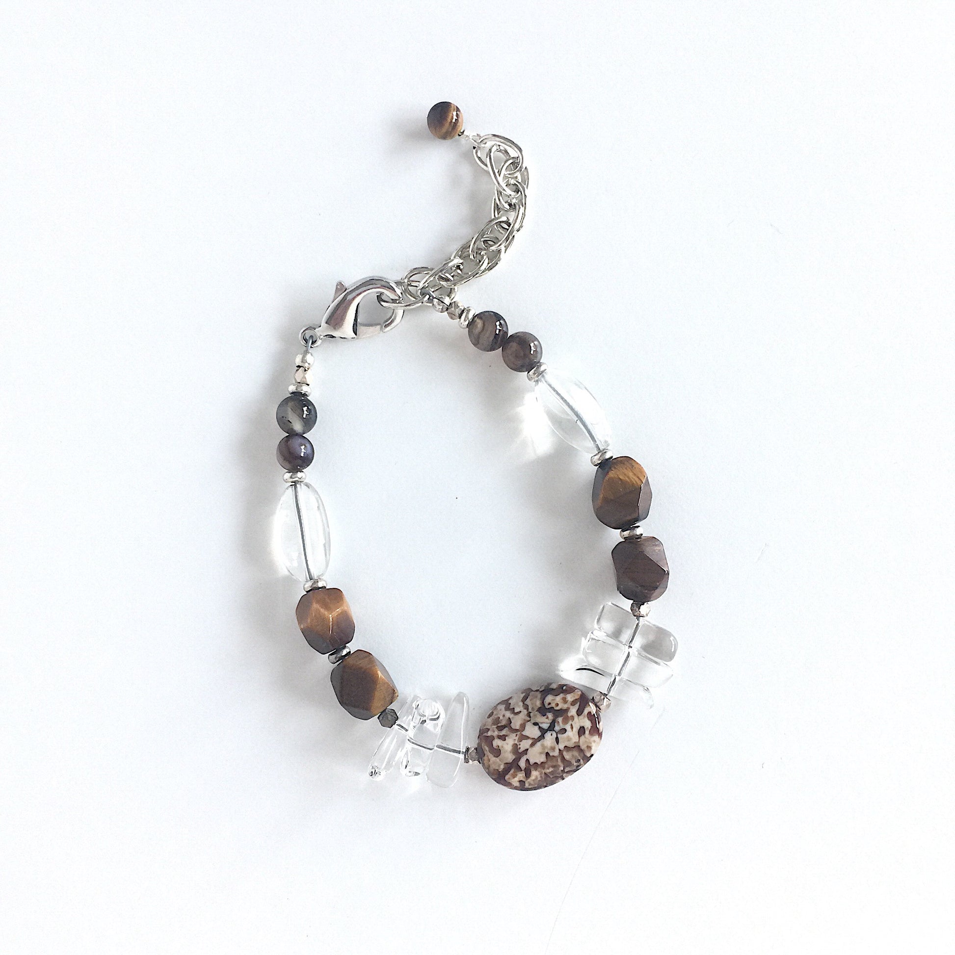 The Leonis Bracelet: Dragon's Agate, Tigers Eye, Quartz and tiny Agate rounds met with silver plated chain create this versatile neutral-toned bracelet. Coordinates with the Leonis Necklace.