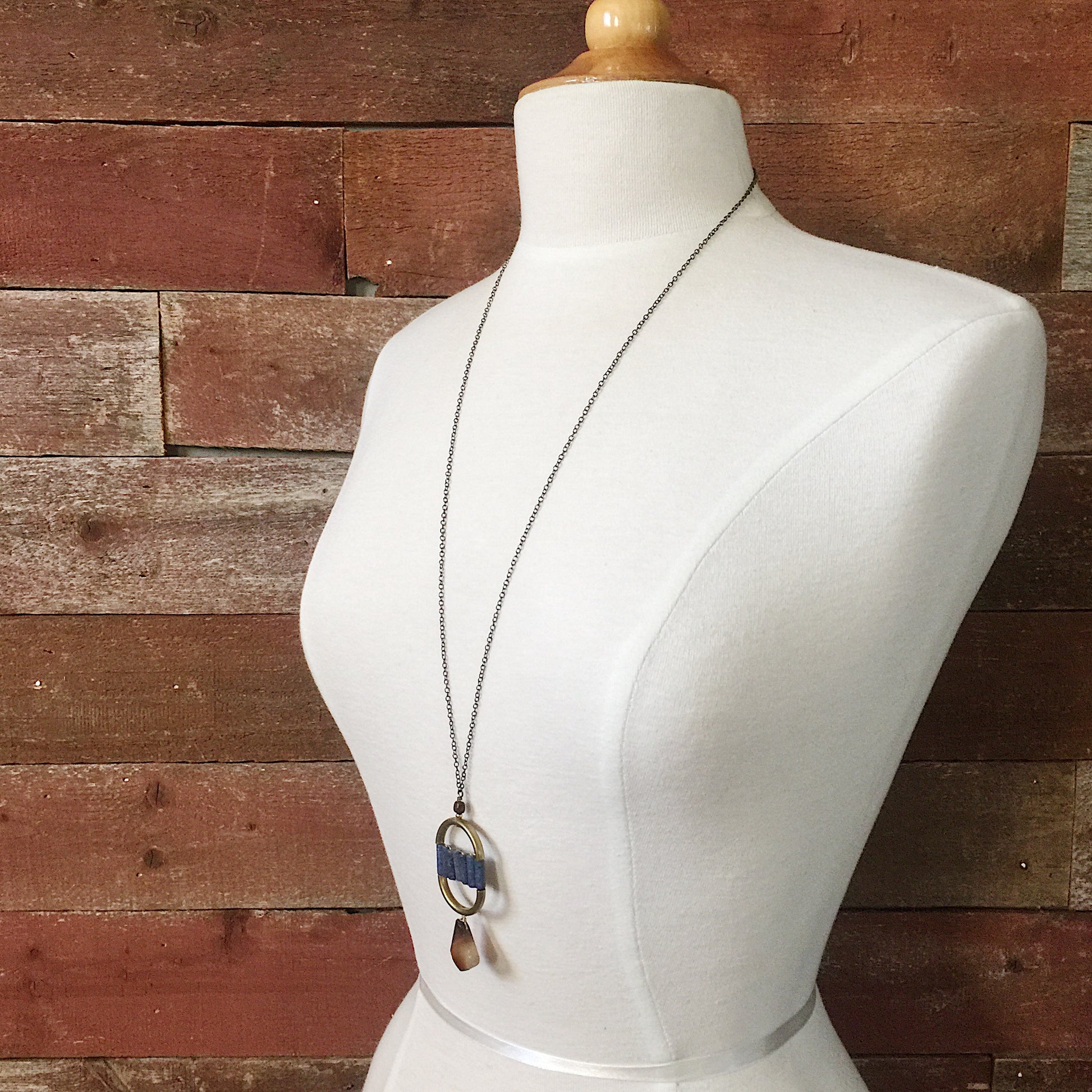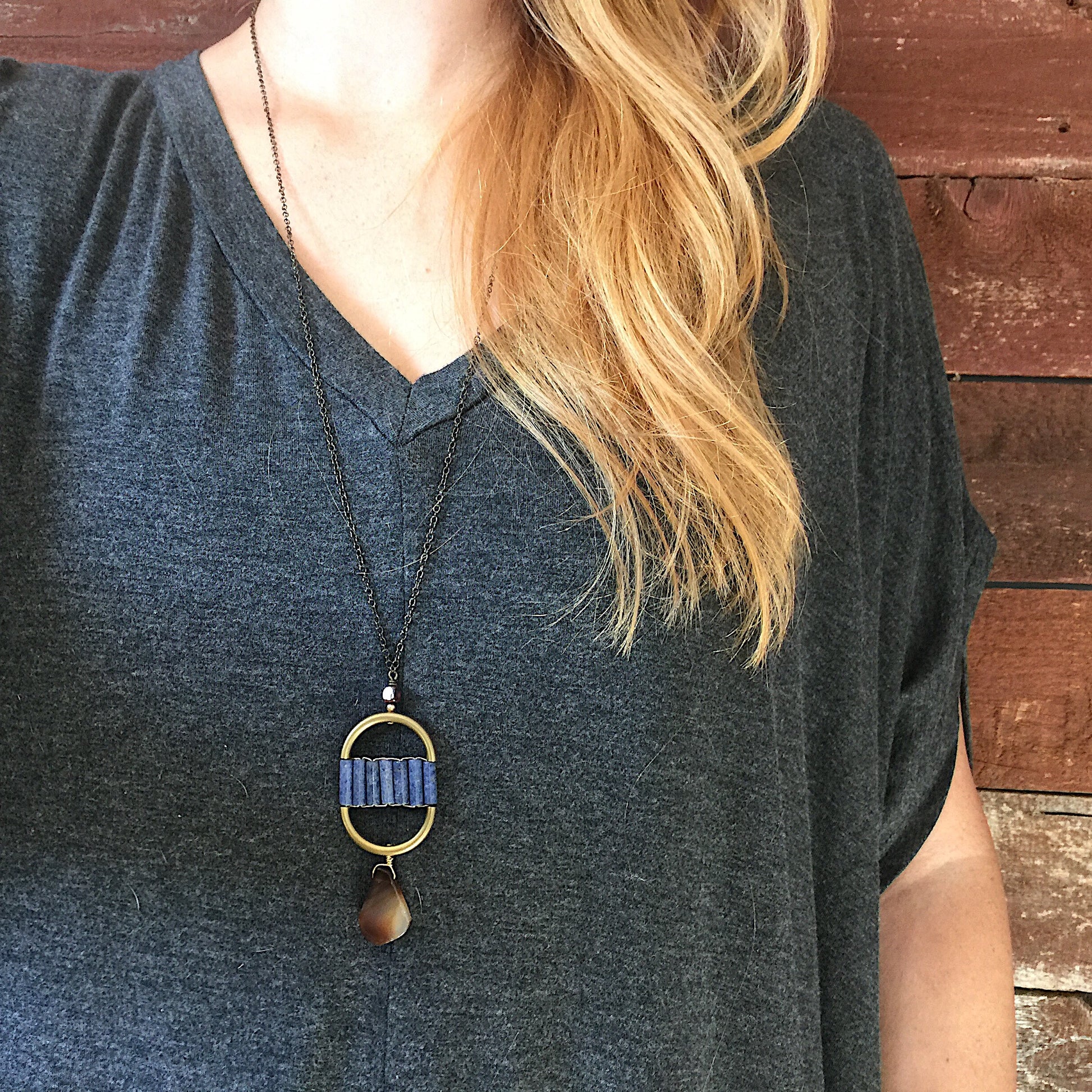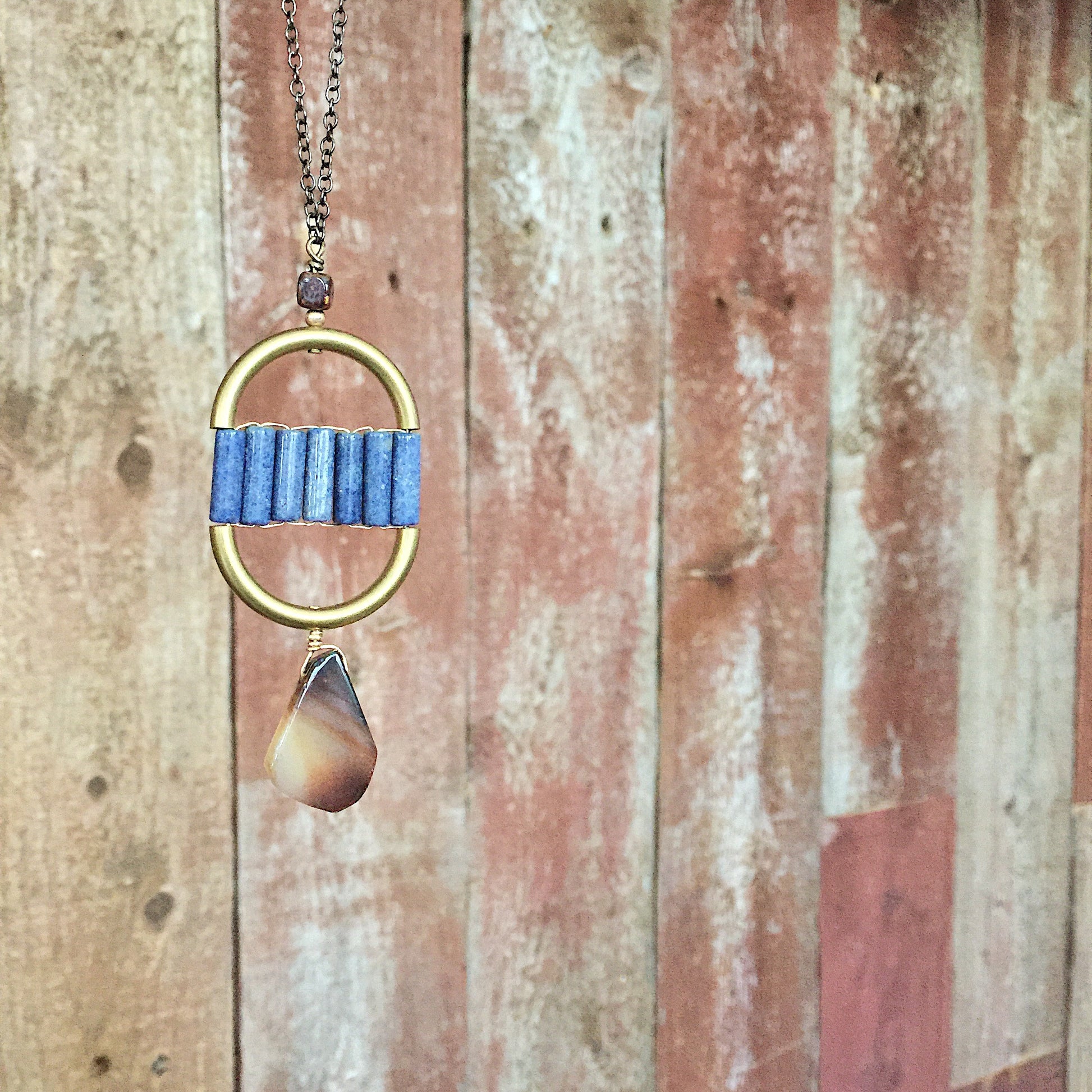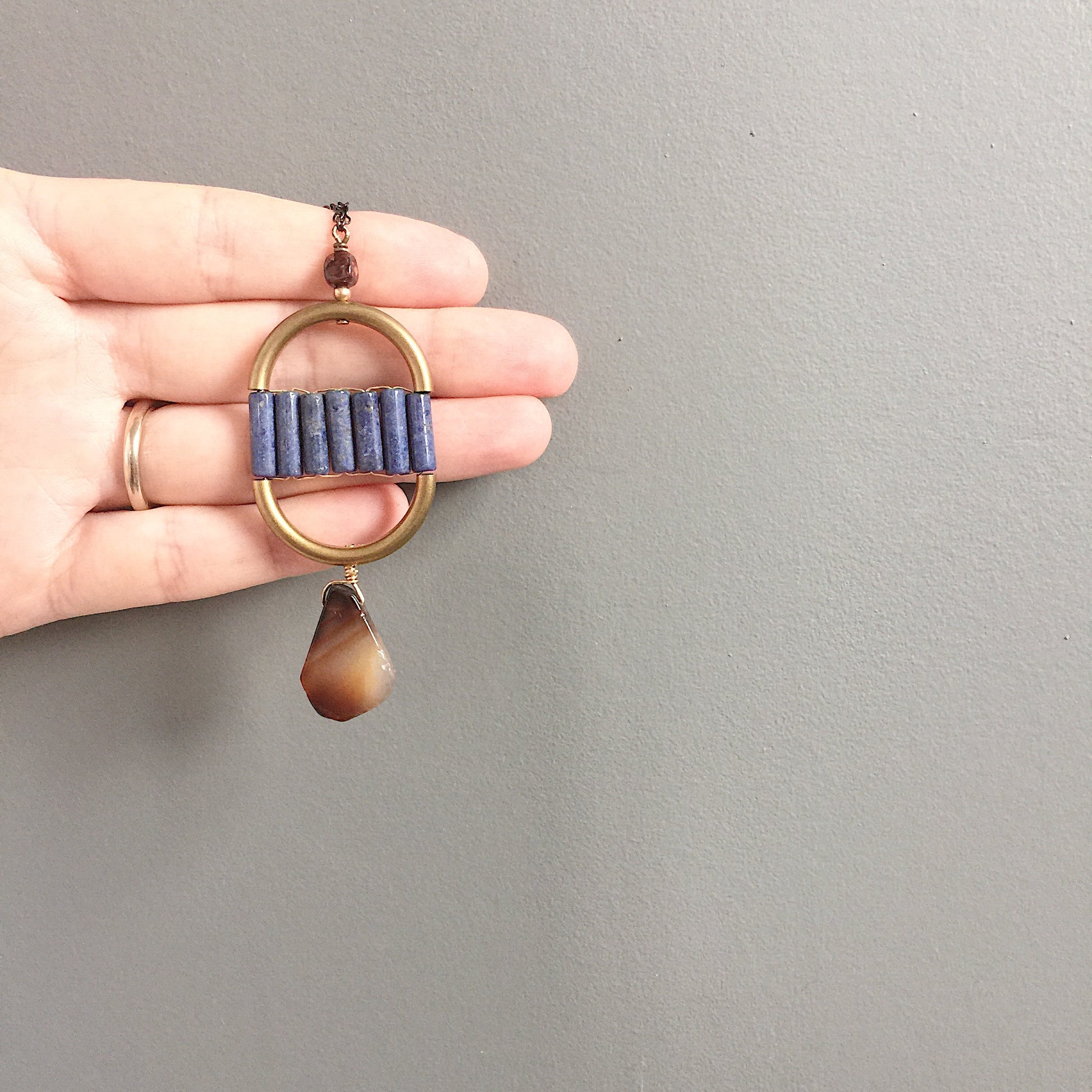 The Lyra Necklace: Dumortierite, Pietersite and Agate met with two vintage brass half circles and gunmetal chain create this geometric and versatile necklace.
