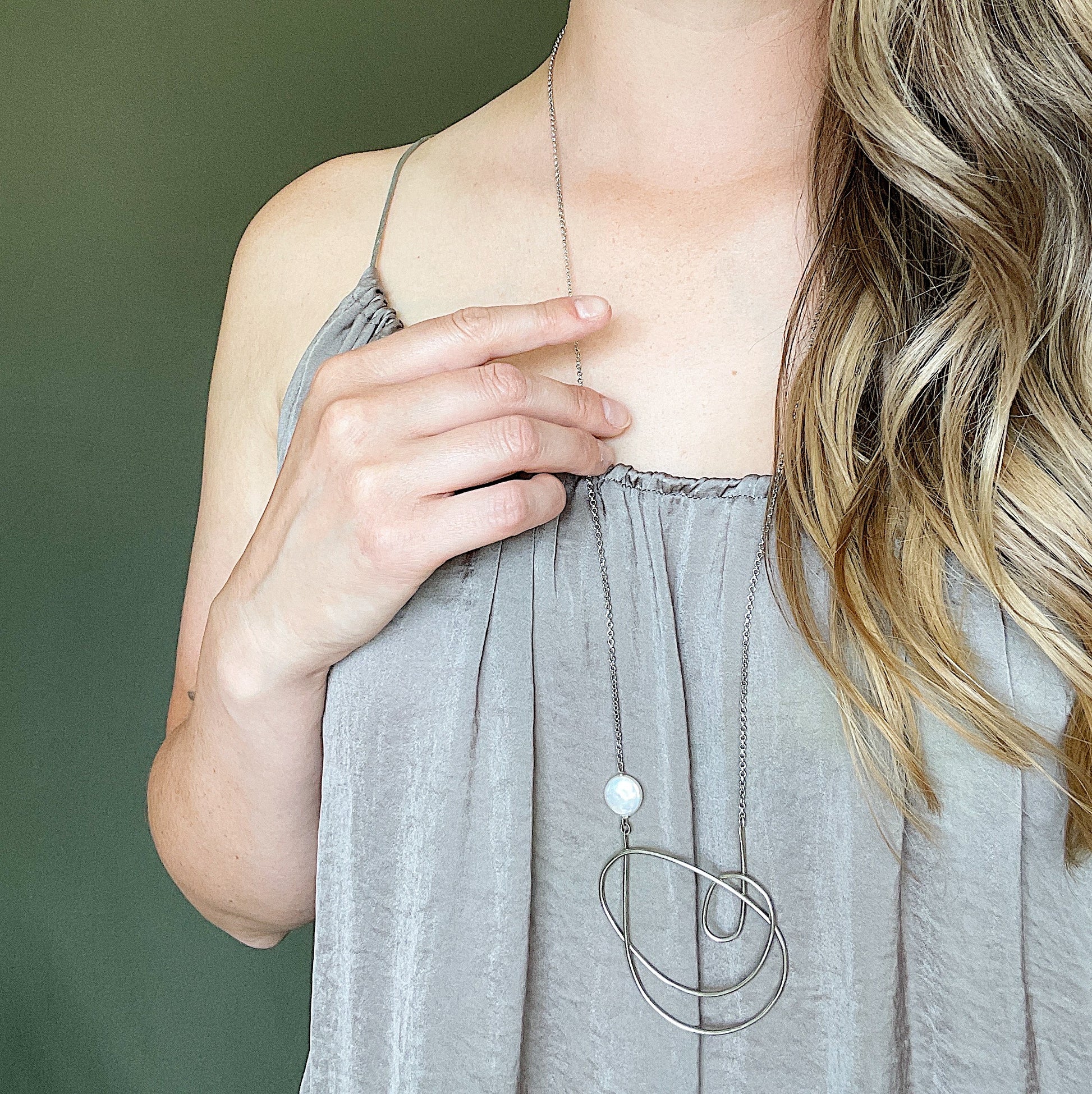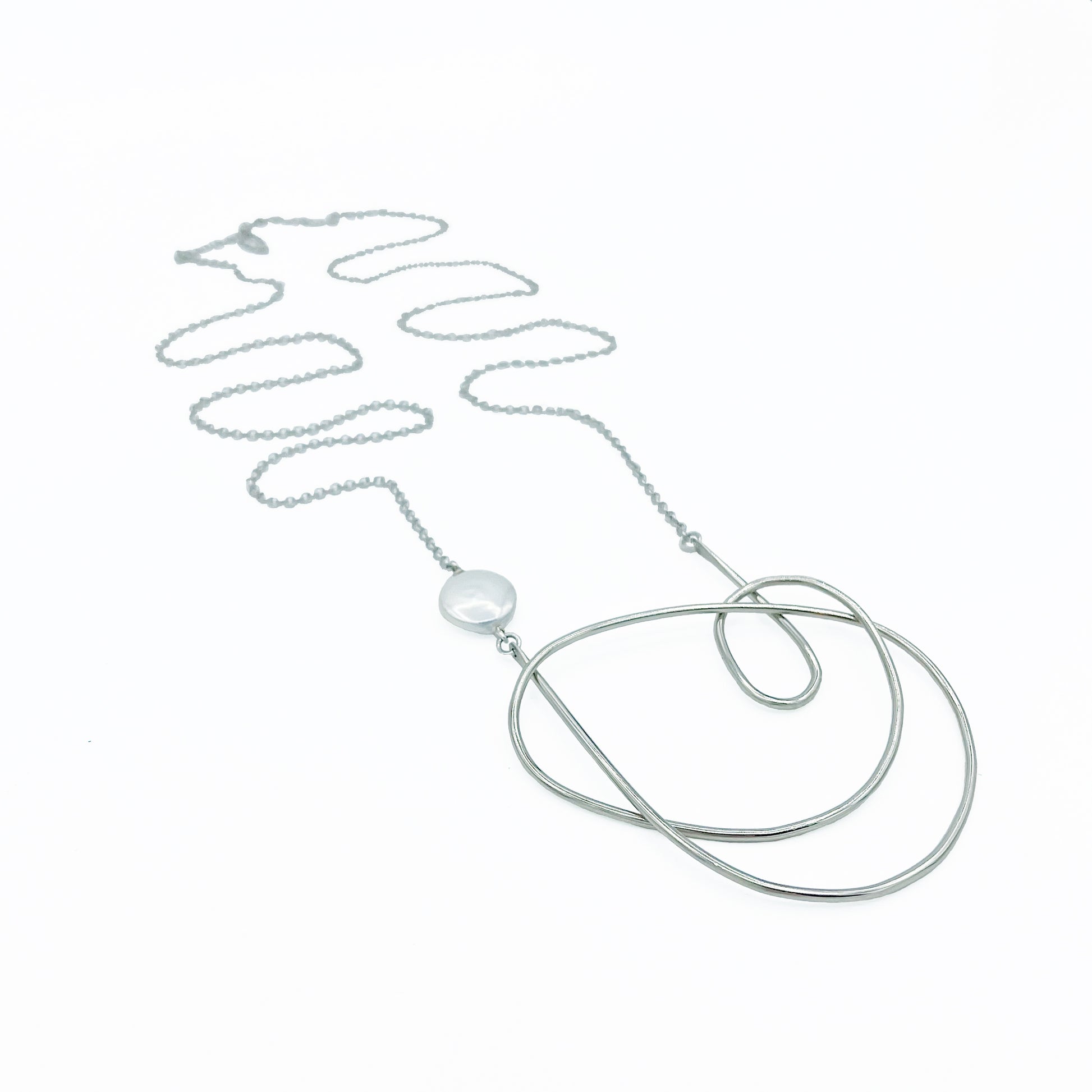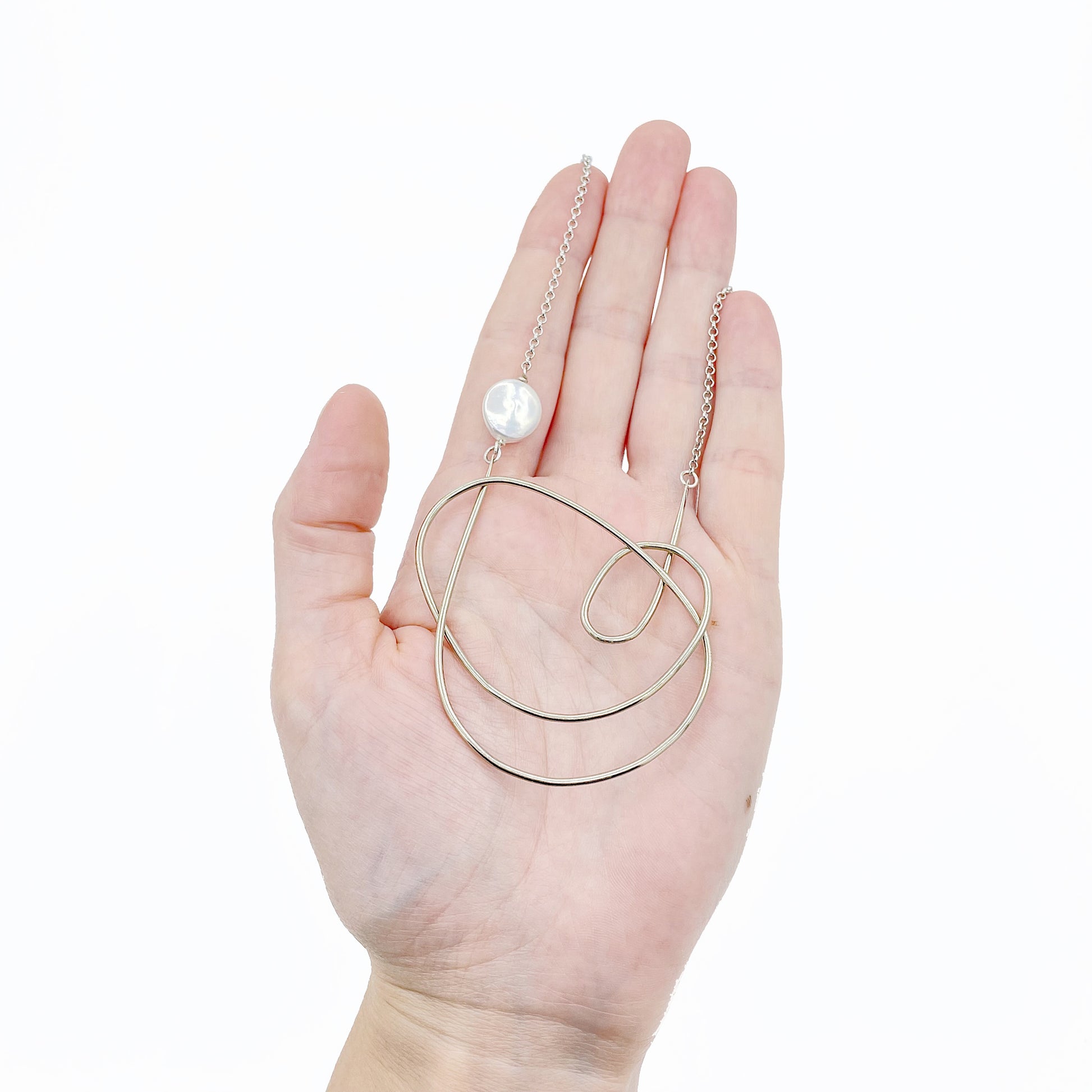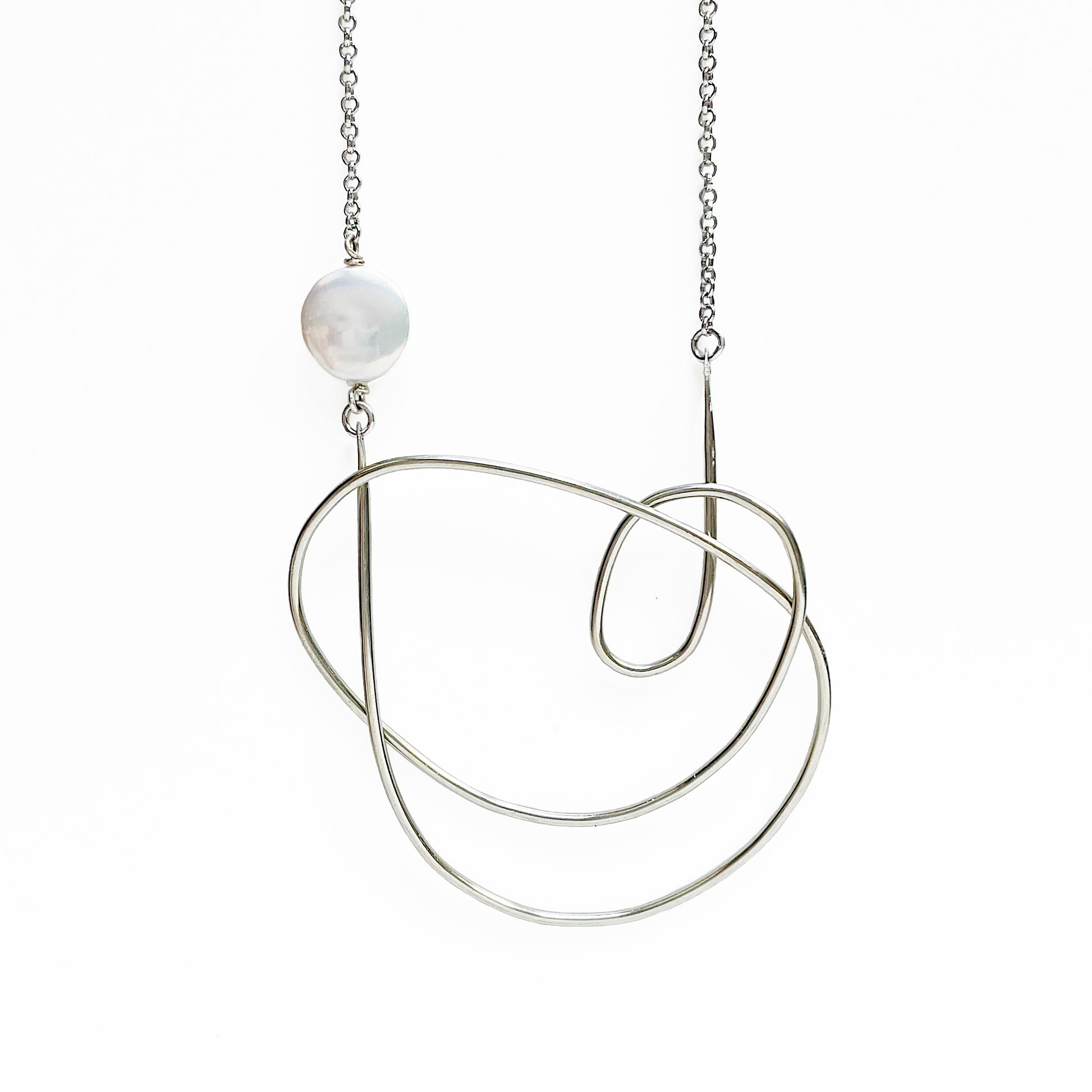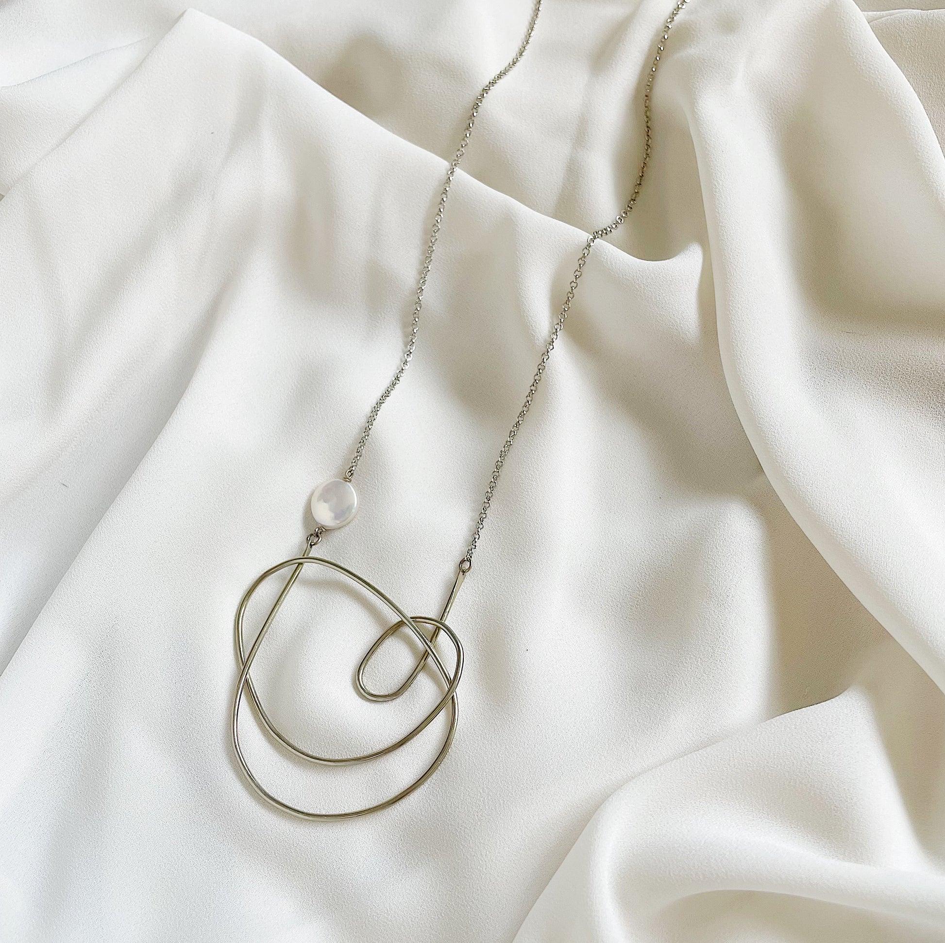The Maeva Necklace: a single fresh water coin pearl met with a German silver organic freeform shape and sterling silver plated chain, create this lightweight, neutral and minimalist piece.