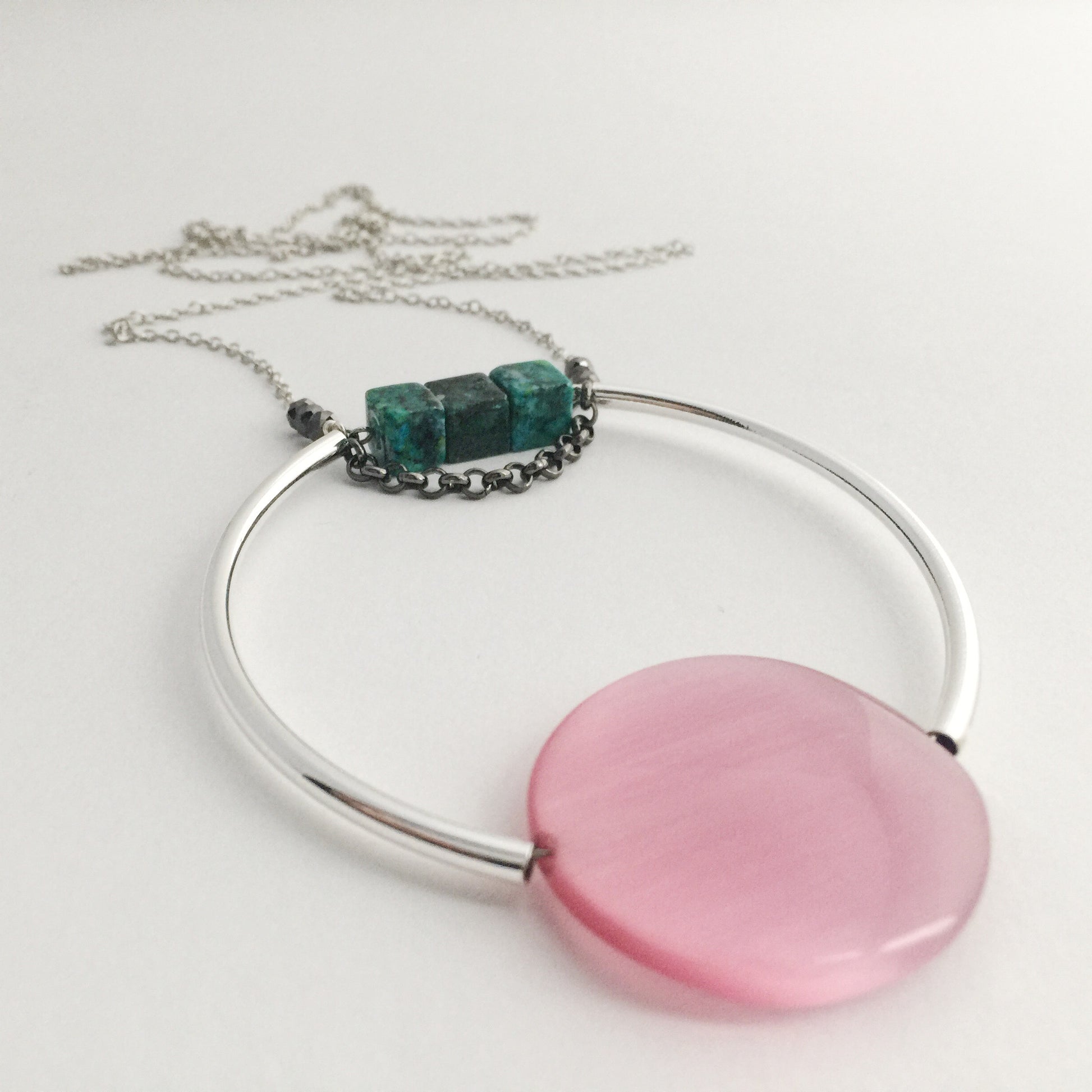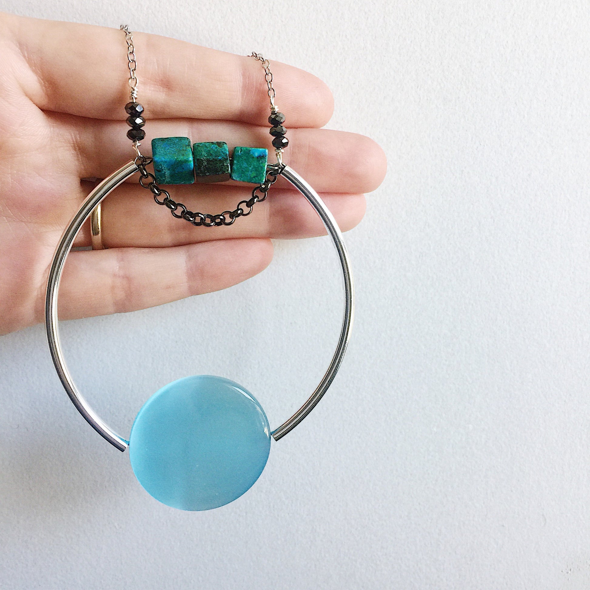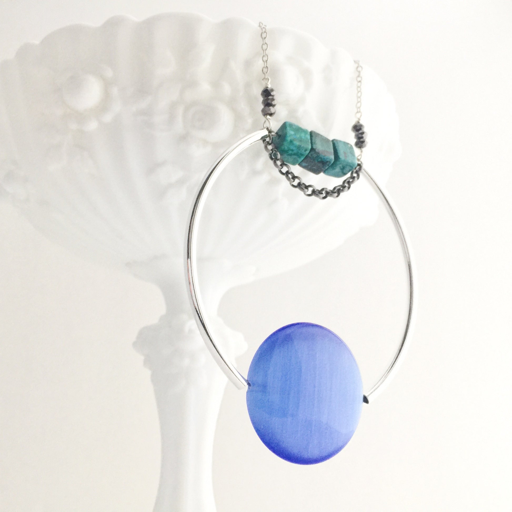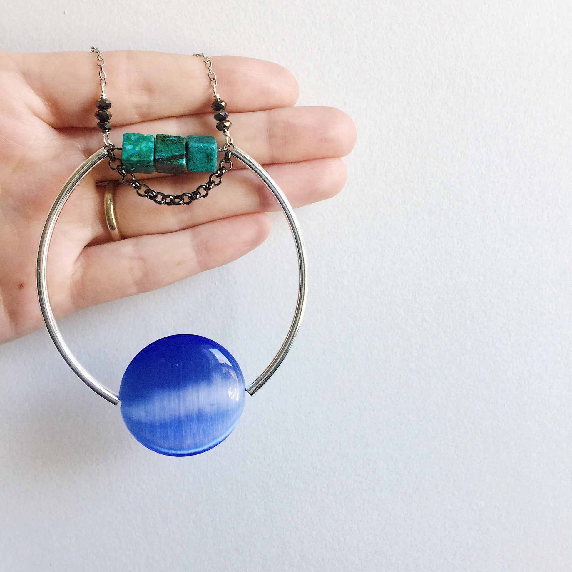 Geometry and negative space with pops of color are the signature to the Meridian Necklace. Cats Eye and Chrysocolla paired with two curved silver-plated brass tubes and vintage gunmetal chain, suspended with silver-plated iron chain and faceted gunmetal-toned crystal rondelles make a bold statement. There are four different color options available in the Cats Eye; deep blue, pink, yellow and light blue.