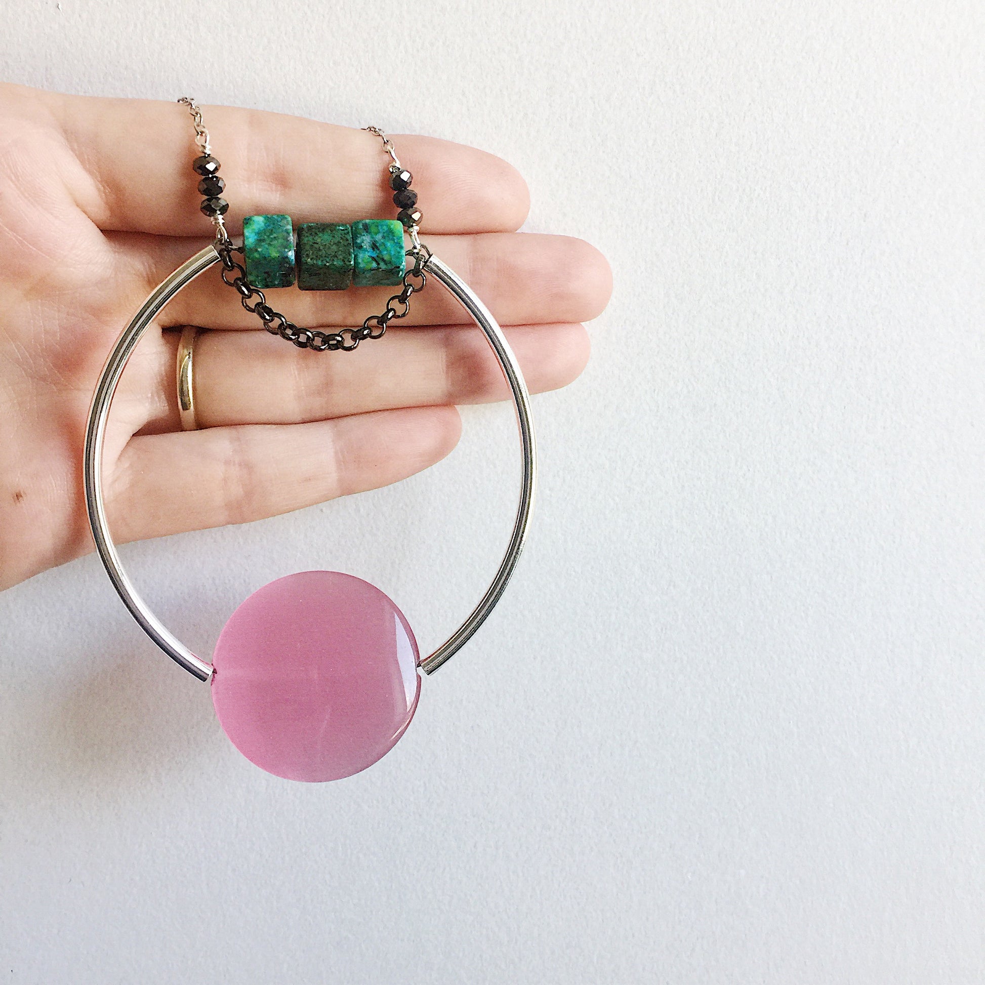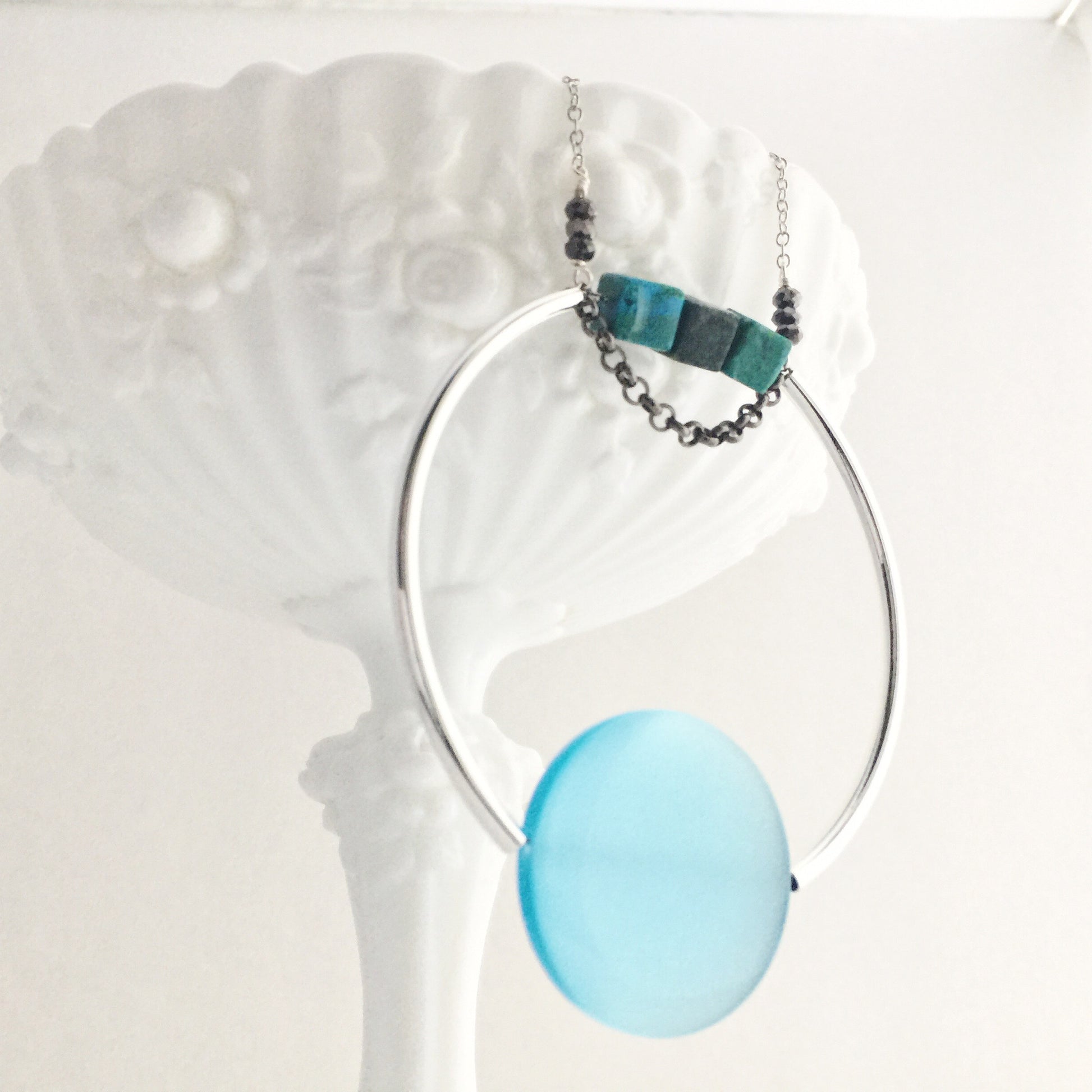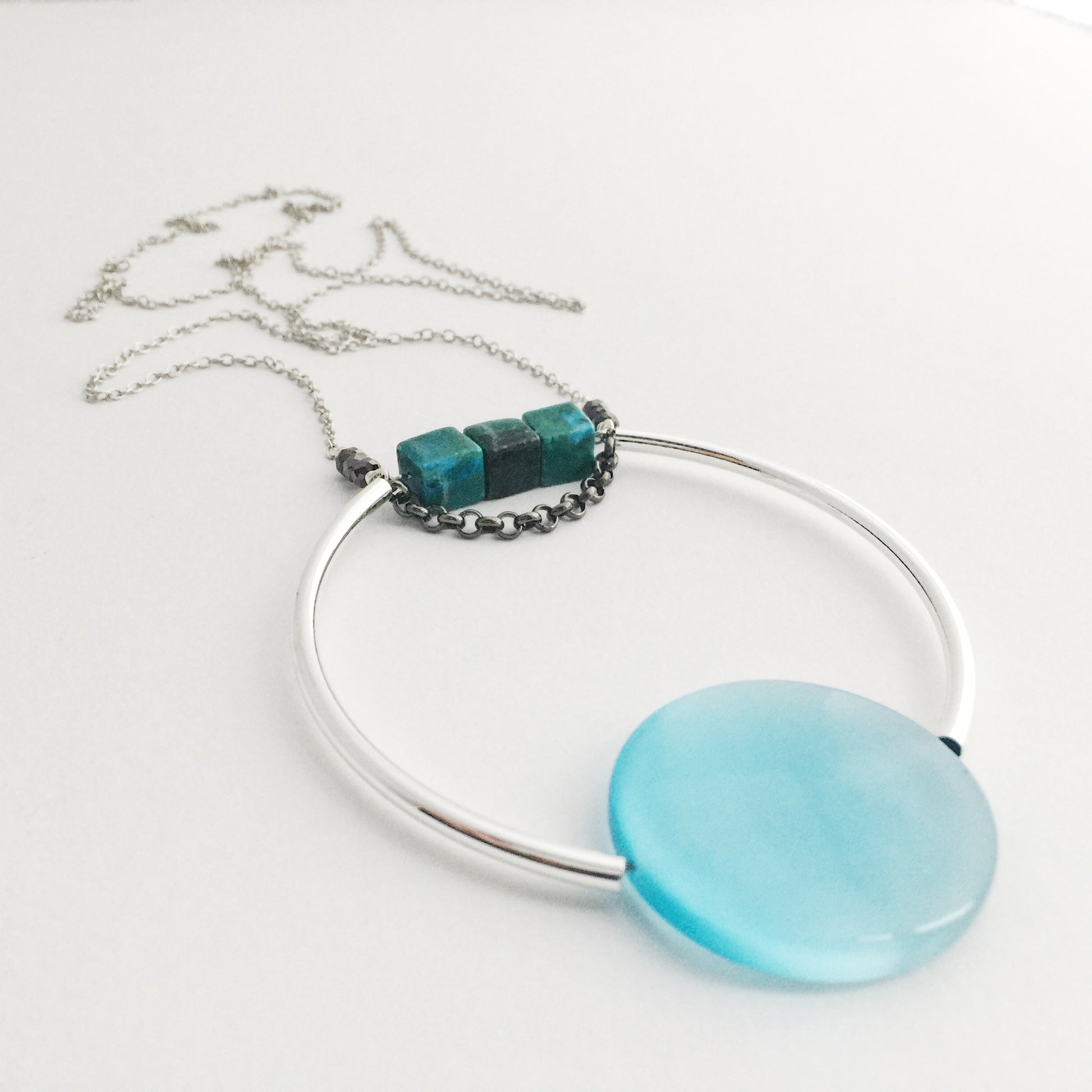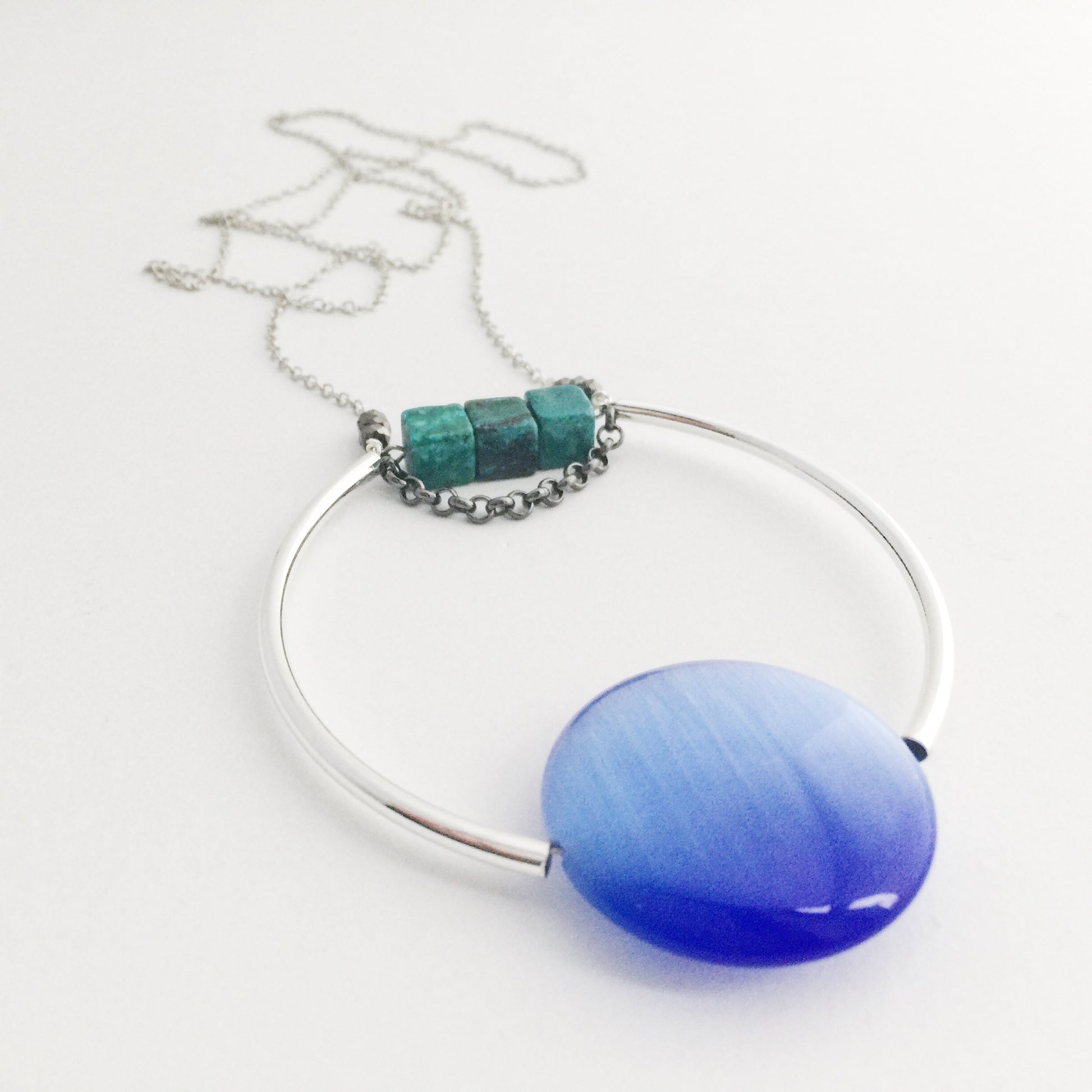 Geometry and negative space with pops of color are the signature to the Meridian Necklace. Cats Eye and Chrysocolla paired with two curved silver-plated brass tubes and vintage gunmetal chain, suspended with silver-plated iron chain and faceted gunmetal-toned crystal rondelles make a bold statement. There are four different color options available in the Cats Eye; deep blue, pink, yellow and light blue.