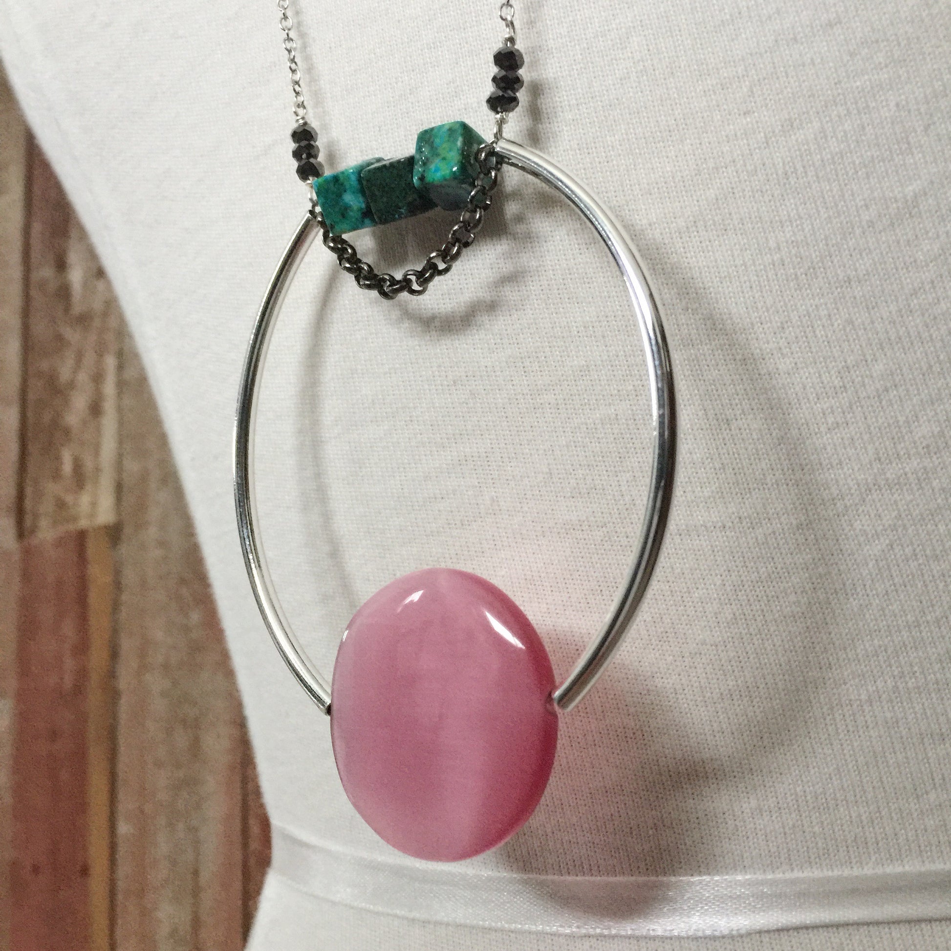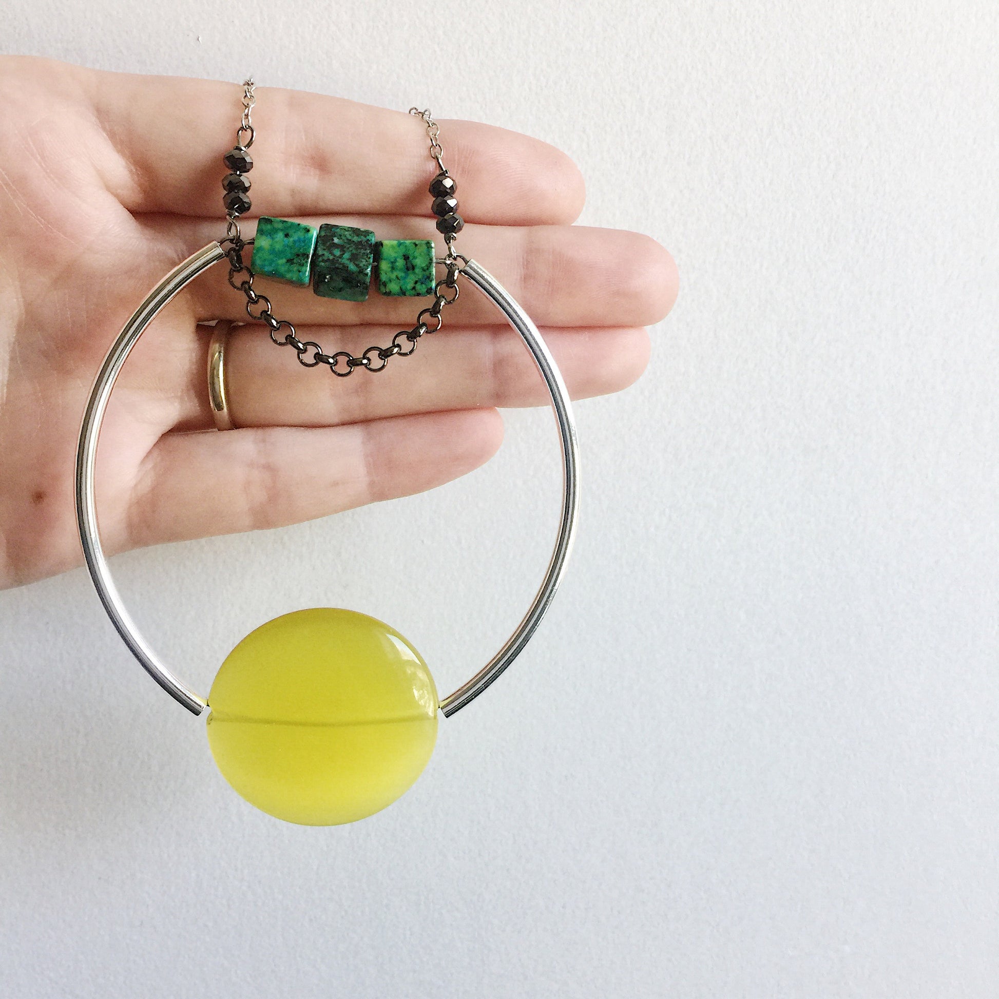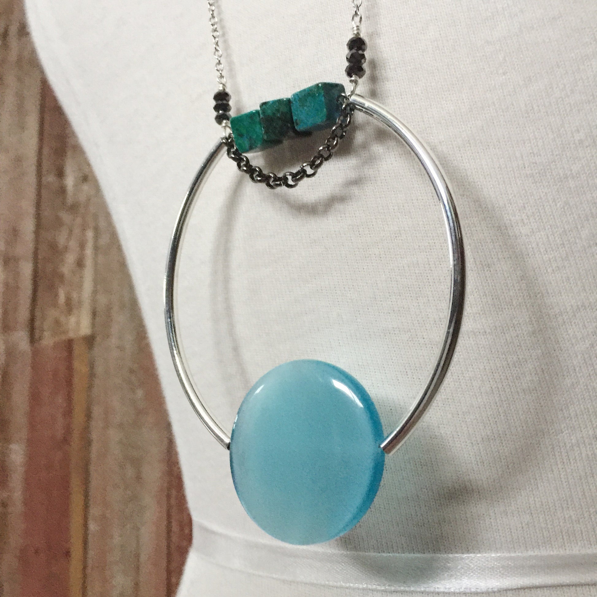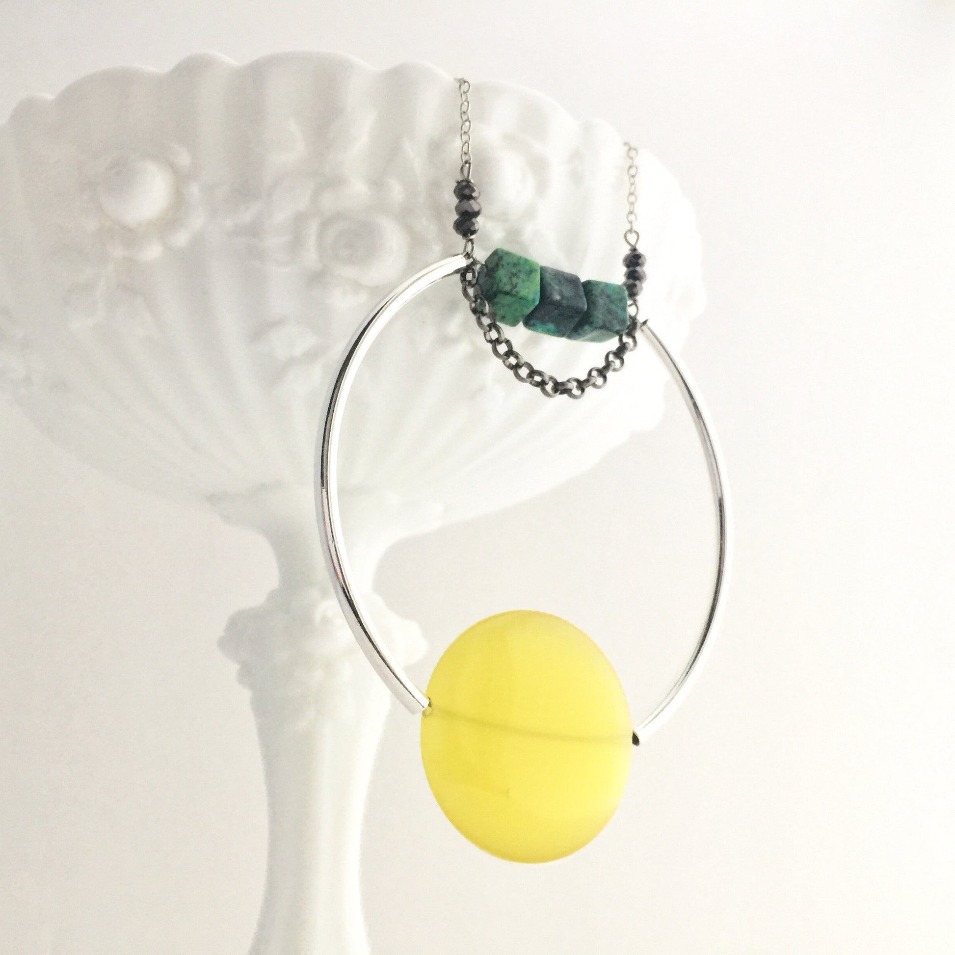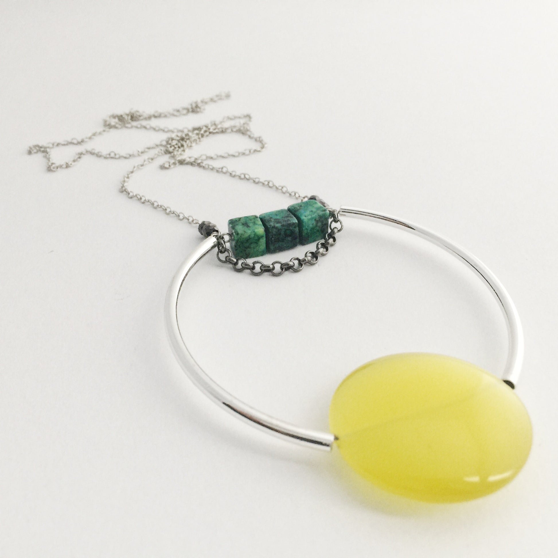 Geometry and negative space with pops of color are the signature to the Meridian Necklace. Cats Eye and Chrysocolla paired with two curved silver-plated brass tubes and vintage gunmetal chain, suspended with silver-plated iron chain and faceted gunmetal-toned crystal rondelles make a bold statement. There are four different color options available in the Cats Eye; deep blue, pink, yellow and light blue.