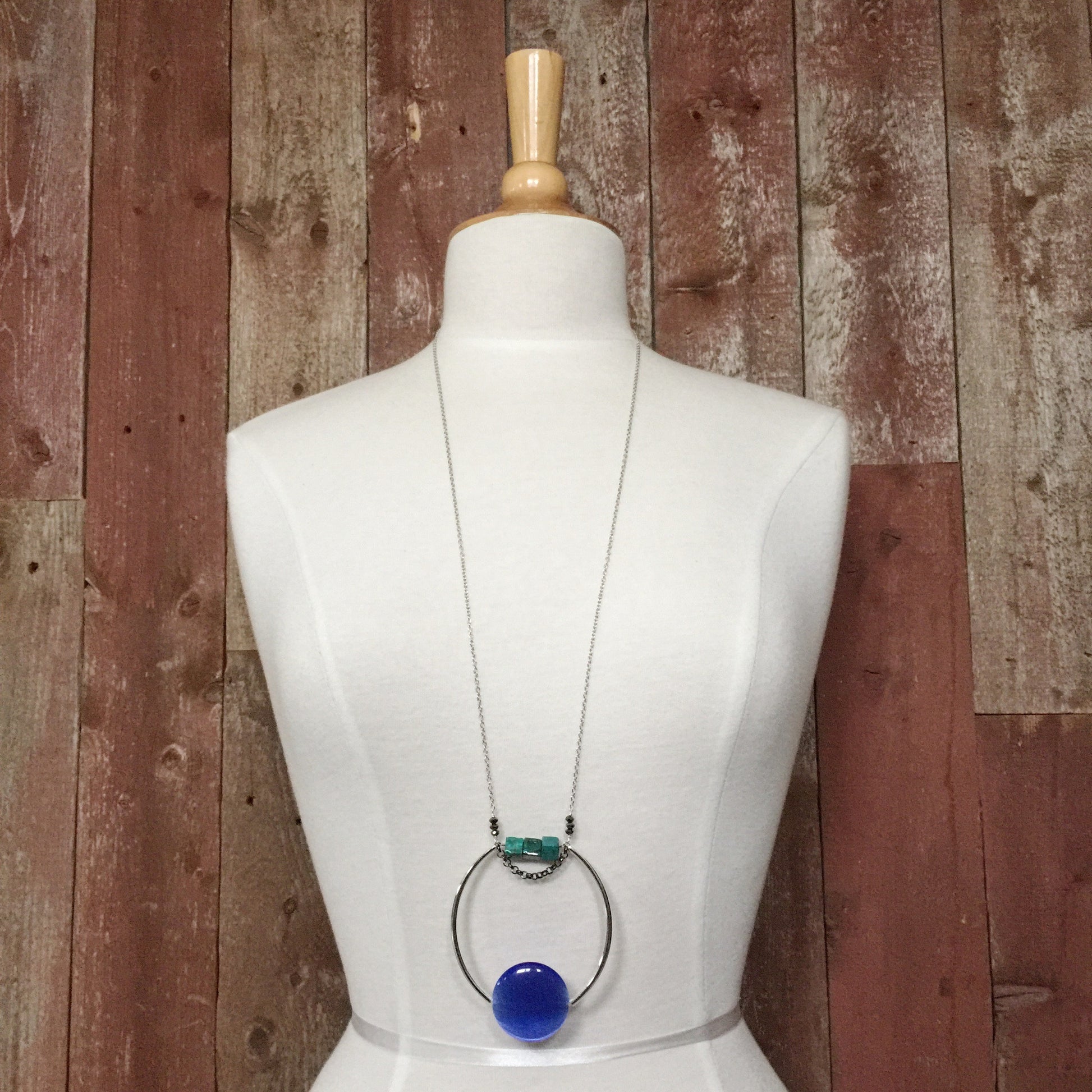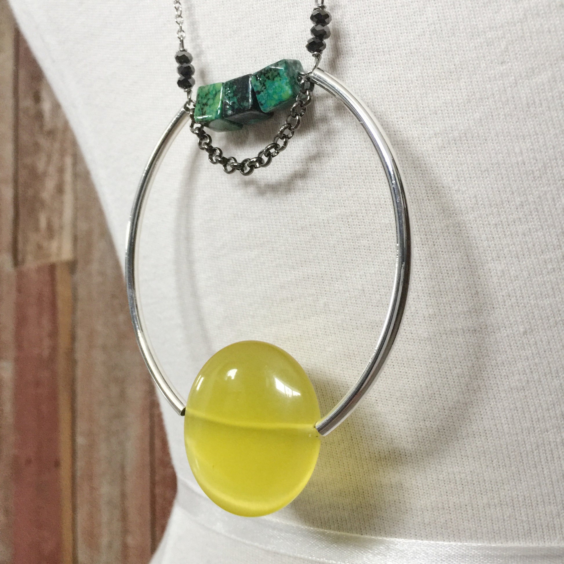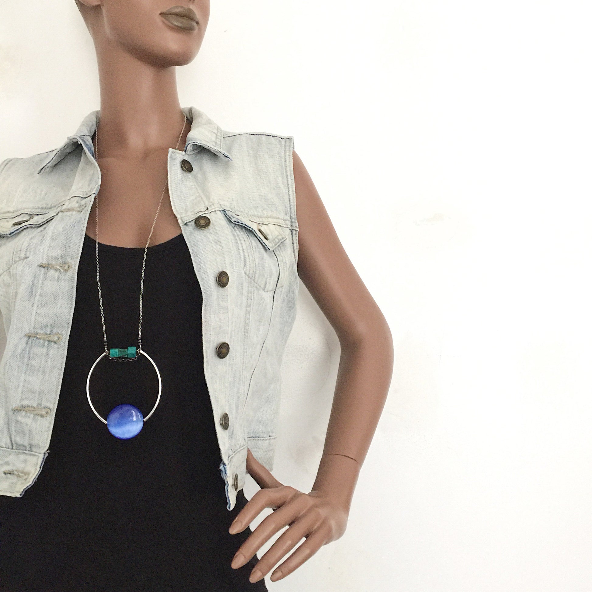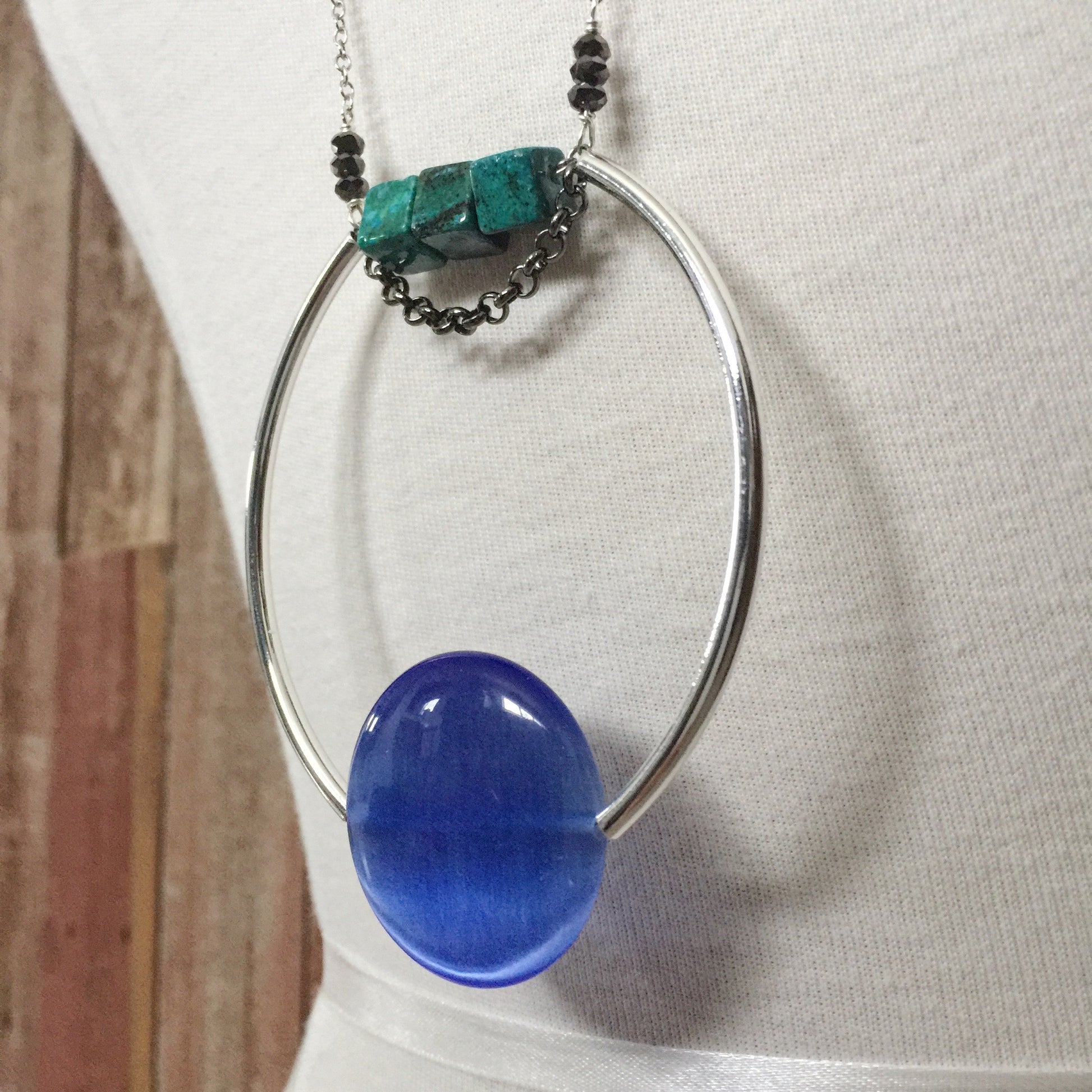 Geometry and negative space with pops of color are the signature to the Meridian Necklace. Cats Eye and Chrysocolla paired with two curved silver-plated brass tubes and vintage gunmetal chain, suspended with silver-plated iron chain and faceted gunmetal-toned crystal rondelles make a bold statement. There are four different color options available in the Cats Eye; deep blue, pink, yellow and light blue.