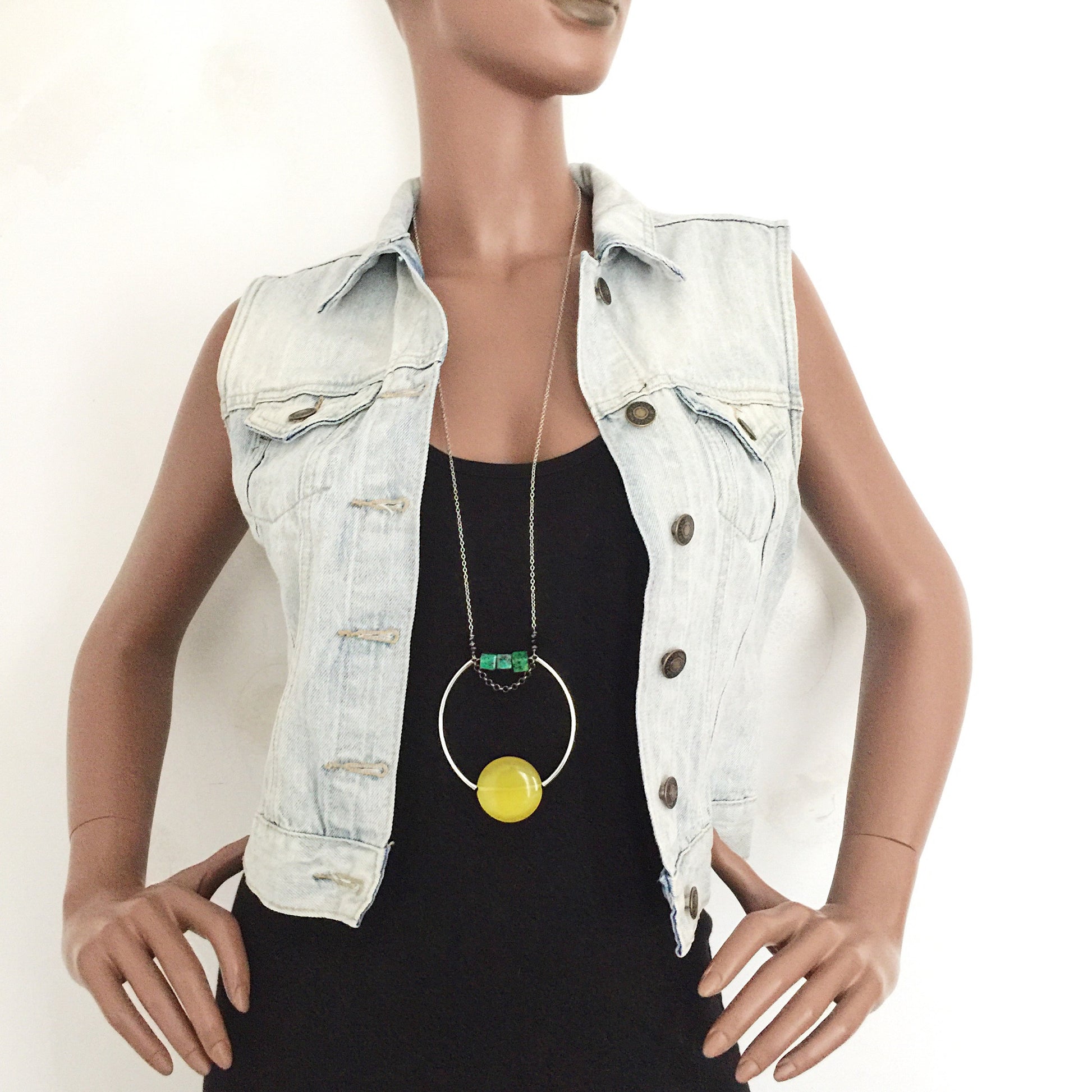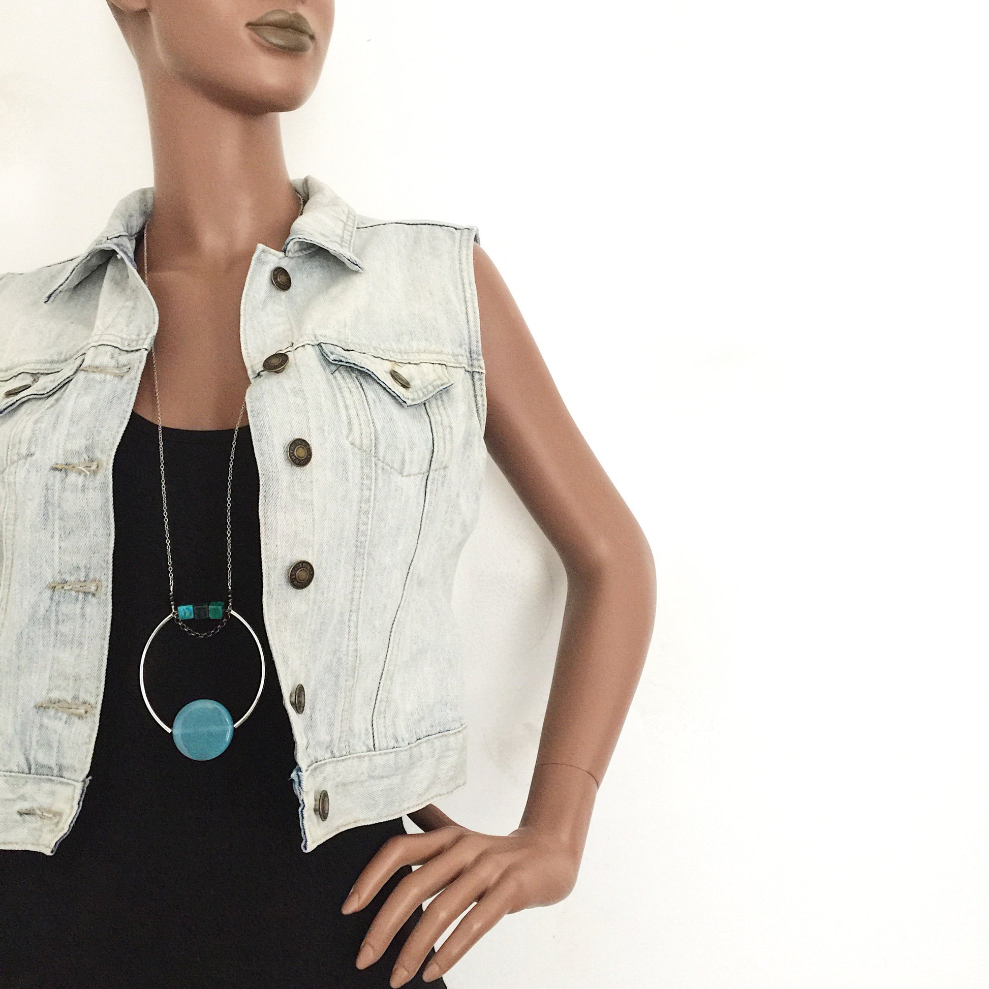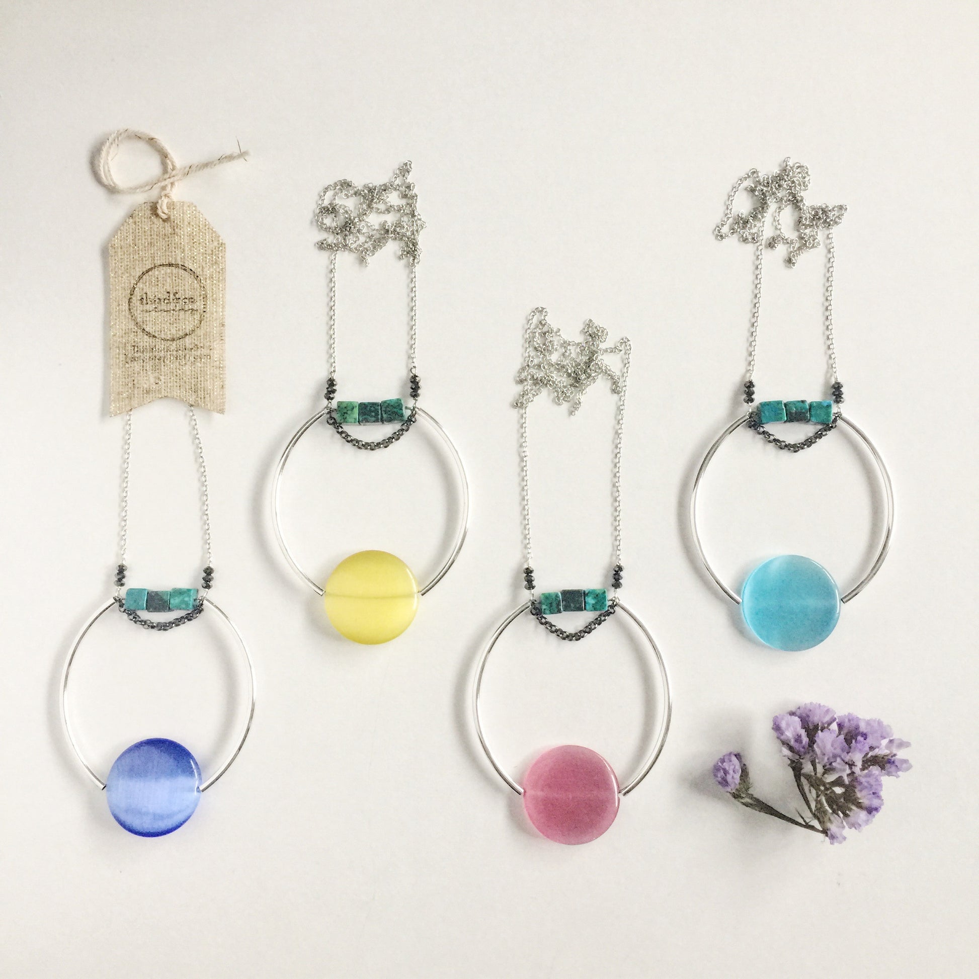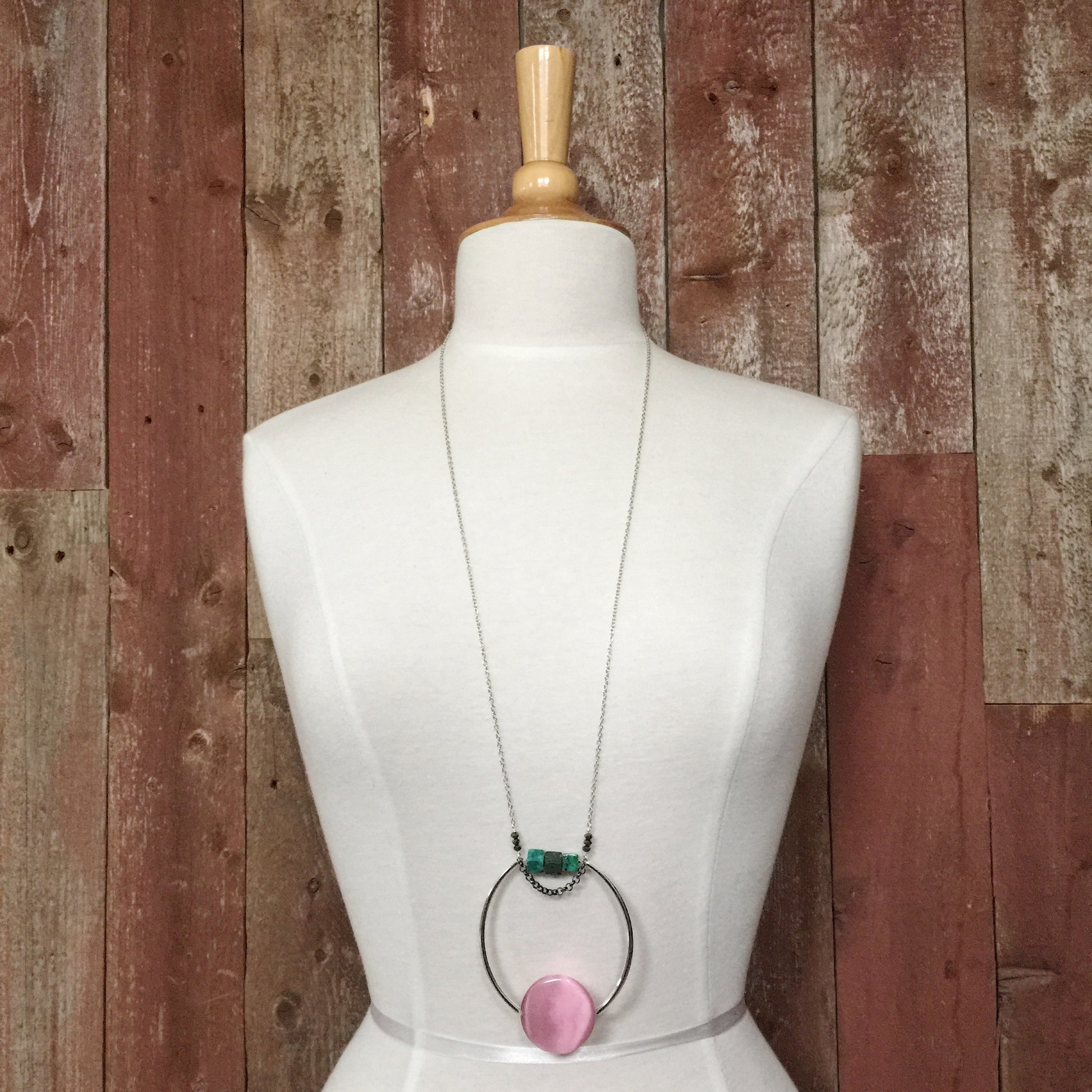 Geometry and negative space with pops of color are the signature to the Meridian Necklace. Cats Eye and Chrysocolla paired with two curved silver-plated brass tubes and vintage gunmetal chain, suspended with silver-plated iron chain and faceted gunmetal-toned crystal rondelles make a bold statement. There are four different color options available in the Cats Eye; deep blue, pink, yellow and light blue.