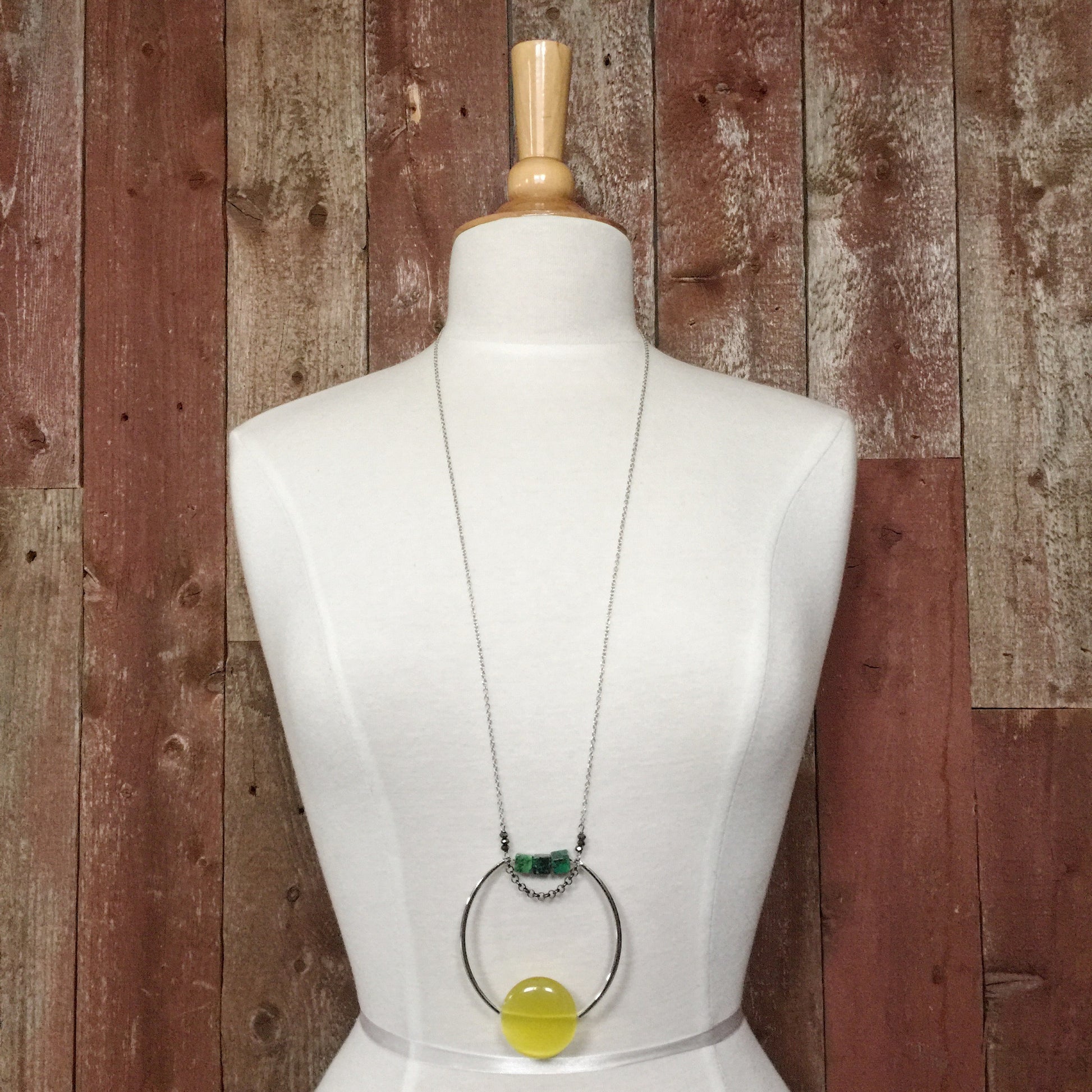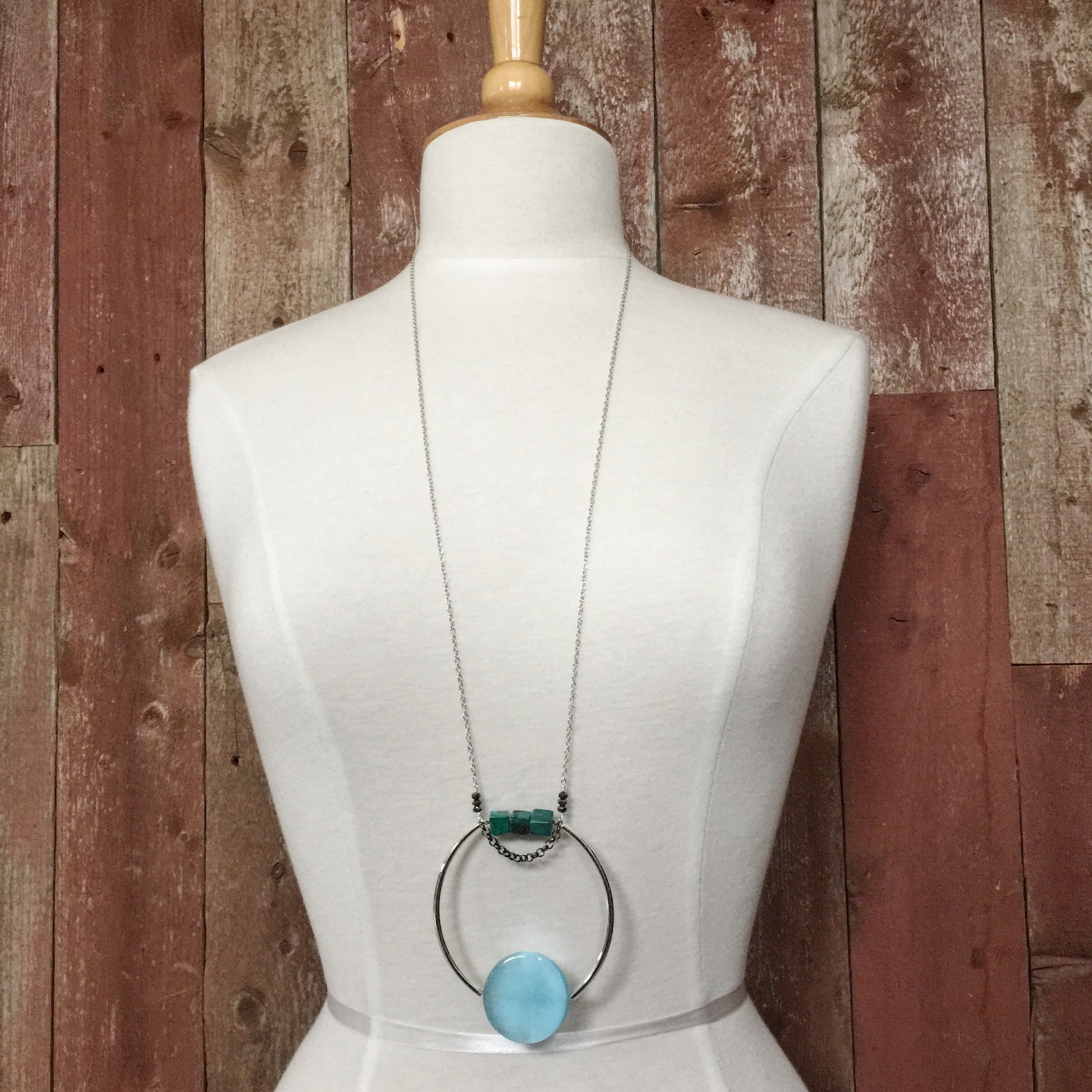 The Meridian Necklace is an overall length of 34.75 inch (88.265 cm) length with a 3.75 inch (9.525 cm) drop. Bear in mind that the stones used are all genuine semiprecious gemstones, and they will be heavier in weight than a necklace made of plastic or resin. That being said, this particular necklaces clocks in at a lightweight 0.9 ounces (25.514 grams).