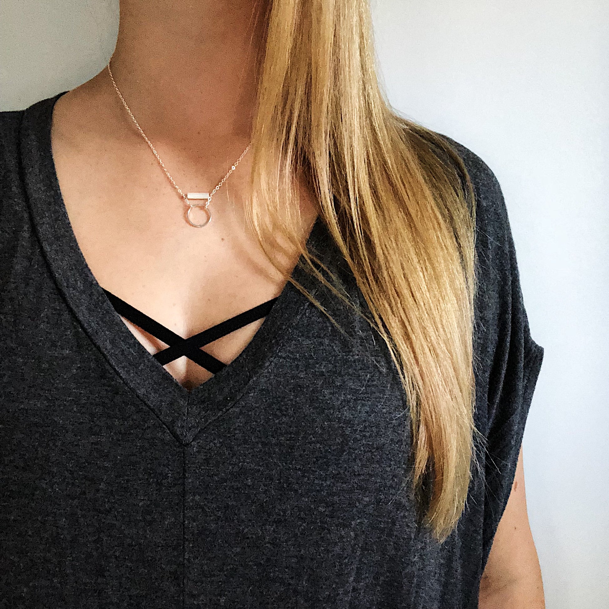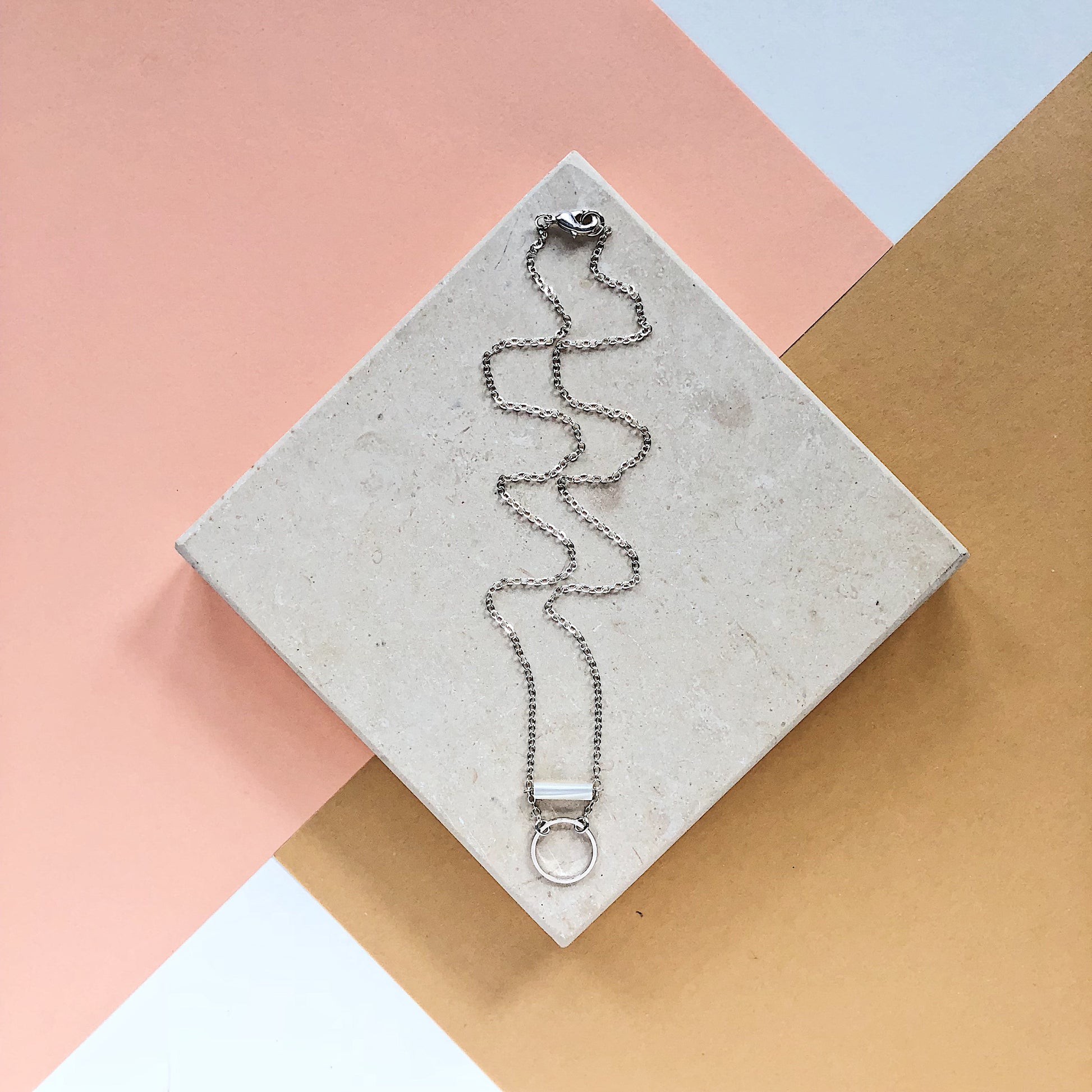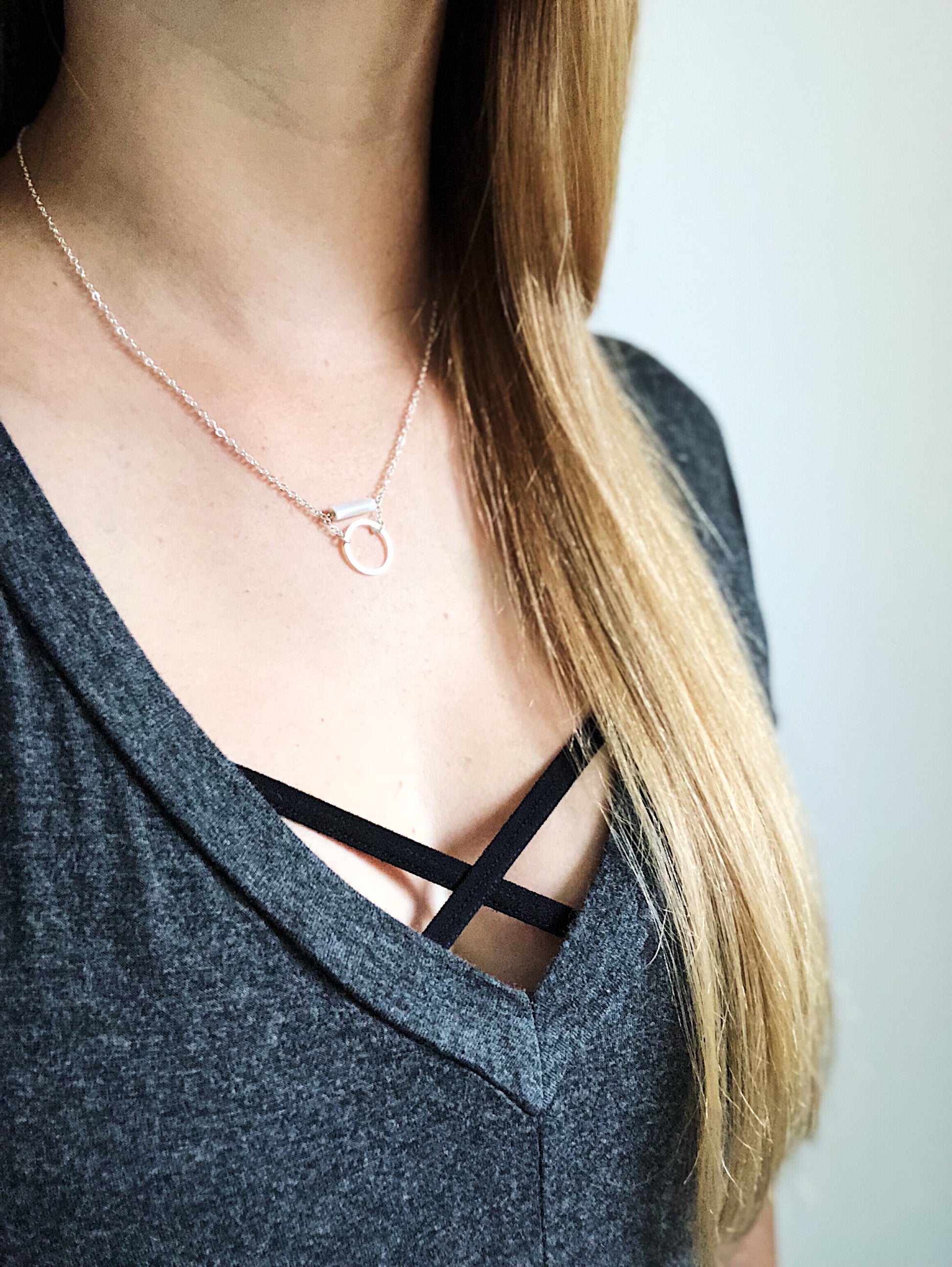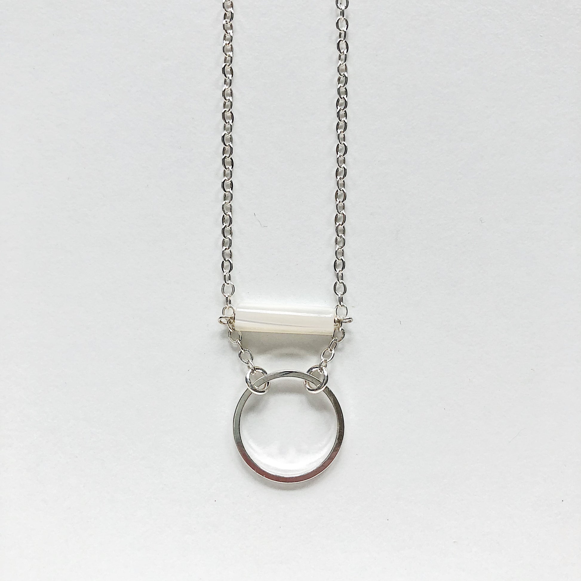 The Minimalist Mother of Pearl Necklace: a small barrel-shaped Mother of Pearl stone met with a silver plated open circle and Sterling Silver chain create this simple and versatile necklace that can be worn easily throughout the year.