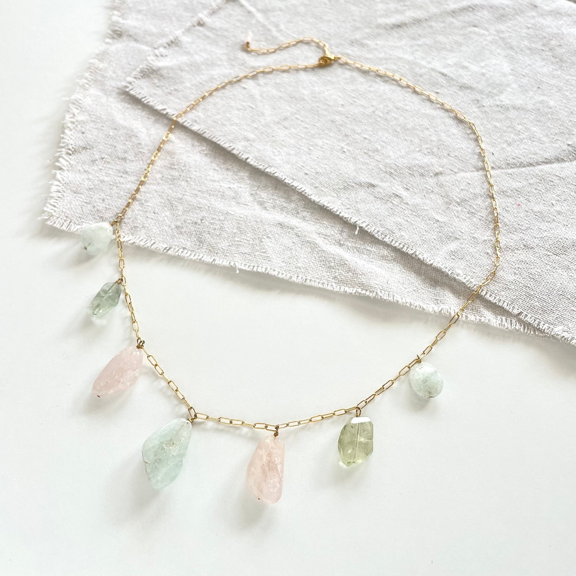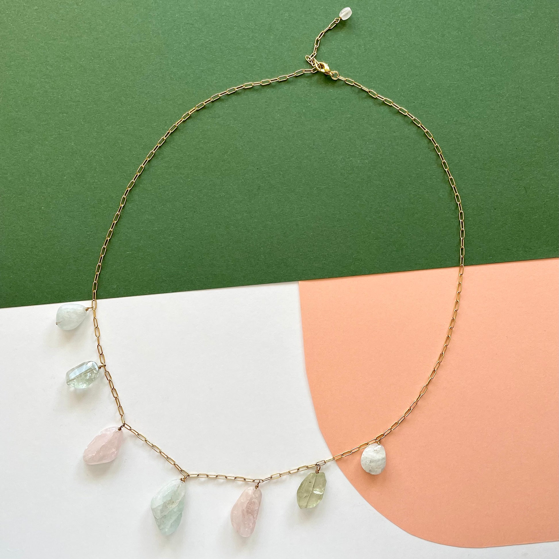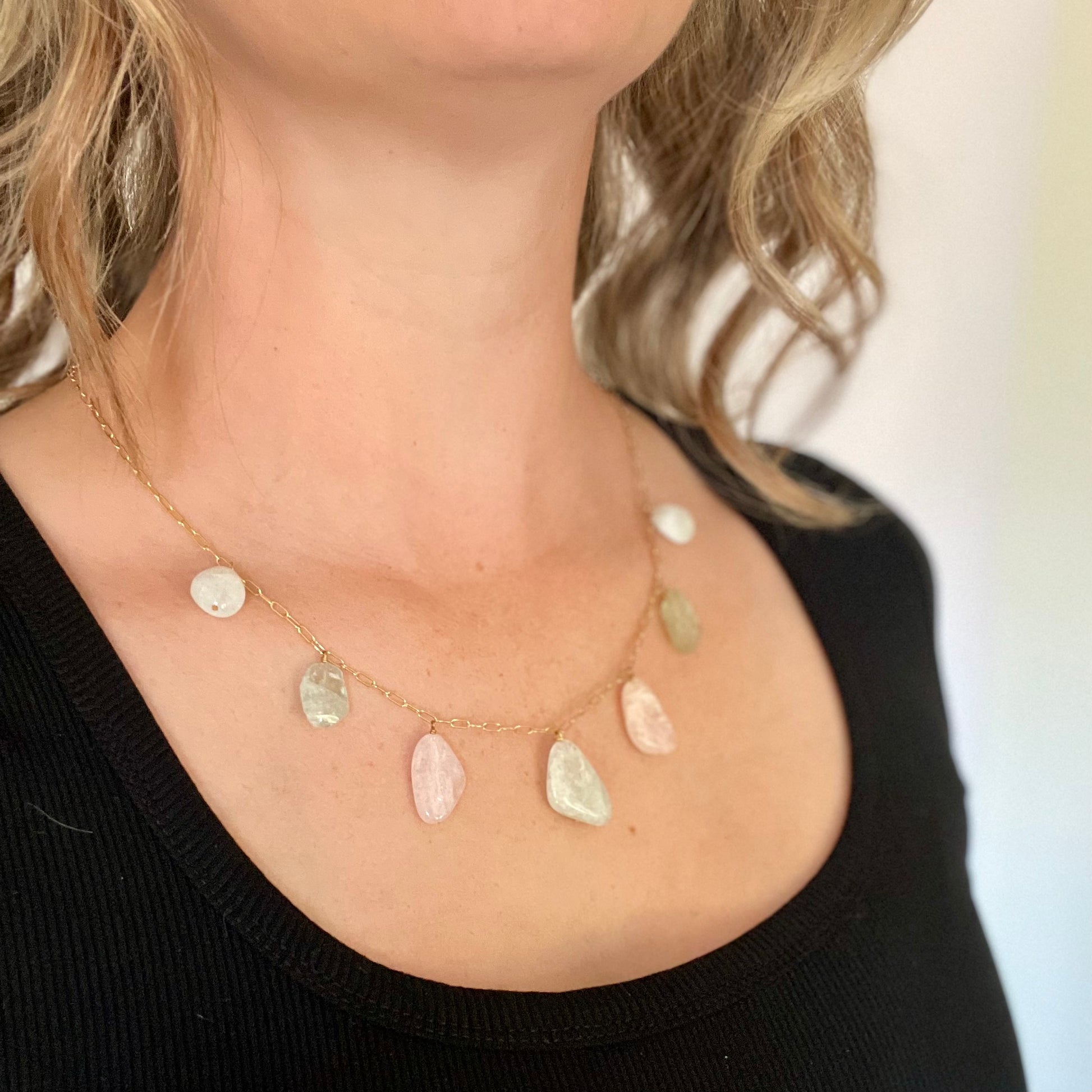 A simple but statement-making necklace in light blues, greens and pinks. Smooth and faceted Aquamarine and Morganite nuggets, fun to wear and looks great layered with a shorter beaded or pendant necklace. Only one available. Longest length of 24 inches, adjustable.