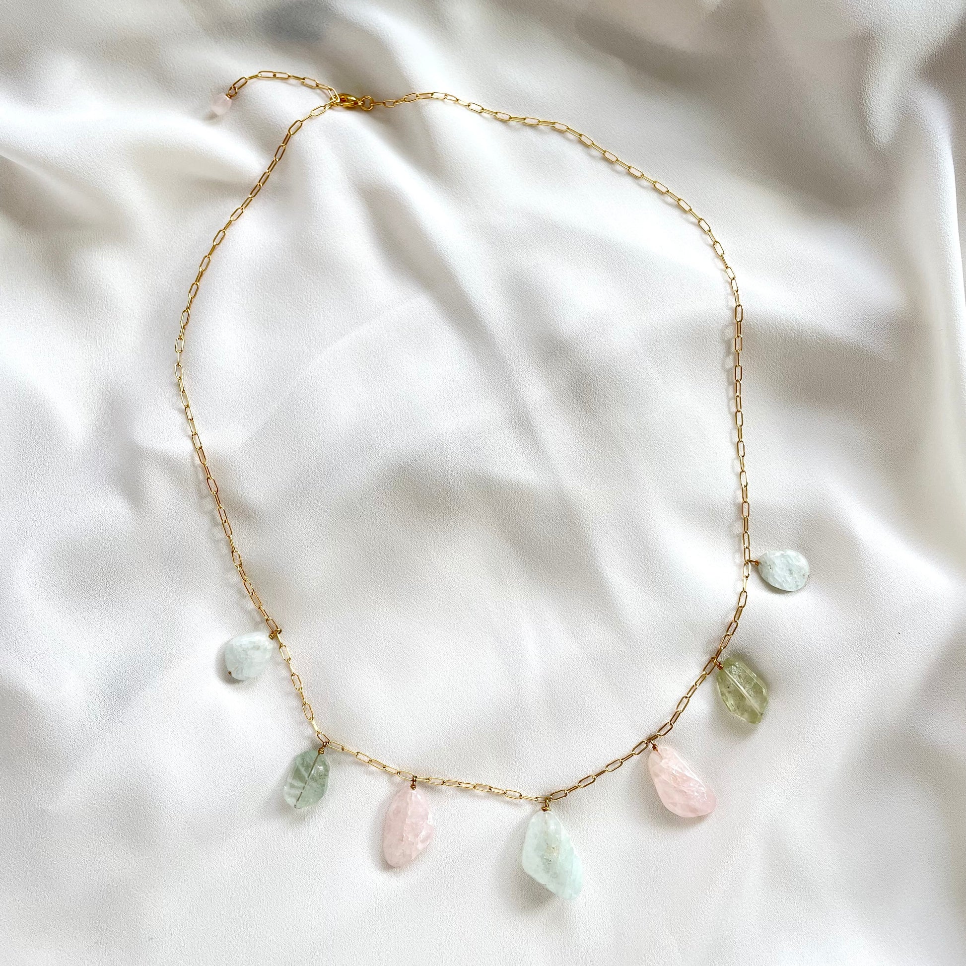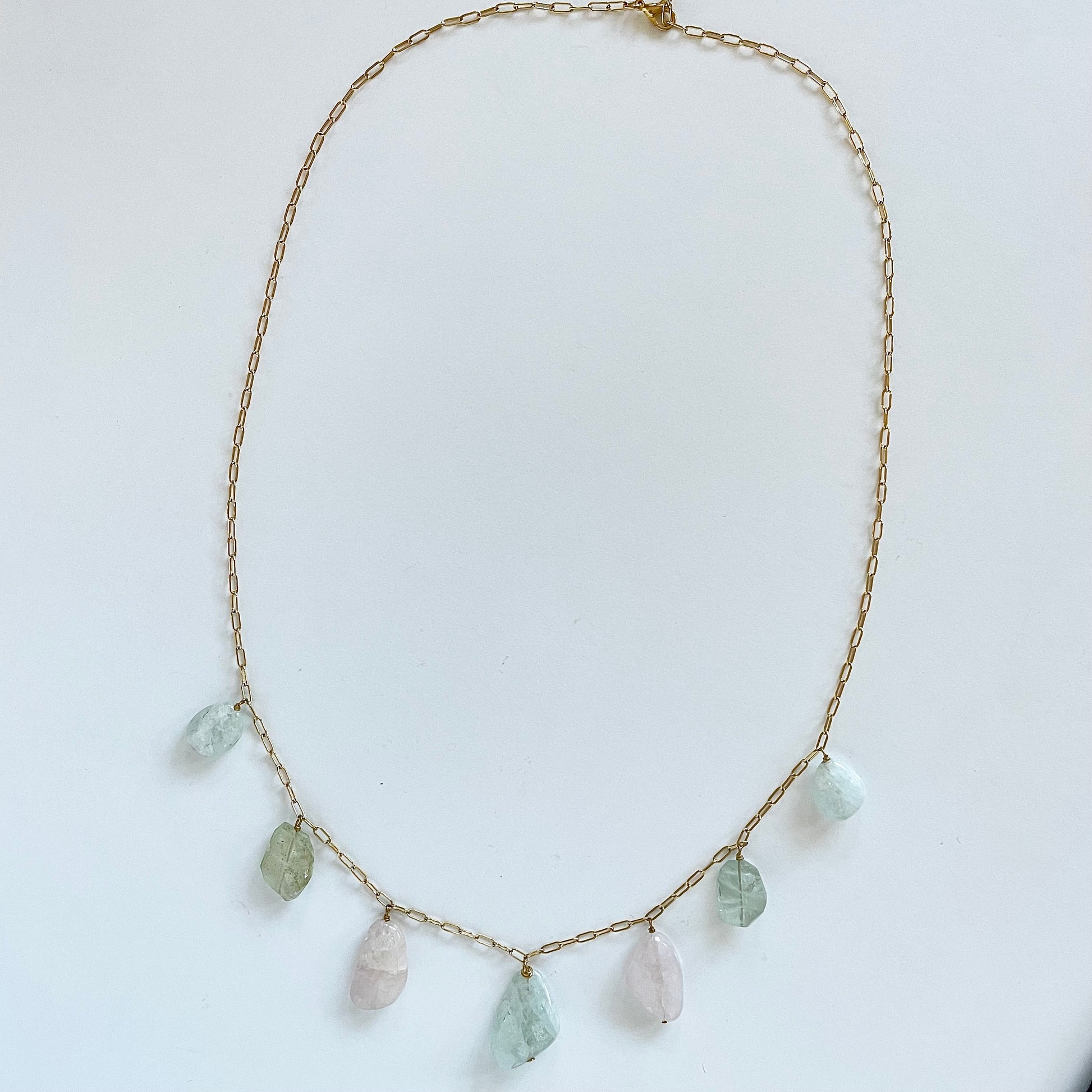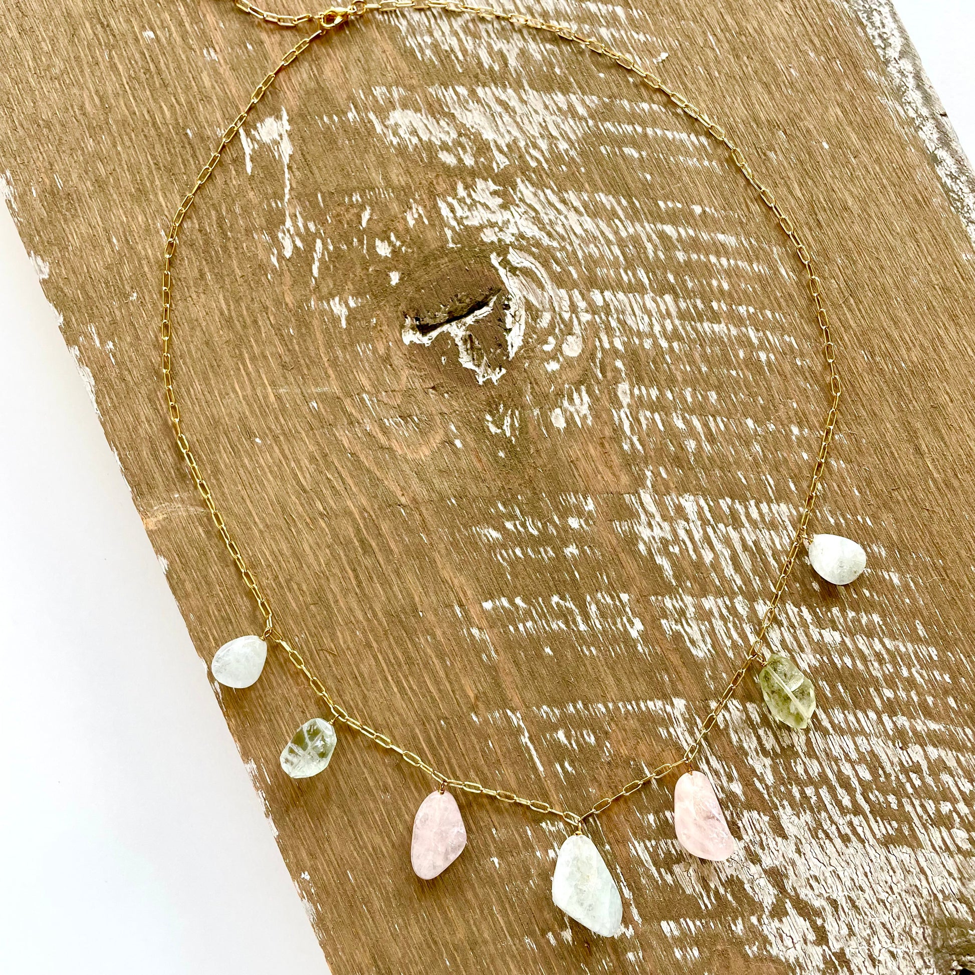 A simple but statement-making necklace in light blues, greens and pinks. Smooth and faceted Aquamarine and Morganite nuggets, fun to wear and looks great layered with a shorter beaded or pendant necklace. Only one available. Longest length of 24 inches, adjustable.