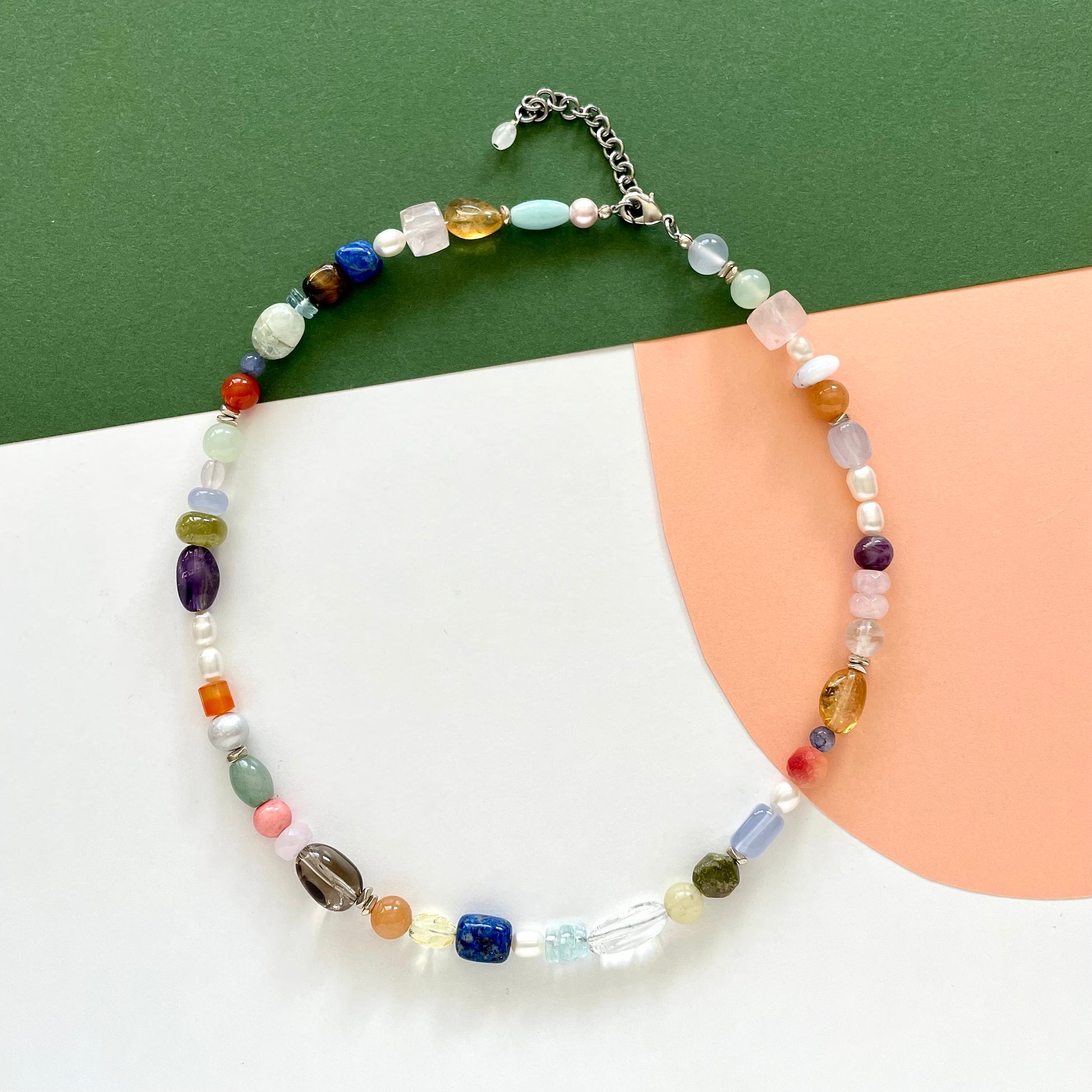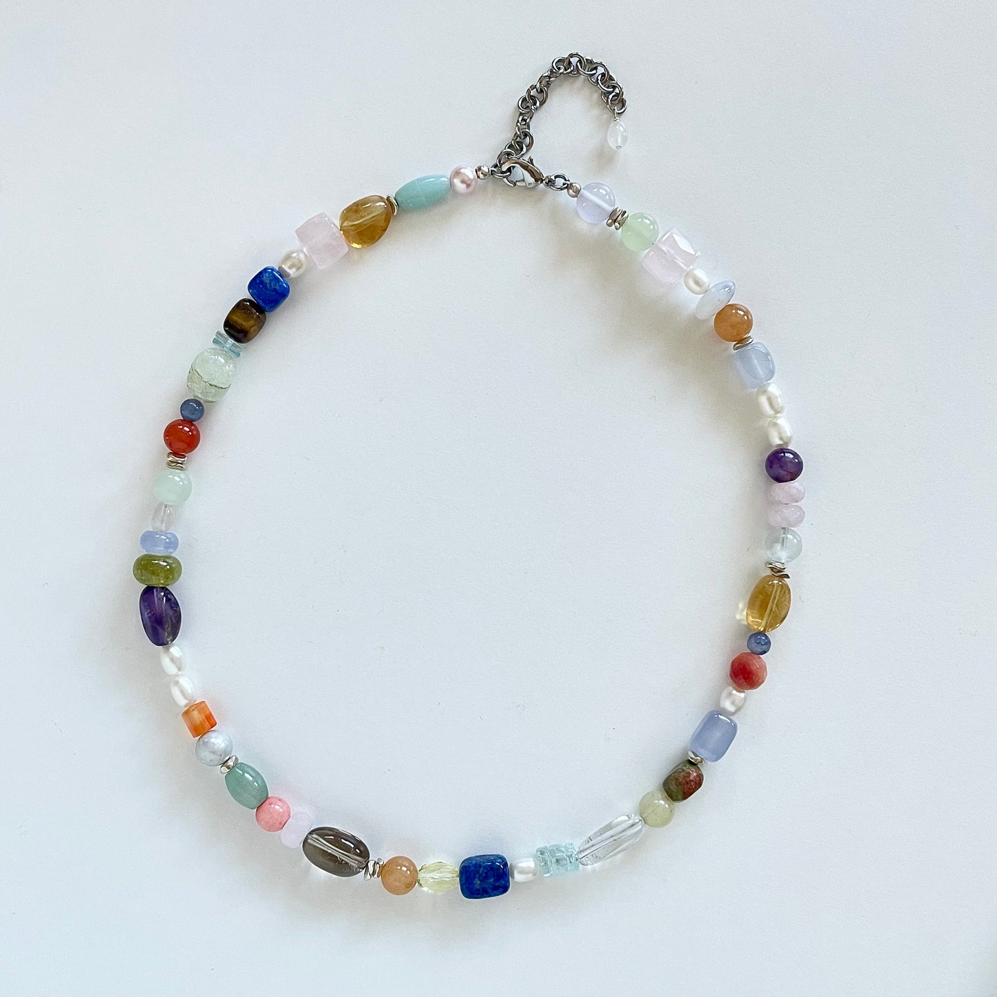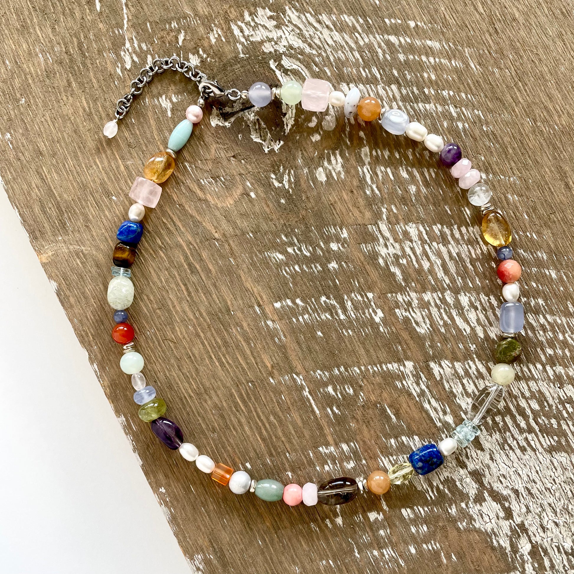A whimsical beaded necklace. Chalcedony, Lapis, Fresh Water Pearl, Amethyst, Garnet, Quartz, Carnelian and Aventurine with silver plated vintage chain; multi colored and fun to wear. Only one available. Adjustable length of 17.5-19.5 inches.