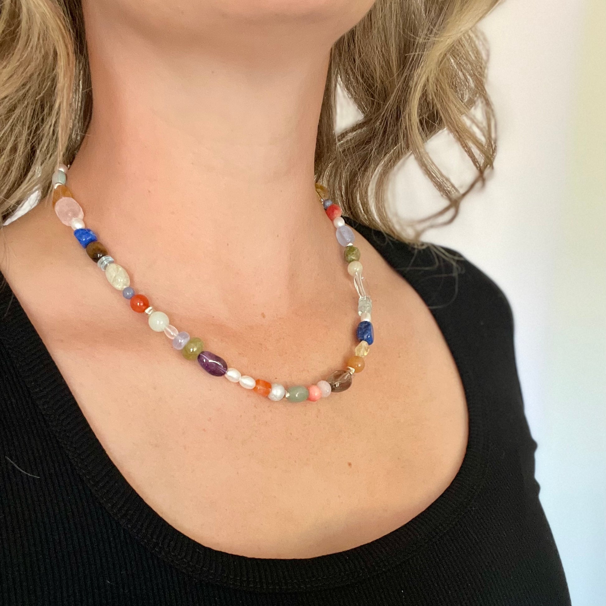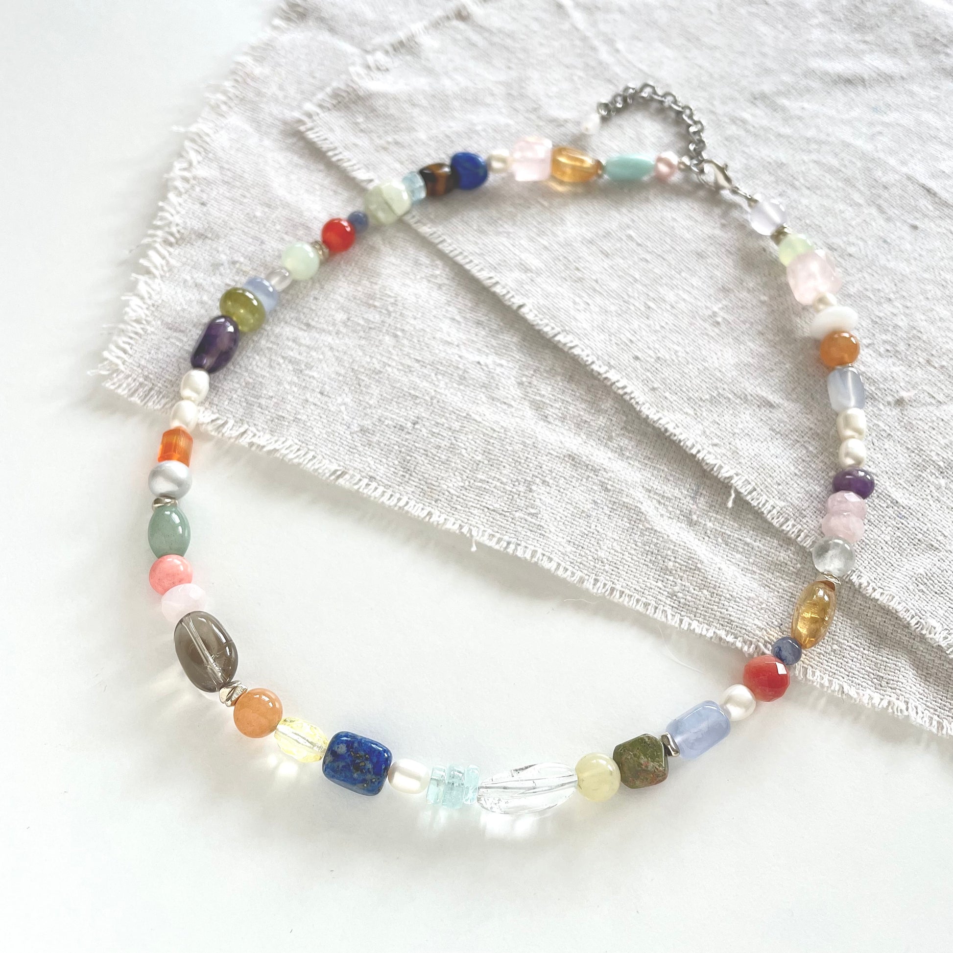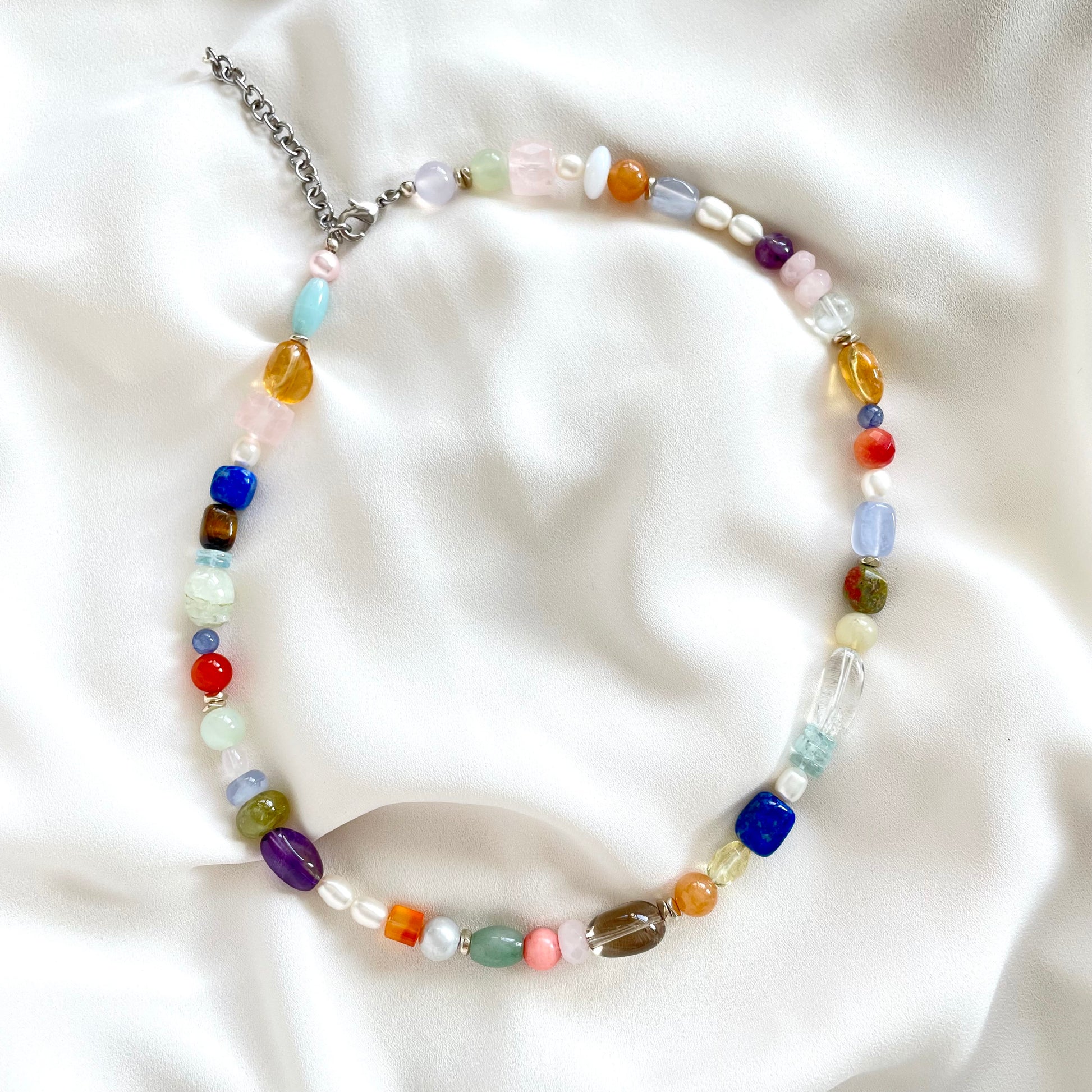A whimsical beaded necklace. Chalcedony, Lapis, Fresh Water Pearl, Amethyst, Garnet, Quartz, Carnelian and Aventurine with silver plated vintage chain; multi colored and fun to wear. Only one available. Adjustable length of 17.5-19.5 inches.