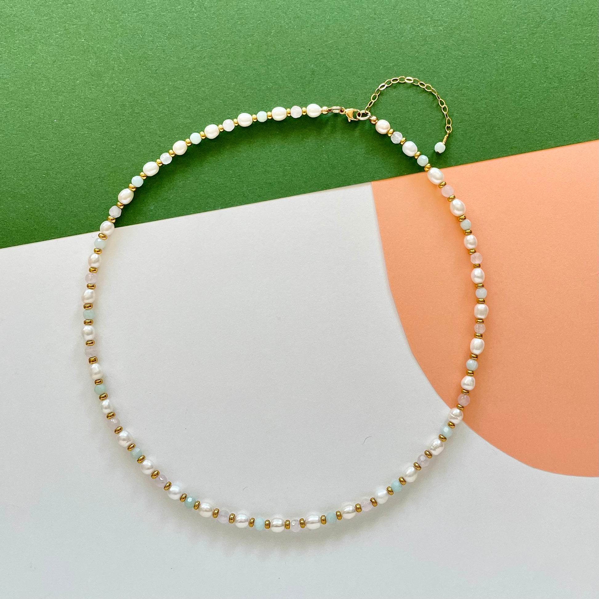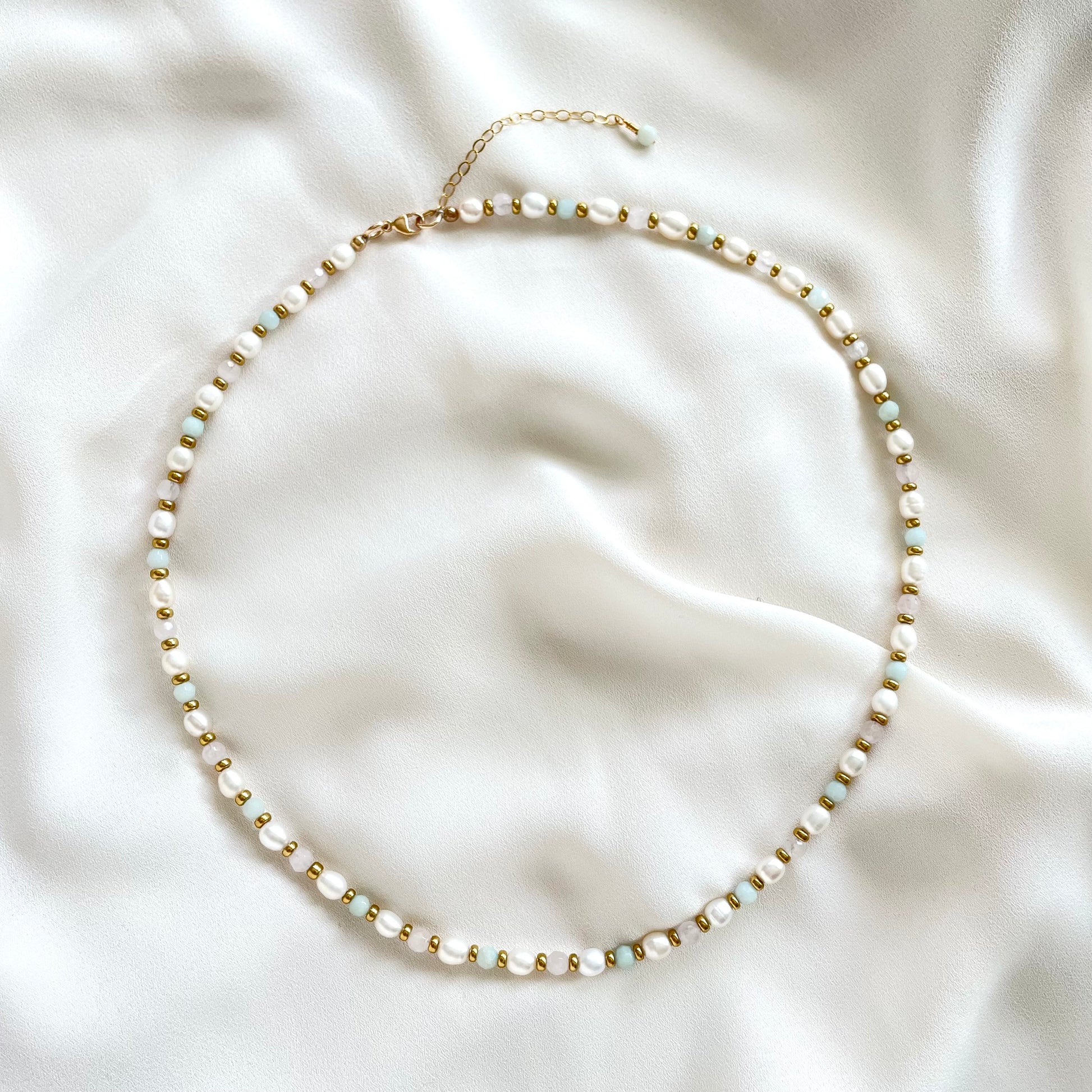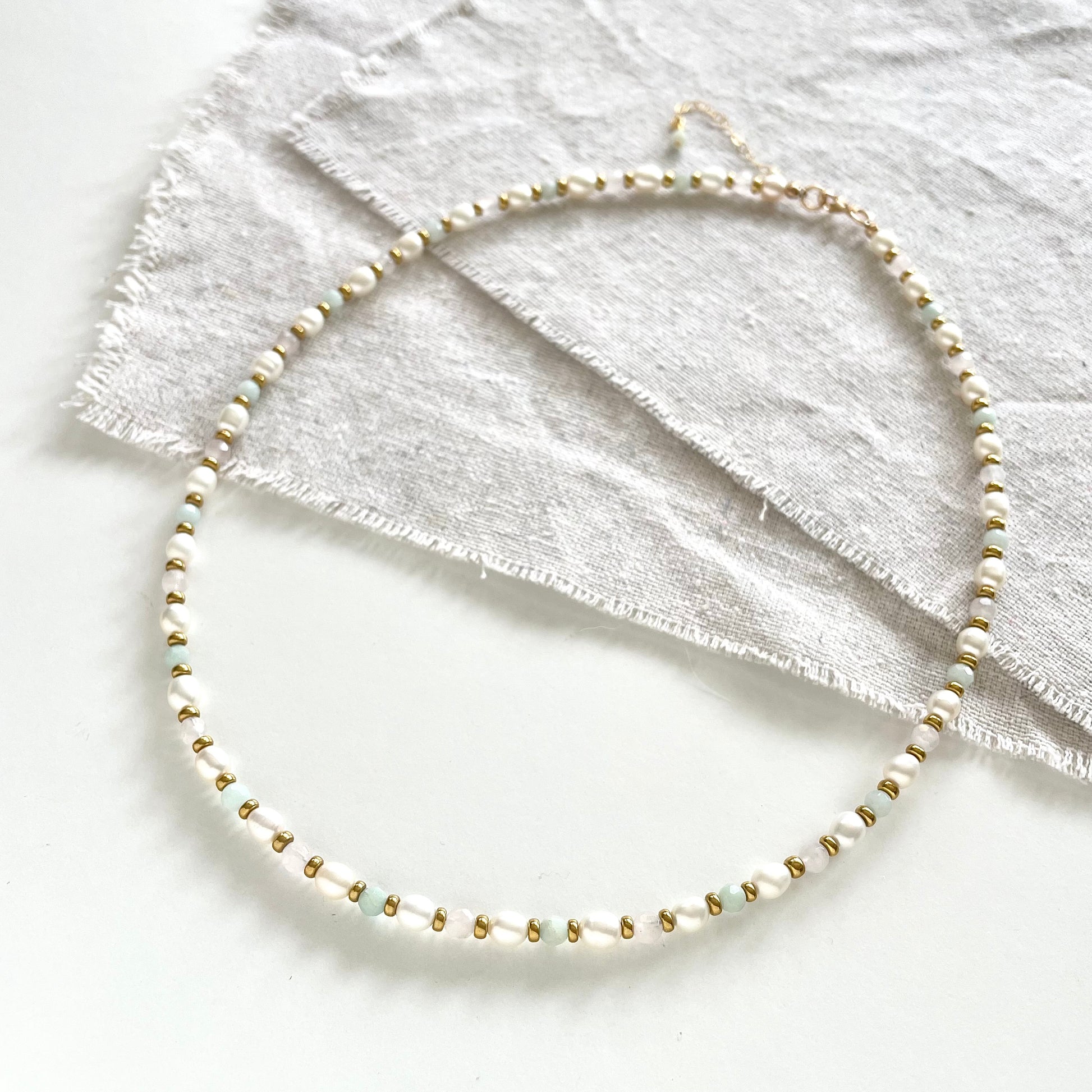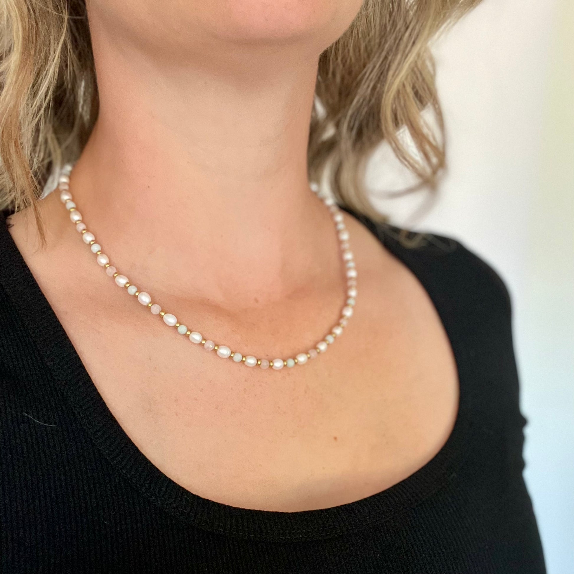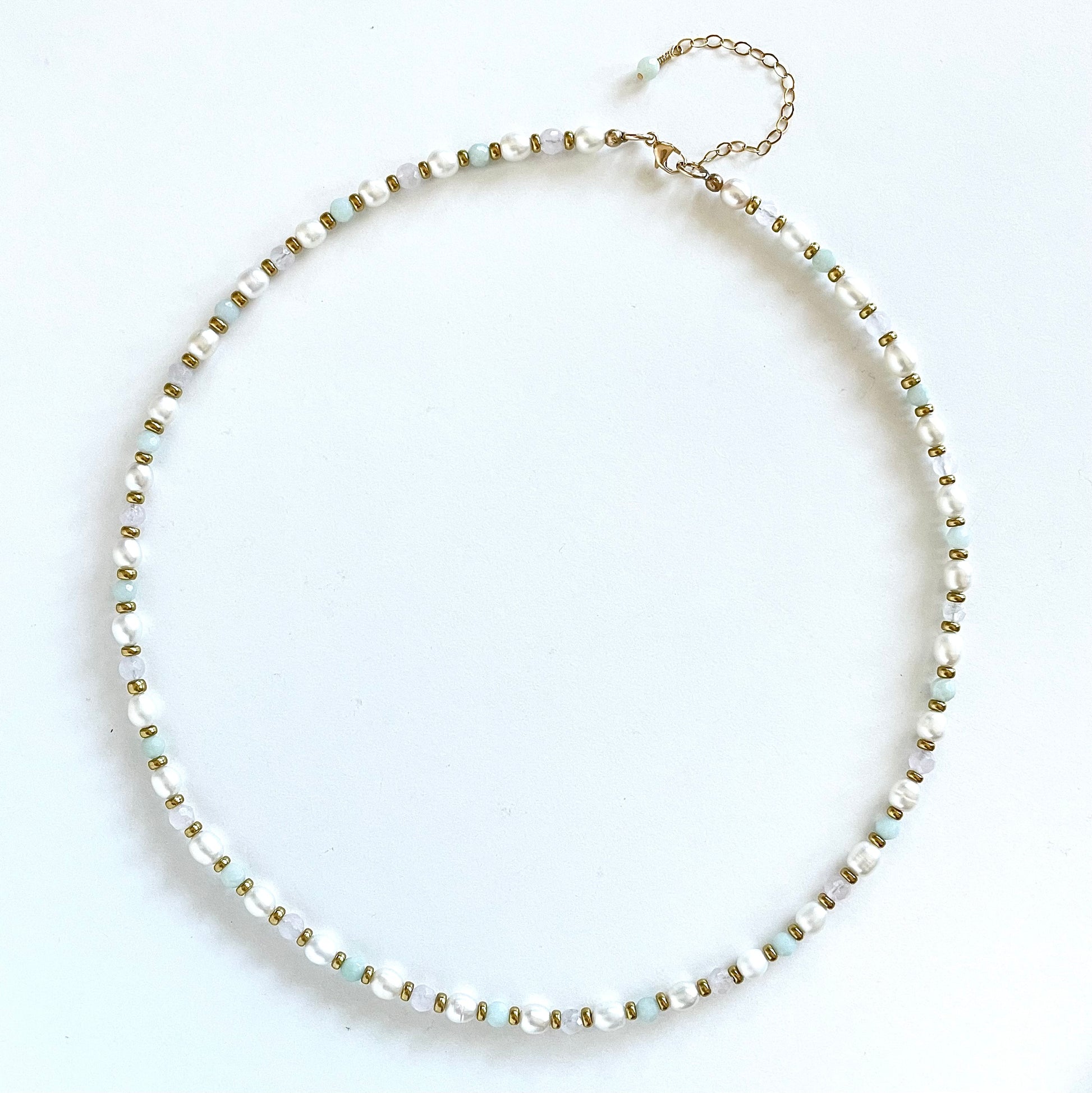 A sweet little beaded necklace to elevate your outfits. Fresh Water Pearl, faceted Amazonite, faceted Rose Quartz, brass accent beads, 14k Gold Fill Chain and Lobster Claw Clasp. Multi-colored but neutral at the same time. Only one available. Overall length of 19-21 inches, adjustable.