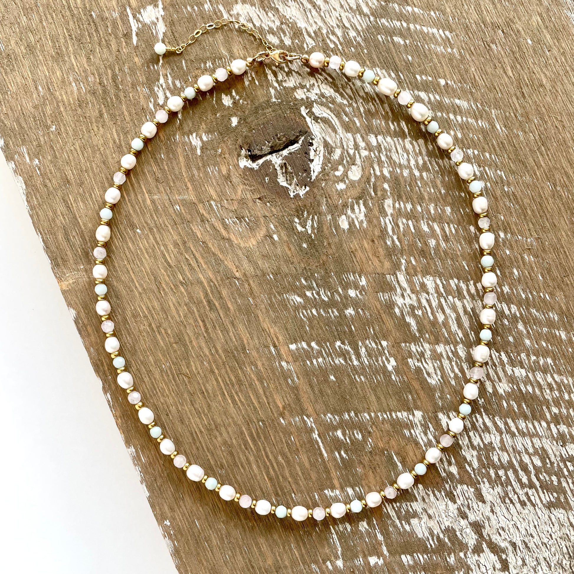 One of a Kind Beaded Necklace with Fresh Water Pearl, Amazonite, Rose Quartz, Brass Accent Beads and 14K Gold Fill Chain with Lobster Claw Clasp