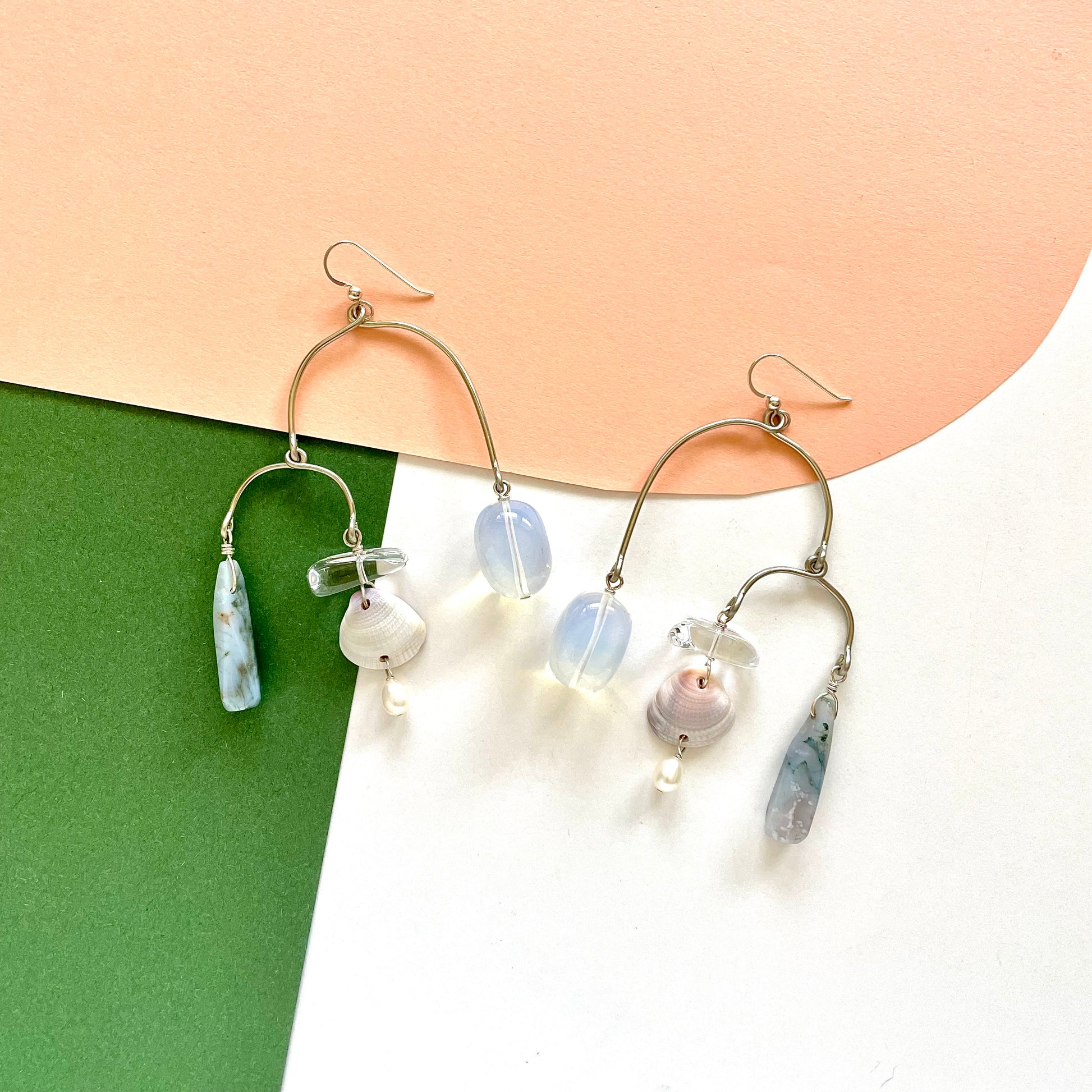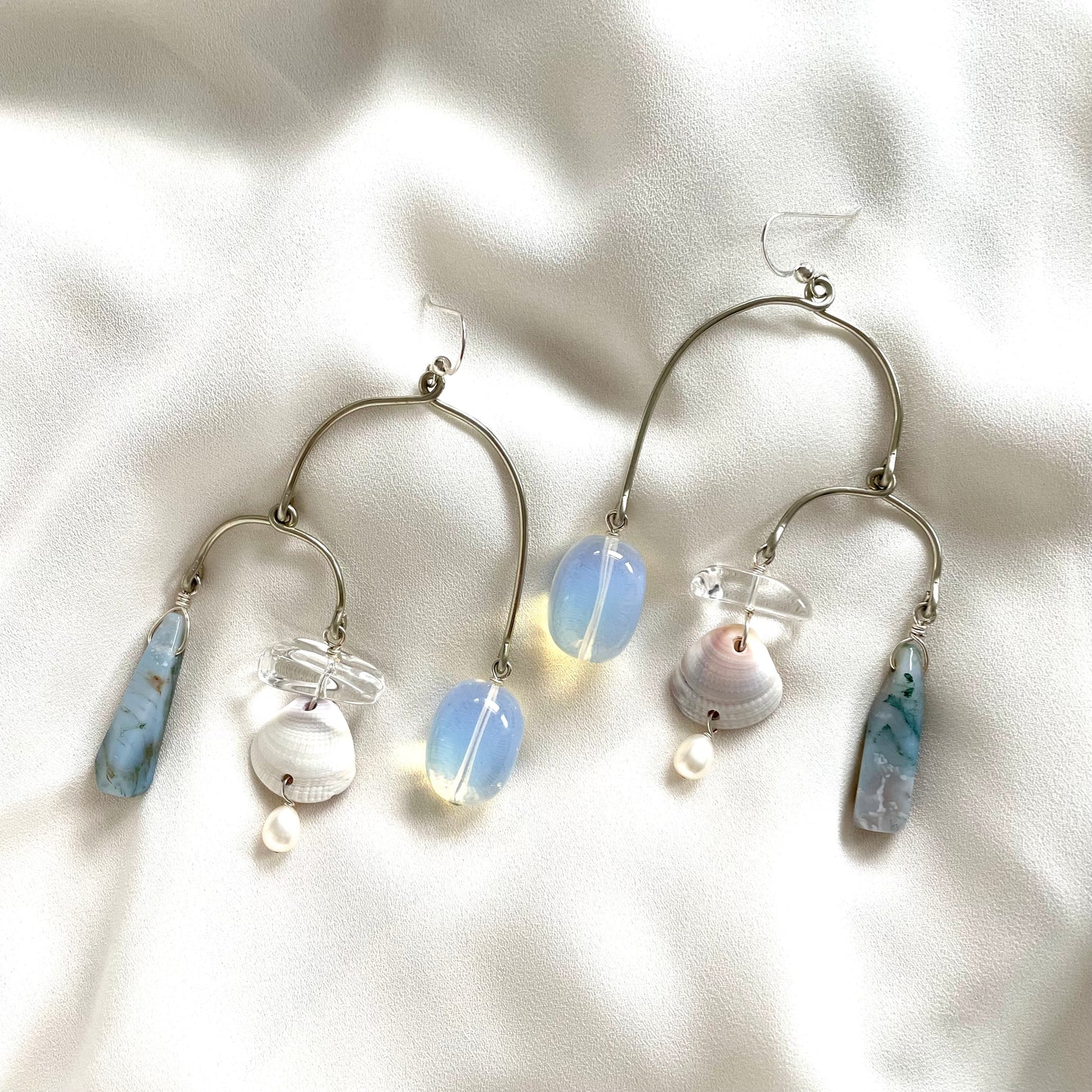 A balanced set of mobile earrings. Fresh Water Pearl, Jasper, Quartz, Opalite, Shells with German Silver frames; organic shapes, neutral colors and fun to wear with lots of movement. Only one set available. Overall length of 3.75 inches.