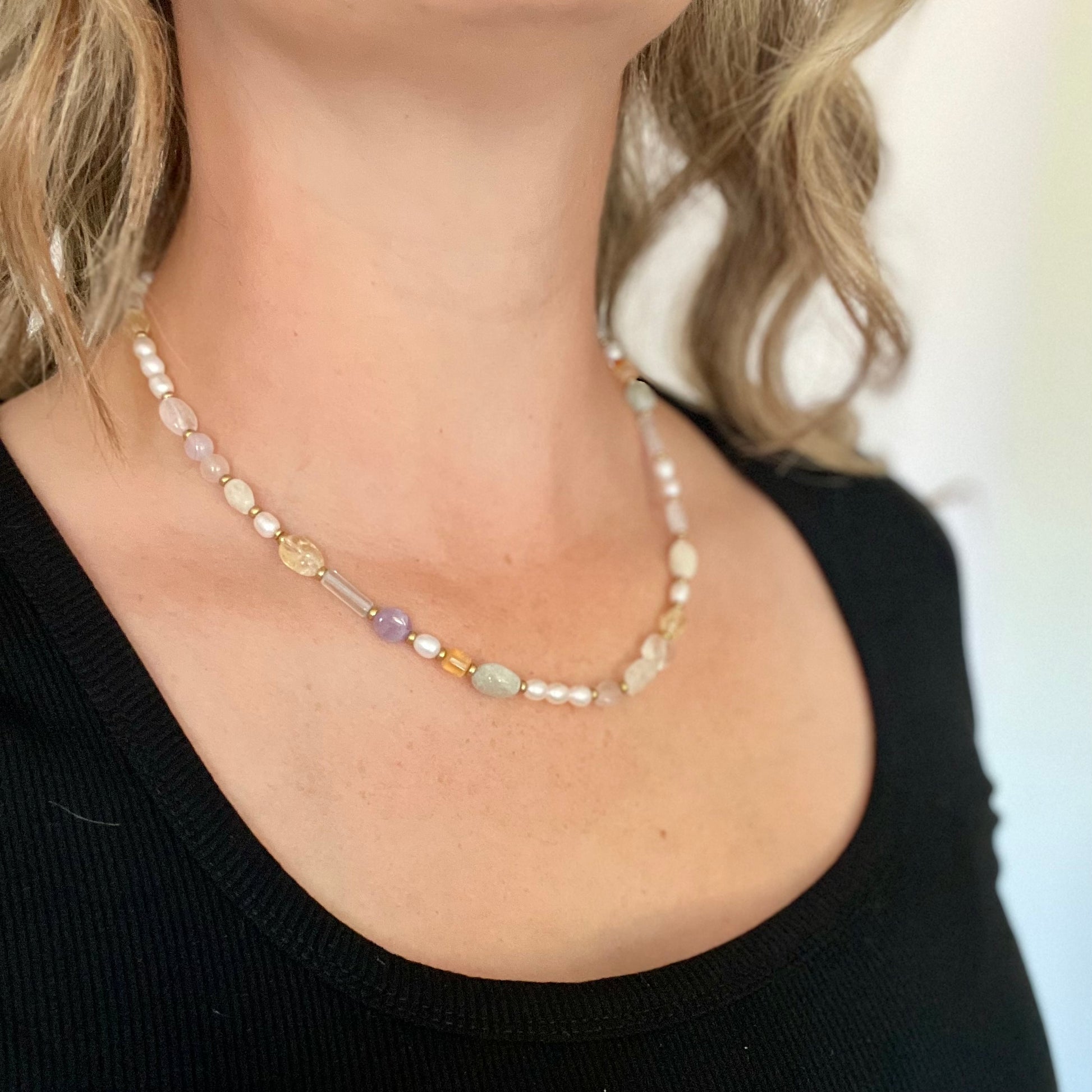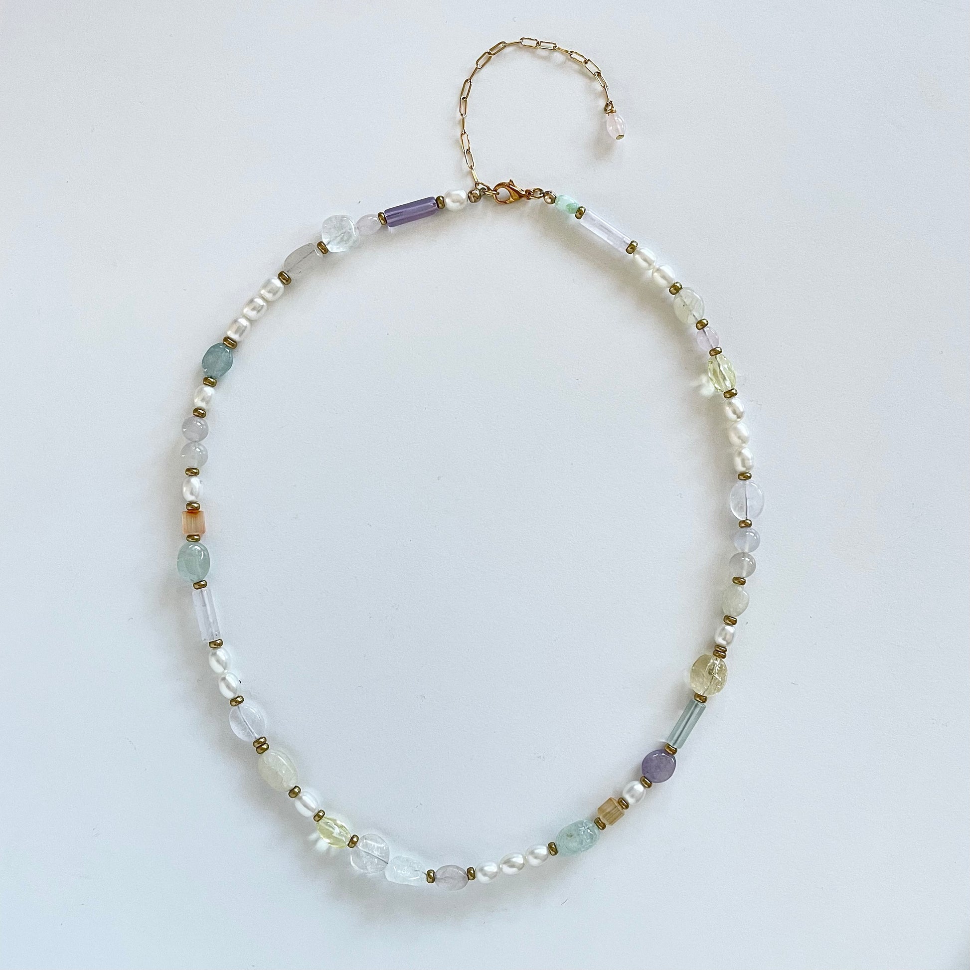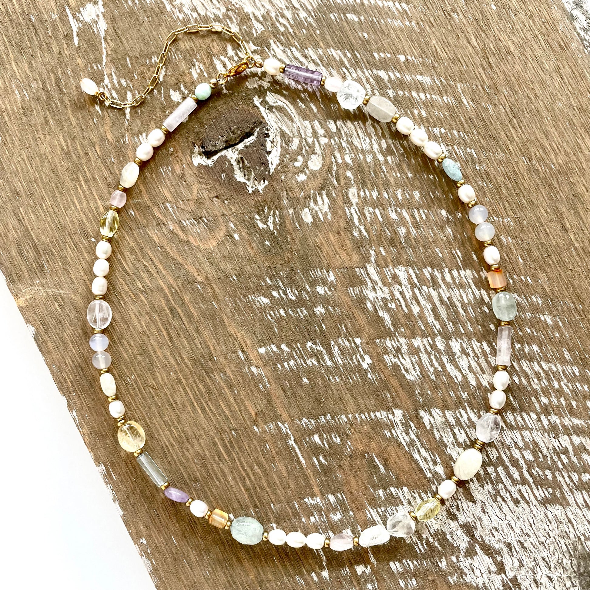 A pretty little beaded necklace to elevate your outfits. Fresh Water Pearl, Labradorite, Citrine, Opal, Amethyst, Aquamarine, Aventurine, Quartz with Sterling Silver Chain and Clasp. Multi-colored but neutral at the same time. Only one available. Overall length of 19-21 inches, adjustable.