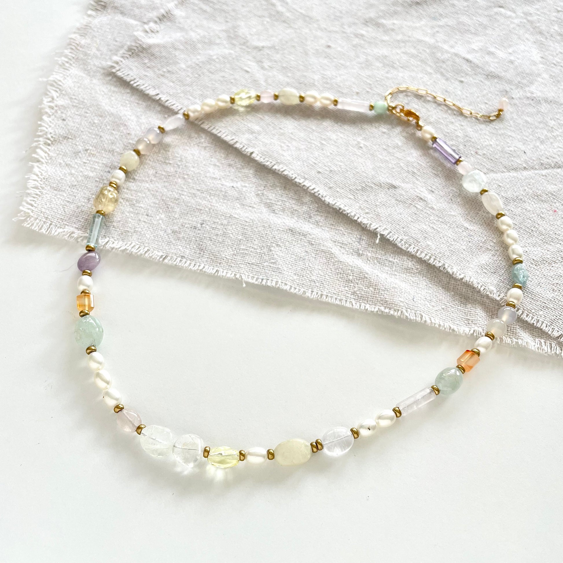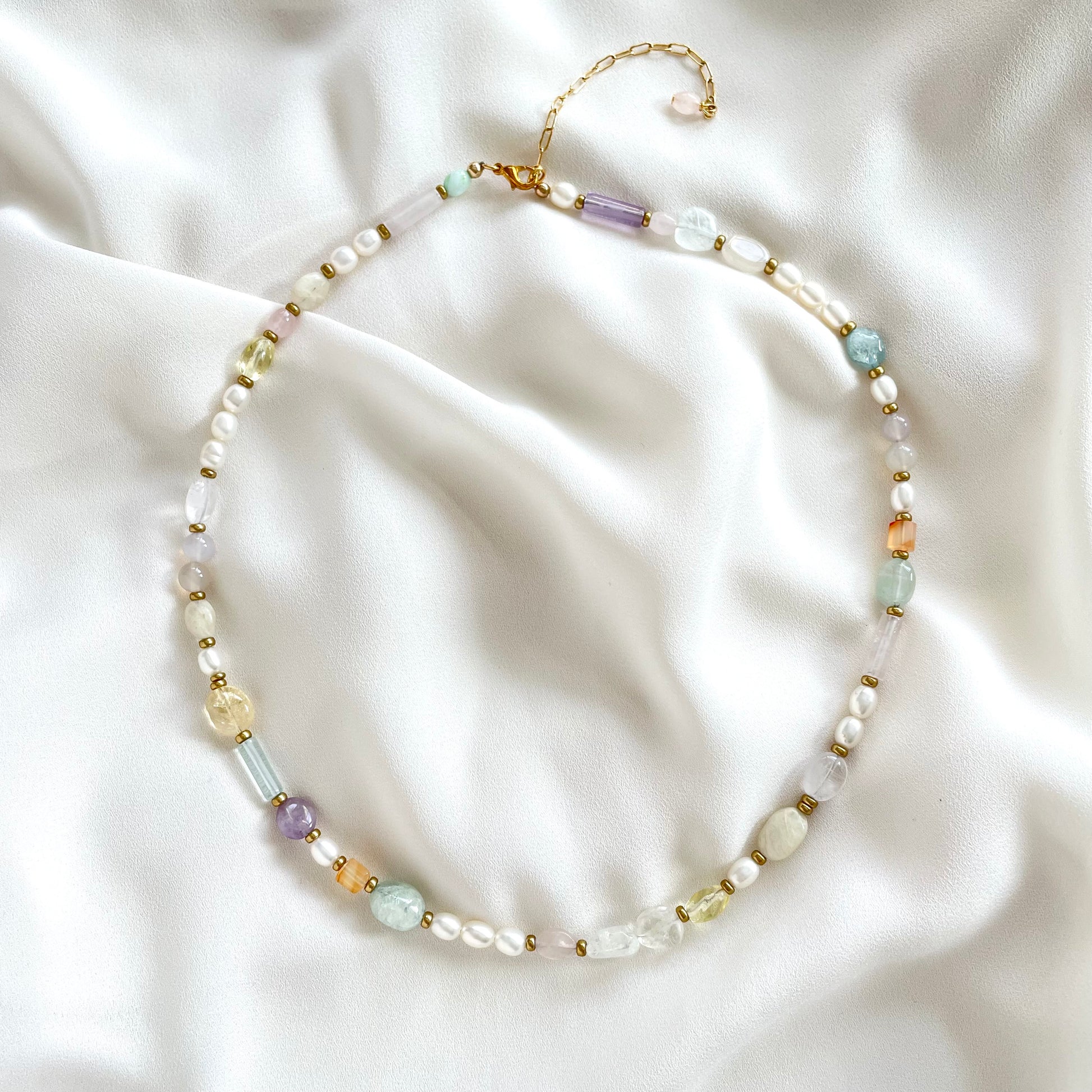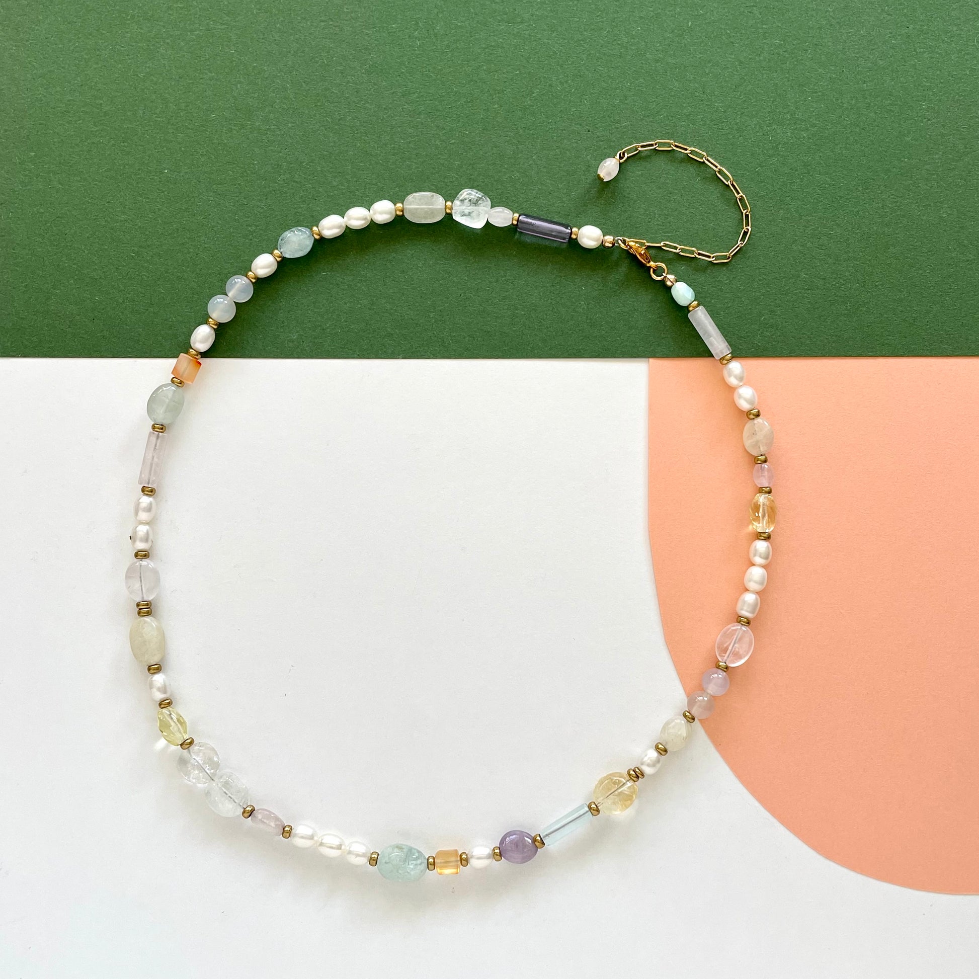 A pretty little beaded necklace to elevate your outfits. Fresh Water Pearl, Labradorite, Citrine, Opal, Amethyst, Aquamarine, Aventurine, Quartz with Sterling Silver Chain and Clasp. Multi-colored but neutral at the same time. Only one available. Overall length of 19-21 inches, adjustable.