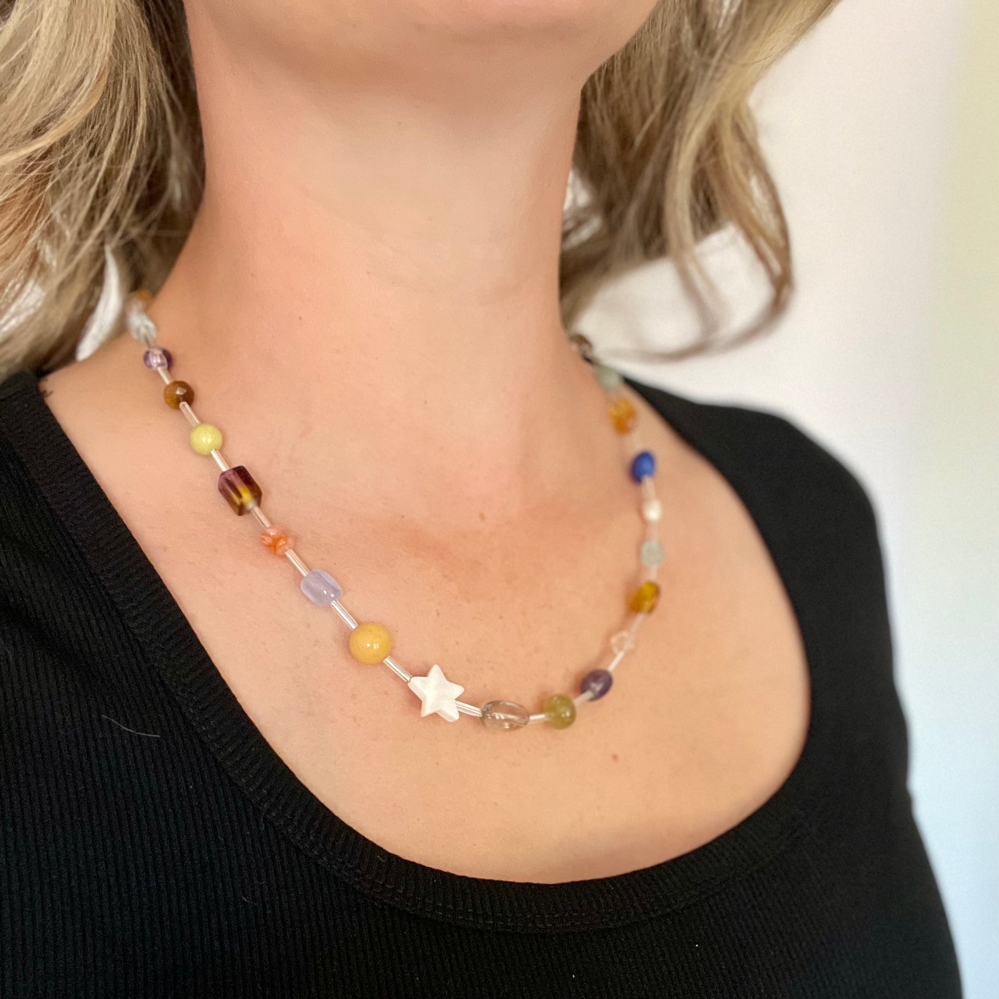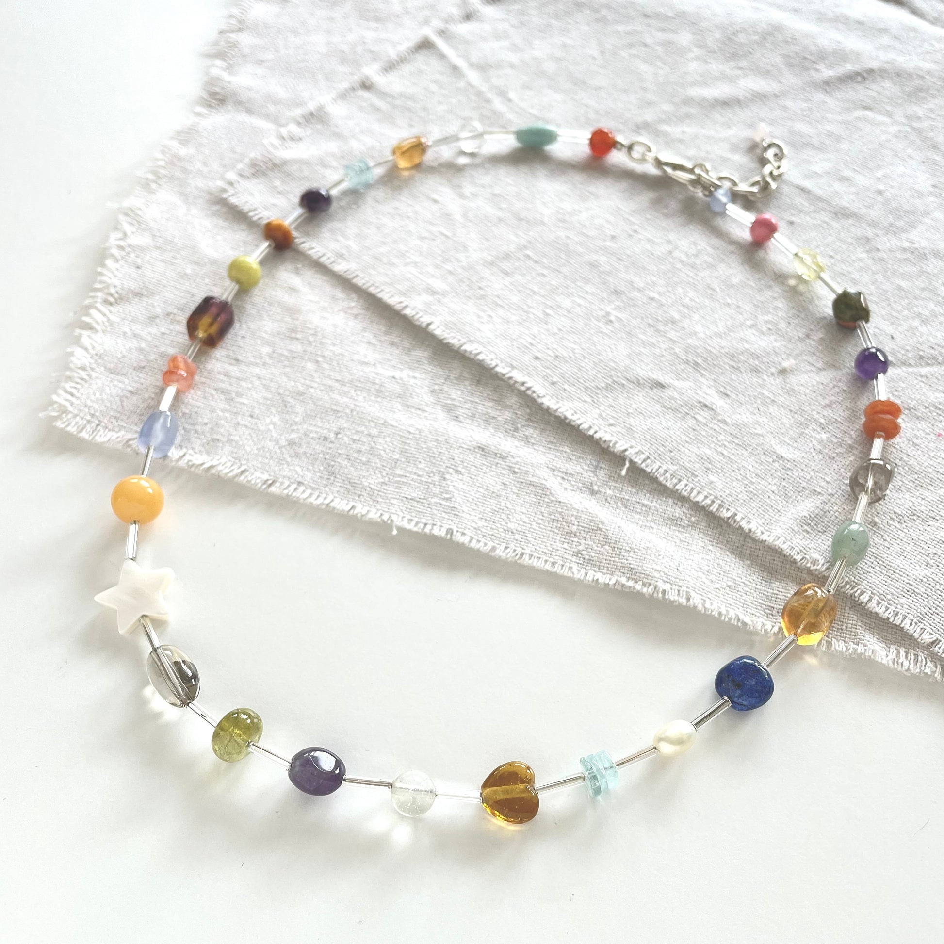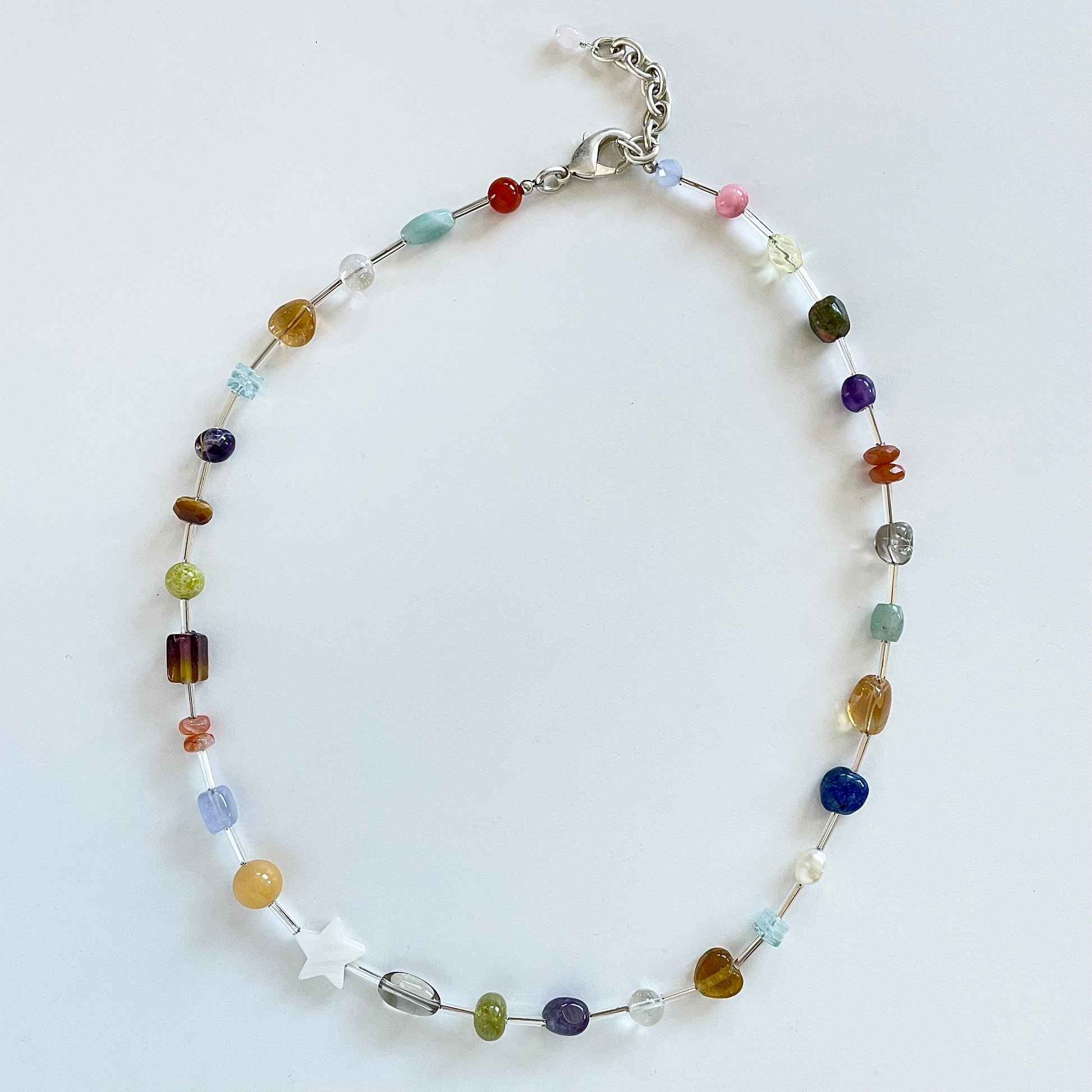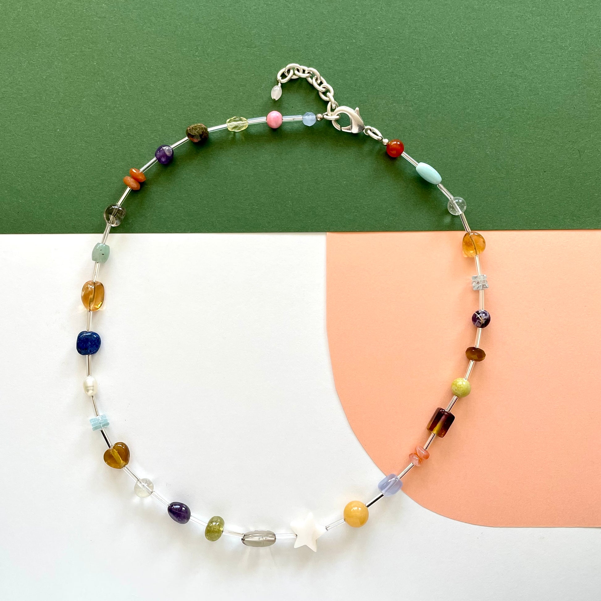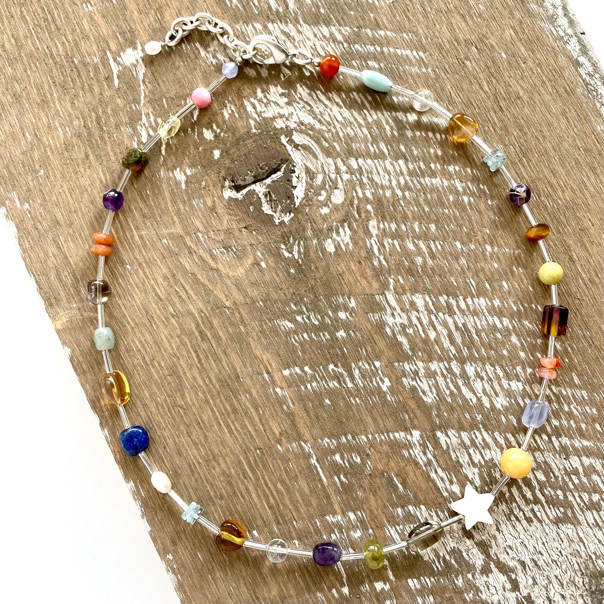 A fun little beaded necklace to elevate your outfits. Fresh Water Pearl, Labradorite, Citrine, Opal, Amethyst, Aquamarine, Aventurine, Tiger Eye, Lapis, Garnet and Quartz with Vintage Silver Toned Chain and Lobster Claw Clasp. Multi-colored and whimsical with repurposed vintage materials. Only one available. Overall length of 21-23 inches.