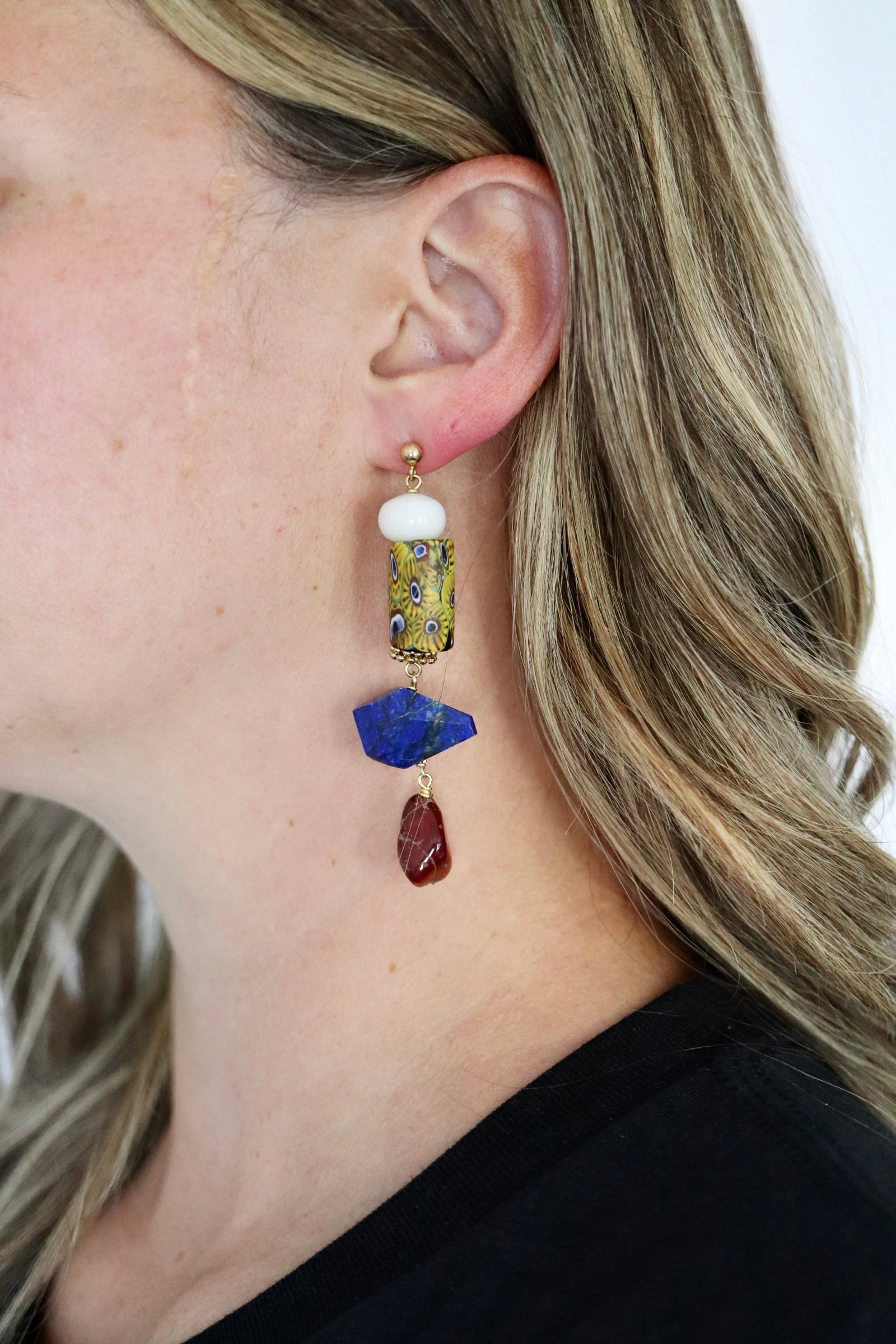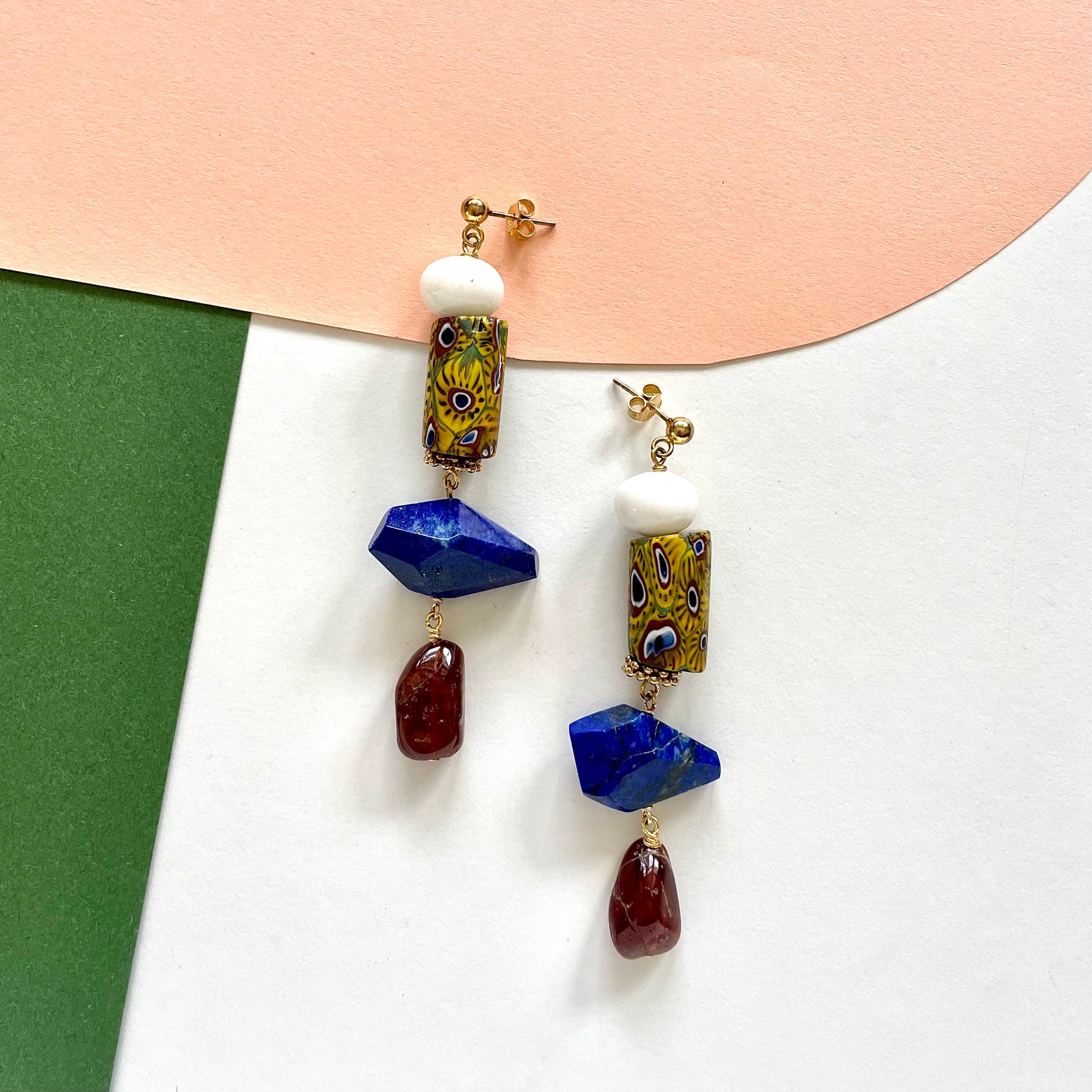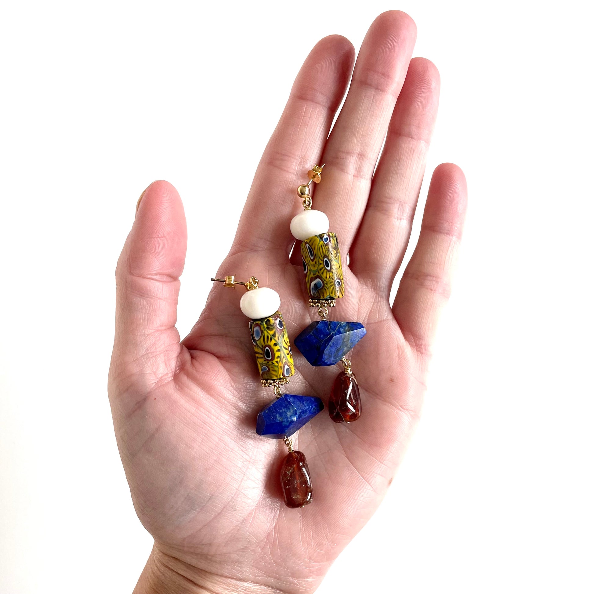 OOAK - Lapis, Carnelian, Jade, Porcelain and Brass Beads with Vermeil Stud Earrings