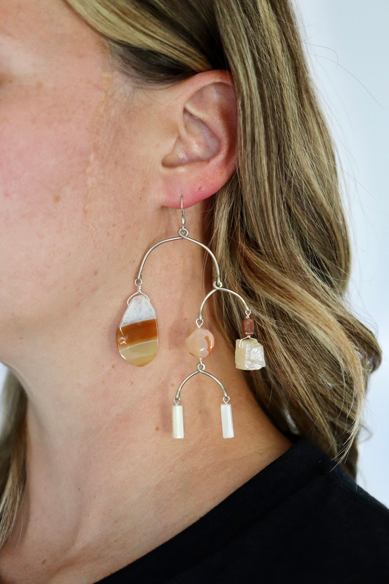 A balanced mobile set of earrings. Mother of Pearl, Agate, Carnelian, Quartz, Sunstone with German Silver frames; organic shapes, earthy colors and fun to wear with lots of movement. Only one set available. Overall length of 4 inches.