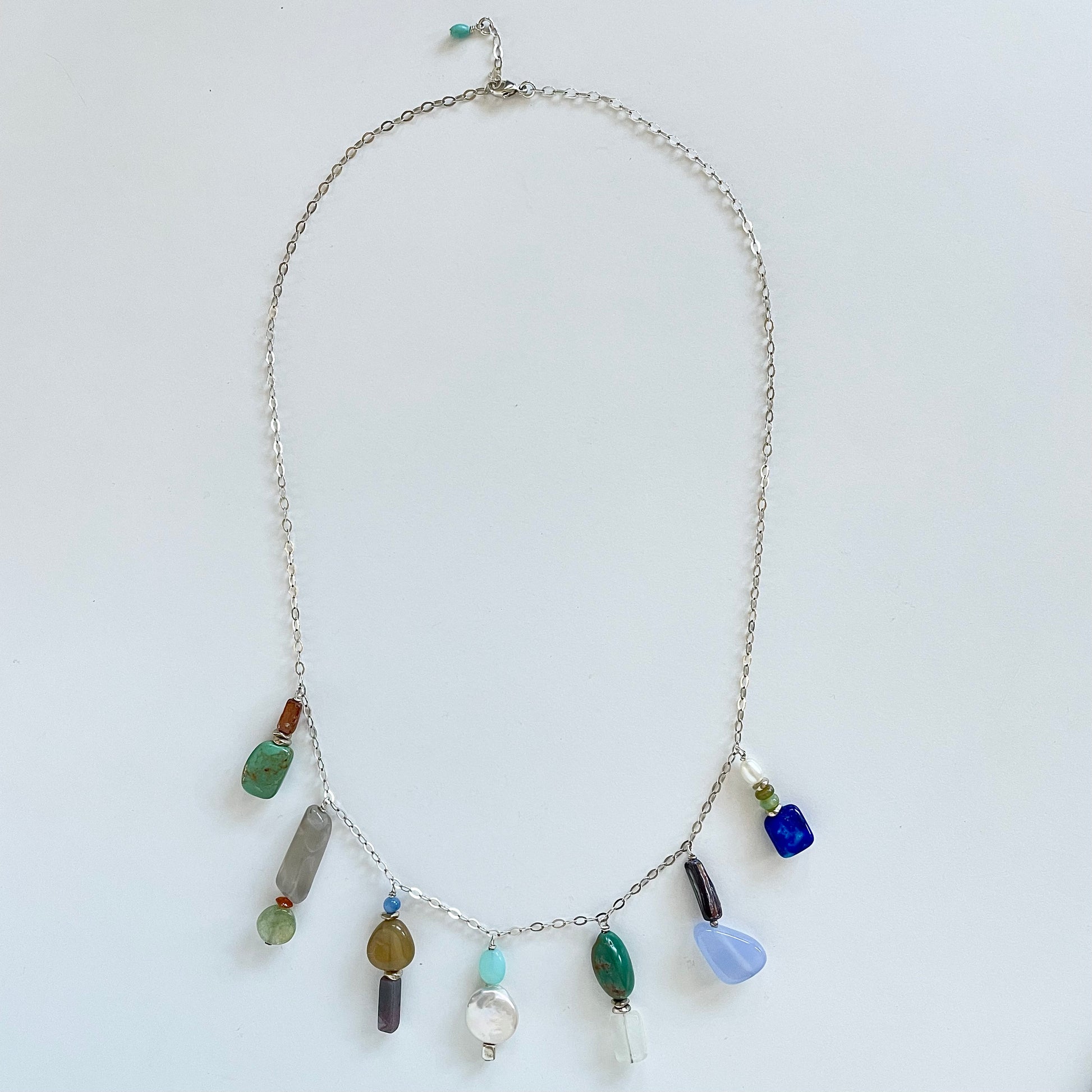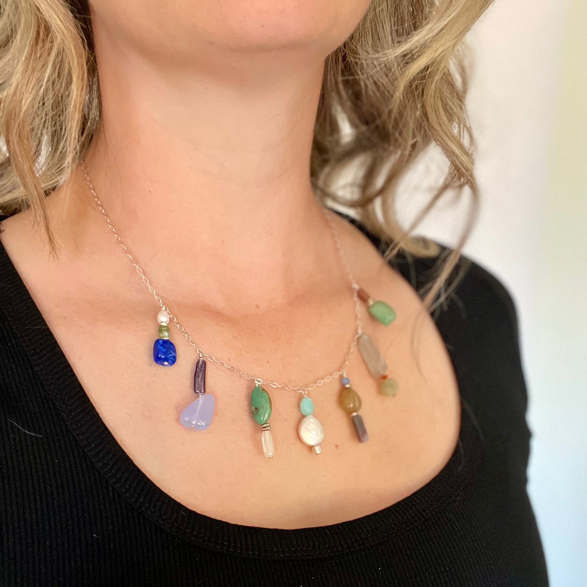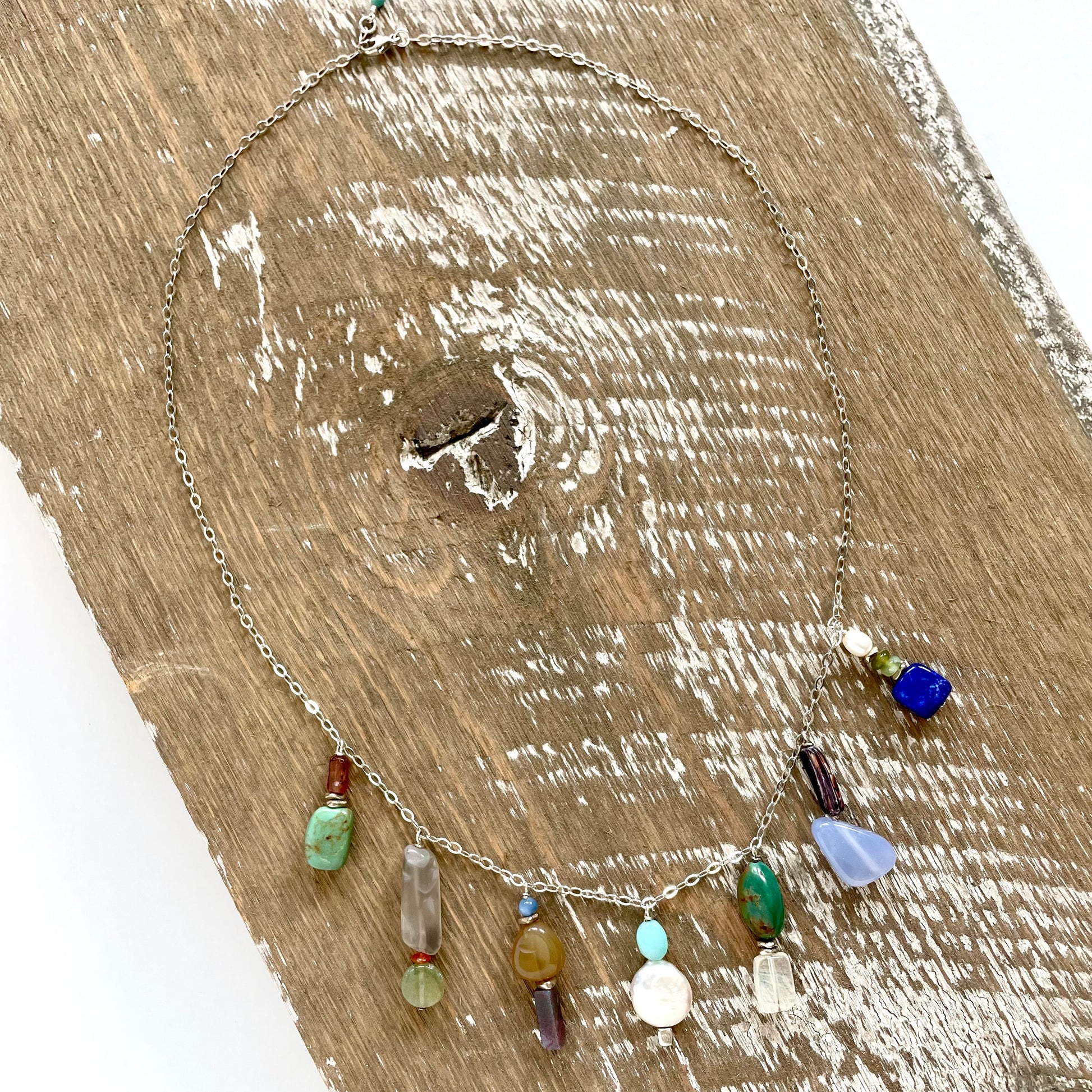 An eclectic charm type necklace. Mother of Pearl, Chalcedony, Lapis, Opal, Fresh Water Pearl, Turquoise, Citrine, Tourmaline, Aquamarine, Quartz, Sunstone with Sterling Silver; this necklace is fun to wear and makes your outfit instantly cooler. Only one available. Longest length of 25 inches, adjustable.
