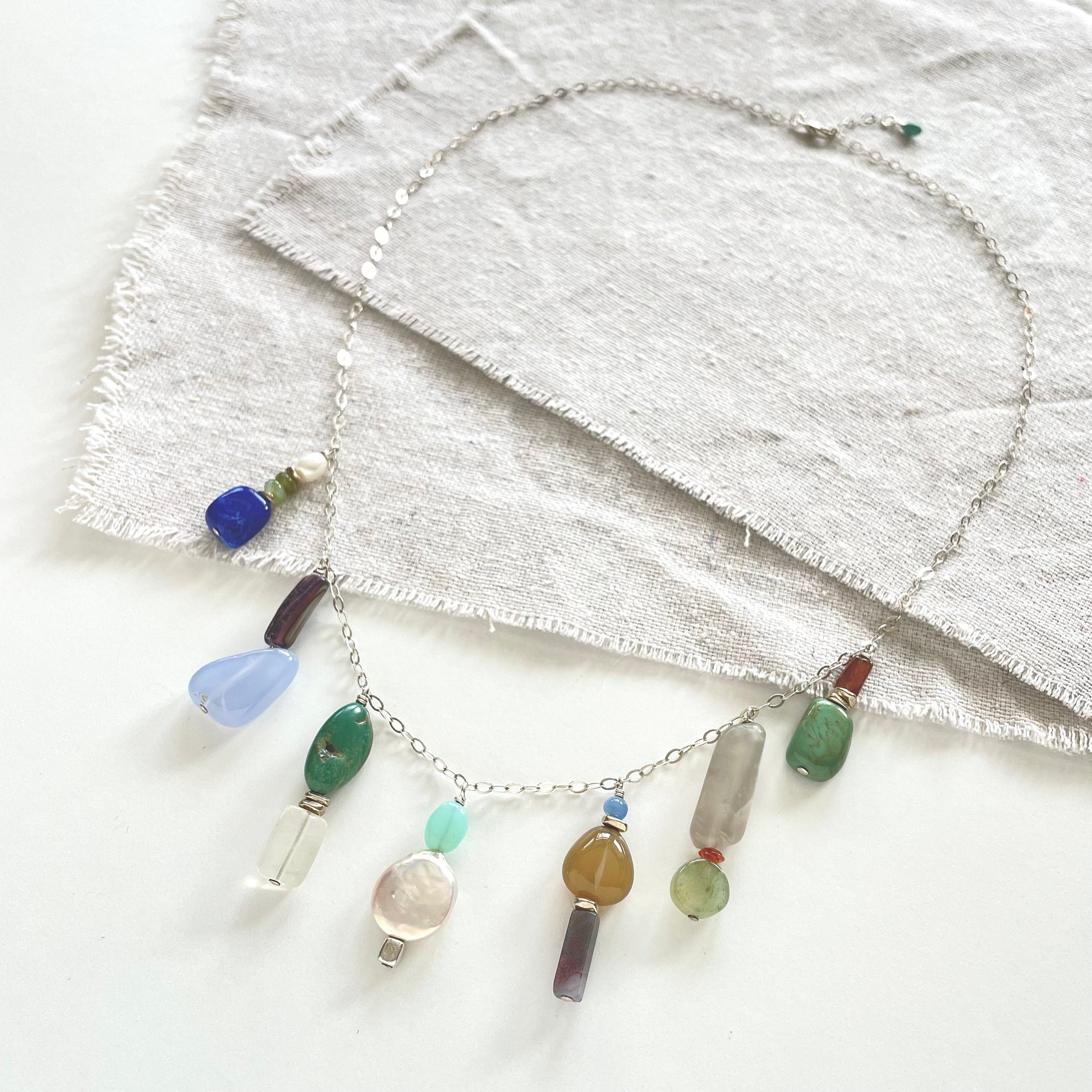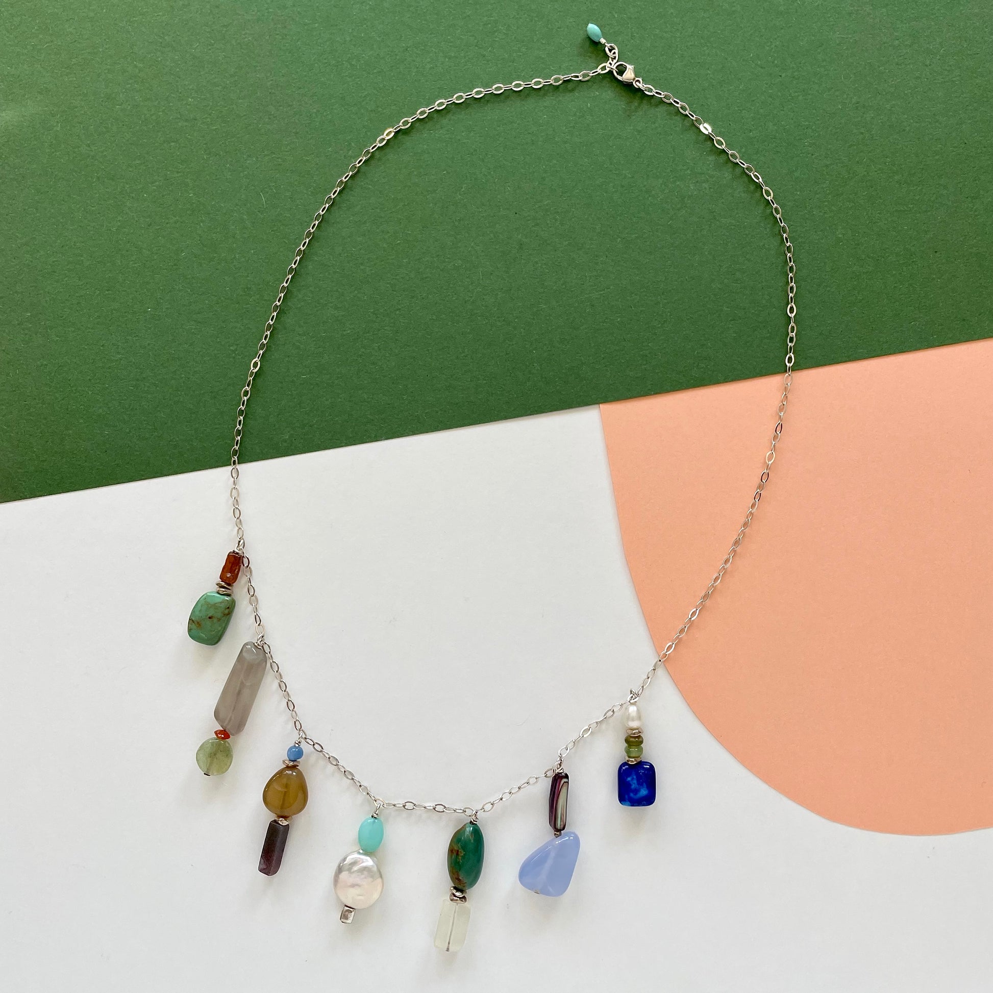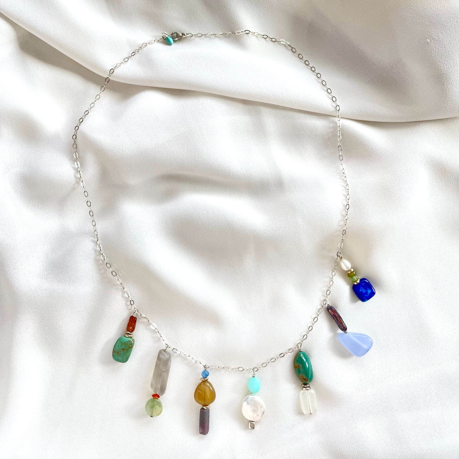 An eclectic charm type necklace. Mother of Pearl, Chalcedony, Lapis, Opal, Fresh Water Pearl, Turquoise, Citrine, Tourmaline, Aquamarine, Quartz, Sunstone with Sterling Silver; this necklace is fun to wear and makes your outfit instantly cooler. Only one available. Longest length of 25 inches, adjustable.