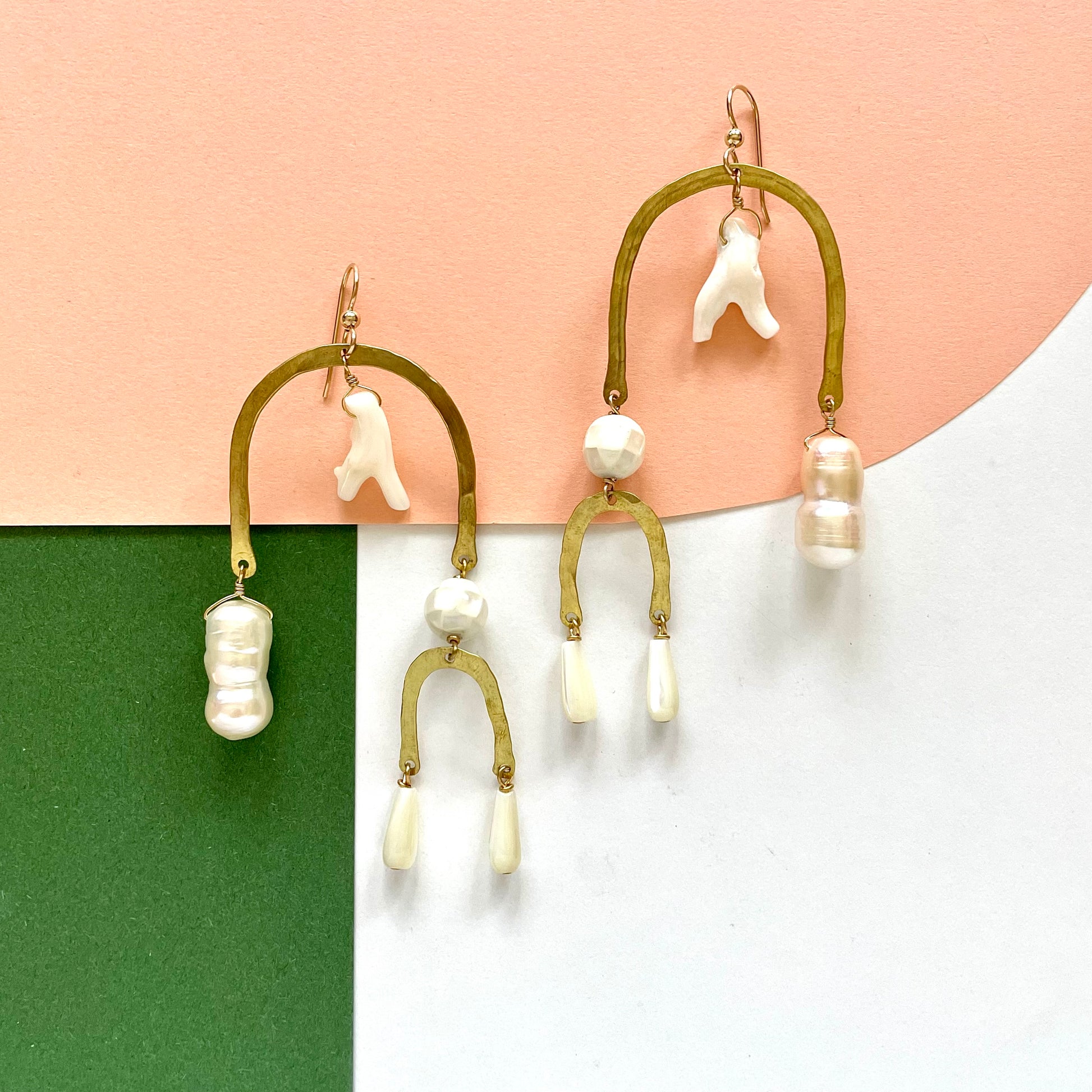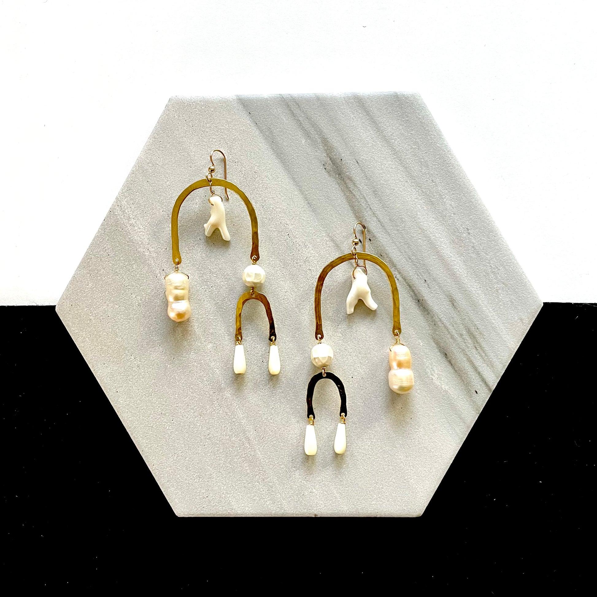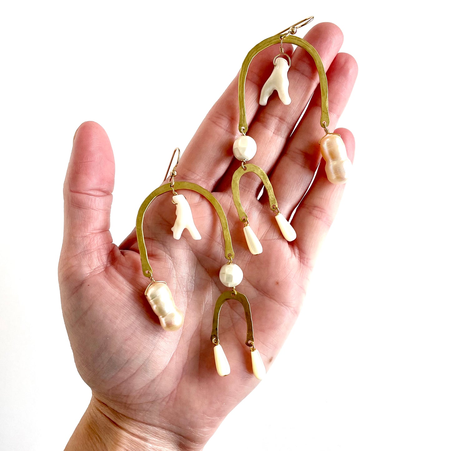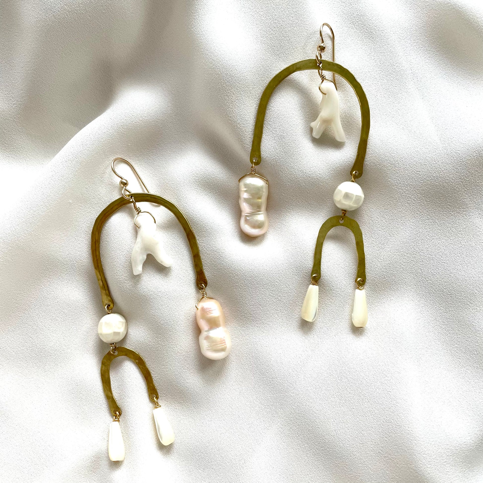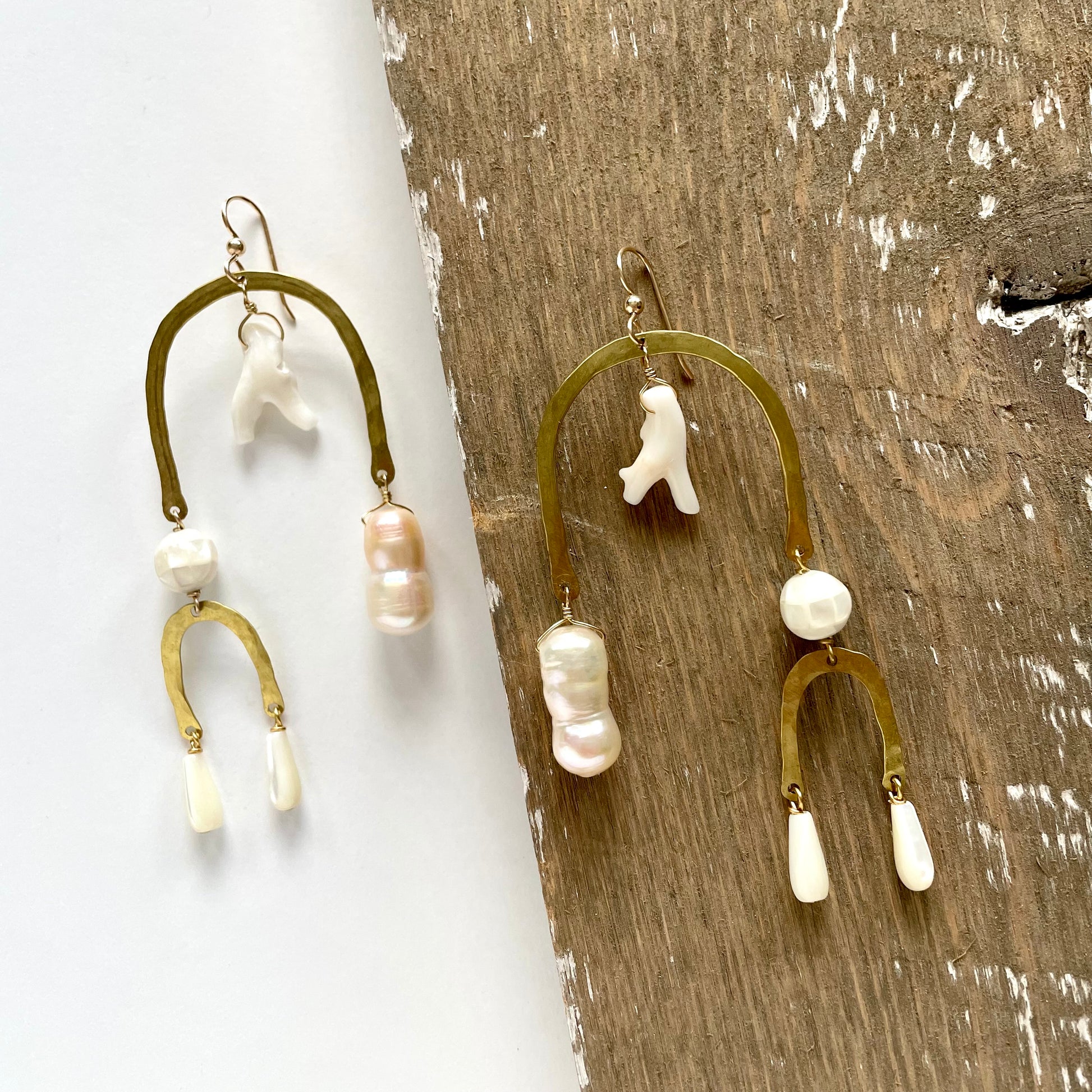 Mobile, balanced earring set. Mother of Pearl, Coral, Fresh Water Pearl, hammered Brass frames and 14K Gold Fill ear wires; organic shapes, neutral colors and fun to wear with lots of movement. Only one set available. Overall length of 4 inches.