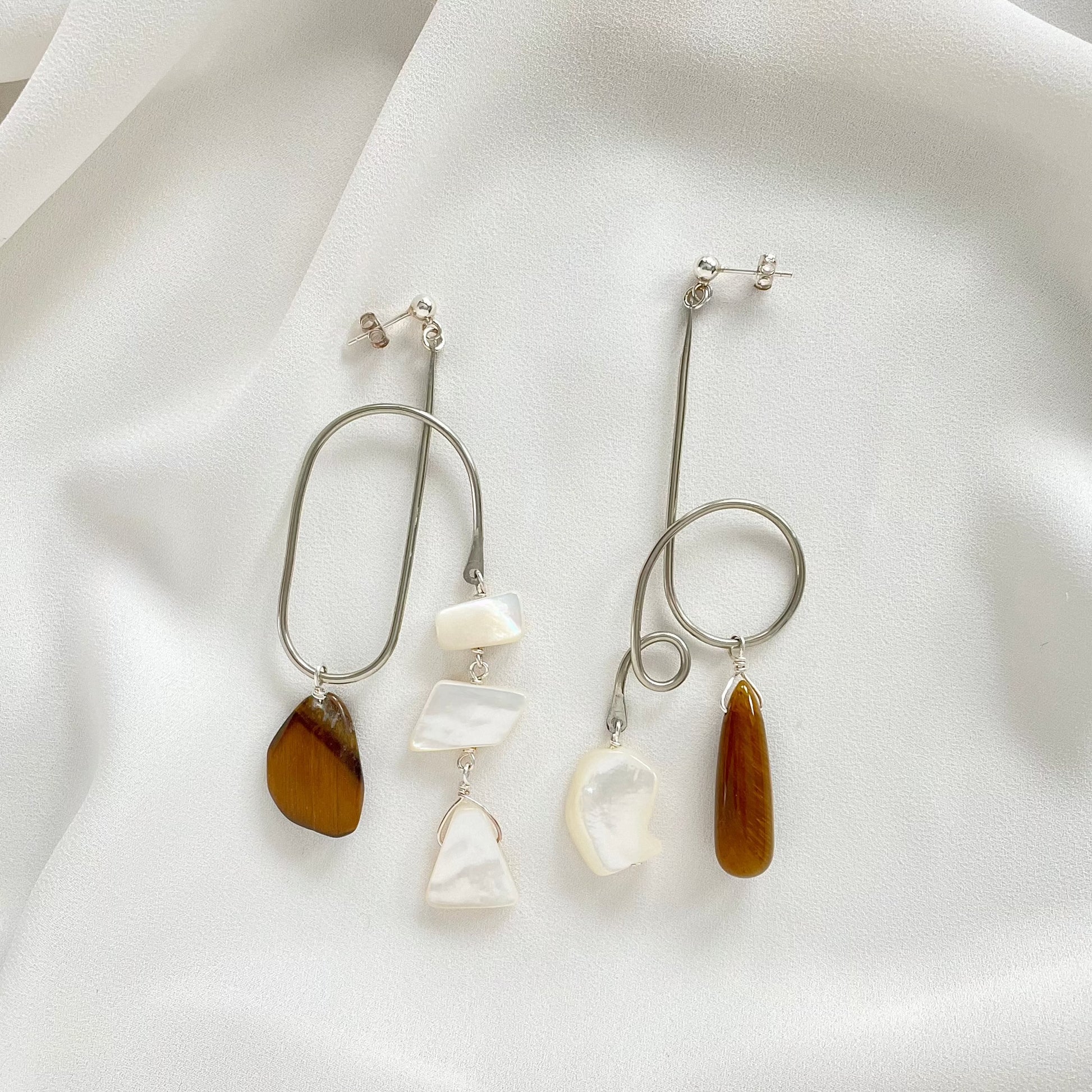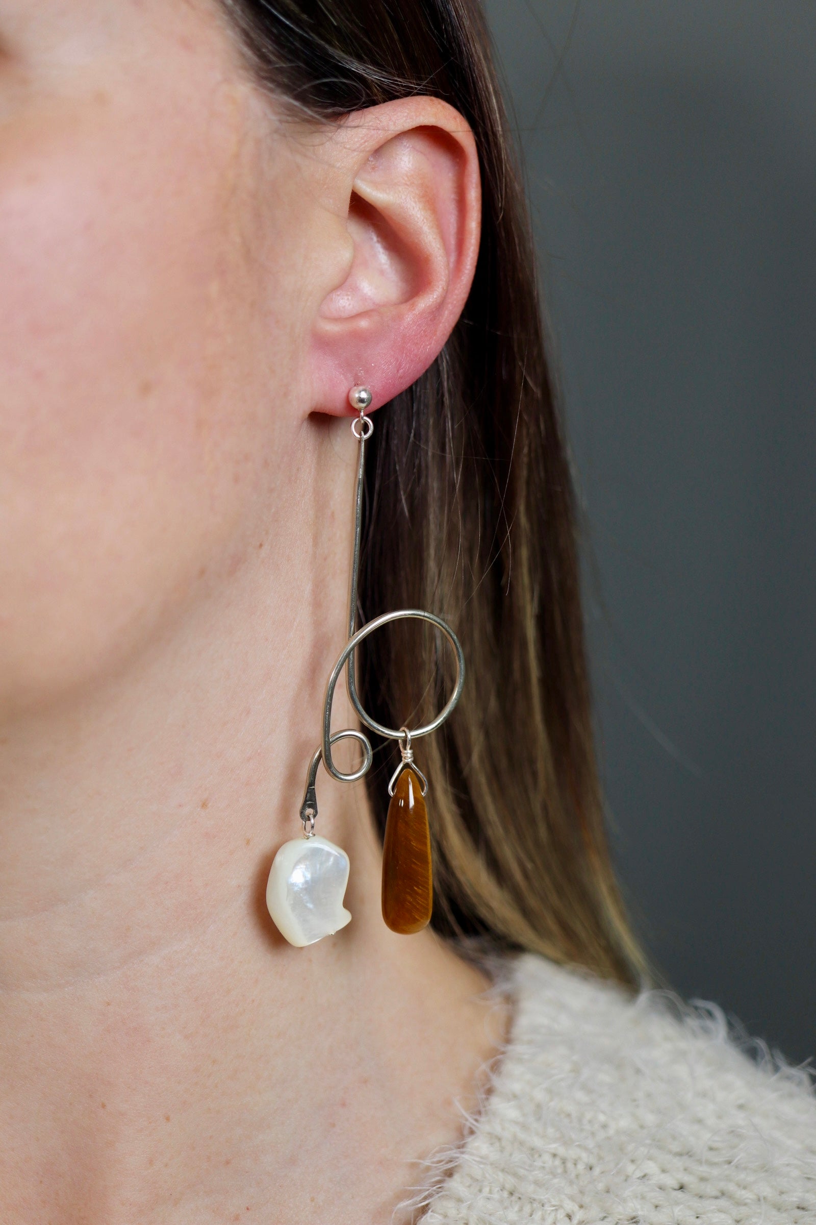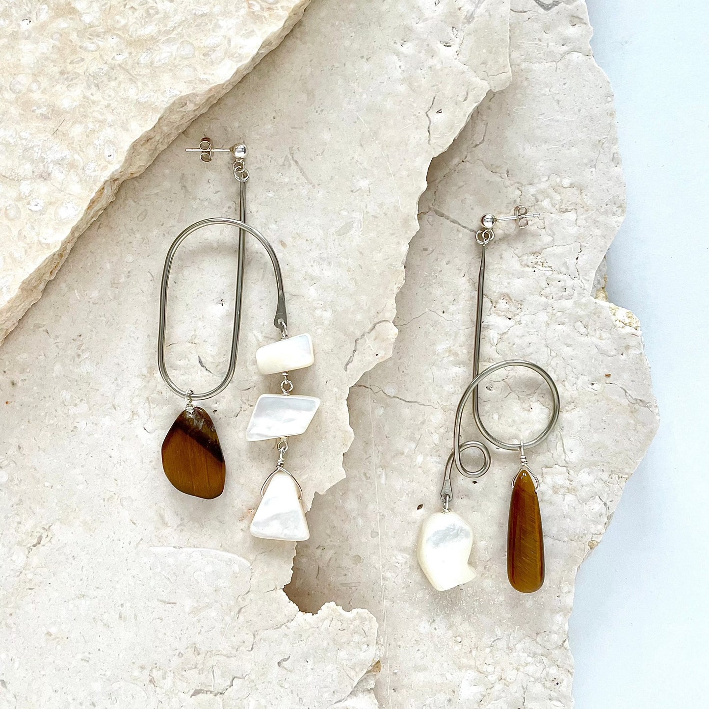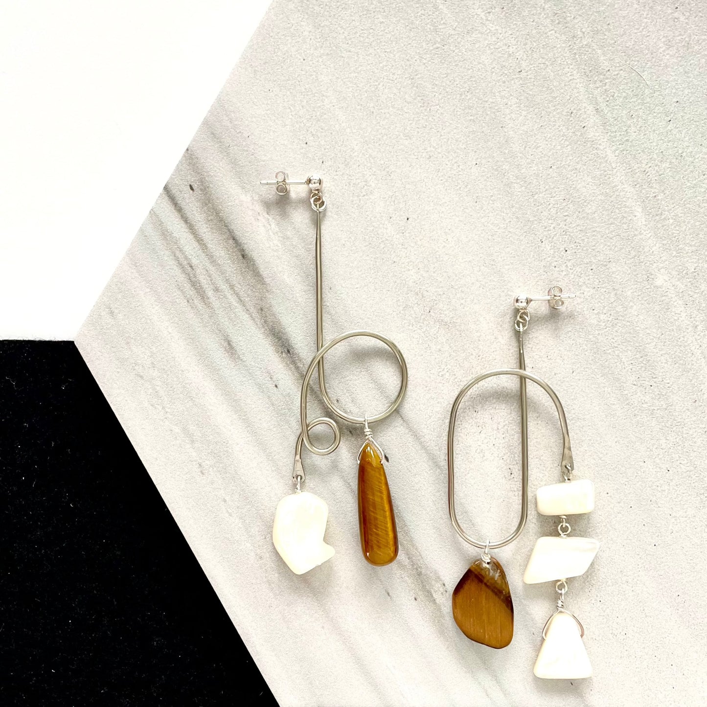 A mismatched set of earrings. Mother of Pearl, Tiger Eye and German Silver Nickel frames; geometric and organic shapes, neutral colors and fun to wear with lots of movement. Only one set available. Overall length of 3 inches.