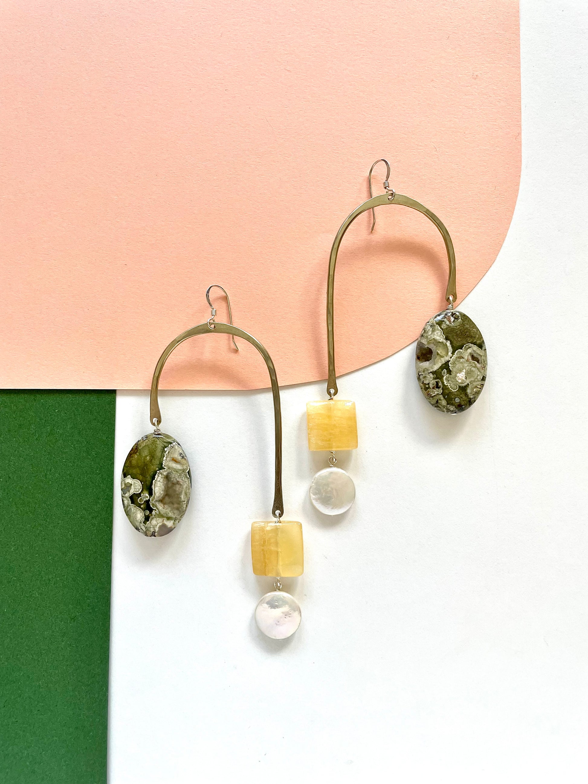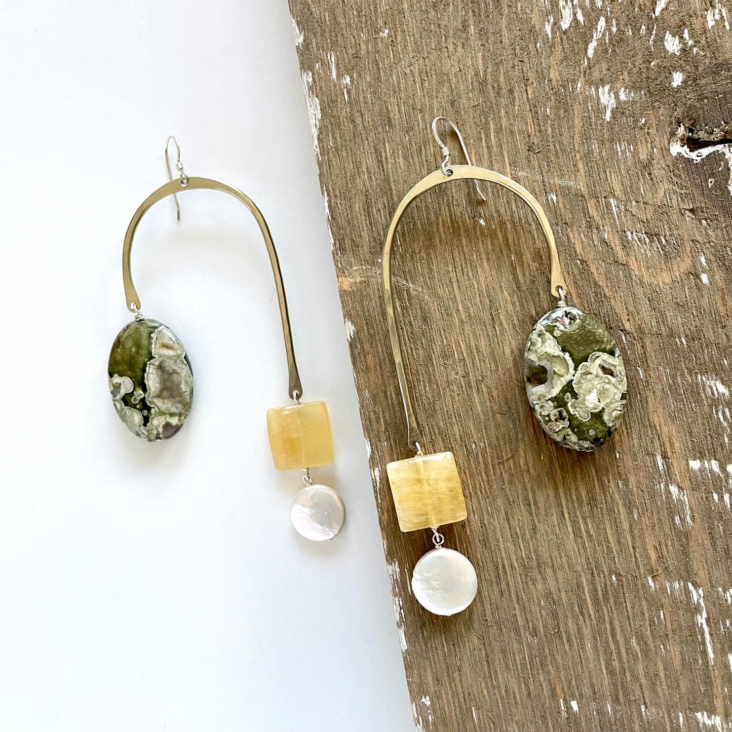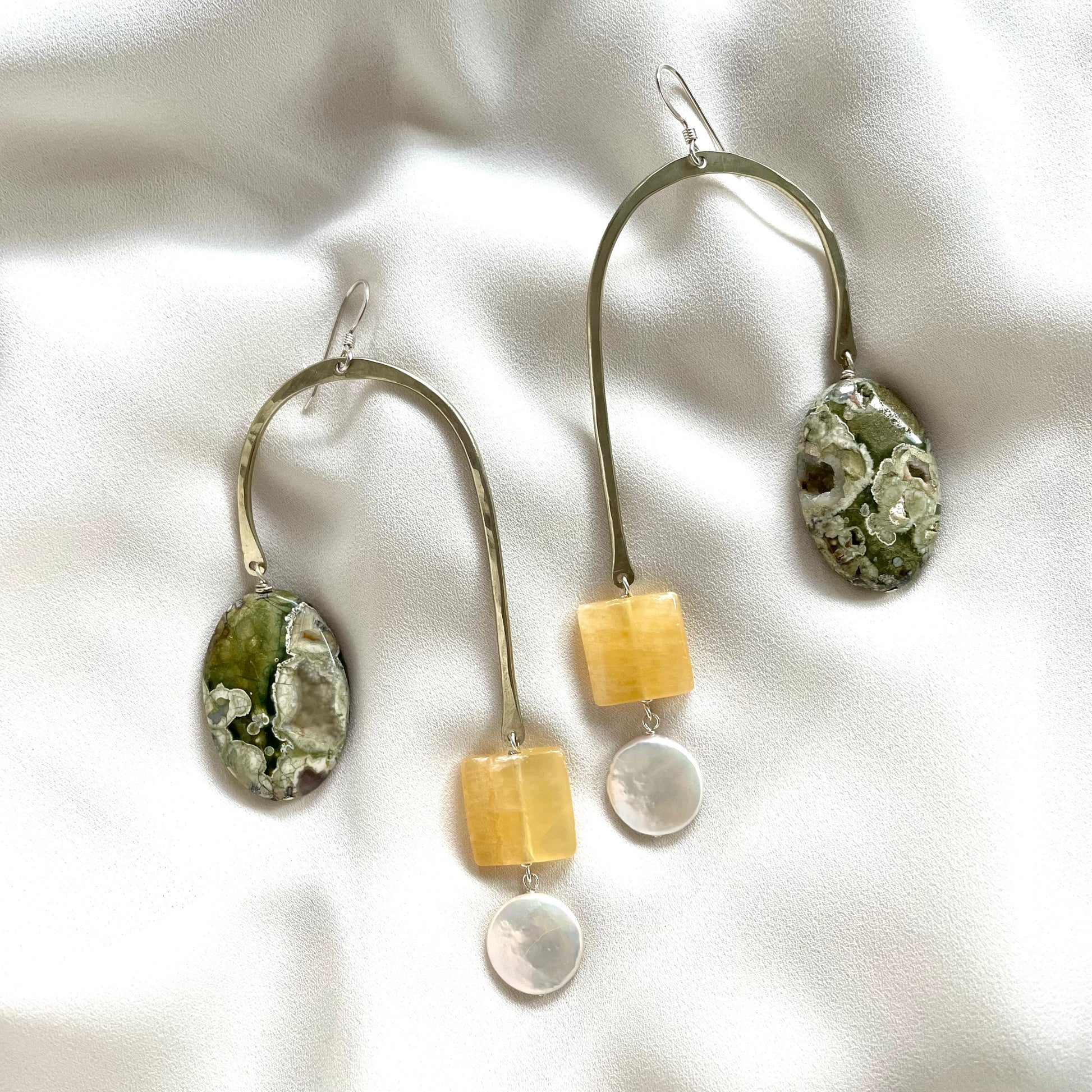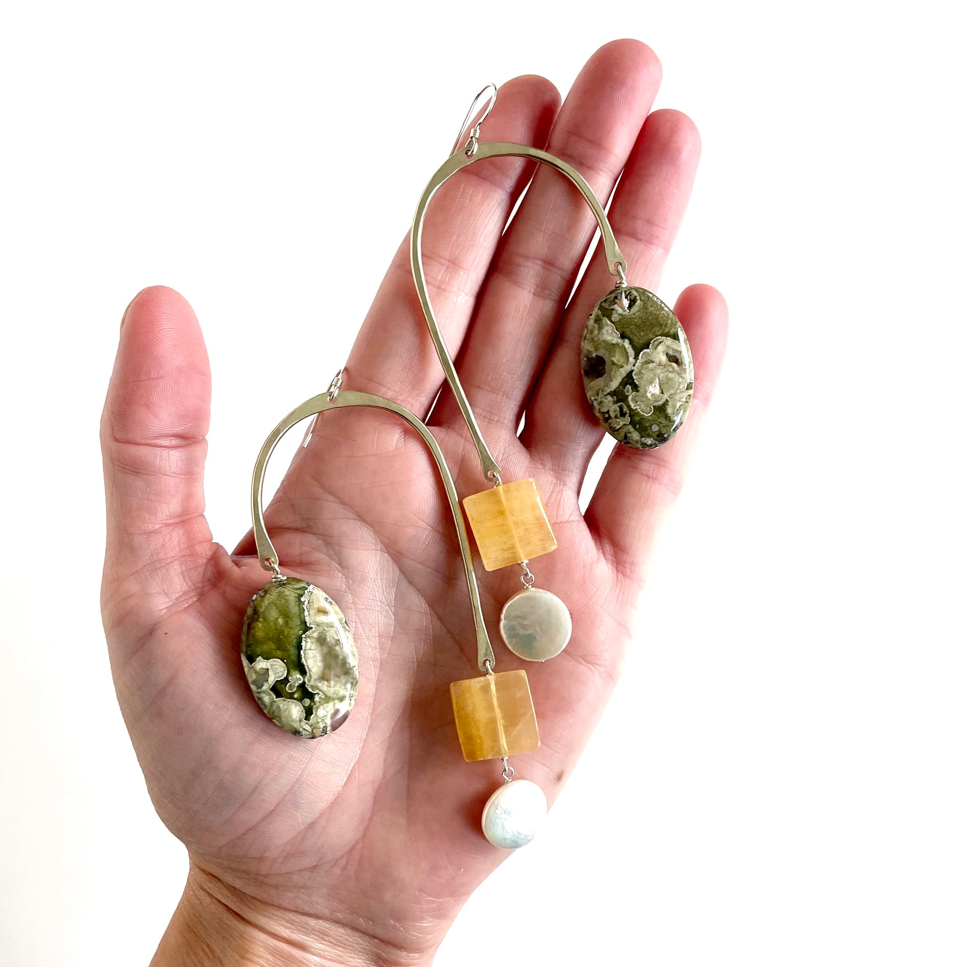 A geometric set of earrings. Rhyolite, Fresh Water Pearl and Quartz with hammered German Silver frames; geometric and organic shapes, pops of color and fun to wear with lots of movement. Only one set available. Overall length of 4.25 inches.