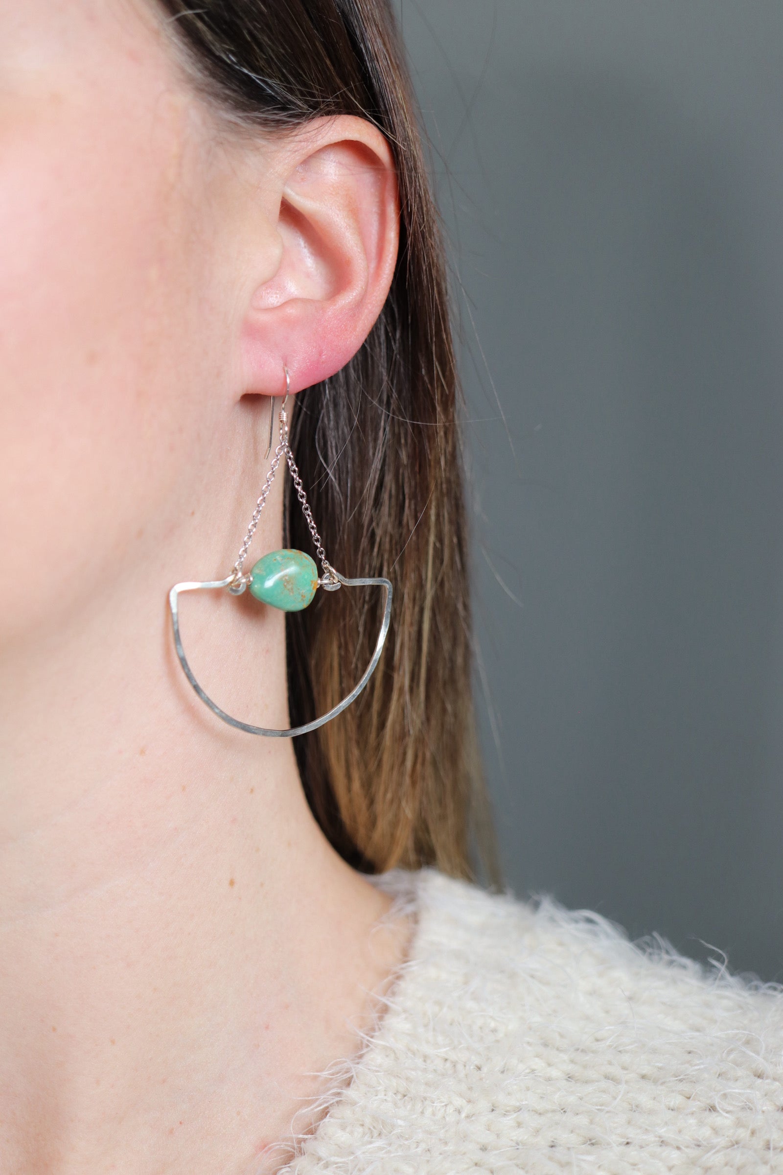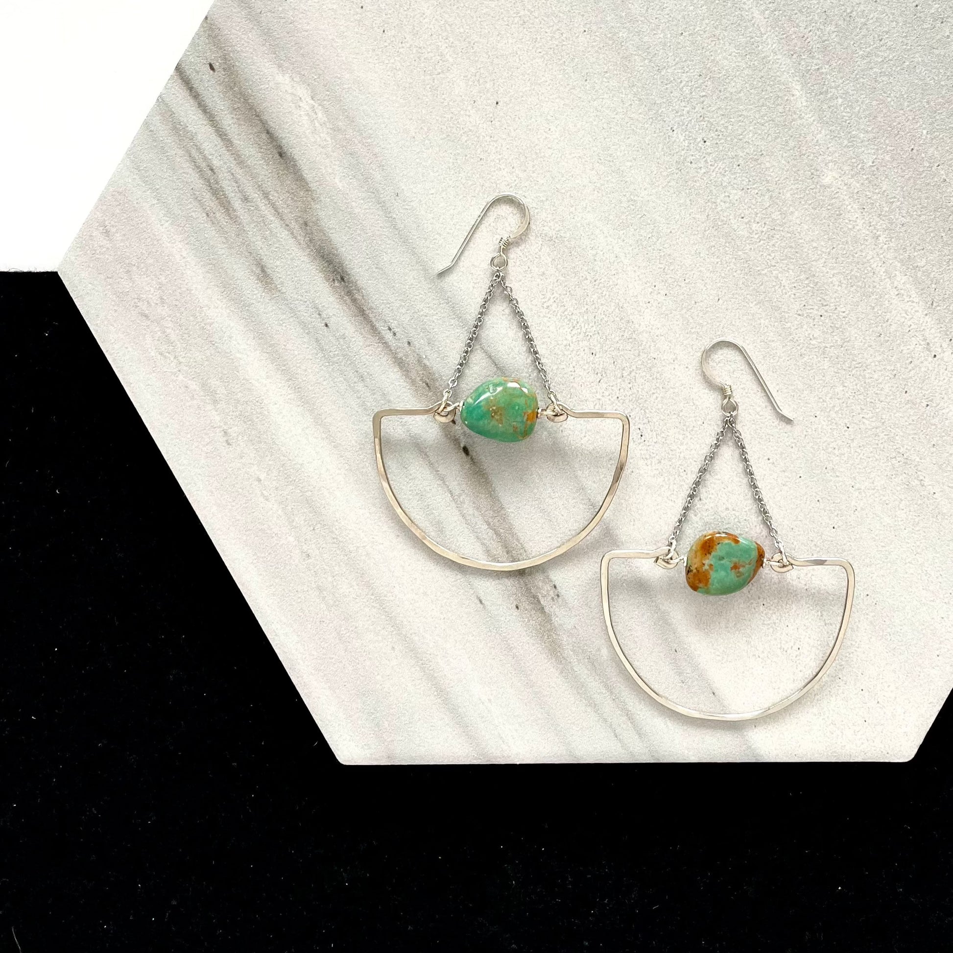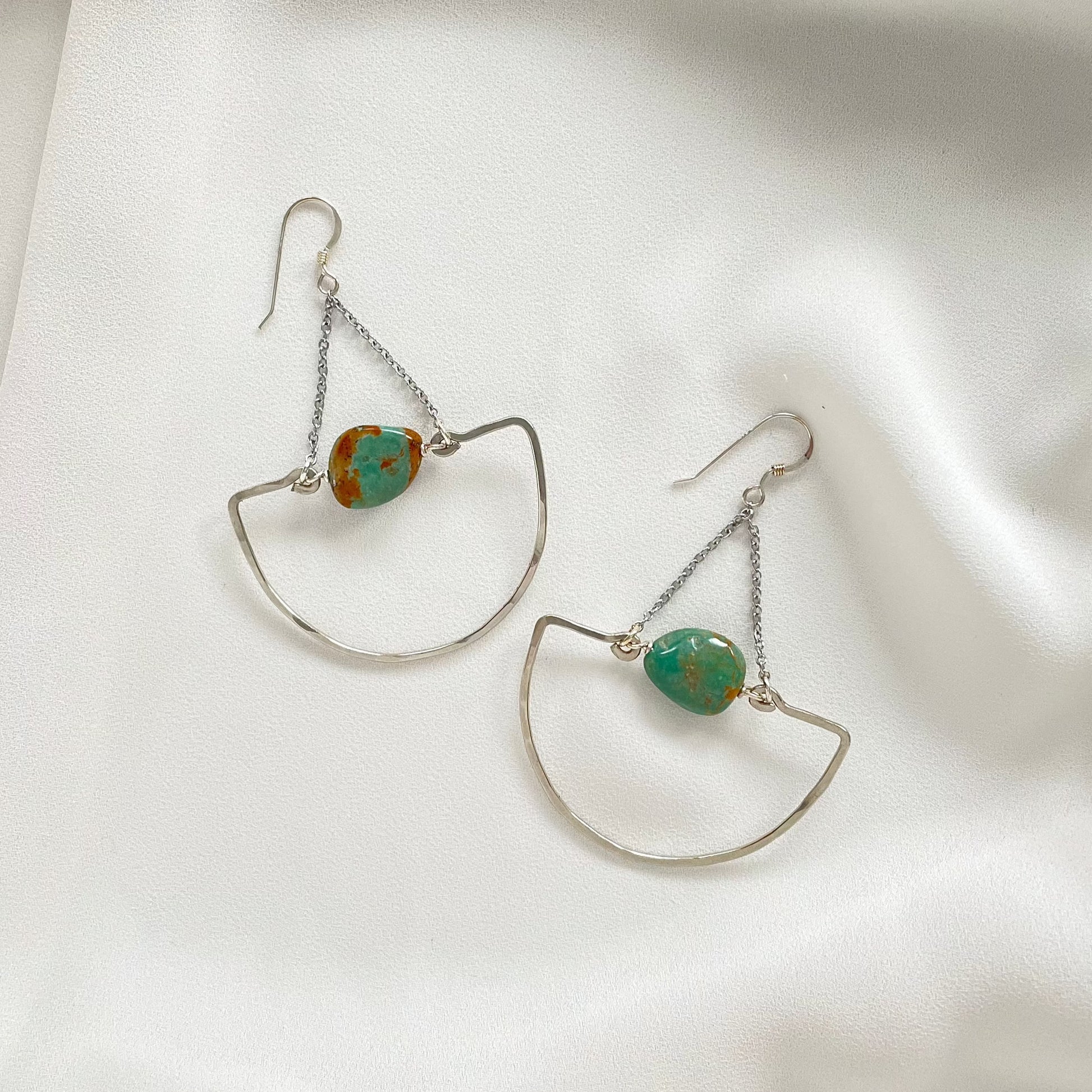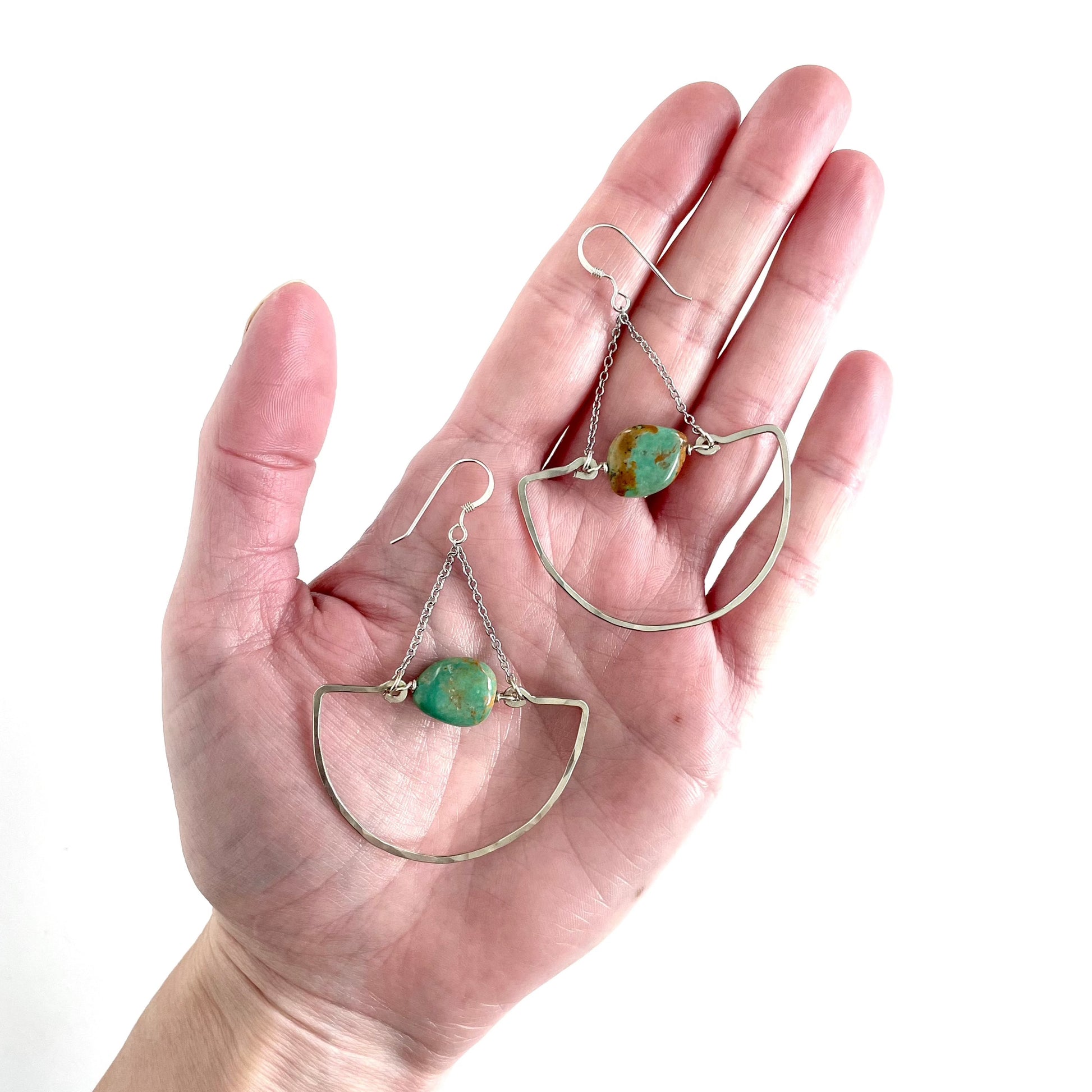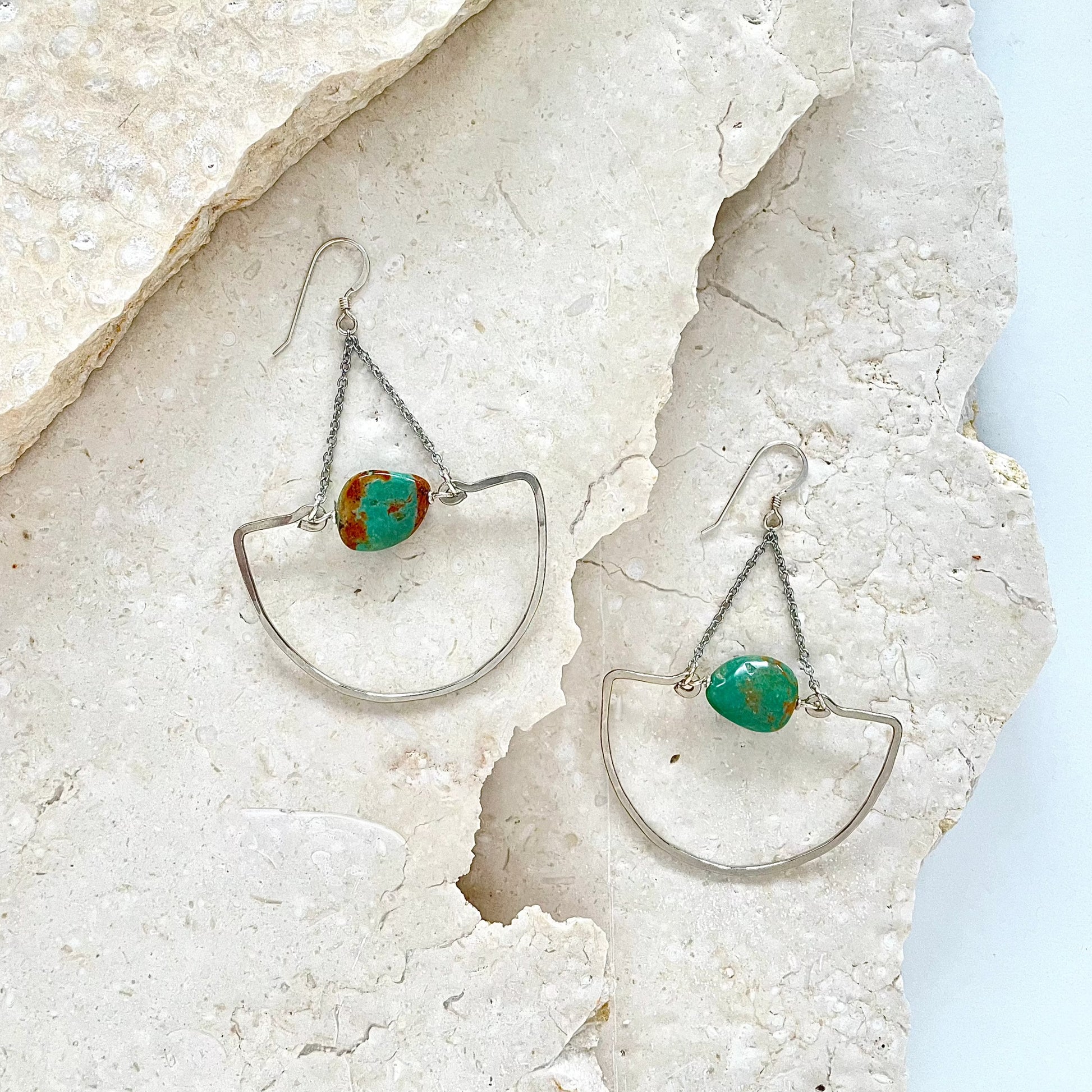 A lightweight set of earrings. Turquoise and hammered German Silver Nickel frames; geometric and organic shapes, a little pop of green and fun to wear with lots of movement. Only one set available. Overall length of 2.75 inches.