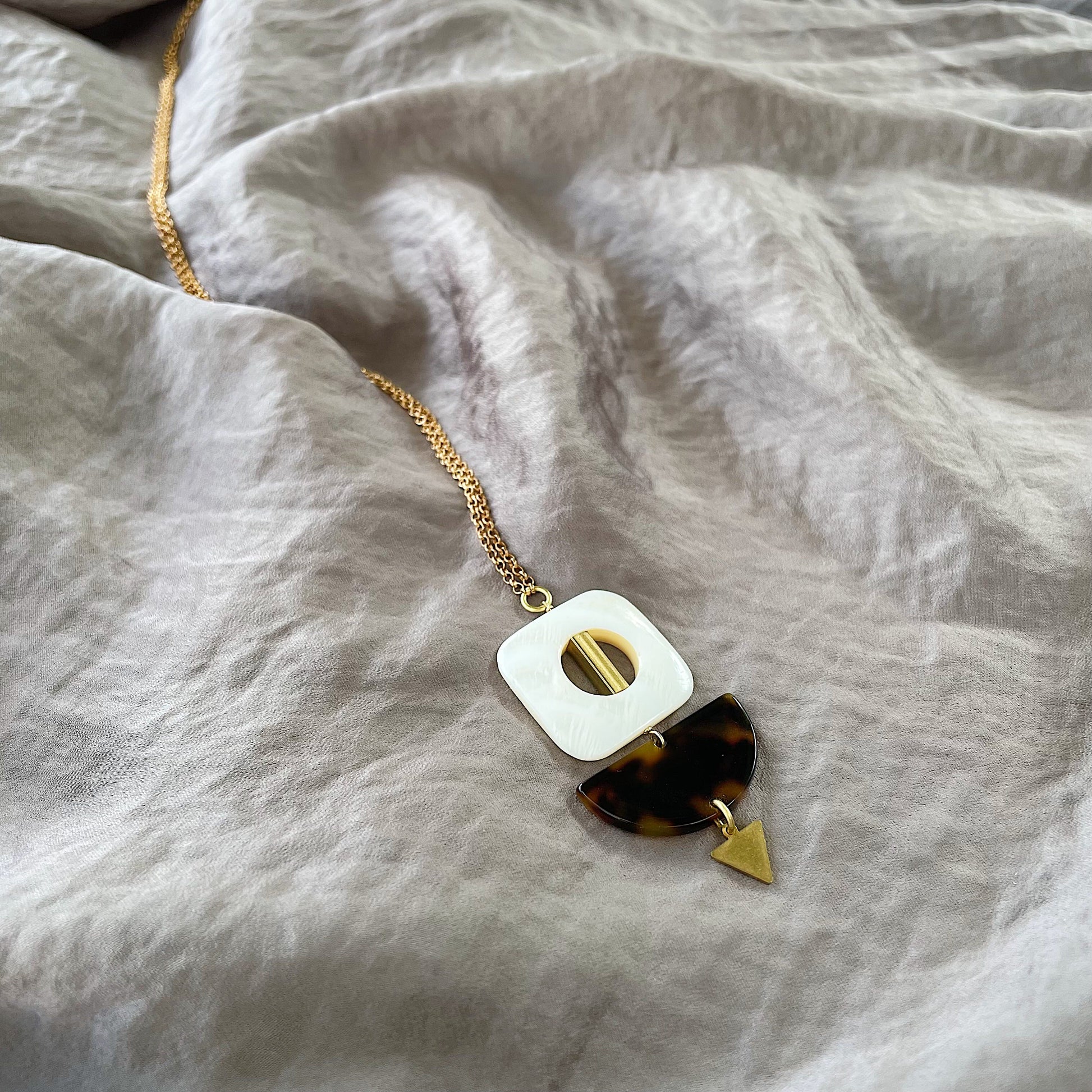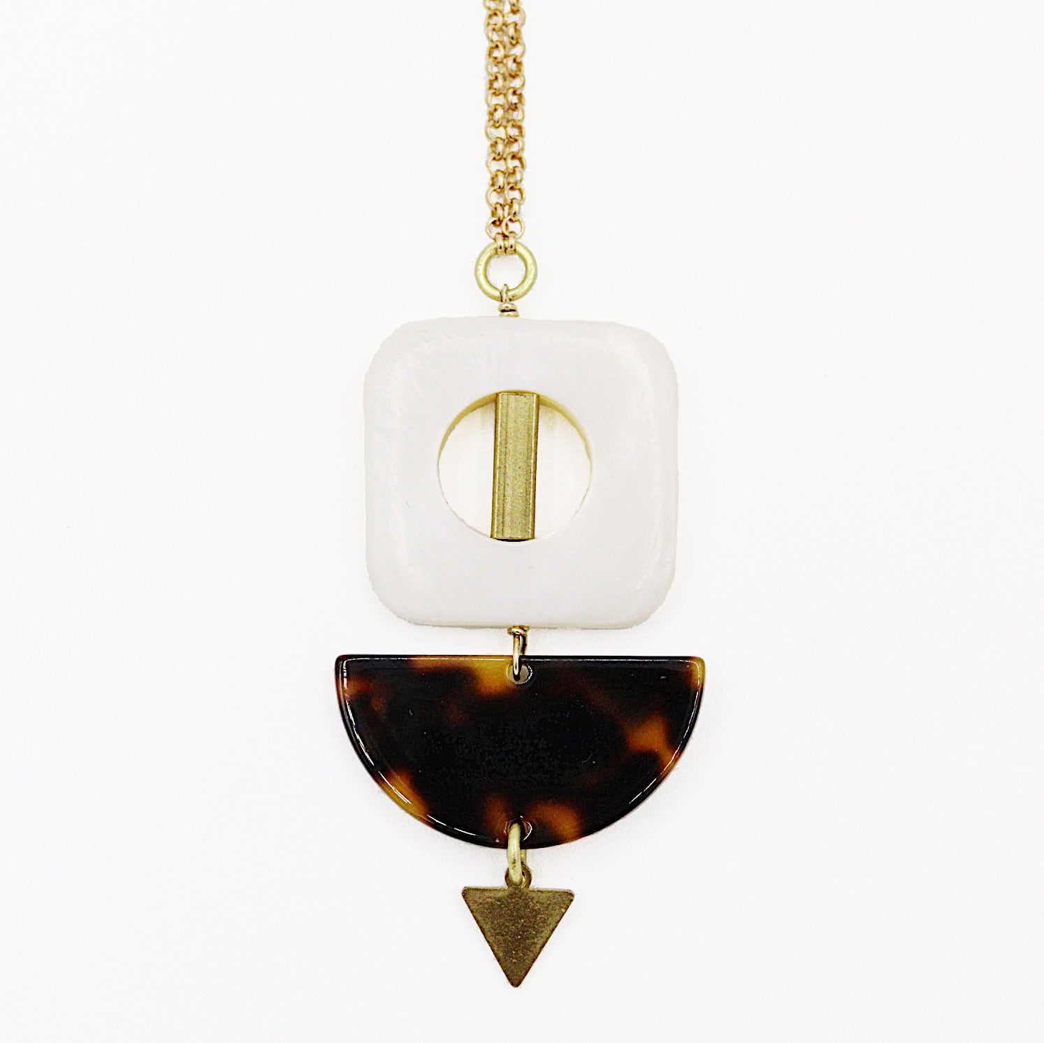 The Ophelia Necklace: white mother of pearl with a vintage brass inset, tortoiseshell and brass accents met with gold-toned nickel-free chain, create this lightweight, neutral and geometric piece.